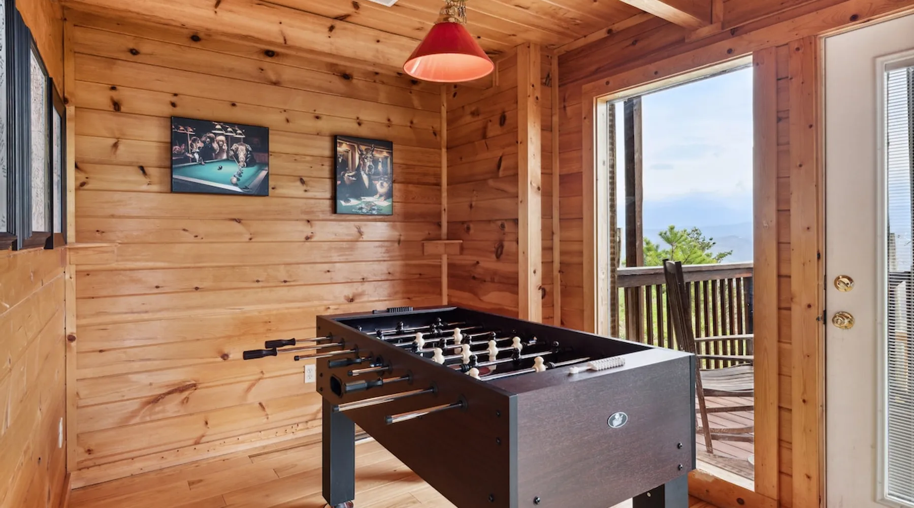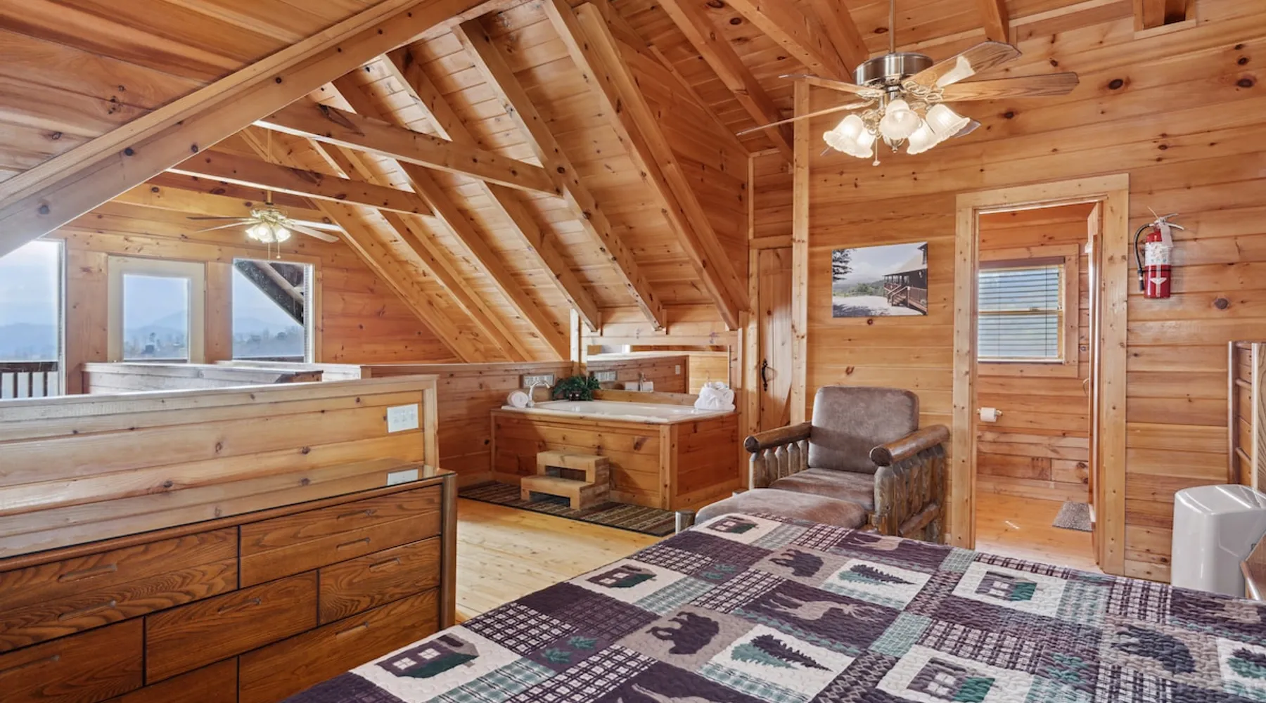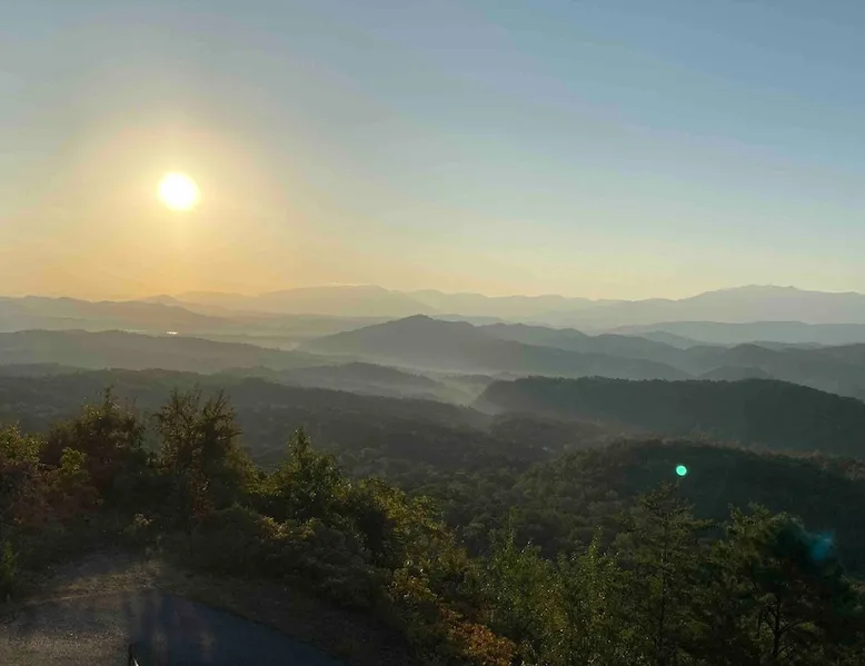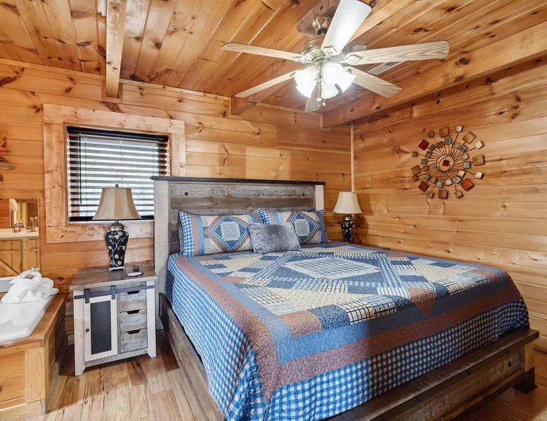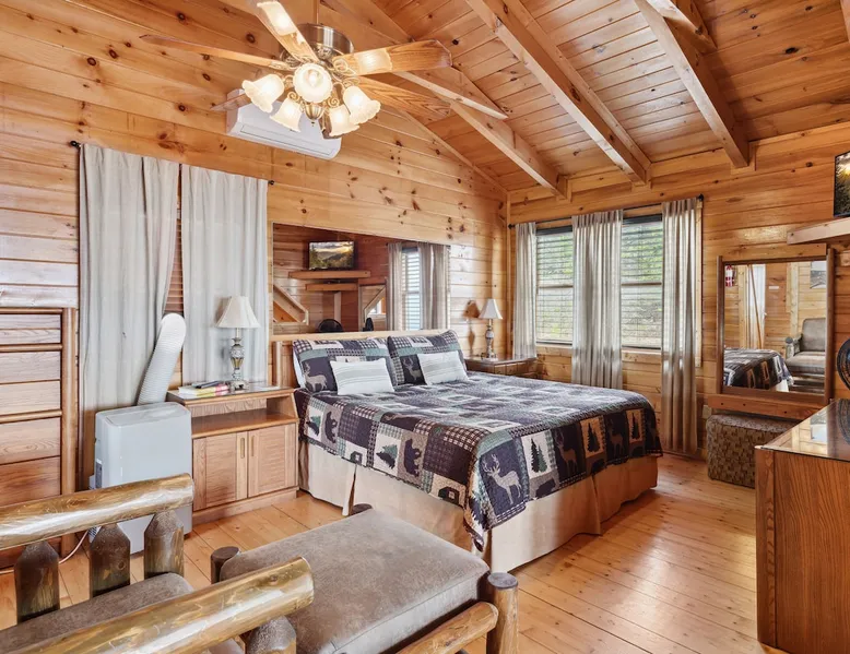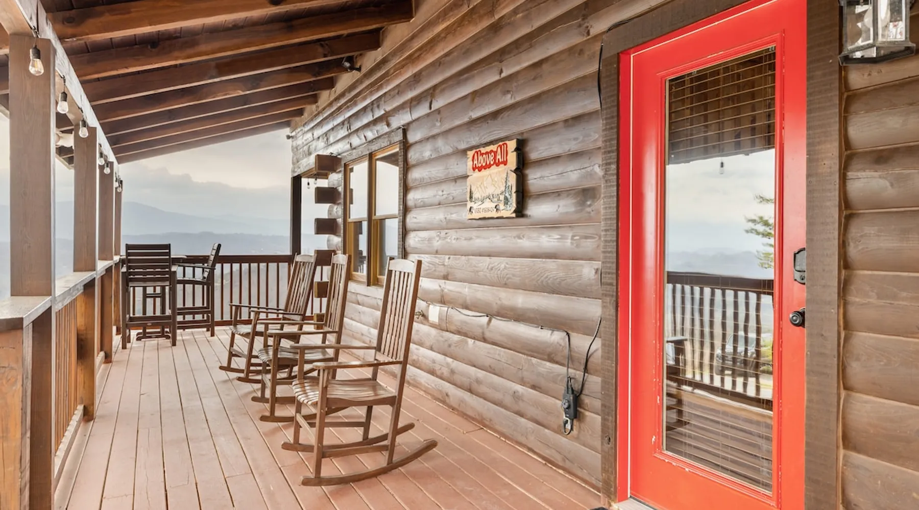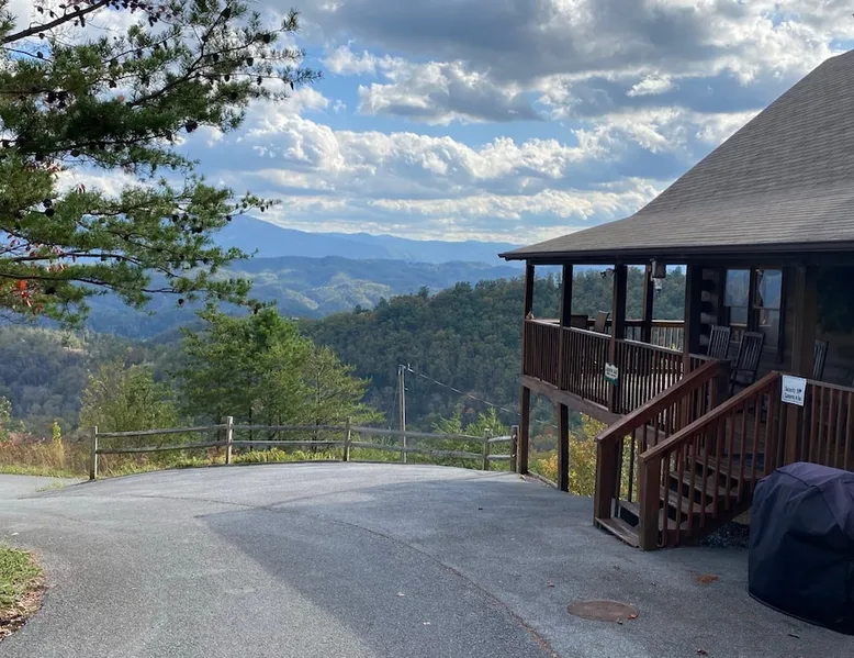 Above All' is a 3 story log cabin in Pigeon Forge Tennessee. This cabin is perched near the top of secluded Bluff Mountain with fantastic 180 degree un-obstructed view of Smoky Mountain and Mt L'conte and is only minutes from downtown Pigeon Forge, Gatlinburg, and the Great Smoky Mountains National Park.The cabin is on a private drive with a handful of other cabins all of which are situated to maximize privacy and view The space Above All' is a 3 story log cabin in Pigeon Forge Tennessee. This cabin is perched near the top of secluded Bluff Mountain with fantastic 180 degree un-obstructed view of Smoky Mountain and Mt L'conte and is only minutes from downtown Pigeon Forge, Gatlinburg, and the Great Smoky Mountains National Park. The cabin is on a private drive with a handful of other cabins all of which are situated to maximize privacy and view. The road up is paved, narrow and steep in places with some hairpin turns but the view up top is worth it! Only the last 0.25 miles of the drive has steep roads to navigate Let's start at the top! The entire top level houses a huge master suite with vaulted ceilings. Here you will find a king sized comfy bed, jacuzzi tub and full bathroom, a Smart TV with Netflix and views right from bed! Take a stroll down the catwalk out to the upper deck and take in the spectacular view or have your favorite morning/evening beverage while rocking on the glider rocker bench. On the main level you will find the living room, complete with a stone fireplace (gas) tucked in the corner which gives the whole room a warm and cozy atmosphere. There is theater style seats that recline and a futon. TV with free Netflix is available on this level. A full bathroom is located on this level. Gleaming hardwood floors, knotty pine walls, and exposed wood ceiling beams add to the beauty and warmth of this room. Full length windows and doors open the living room to the great outdoors and breathtaking views. Access the main level deck through the deck doors where four rocking chairs invite you to come and sit and enjoy the panoramic views of the surrounding mountain ranges and the city of Pigeon Forge in the valley. Use the grill to cook up something tasty then it enjoy it outside on the table/chairs provided on the deck. Before you retire for the evening into one of the comfy beds be sure to soak in the hot tub! The kitchen is also located on the main level. The kitchen is fully equipped so you will find everything you need to prepare meals. For those of you that like dining out there are plenty of excellent choices. You are only 5 miles out to the main parkway/strip in Pigeon Forge which offer a wide variety of dining options. The lower level of this log cabin has a game room with a beautiful red pool table, a foosball table, TV with music channels. There is also a game table with checkers, chess, and backgammon. The deck on this level has a swing for you to relax in and while soaking up the beauty of the Great Smoky Mountains. The washer/dryer combo are located on this lower level. Also on this level is the 2nd bedroom suite, complete with a comfy King bed, private bath/shower and a Jacuzzi tub, a Smart TV for cable TV and Netflix, also music channels available through cable provider. We also have an outside open deck area with wood burning firepit So much to see and do, hiking, shopping, zip lines, shows, museums, white water rafting, horse back riding, helicopter rides, go-cart racing, mini-golf the list goes on and on soooo what are you waiting for book now, Above ALL' never disappoints. Guest access Entire cabin Other things to note The cabin numbers in the mountain are not in sequence, so please follow our detail directions to get to the cabin . Above all is the second last cabin on the very top of the mountain .