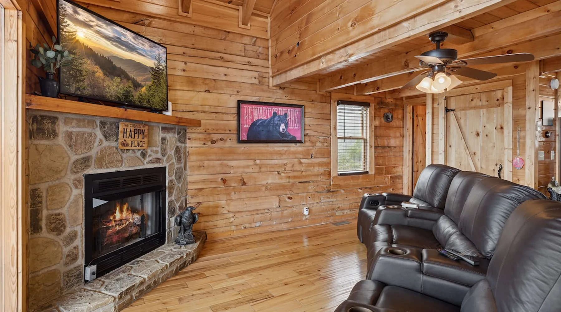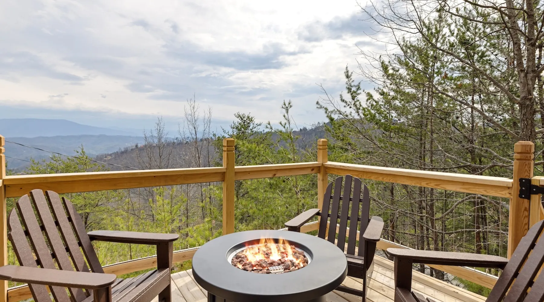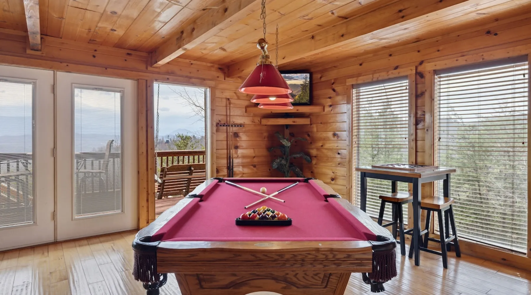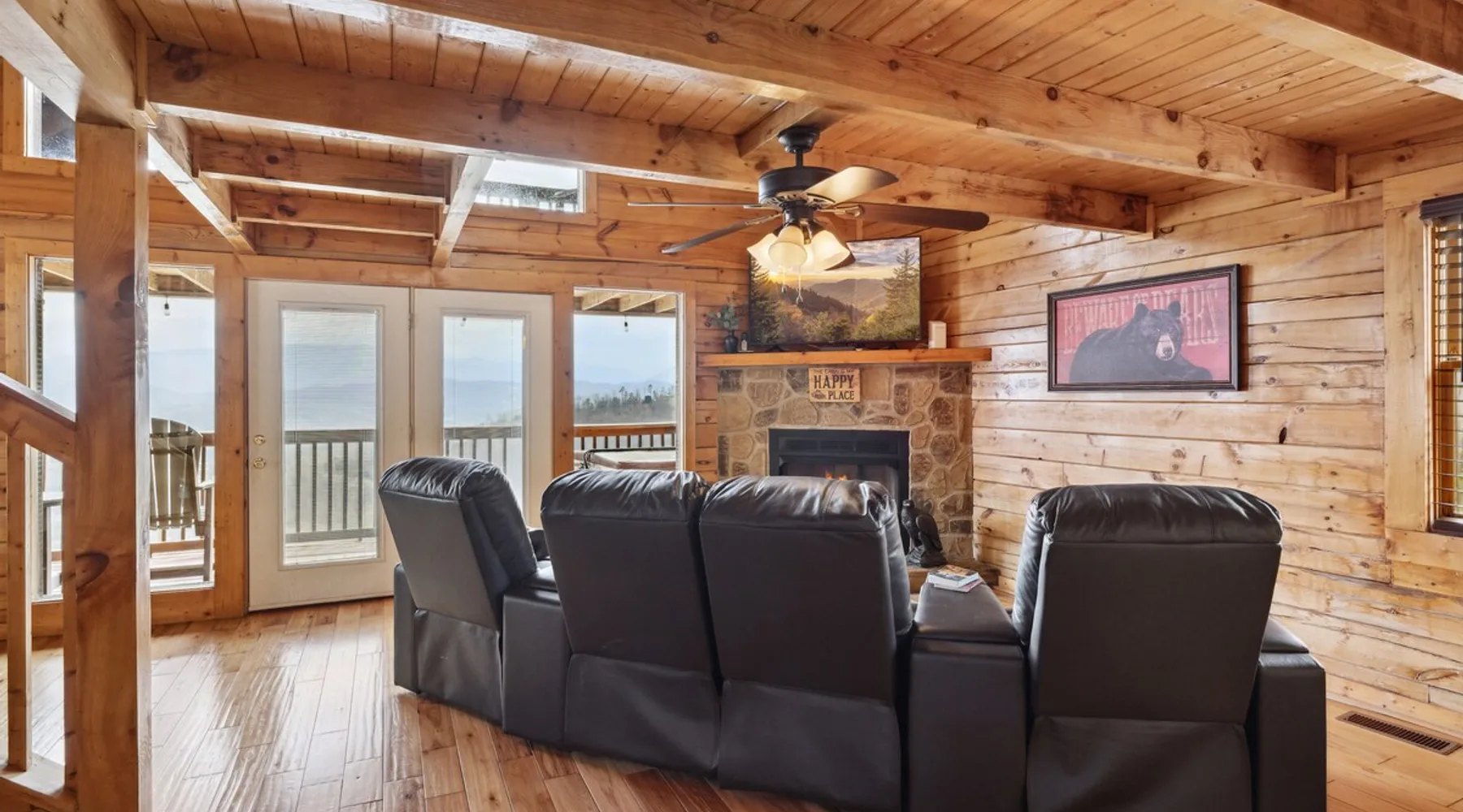 Above All' is a 3 story log cabin in Pigeon Forge Tennessee. This cabin is perched near the top of secluded Bluff Mountain with fantastic 180 degree un-obstructed view of Smoky Mountain and Mt L'conte and is only minutes from downtown Pigeon Forge, Gatlinburg, and the Great Smoky Mountains National Park.The cabin is on a private drive with a handful of other cabins all of which are situated to maximize privacy and view The space Above All' is a 3 story log cabin in Pigeon Forge Tennessee. This cabin is perched near the top of secluded Bluff Mountain with fantastic 180 degree un-obstructed view of Smoky Mountain and Mt L'conte and is only minutes from downtown Pigeon Forge, Gatlinburg, and the Great Smoky Mountains National Park. The cabin is on a private drive with a handful of other cabins all of which are situated to maximize privacy and view. The road up is paved, narrow and steep in places with some hairpin turns but the view up top is worth it! Only the last 0.25 miles of the drive has steep roads to navigate Let's start at the top! The entire top level houses a huge master suite with vaulted ceilings. Here you will find a king sized comfy bed, jacuzzi tub and full bathroom, a Smart TV with Netflix and views right from bed! Take a stroll down the catwalk out to the upper deck and take in the spectacular view or have your favorite morning/evening beverage while rocking on the glider rocker bench. On the main level you will find the living room, complete with a stone fireplace (gas) tucked in the corner which gives the whole room a warm and cozy atmosphere. There is theater style seats that recline and a futon. TV with free Netflix is available on this level. A full bathroom is located on this level. Gleaming hardwood floors, knotty pine walls, and exposed wood ceiling beams add to the beauty and warmth of this room. Full length windows and doors open the living room to the great outdoors and breathtaking views. Access the main level deck through the deck doors where four rocking chairs invite you to come and sit and enjoy the panoramic views of the surrounding mountain ranges and the city of Pigeon Forge in the valley. Use the grill to cook up something tasty then it enjoy it outside on the table/chairs provided on the deck. Before you retire for the evening into one of the comfy beds be sure to soak in the hot tub! The kitchen is also located on the main level. The kitchen is fully equipped so you will find everything you need to prepare meals. For those of you that like dining out there are plenty of excellent choices. You are only 5 miles out to the main parkway/strip in Pigeon Forge which offer a wide variety of dining options. The lower level of this log cabin has a game room with a beautiful red pool table, a foosball table, TV with music channels. There is also a game table with checkers, chess, and backgammon. The deck on this level has a swing for you to relax in and while soaking up the beauty of the Great Smoky Mountains. The washer/dryer combo are located on this lower level. Also on this level is the 2nd bedroom suite, complete with a comfy King bed, private bath/shower and a Jacuzzi tub, a Smart TV for cable TV and Netflix, also music channels available through cable provider. We also have an outside open deck area with wood burning firepit So much to see and do, hiking, shopping, zip lines, shows, museums, white water rafting, horse back riding, helicopter rides, go-cart racing, mini-golf the list goes on and on soooo what are you waiting for book now, Above ALL' never disappoints. Guest access Entire cabin Other things to note The cabin numbers in the mountain are not in sequence, so please follow our detail directions to get to the cabin . Above all is the second last cabin on the very top of the mountain .