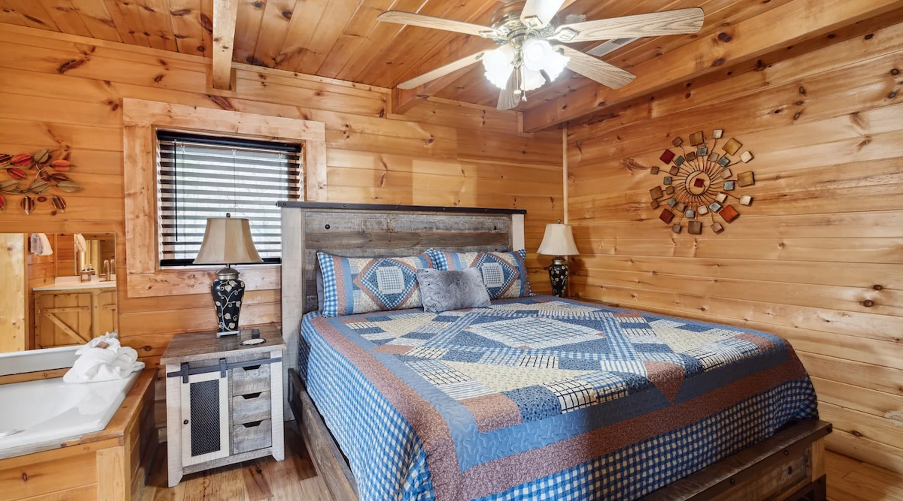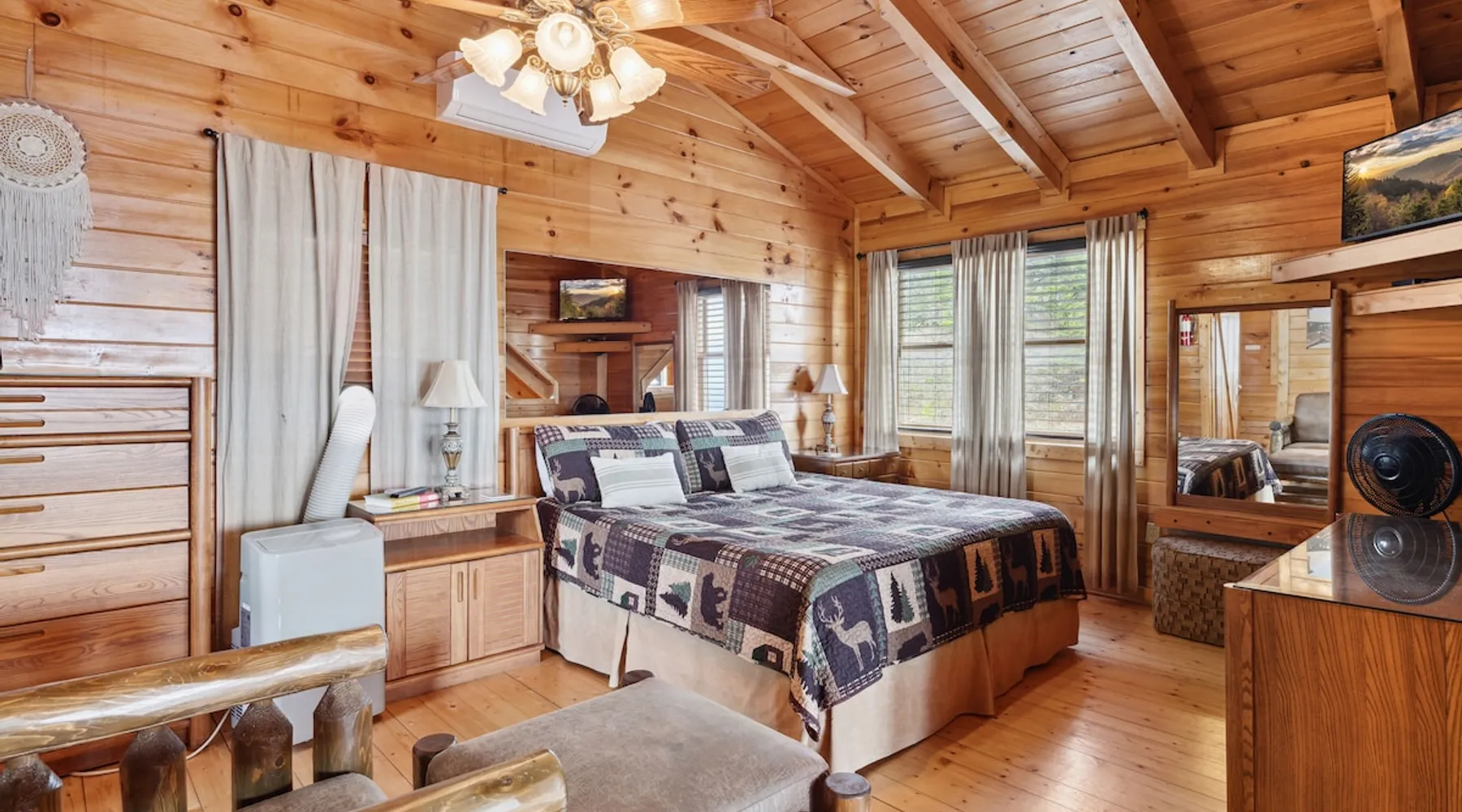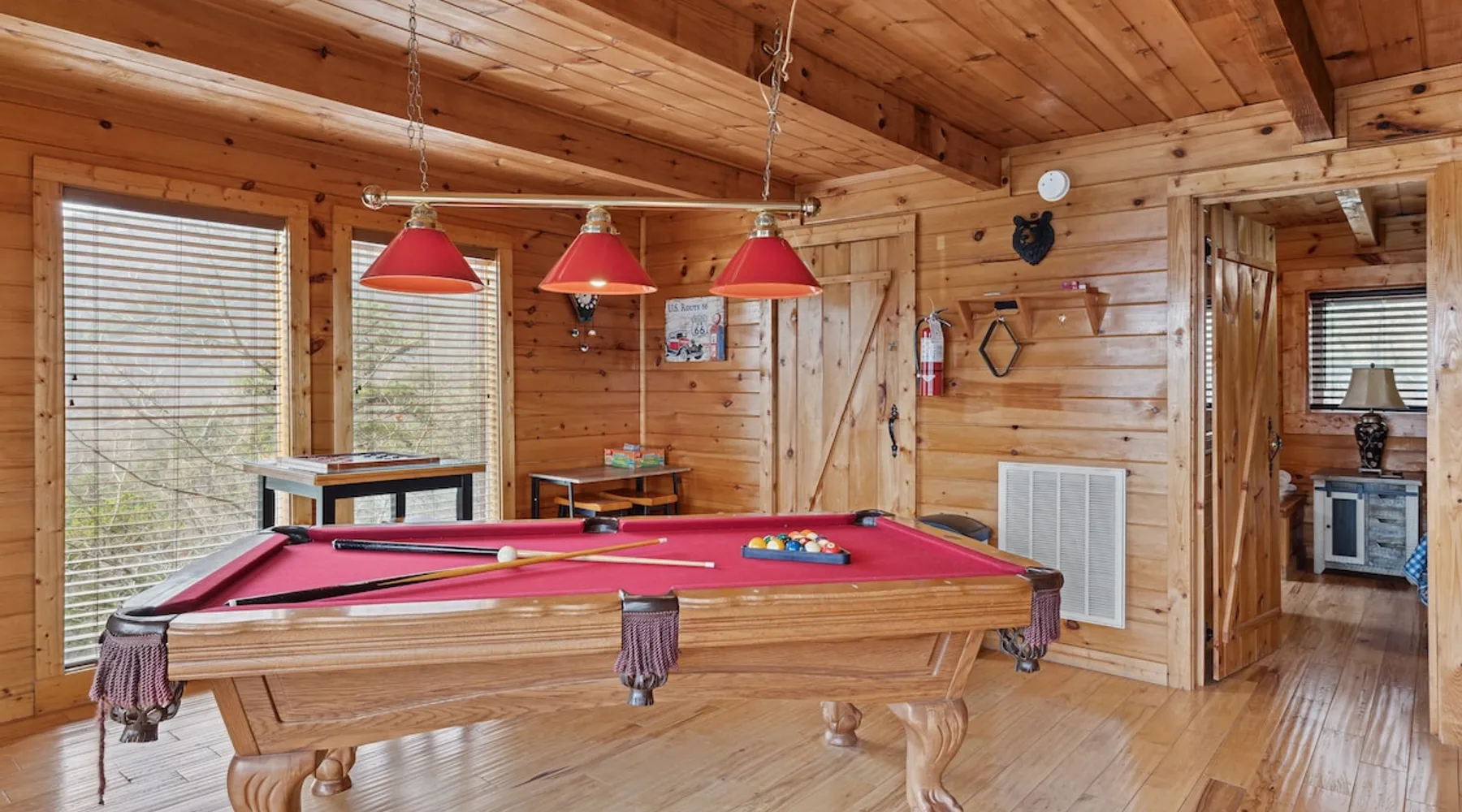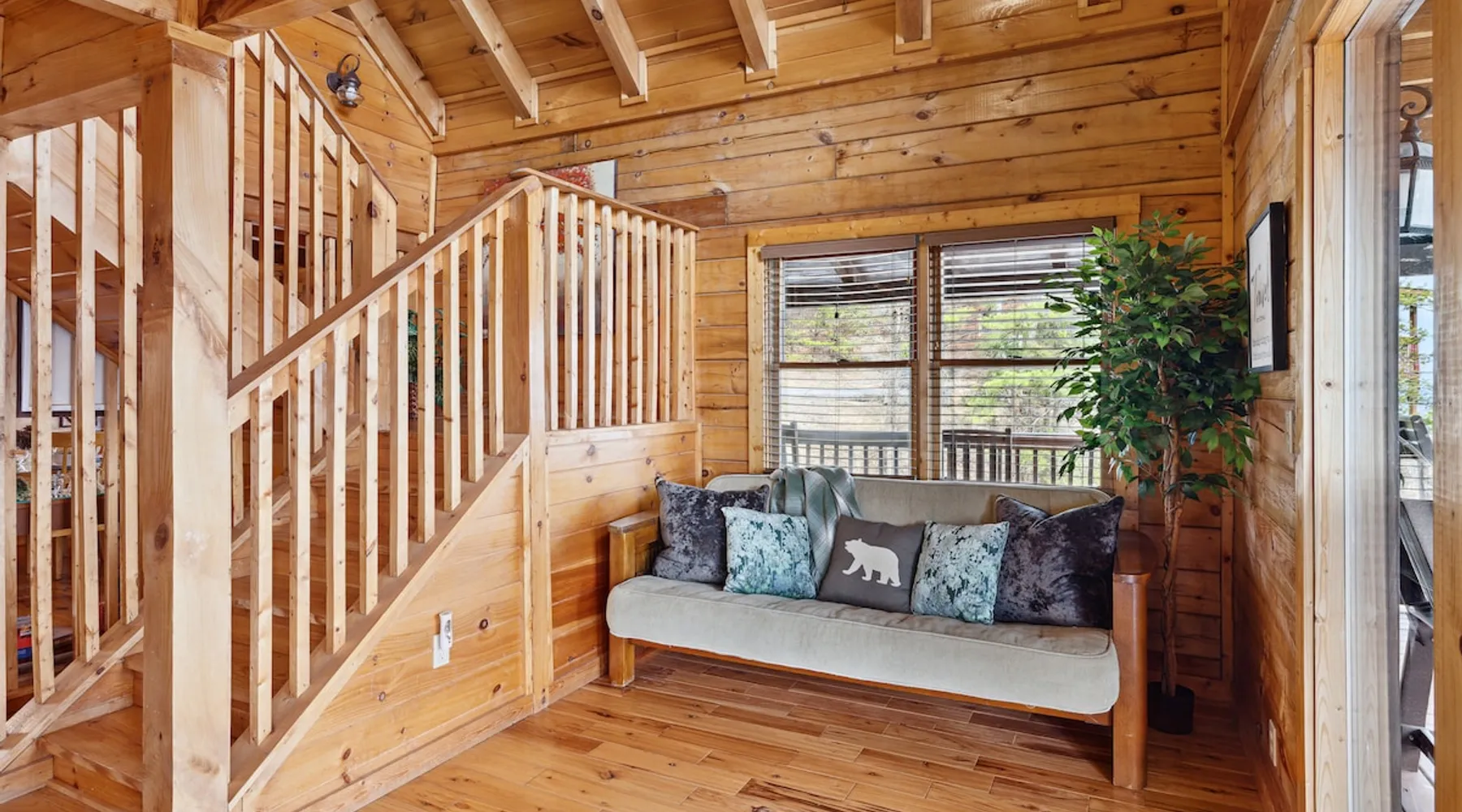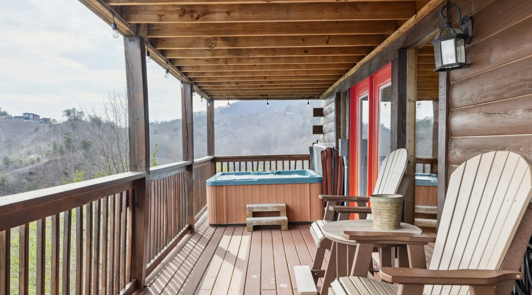 Above All' is a 3 story log cabin in Pigeon Forge Tennessee. This cabin is perched near the top of secluded Bluff Mountain with fantastic 180 degree un-obstructed view of Smoky Mountain and Mt L'conte and is only minutes from downtown Pigeon Forge, Gatlinburg, and the Great Smoky Mountains National Park.The cabin is on a private drive with a handful of other cabins all of which are situated to maximize privacy and view The space Above All' is a 3 story log cabin in Pigeon Forge Tennessee. This cabin is perched near the top of secluded Bluff Mountain with fantastic 180 degree un-obstructed view of Smoky Mountain and Mt L'conte and is only minutes from downtown Pigeon Forge, Gatlinburg, and the Great Smoky Mountains National Park. The cabin is on a private drive with a handful of other cabins all of which are situated to maximize privacy and view. The road up is paved, narrow and steep in places with some hairpin turns but the view up top is worth it! Only the last 0.25 miles of the drive has steep roads to navigate Let's start at the top! The entire top level houses a huge master suite with vaulted ceilings. Here you will find a king sized comfy bed, jacuzzi tub and full bathroom, a Smart TV with Netflix and views right from bed! Take a stroll down the catwalk out to the upper deck and take in the spectacular view or have your favorite morning/evening beverage while rocking on the glider rocker bench. On the main level you will find the living room, complete with a stone fireplace (gas) tucked in the corner which gives the whole room a warm and cozy atmosphere. There is theater style seats that recline and a futon. TV with free Netflix is available on this level. A full bathroom is located on this level. Gleaming hardwood floors, knotty pine walls, and exposed wood ceiling beams add to the beauty and warmth of this room. Full length windows and doors open the living room to the great outdoors and breathtaking views. Access the main level deck through the deck doors where four rocking chairs invite you to come and sit and enjoy the panoramic views of the surrounding mountain ranges and the city of Pigeon Forge in the valley. Use the grill to cook up something tasty then it enjoy it outside on the table/chairs provided on the deck. Before you retire for the evening into one of the comfy beds be sure to soak in the hot tub! The kitchen is also located on the main level. The kitchen is fully equipped so you will find everything you need to prepare meals. For those of you that like dining out there are plenty of excellent choices. You are only 5 miles out to the main parkway/strip in Pigeon Forge which offer a wide variety of dining options. The lower level of this log cabin has a game room with a beautiful red pool table, a foosball table, TV with music channels. There is also a game table with checkers, chess, and backgammon. The deck on this level has a swing for you to relax in and while soaking up the beauty of the Great Smoky Mountains. The washer/dryer combo are located on this lower level. Also on this level is the 2nd bedroom suite, complete with a comfy King bed, private bath/shower and a Jacuzzi tub, a Smart TV for cable TV and Netflix, also music channels available through cable provider. We also have an outside open deck area with wood burning firepit So much to see and do, hiking, shopping, zip lines, shows, museums, white water rafting, horse back riding, helicopter rides, go-cart racing, mini-golf the list goes on and on soooo what are you waiting for book now, Above ALL' never disappoints. Guest access Entire cabin Other things to note The cabin numbers in the mountain are not in sequence, so please follow our detail directions to get to the cabin . Above all is the second last cabin on the very top of the mountain .