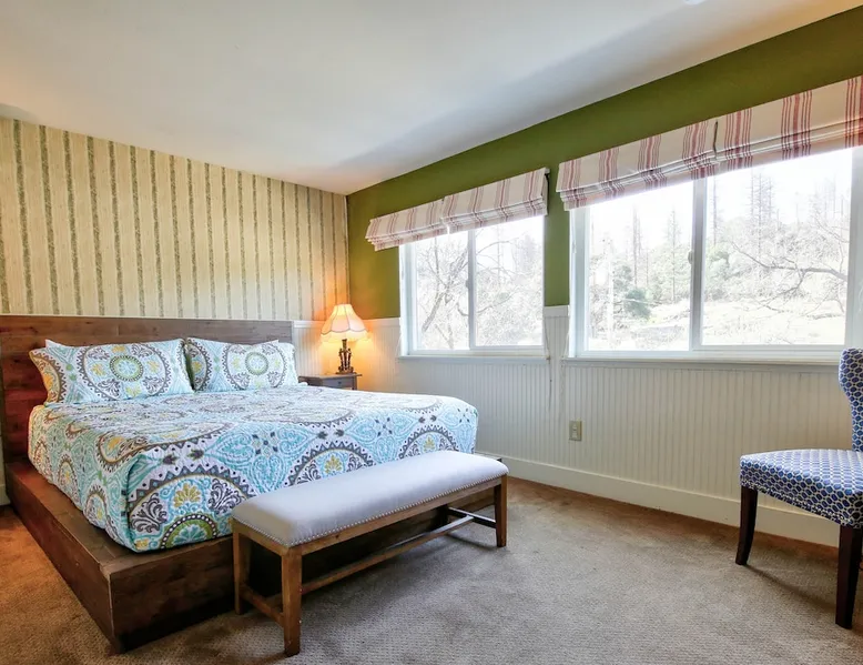 Our Deluxe Rooms at Hotel Charlotte in Groveland, California are ideal for guests who are looking for a larger room to relax in near Yosemite. Rates are based on 2-person occupancy; any additional guests over 2 years old will be charged $20/person per night. Room 7 is our newly renovated room with beautiful walnut wood floors and charming décor, and is one of our larger rooms with a King-sized bed and Queen futon and private bathroom with a shower. This pet-friendly accommodation is located on the first floor so it might not be a good choice for light sleepers or late risers. The rate is based on two people. Room 14 is one of our larger rooms with a king bed and newly renovated private bathroom with a double headed spa shower – just right for a couple’s getaway. If choosing Room 14 with 3 people, a rollaway will be added (guests over age of 2 incur a $20/night fee). The space Originally built to house the workers on the Hetch Hetchy dam in 1921, this charming historic hotel is warm and welcoming with 13 cozy rooms that invite you to snuggle up in quaint comforters during the winter or throw open the windows in the summer. Each room offers the amenities you expect, while reminding you of times gone by. Situated in the California foothills with easy access to Yosemite. Guest access Guests have access to the unique rooms, common areas, lobby seating, Keurig station, microwave, kettle and Provisions restaurant and bar and our fabulous garden patio areas (located at our sister property, The Groveland Hotel – just across the street). There is free parking on-site for guests. Other things to note There is limited cellular and data coverage in this area. There are in-room phones provided for all guests and free wi-fi available.