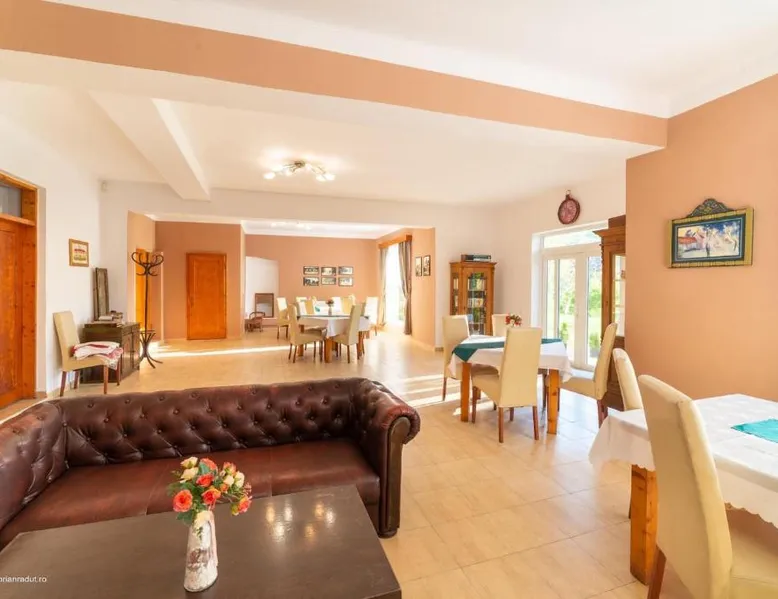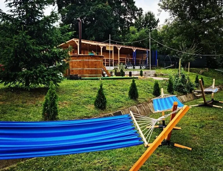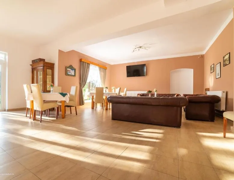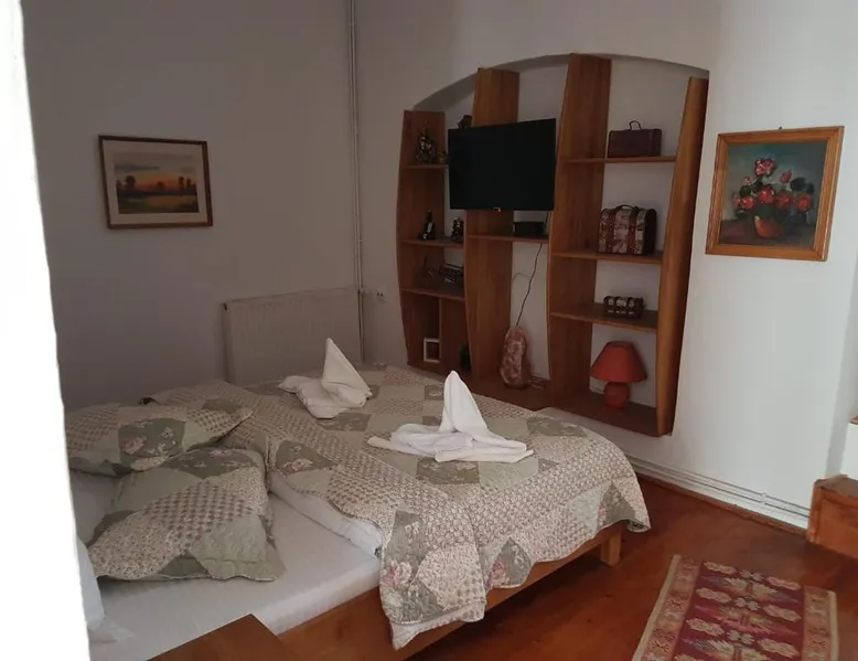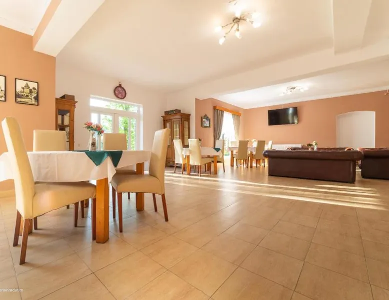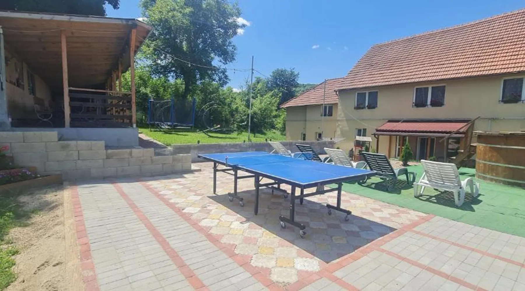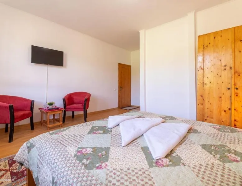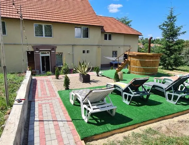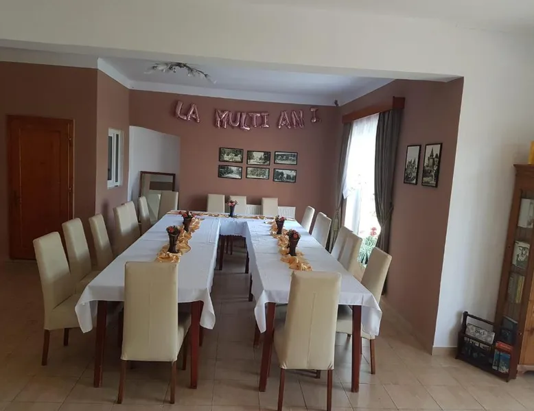 Comfortable Accommodations: Pensiunea Baron Bazna in Bazna offers family rooms with private bathrooms, kitchen facilities, and free WiFi. Each room includes a terrace or balcony with garden or lake views. Leisure and Amenities: Guests can relax on the sun terrace or in the garden. The property features a lounge, indoor and outdoor play areas, and barbecue facilities. Free on-site private parking is available. Convenient Location: Located 33 mi from Târgu Mureş Airport, the guest house is near attractions such as Valea Viilor Fortified Church (18 mi) and Biertan Fortified Church (25 mi). Hiking opportunities are nearby. Guests will find a stovetop, a refrigerator, kitchenware and an oven in the kitchen. The family room also provides guests with a barbecue. The family room provides a washing machine, a private entrance, a terrace with lake views as well as a private bathroom featuring a shower. The unit offers 2 beds.