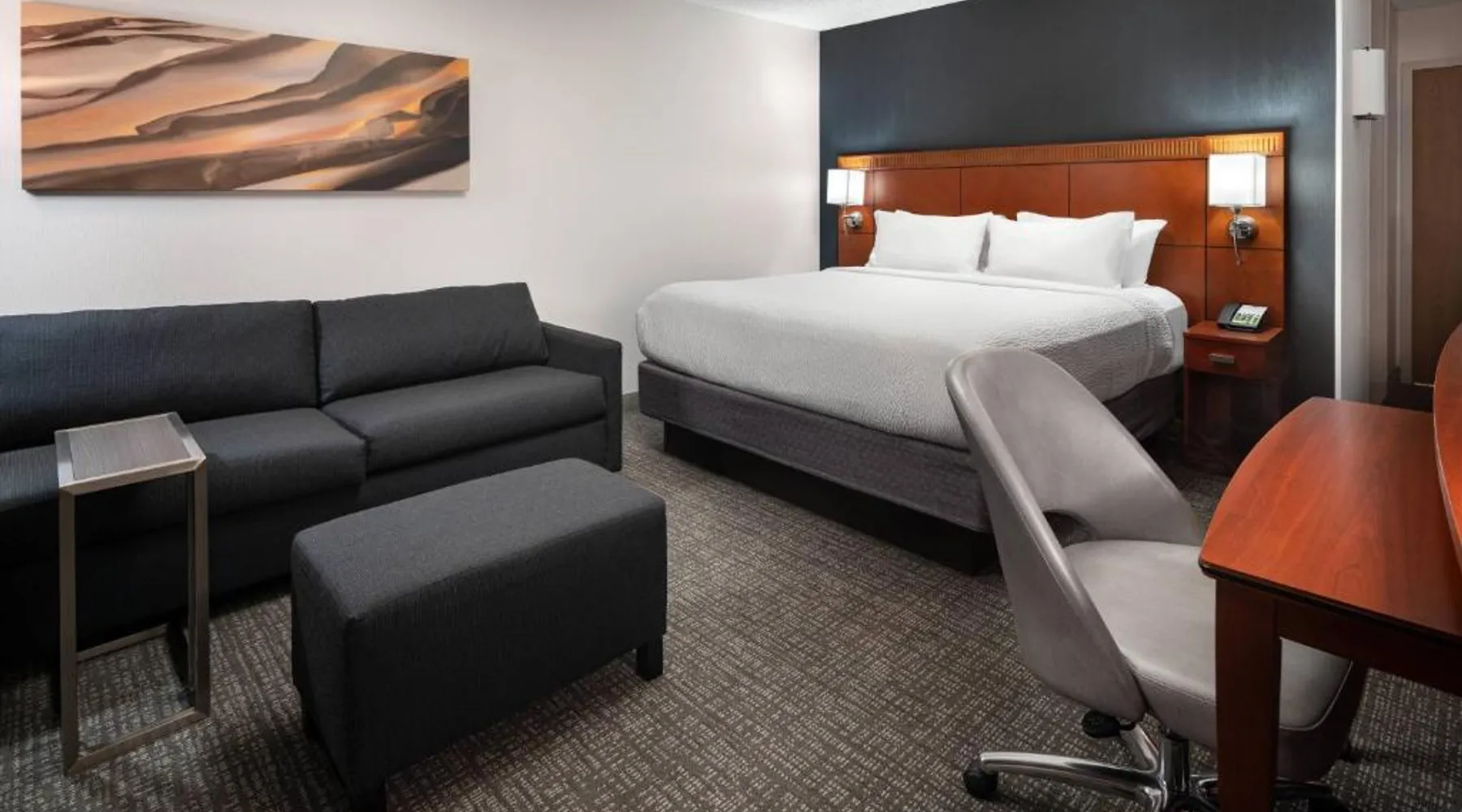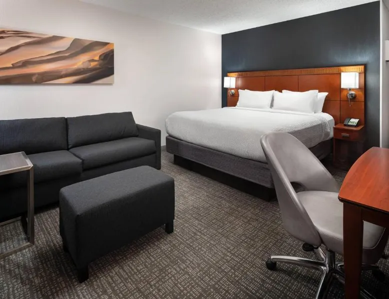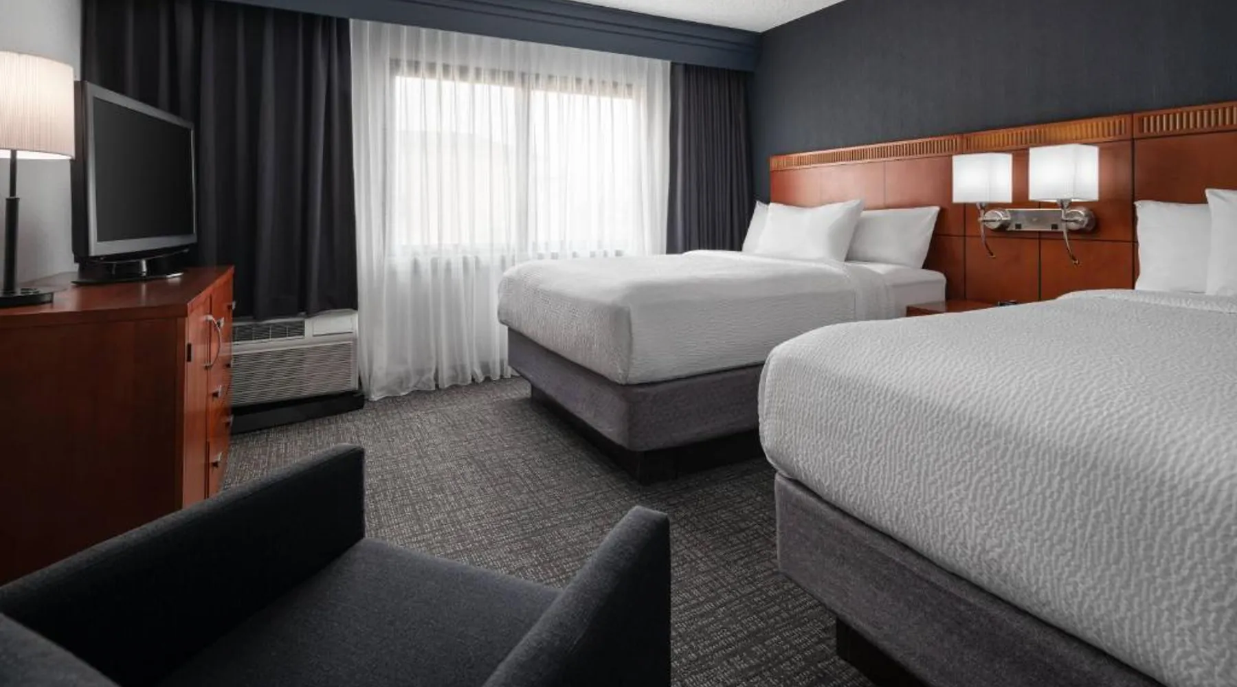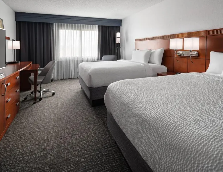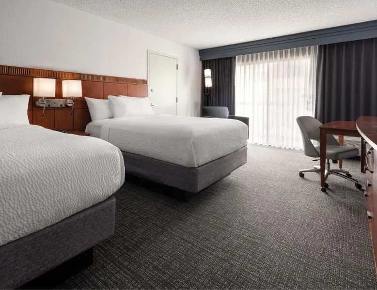 Comfortable Accommodations: Courtyard Fremont Silicon Valley in Fremont offers family rooms with air-conditioning, private bathrooms, and free WiFi. Each room includes a work desk, refrigerator, and TV. Dining and Leisure: The family-friendly restaurant serves American cuisine for dinner in a traditional ambiance. Guests can also enjoy a bar and relax in the on-site restaurant. Convenient Location: Located 11 mi from Norman Y. Mineta San Jose International Airport, the hotel is near attractions such as San Jose Convention Center (12 mi) and Shoreline Amphitheater (15 mi). Guest Satisfaction: Highly rated for its attentive staff and impeccable room cleanliness. The double room features air conditioning. The unit has 2 beds.