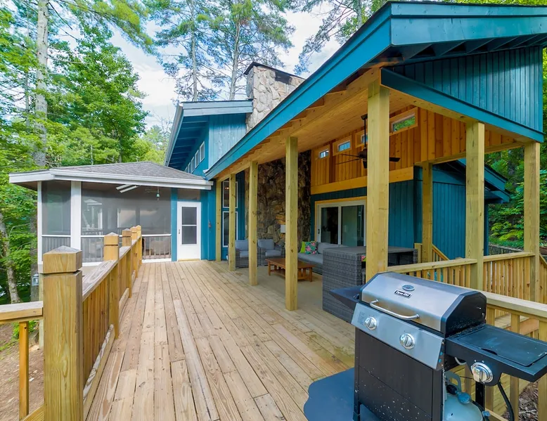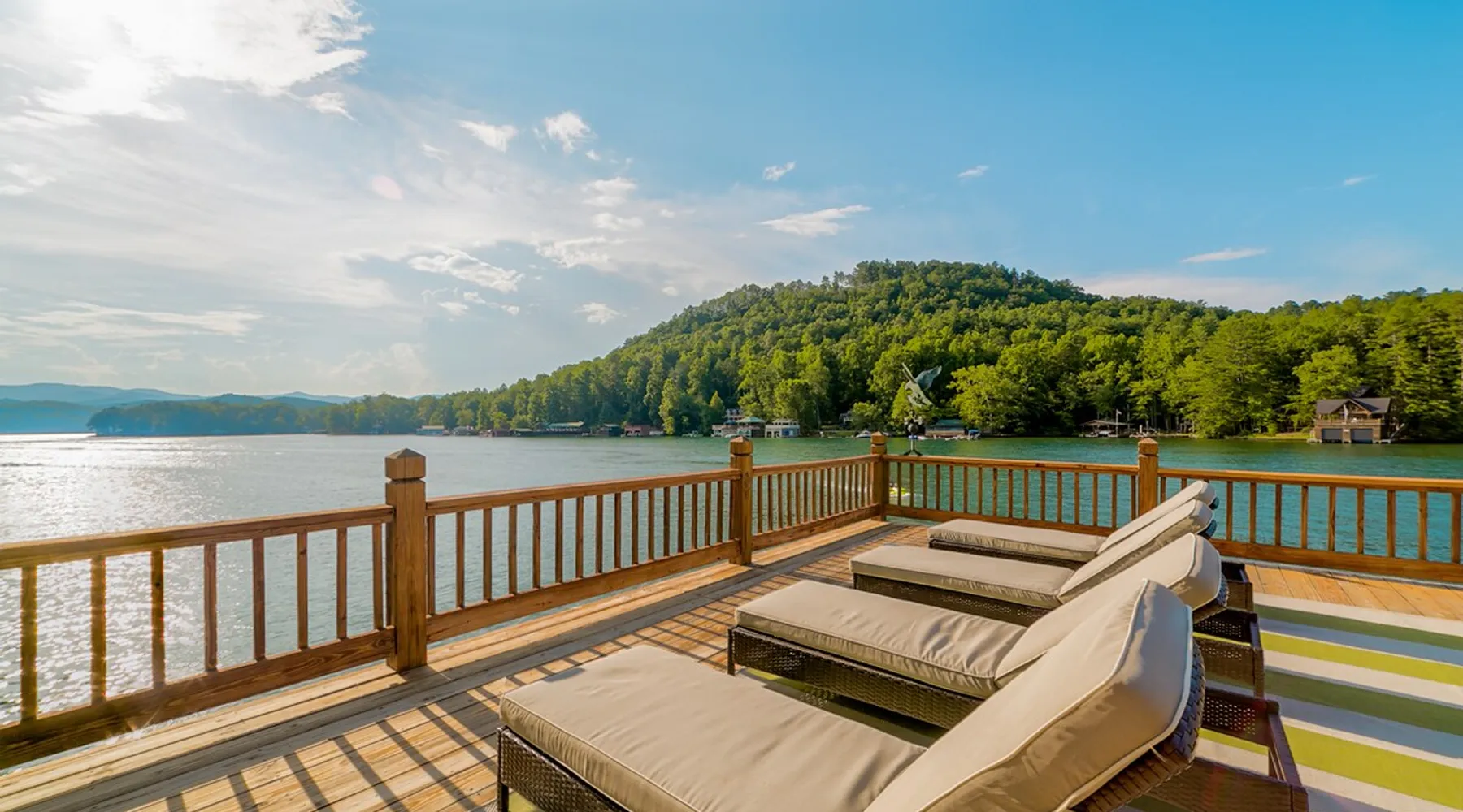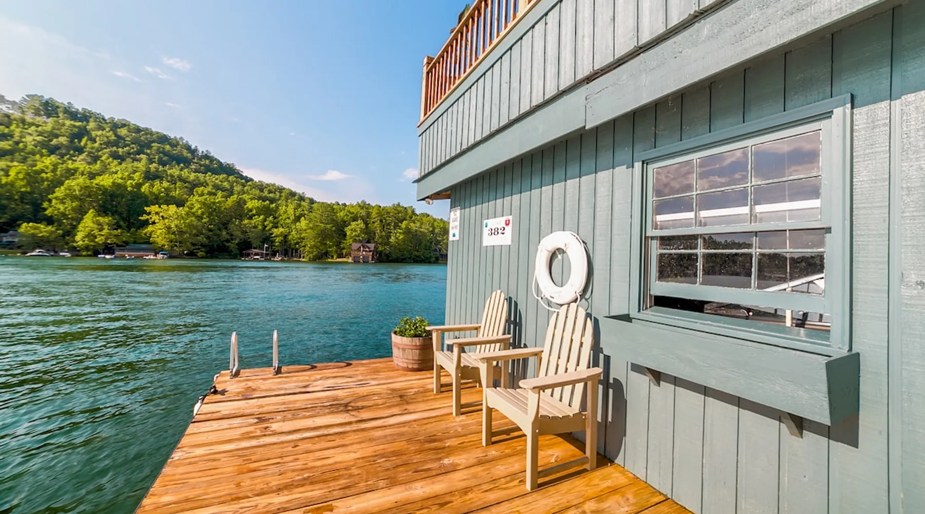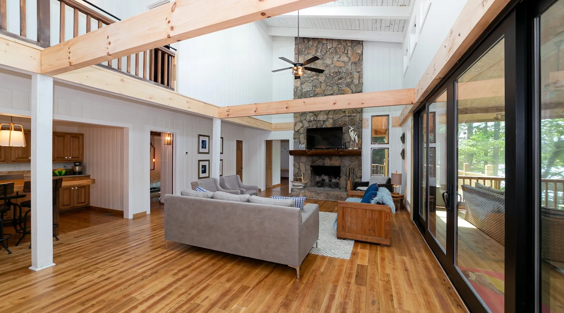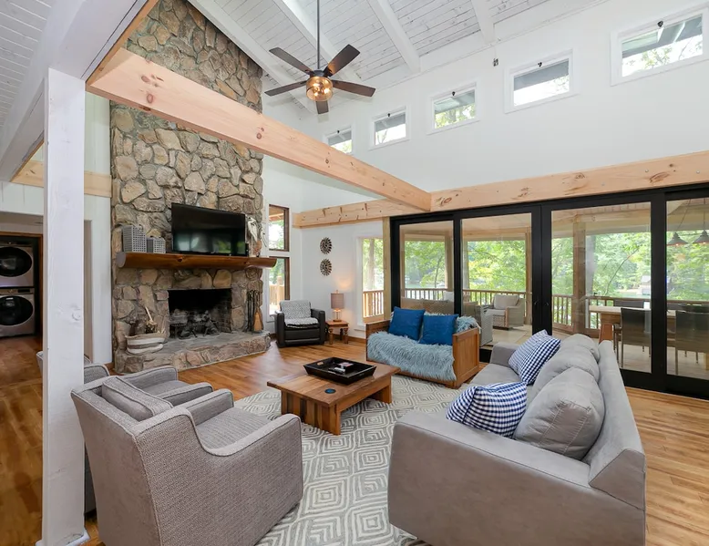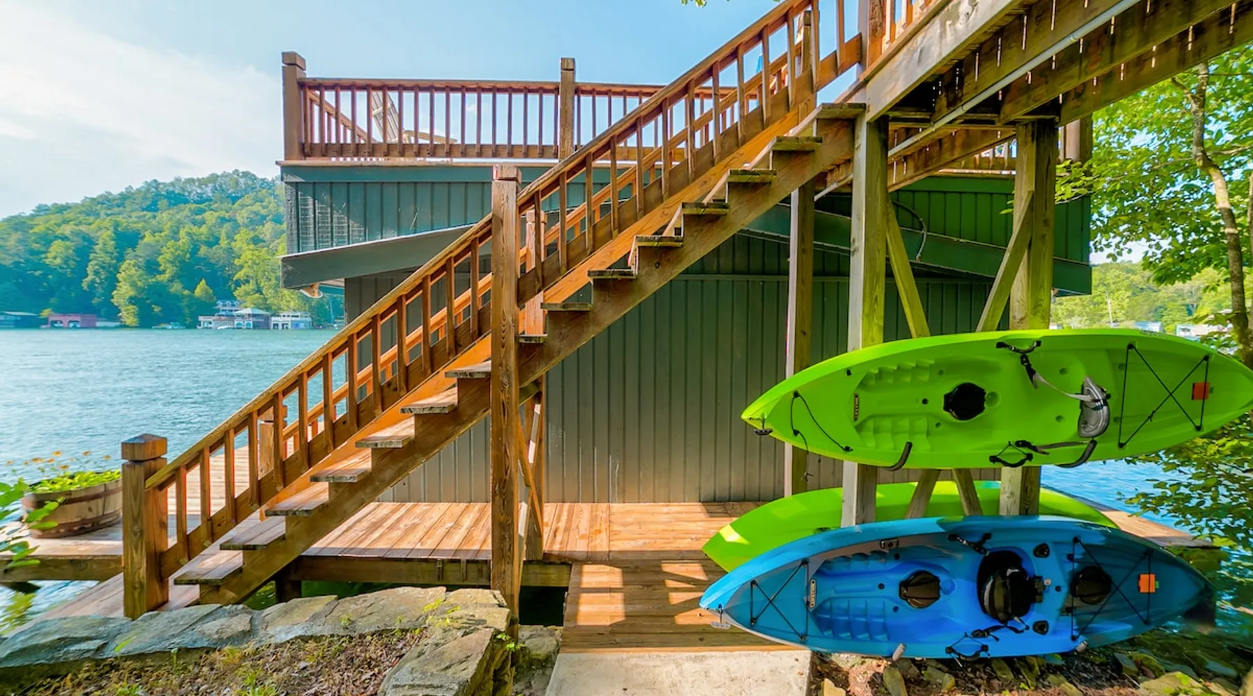 Visit this truly classic lake house located on Lake Burton. Private Multi Level Boathouse. This property is nestled in Murray Cove with calm waters . Large vaulted wood ceilings and bright windows fill the home with ambient light, and the open layout provides a perfect gathering space for families. Large decks including a screened-in portion and covered outdoor patio with comfortable seating make it easy to enjoy the surrounding beautiful scenery. The space Visit this truly classic lake house located on Lake Burton. Modern renovations give this 70s-built home a nostalgic summertime vibe. This property is nestled in Murray Cove with calm waters and peaceful sounds of the lake. Large, vaulted wood ceilings and bright windows fill the home with ambient light, and the open layout provides a perfect gathering space for families. Large decks including a screened-in portion and covered outdoor patio with comfortable seating make it easy to enjoy the surrounding scenery. This home features a spacious open layout with high vaulted ceilings, a stone wood-burning fireplace, and large beams and windows. The four large bedrooms provide 3 king beds and a bunk room that can easily accommodate groups and families. New renovations including vintage light fixtures, stylish furniture, and bright paint give this classic lake house a modern rustic feel. The boathouse deck features plenty of seating including sun-lounger chairs and a patio table with an umbrella. Ideal for sunbathing, bbq, swimming, fishing, and enjoying the idyllic scenes of Lake Burton. There are 3 kayaks provided for guest use. The boat is not available, but rentals are available at LaPrade's Marina less than 10 minutes away. Other things to note 25+ age requirement for lead guest. No exceptions. This property is not pet-friendly. No exceptions. Digital rental agreement will be required to sign and complete after property is booked. Firewood not supplied. Georgia fishing license required for fishing on the property. Boat not available to guests, rentals are available at LaPrade's Marina less than 10 minutes away from property. 23' of dock space to tie up rental boat during the day. Lake Burton drawdown schedule 2025/2026: • October 2025 - As of this year The lake is scheduled to remain at its normal summer pool elevation of 1865 feet (1865.0 elevation)