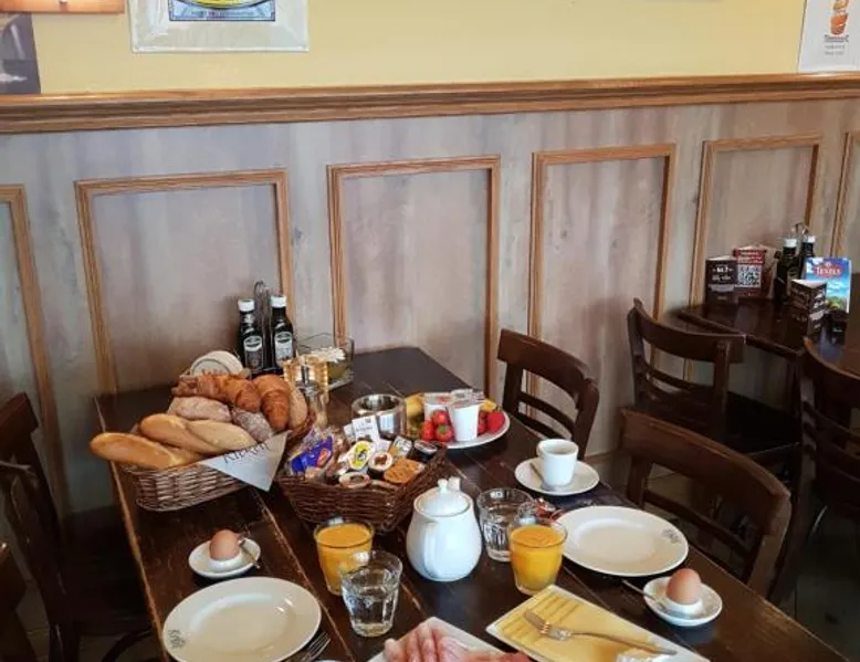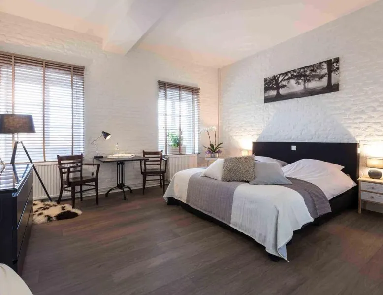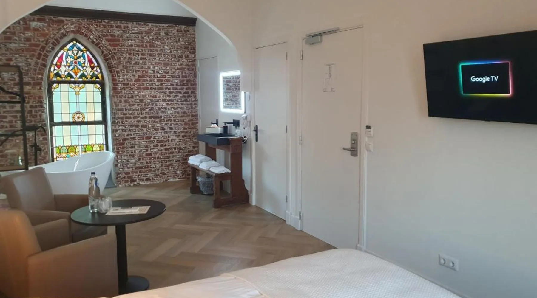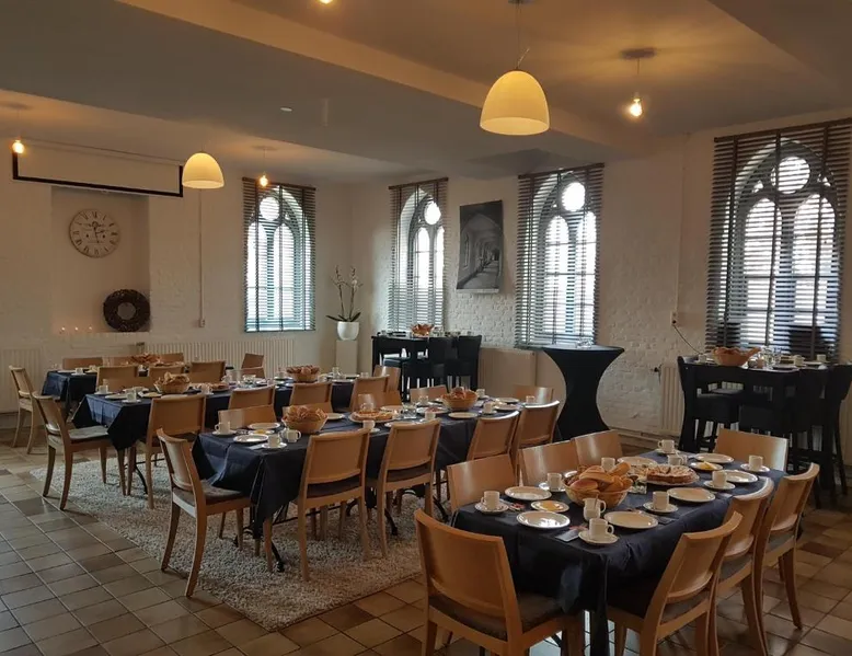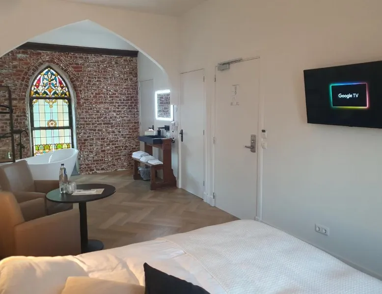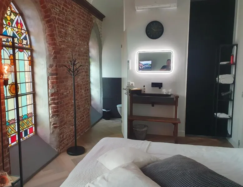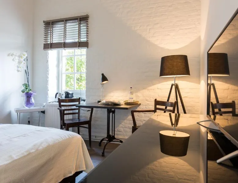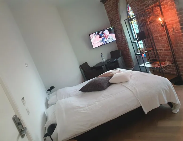 Comfortable Accommodations: B&B - Eetcafe - Riekelt in Gronsveld offers comfortable rooms with private bathrooms, free WiFi, and modern amenities. Each room includes a work desk, TV, and a private balcony or terrace. Dining and Leisure: Guests can enjoy a continental breakfast with vegetarian and gluten-free options, including juice, cheese, and fruits. The on-site restaurant serves European cuisine for brunch, lunch, and dinner, complemented by a bar offering cocktails. Convenient Location: Located 9.3 mi from Maastricht-Aachen Airport, the property is a short walk from Kasteel van Rijckholt. Nearby attractions include Basilica of Saint Servatius and Vrijthof, each 6.8 mi away. Free bicycles are available for exploring the area. The family room offers a seating area, a sofa, as well as a private bathroom featuring a walk-in shower and a hairdryer. This family room features a tea and coffee maker, flat-screen TV with streaming services, a quiet street view, as well as wine/champagne for guests.