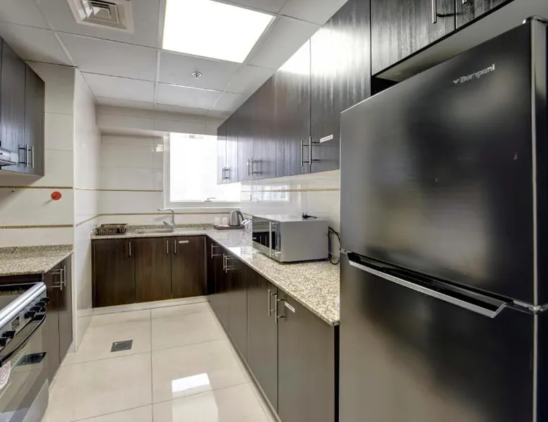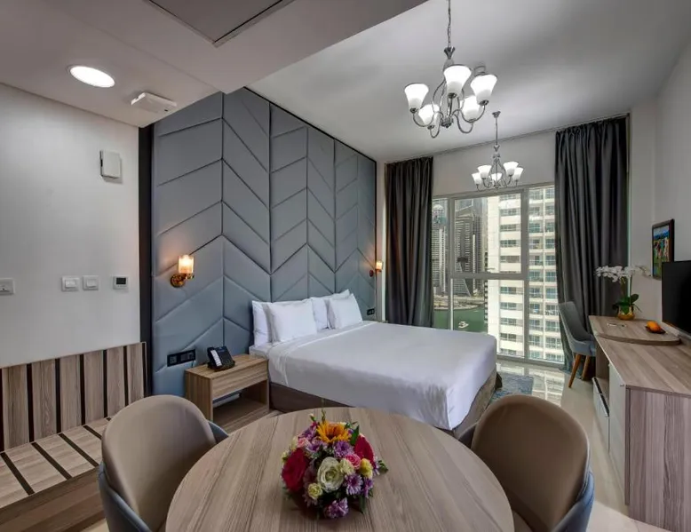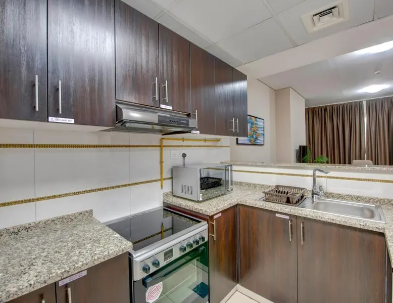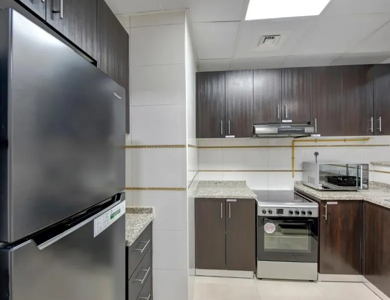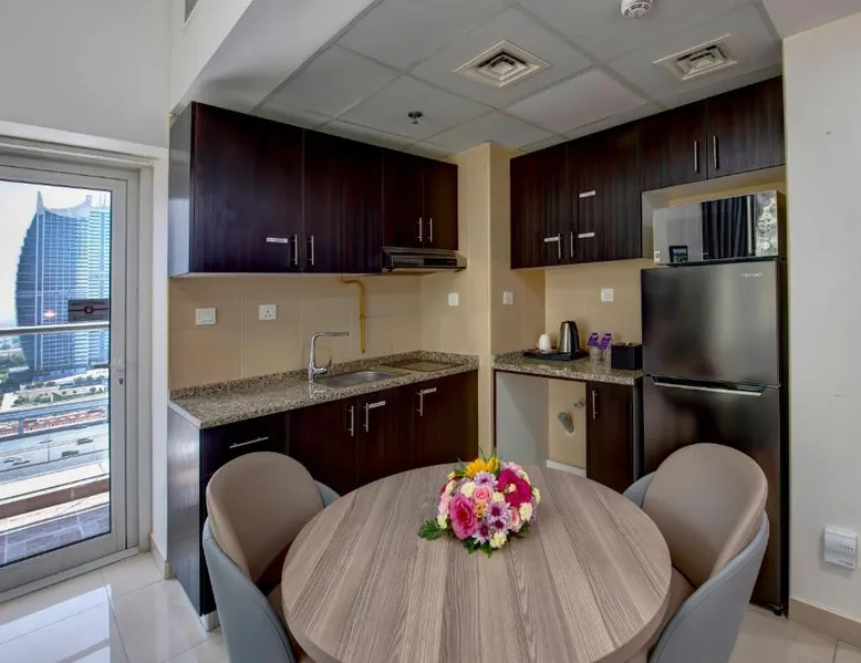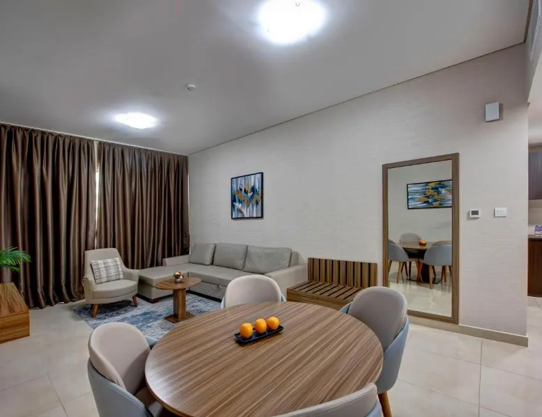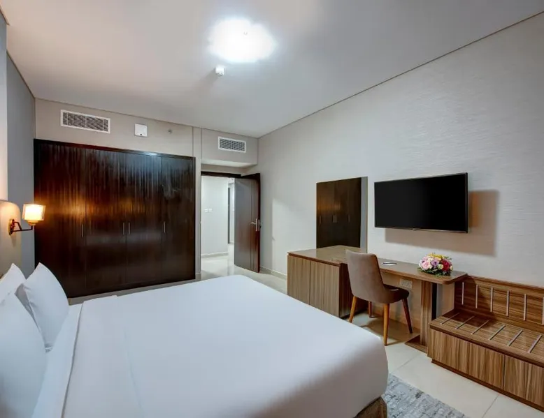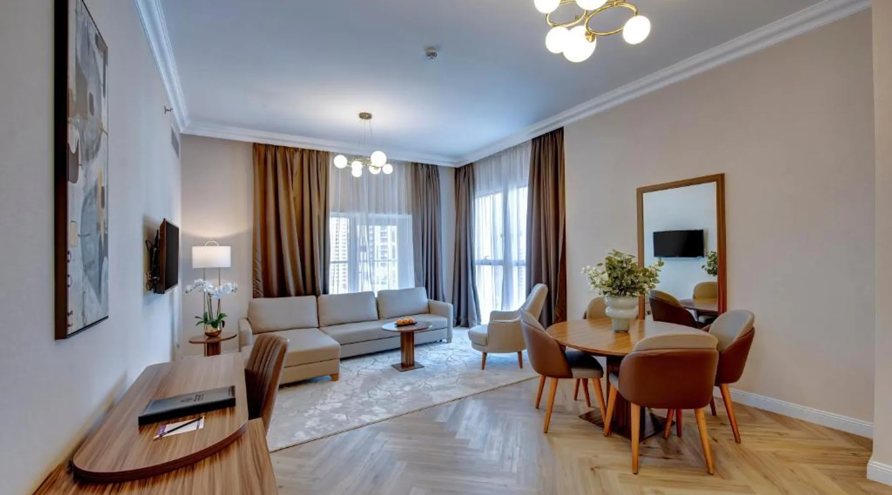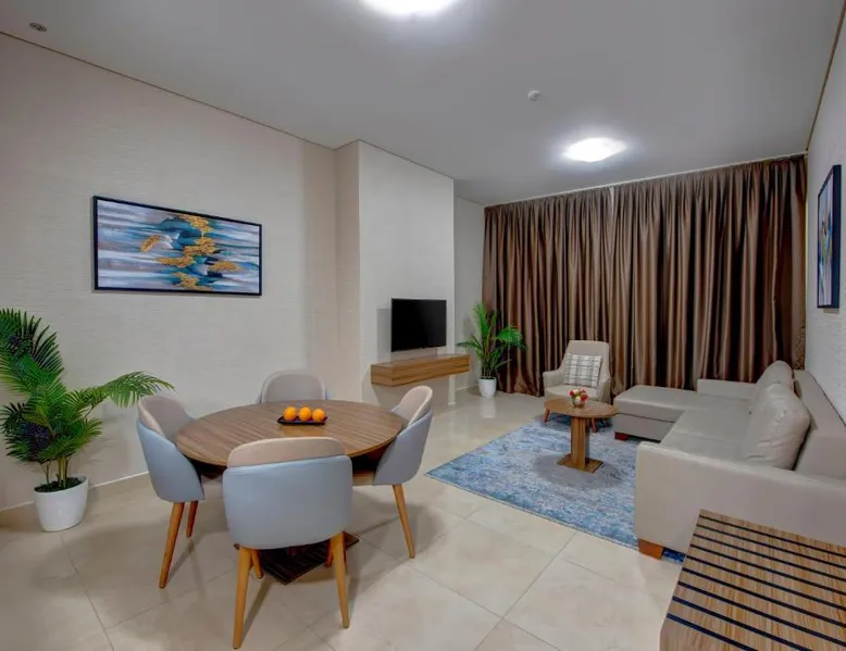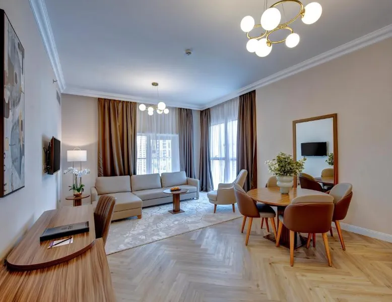 Elegant Accommodations: Regency Luxury Suites in Dubai offers an aparthotel with a rooftop swimming pool, fitness center, restaurant, and free WiFi. Guests enjoy modern amenities including a fitness room, elevator, 24-hour front desk, and concierge service. Comfortable Living: Each suite features air-conditioning, a kitchenette, private bathroom, and a dining area. Additional amenities include a terrace, balcony, and free toiletries. The property offers free on-site private parking, bicycle parking, and a tour desk. Dining Experience: The modern restaurant serves Indian, Russian, local, Asian, and international cuisines for lunch and dinner. Breakfast includes continental and buffet options with local specialties, warm dishes, fresh pastries, and more. Prime Location: Located 16 mi from Al Maktoum International Airport, the aparthotel is a 15-minute walk from The Walk at JBR. Nearby attractions include Marina Beach (1.2 mi) and Burj Khalifa (13 mi). Guests appreciate the nearby shops and scenic views. This spacious apartment comes with 1 living room, 2 separate bedrooms and 2 bathrooms with a walk-in shower and free toiletries. In the well-equipped kitchen, guests will find a stovetop, a refrigerator, kitchenware and an oven. The air-conditioned apartment features a flat-screen TV with satellite channels, a washing machine, soundproof walls, a tea and coffee maker as well as city views. The unit has 4 beds.