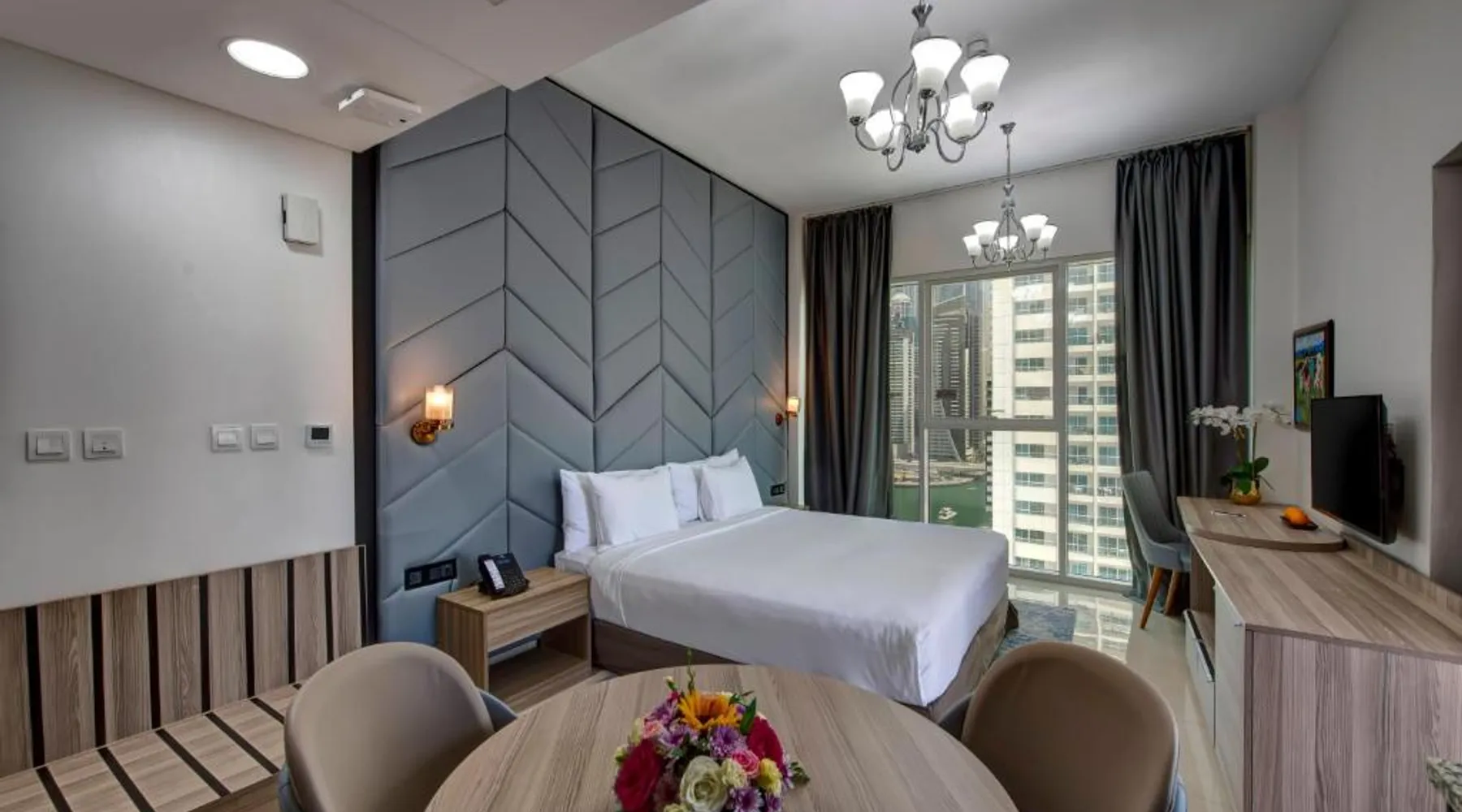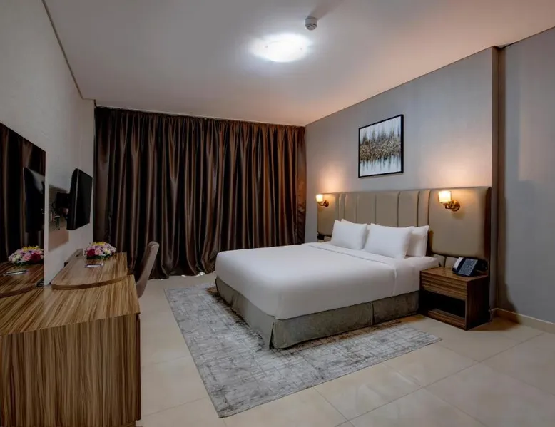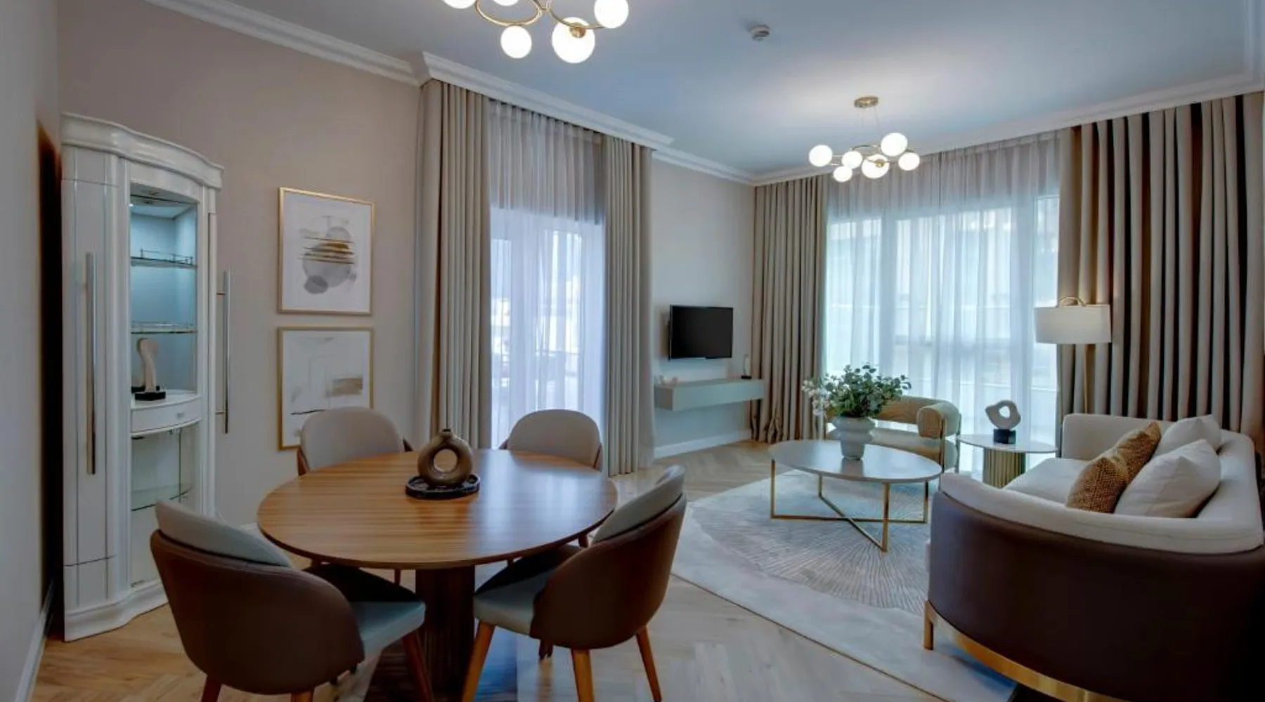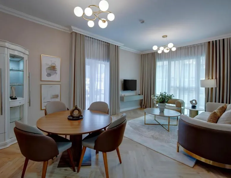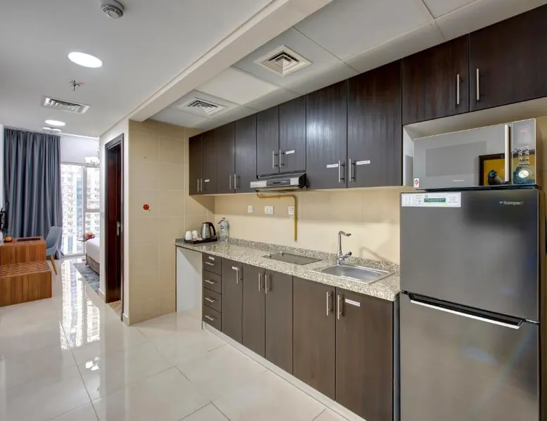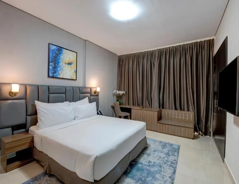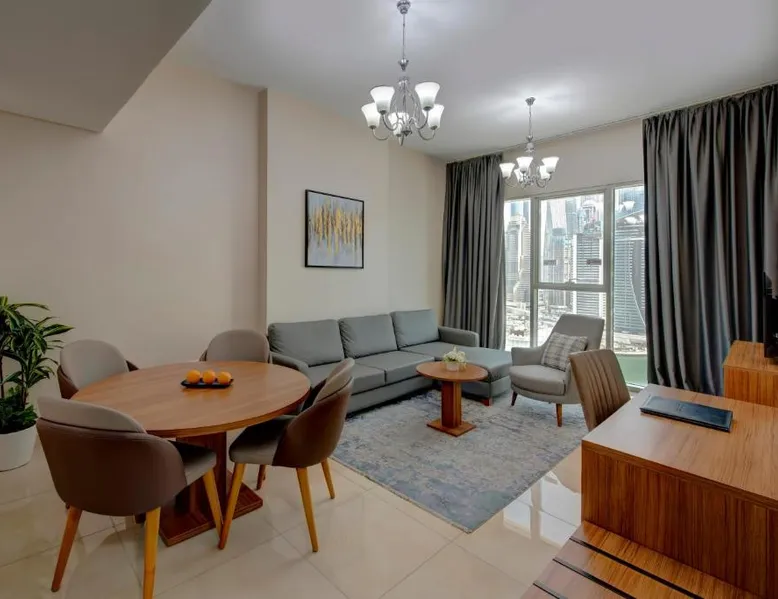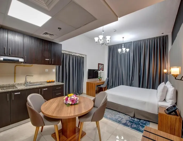 Elegant Accommodations: Regency Luxury Suites in Dubai offers an aparthotel with a rooftop swimming pool, fitness center, restaurant, and free WiFi. Guests enjoy modern amenities including a fitness room, elevator, 24-hour front desk, and concierge service. Comfortable Living: Each suite features air-conditioning, a kitchenette, private bathroom, and a dining area. Additional amenities include a terrace, balcony, and free toiletries. The property offers free on-site private parking, bicycle parking, and a tour desk. Dining Experience: The modern restaurant serves Indian, Russian, local, Asian, and international cuisines for lunch and dinner. Breakfast includes continental and buffet options with local specialties, warm dishes, fresh pastries, and more. Prime Location: Located 16 mi from Al Maktoum International Airport, the aparthotel is a 15-minute walk from The Walk at JBR. Nearby attractions include Marina Beach (1.2 mi) and Burj Khalifa (13 mi). Guests appreciate the nearby shops and scenic views. This spacious apartment comes with 1 living room, 2 separate bedrooms and 2 bathrooms with a walk-in shower and free toiletries. In the well-equipped kitchen, guests will find a stovetop, a refrigerator, kitchenware and an oven. The air-conditioned apartment features a flat-screen TV with satellite channels, a washing machine, soundproof walls, a tea and coffee maker as well as city views. The unit has 4 beds.