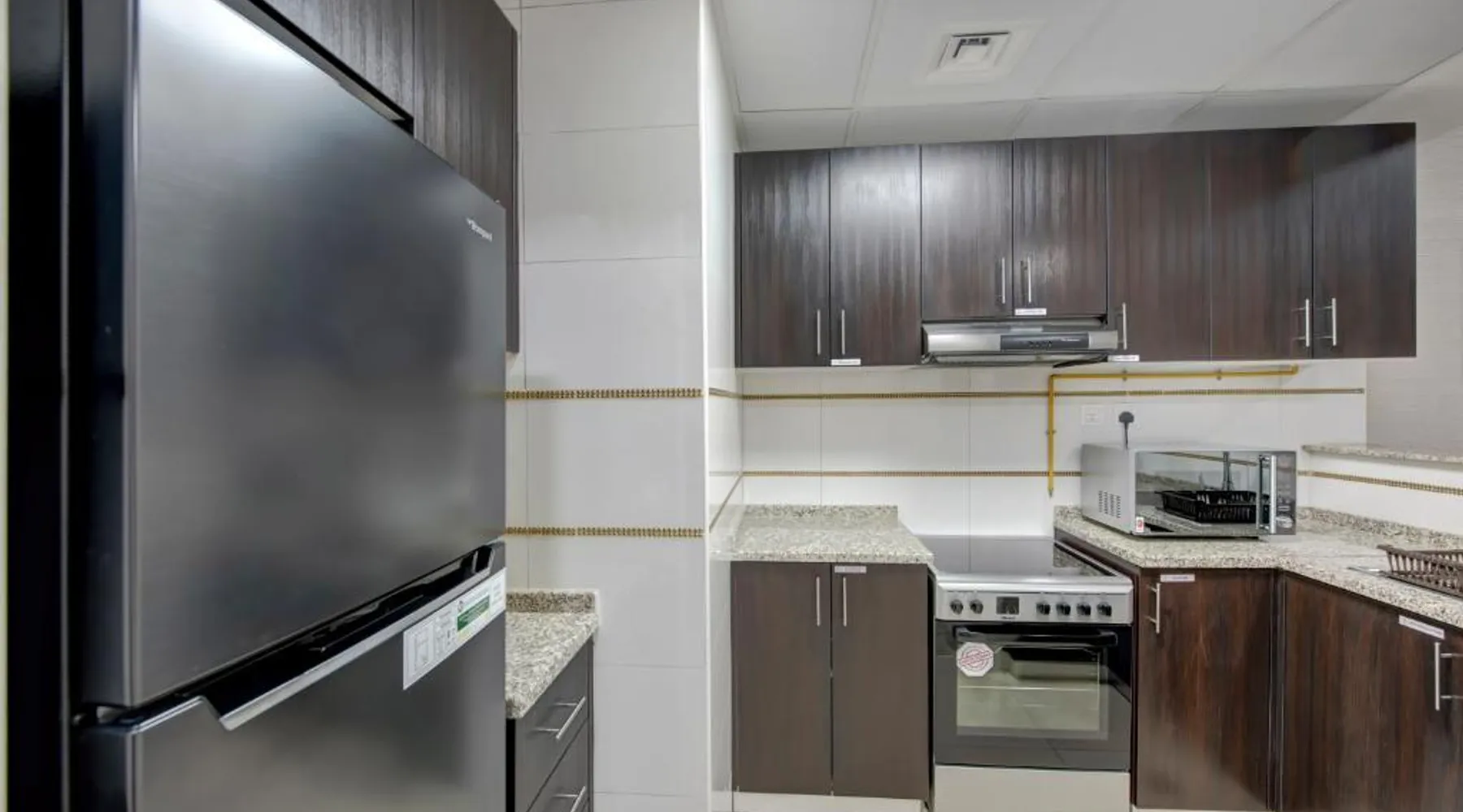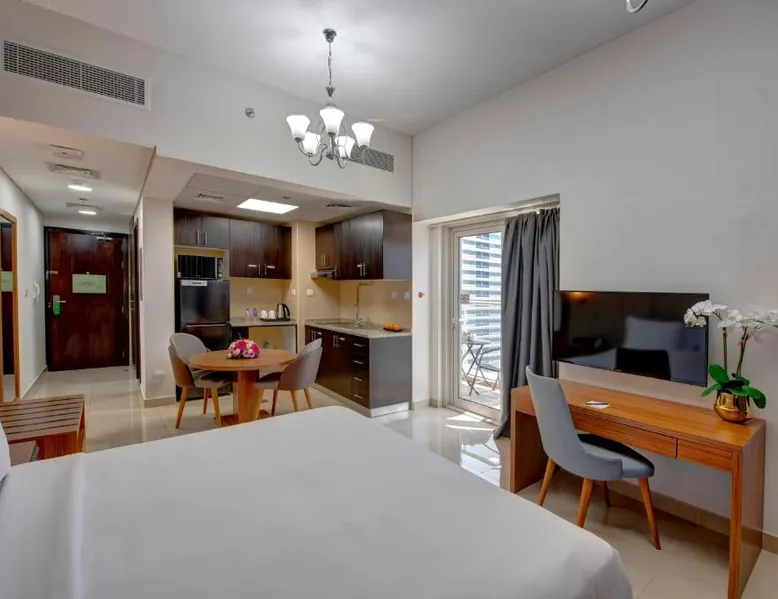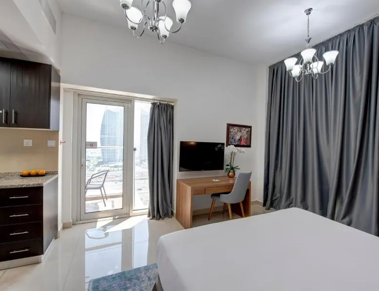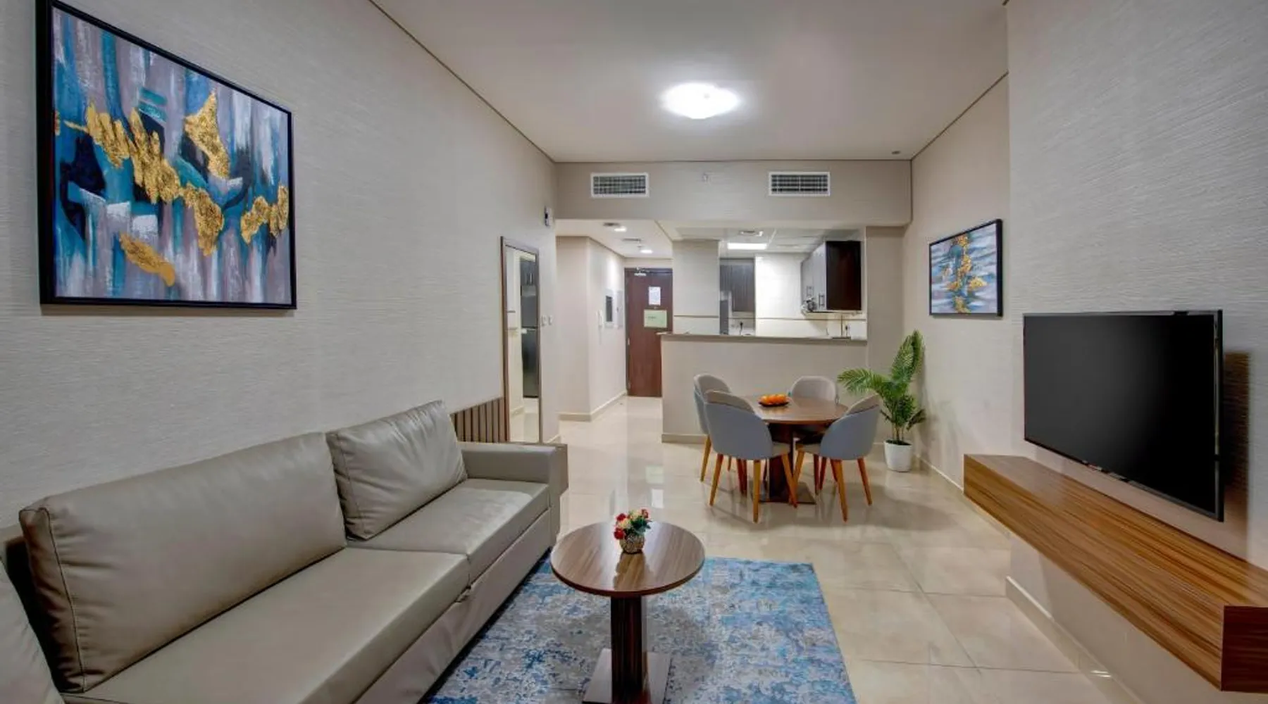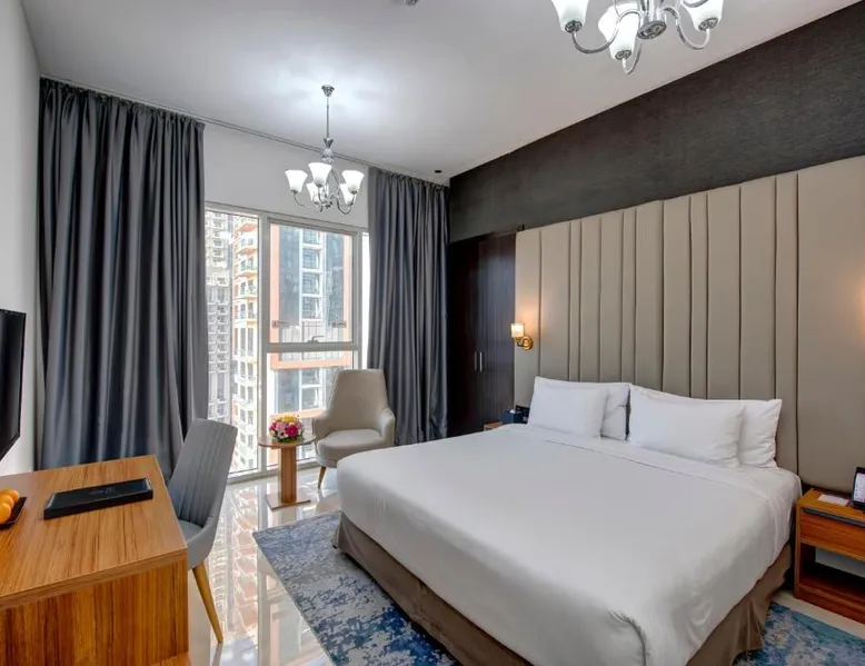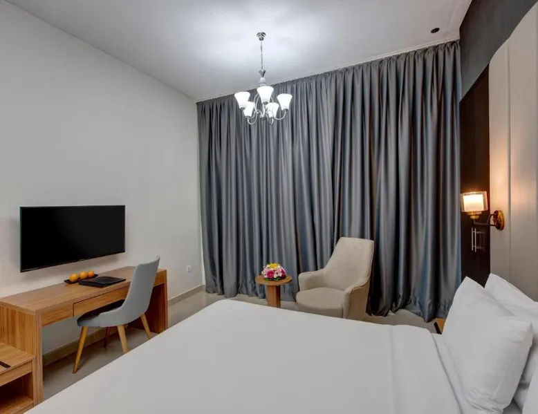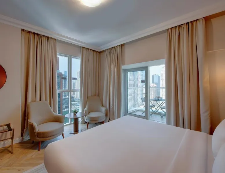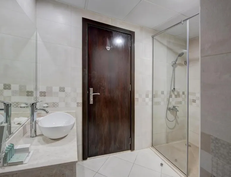 Elegant Accommodations: Regency Luxury Suites in Dubai offers an aparthotel with a rooftop swimming pool, fitness center, restaurant, and free WiFi. Guests enjoy modern amenities including a fitness room, elevator, 24-hour front desk, and concierge service. Comfortable Living: Each suite features air-conditioning, a kitchenette, private bathroom, and a dining area. Additional amenities include a terrace, balcony, and free toiletries. The property offers free on-site private parking, bicycle parking, and a tour desk. Dining Experience: The modern restaurant serves Indian, Russian, local, Asian, and international cuisines for lunch and dinner. Breakfast includes continental and buffet options with local specialties, warm dishes, fresh pastries, and more. Prime Location: Located 16 mi from Al Maktoum International Airport, the aparthotel is a 15-minute walk from The Walk at JBR. Nearby attractions include Marina Beach (1.2 mi) and Burj Khalifa (13 mi). Guests appreciate the nearby shops and scenic views. This spacious apartment comes with 1 living room, 2 separate bedrooms and 2 bathrooms with a walk-in shower and free toiletries. In the well-equipped kitchen, guests will find a stovetop, a refrigerator, kitchenware and an oven. The air-conditioned apartment features a flat-screen TV with satellite channels, a washing machine, soundproof walls, a tea and coffee maker as well as city views. The unit has 4 beds.