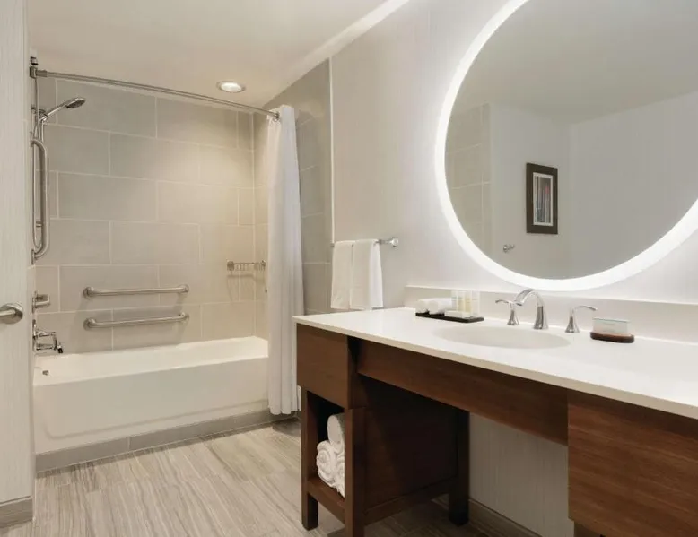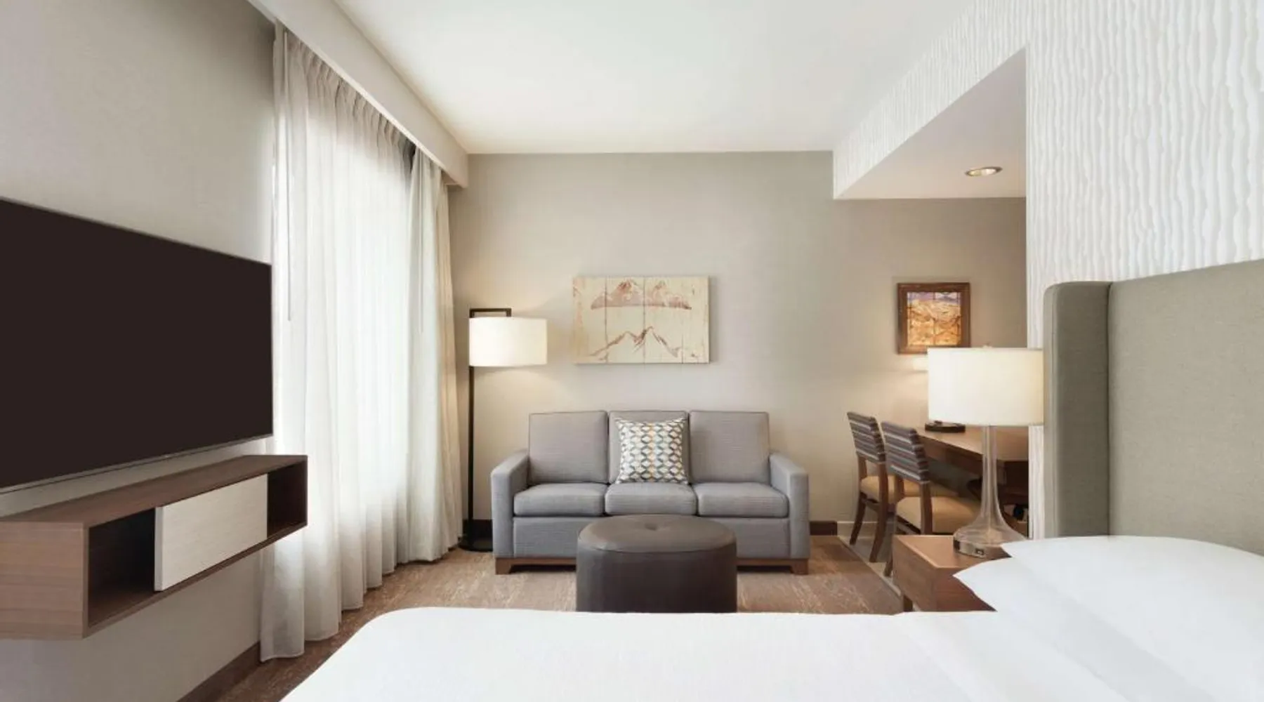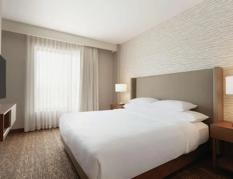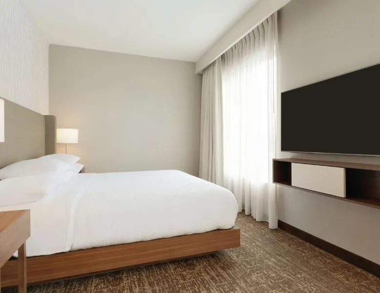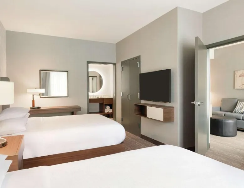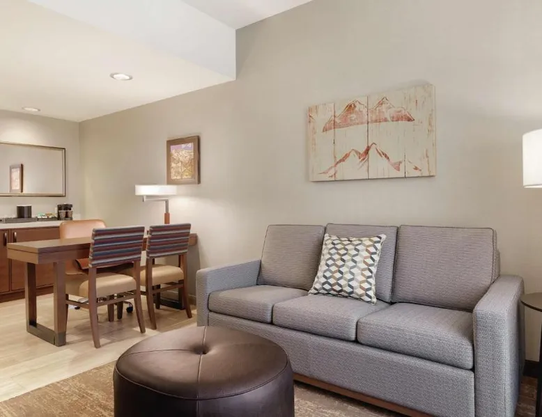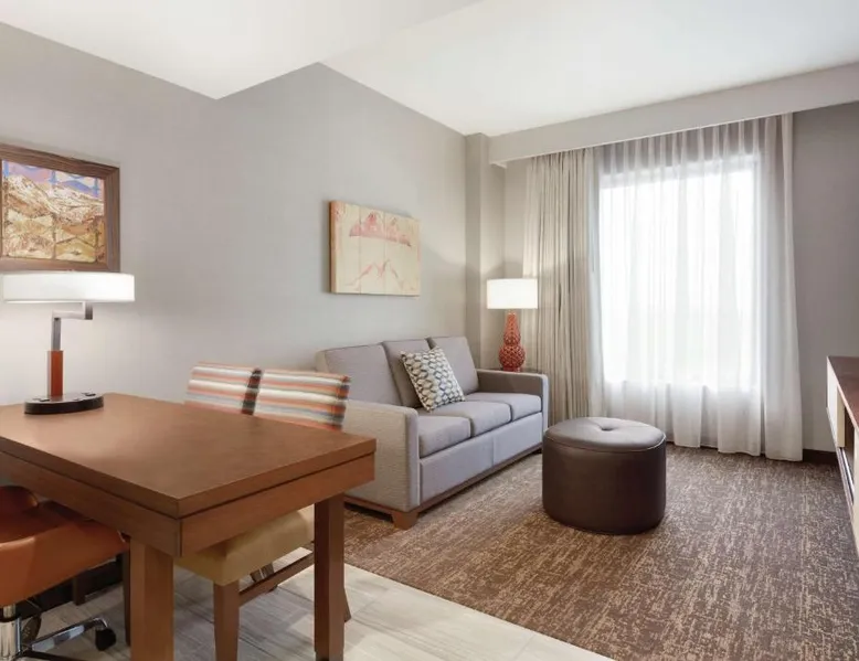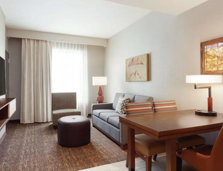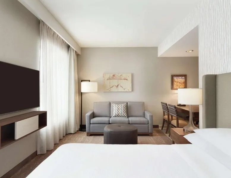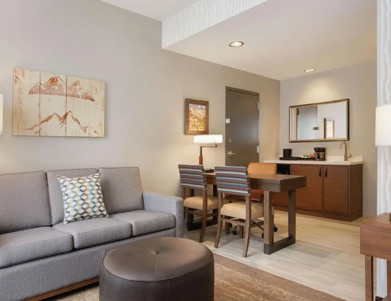 Comfortable Accommodations: Embassy Suites By Hilton South Jordan Salt Lake City in South Jordan offers family rooms with air-conditioning, free WiFi, and modern amenities. Each room includes a sofa bed, work desk, and free toiletries. Dining and Leisure: The hotel features a family-friendly restaurant serving American, pizza, and barbecue grill. Guests can also enjoy a bar, indoor swimming pool, fitness center, and outdoor fireplace. Convenient Location: Located 18 mi from Salt Lake City International Airport, the hotel is near attractions such as Salt Palace and Temple Square. Free on-site private parking is available. Guest Satisfaction: Highly rated for its breakfast, room comfort, and cleanliness, the property ensures a pleasant stay for all visitors. This suite has air conditioning, a seating area and a flat-screen TV with cable channels. The unit has 1 bed.
