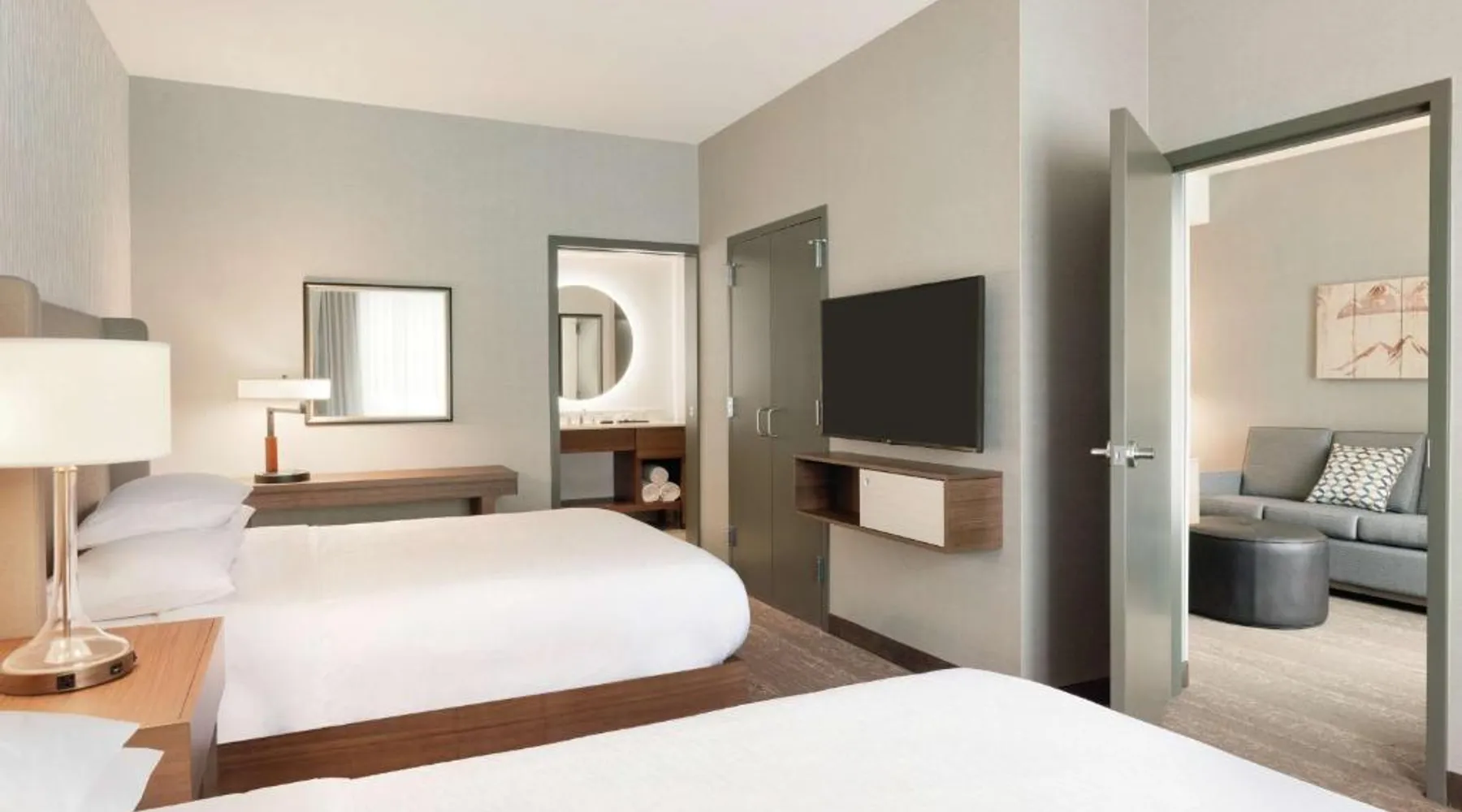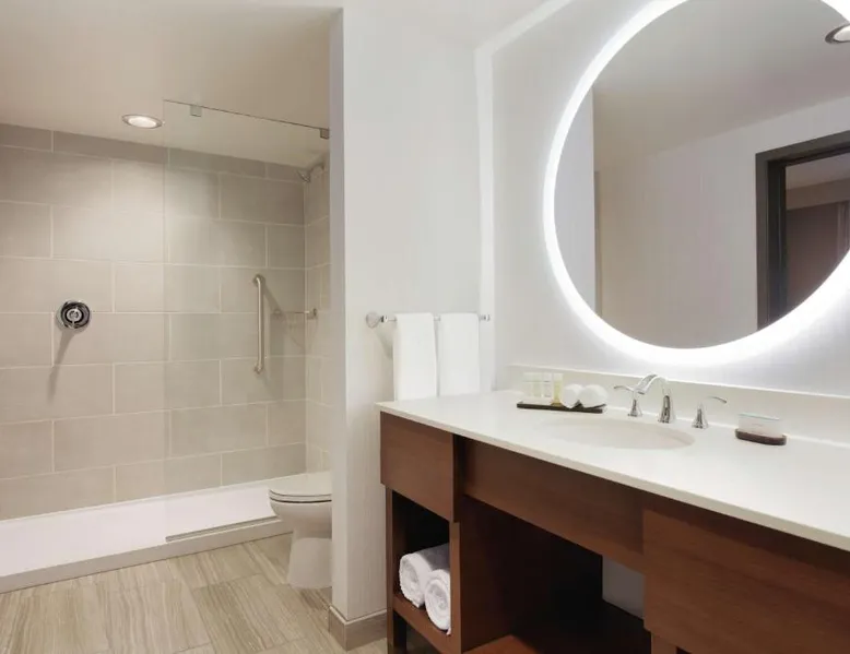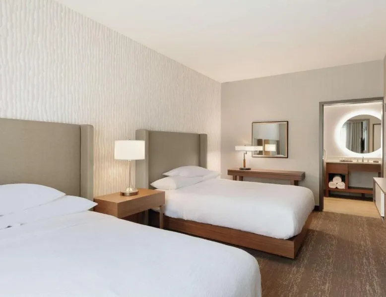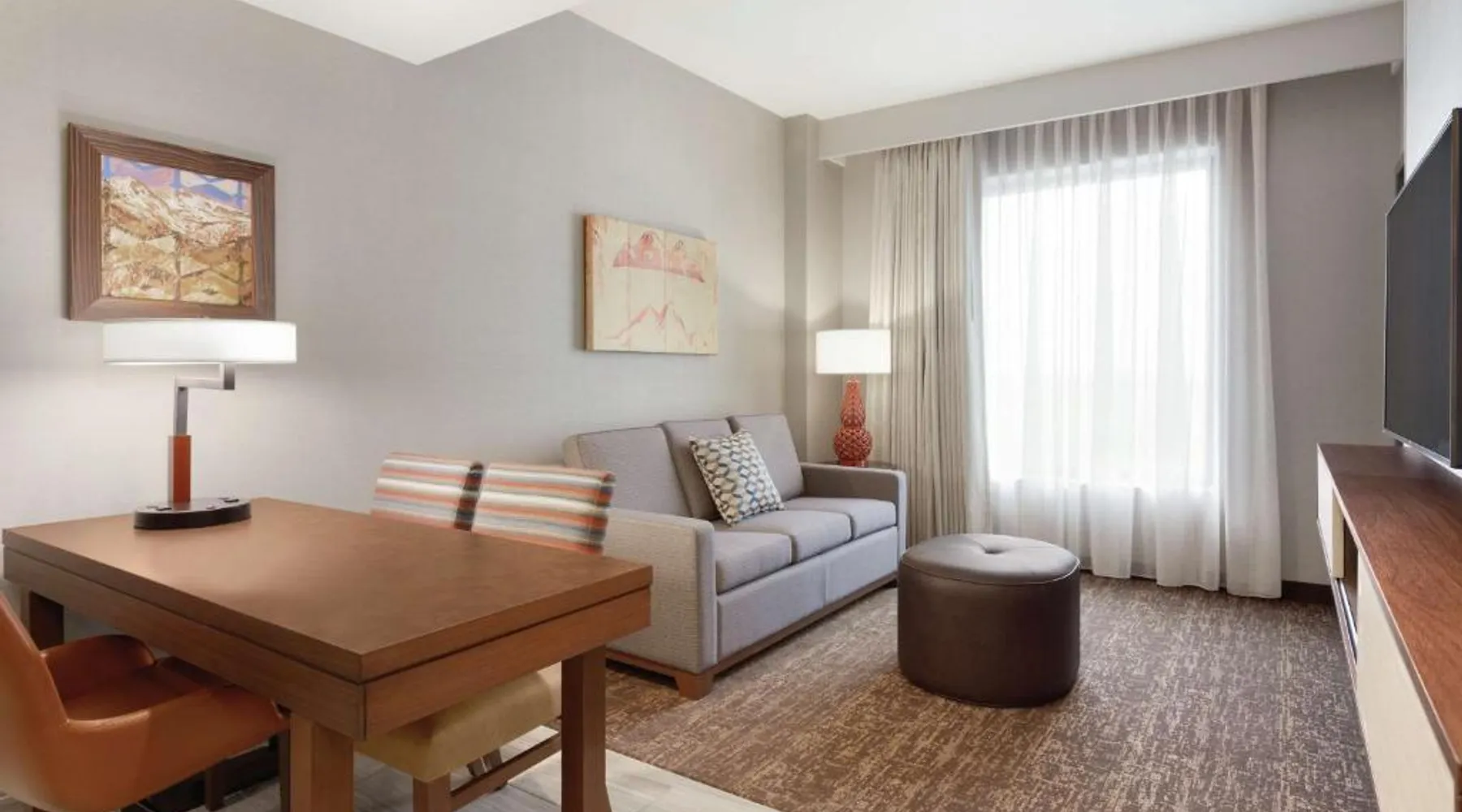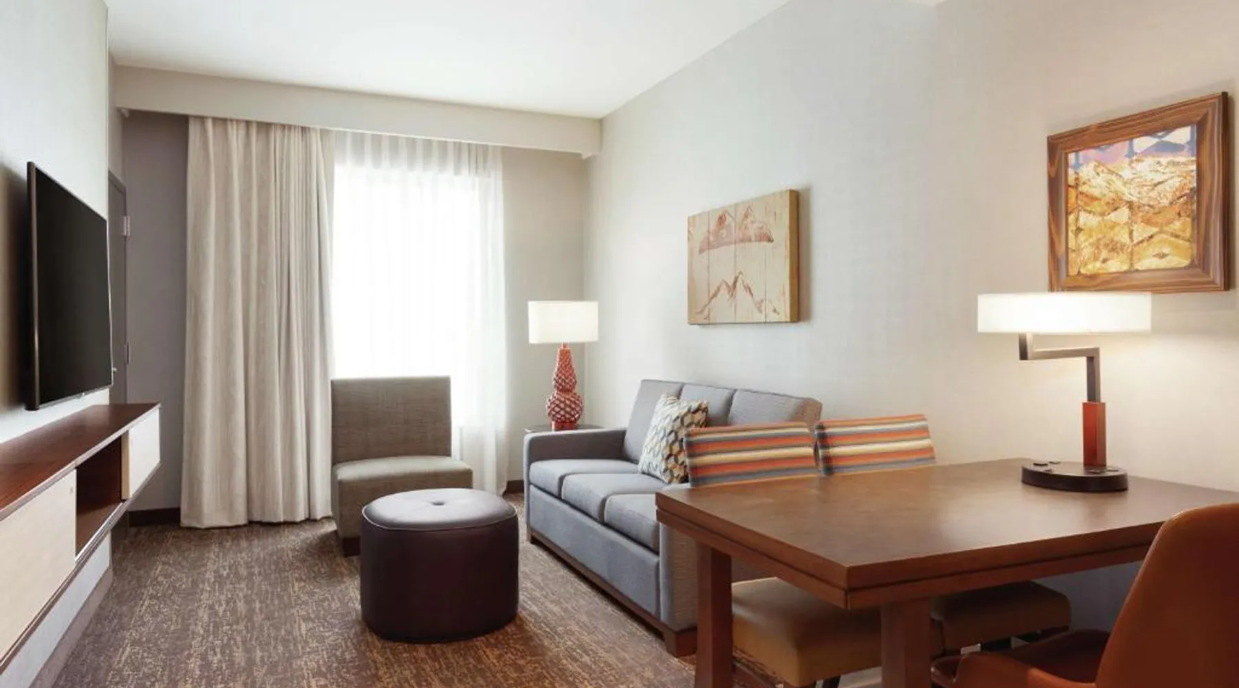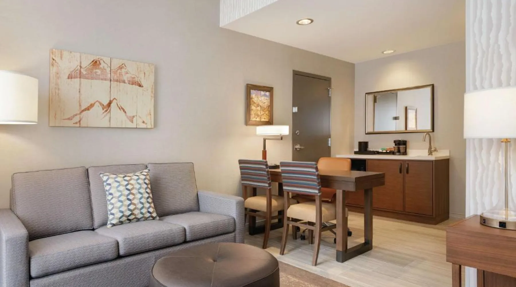 Comfortable Accommodations: Embassy Suites By Hilton South Jordan Salt Lake City in South Jordan offers family rooms with air-conditioning, free WiFi, and modern amenities. Each room includes a sofa bed, work desk, and free toiletries. Dining and Leisure: The hotel features a family-friendly restaurant serving American, pizza, and barbecue grill. Guests can also enjoy a bar, indoor swimming pool, fitness center, and outdoor fireplace. Convenient Location: Located 18 mi from Salt Lake City International Airport, the hotel is near attractions such as Salt Palace and Temple Square. Free on-site private parking is available. Guest Satisfaction: Highly rated for its breakfast, room comfort, and cleanliness, the property ensures a pleasant stay for all visitors. This suite has air conditioning, a seating area and a flat-screen TV with cable channels. The unit has 1 bed.