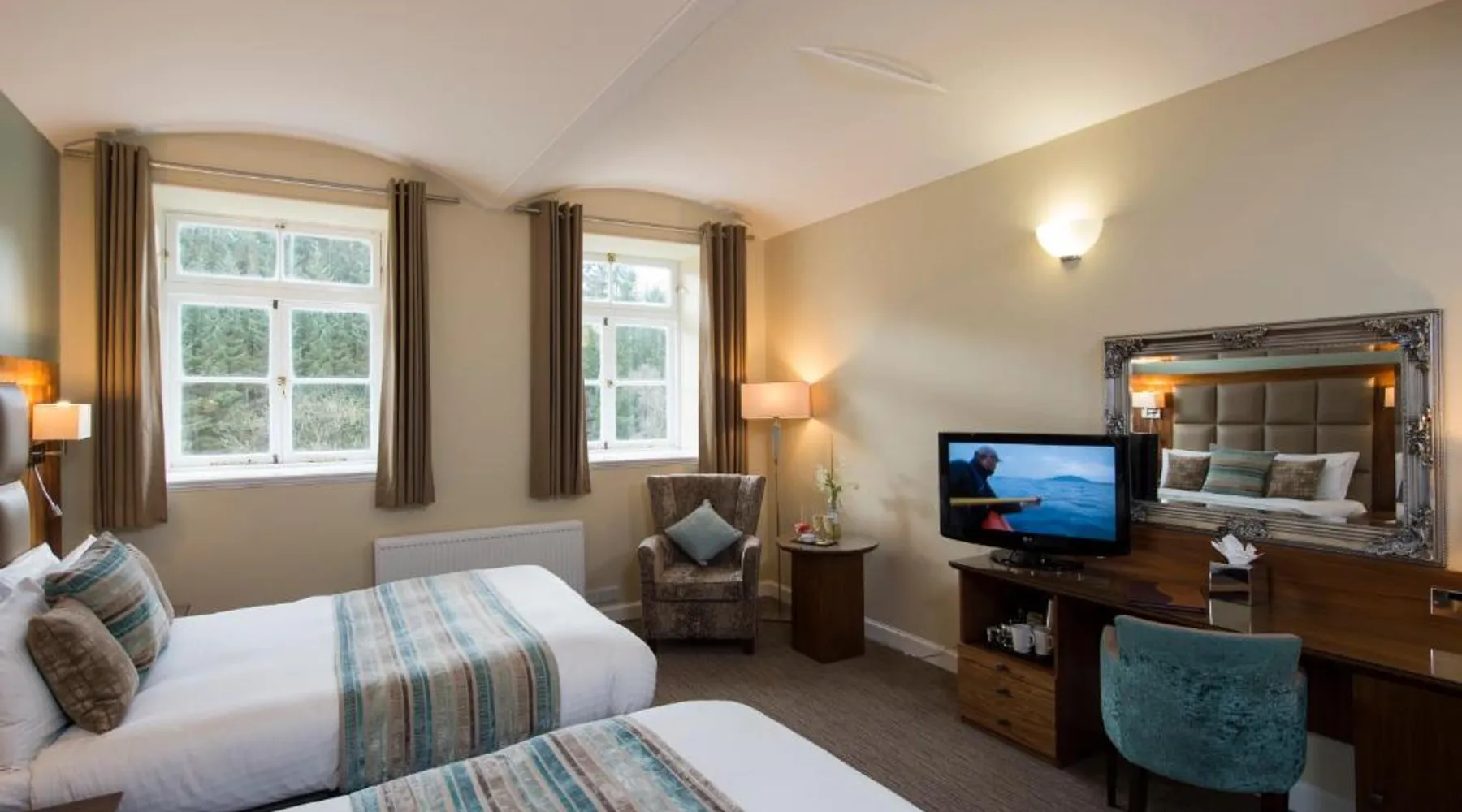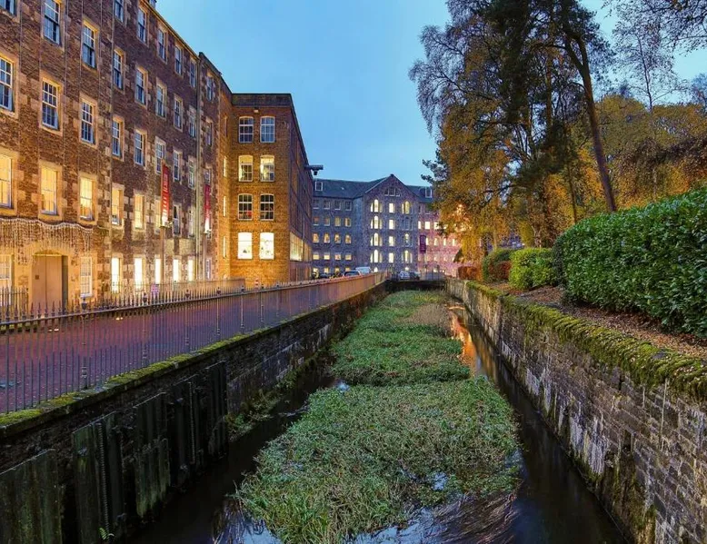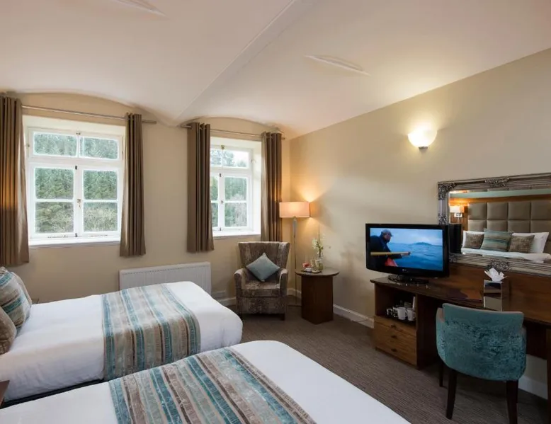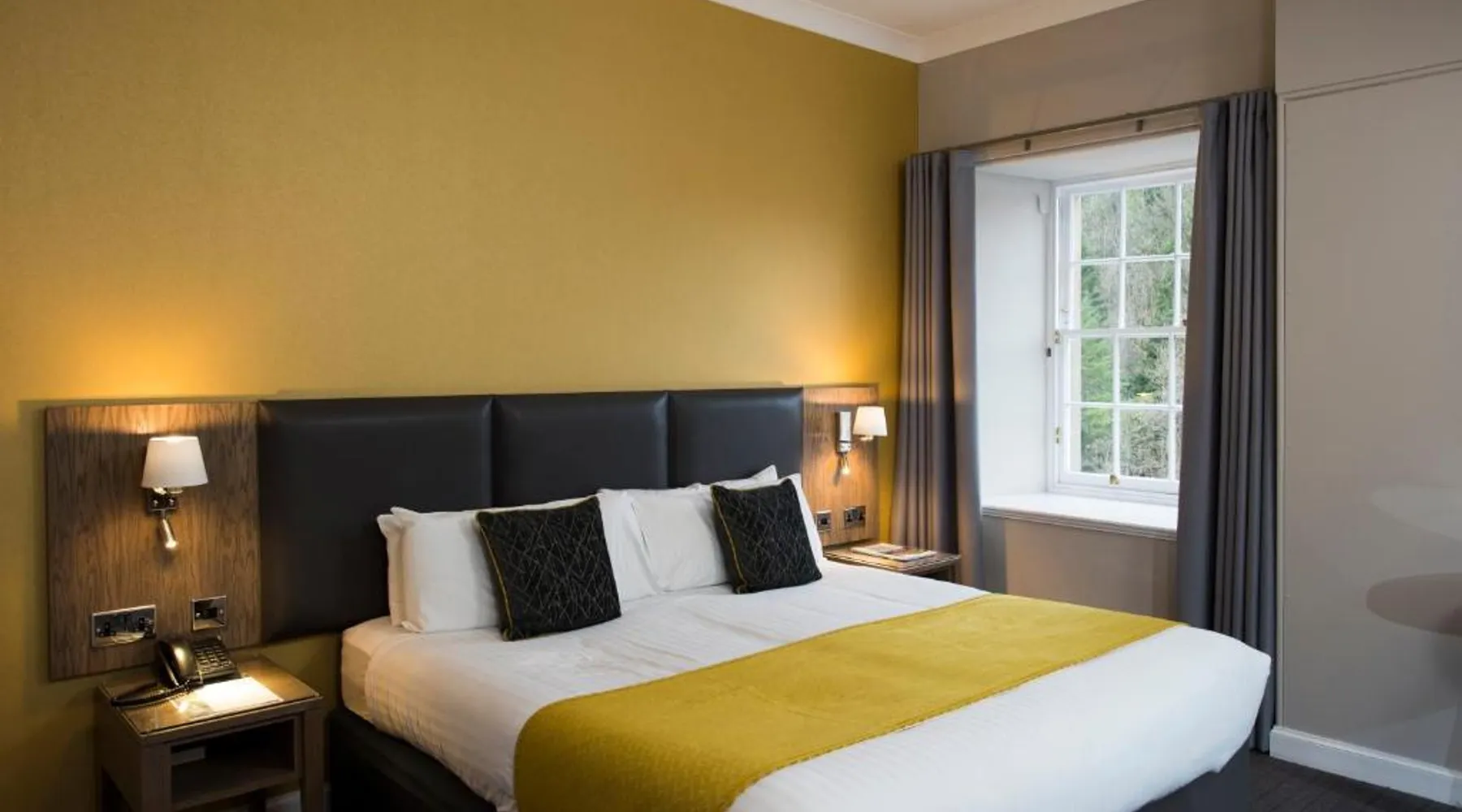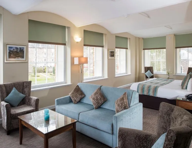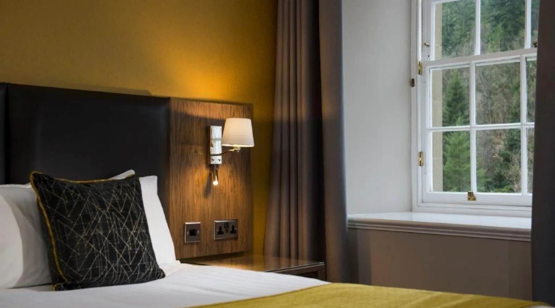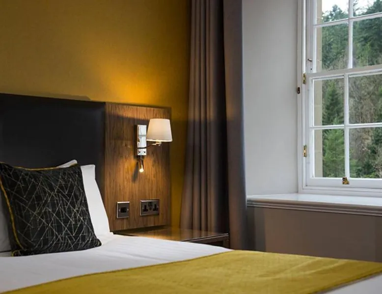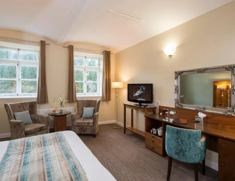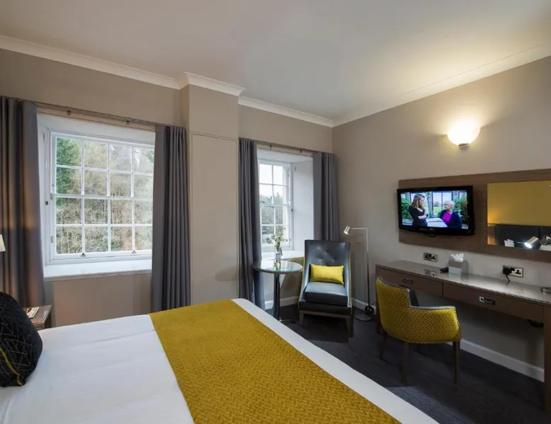 The New Lanark Mill Hotel is part of UNESCO World Heritage Site. The hotel has spacious rooms with attached bathroom, a restaurant, bar and swimming pool. New Lanark is a small 18th century village, designed as a model industrial center. Today, the mill buildings, school and workers’ homes have been converted into shops, museums and the New Lanark Mill Hotel. The rooms and the rooftop garden both offer stunning views of the river and the surrounding Conservation Area. The restaurant overlooks the River Clyde and offers traditional Scottish dishes from a cooked breakfast to afternoon tea. As well as the 52 foot swimming pool, there is a modern gym, sauna and steam room. The hotel has received awards for its environmental policies and disabled access. The village is an hour’s drive from Glasgow or Edinburgh and the Mill Hotel is just 1.4 miles from Lanark Railway Station. This bright room comes with an en suite, TV and desk.