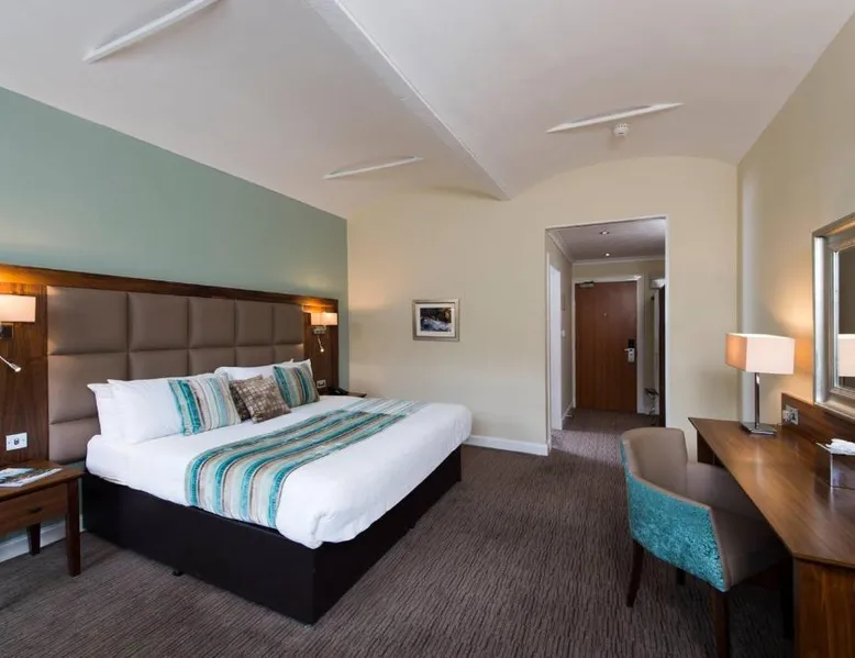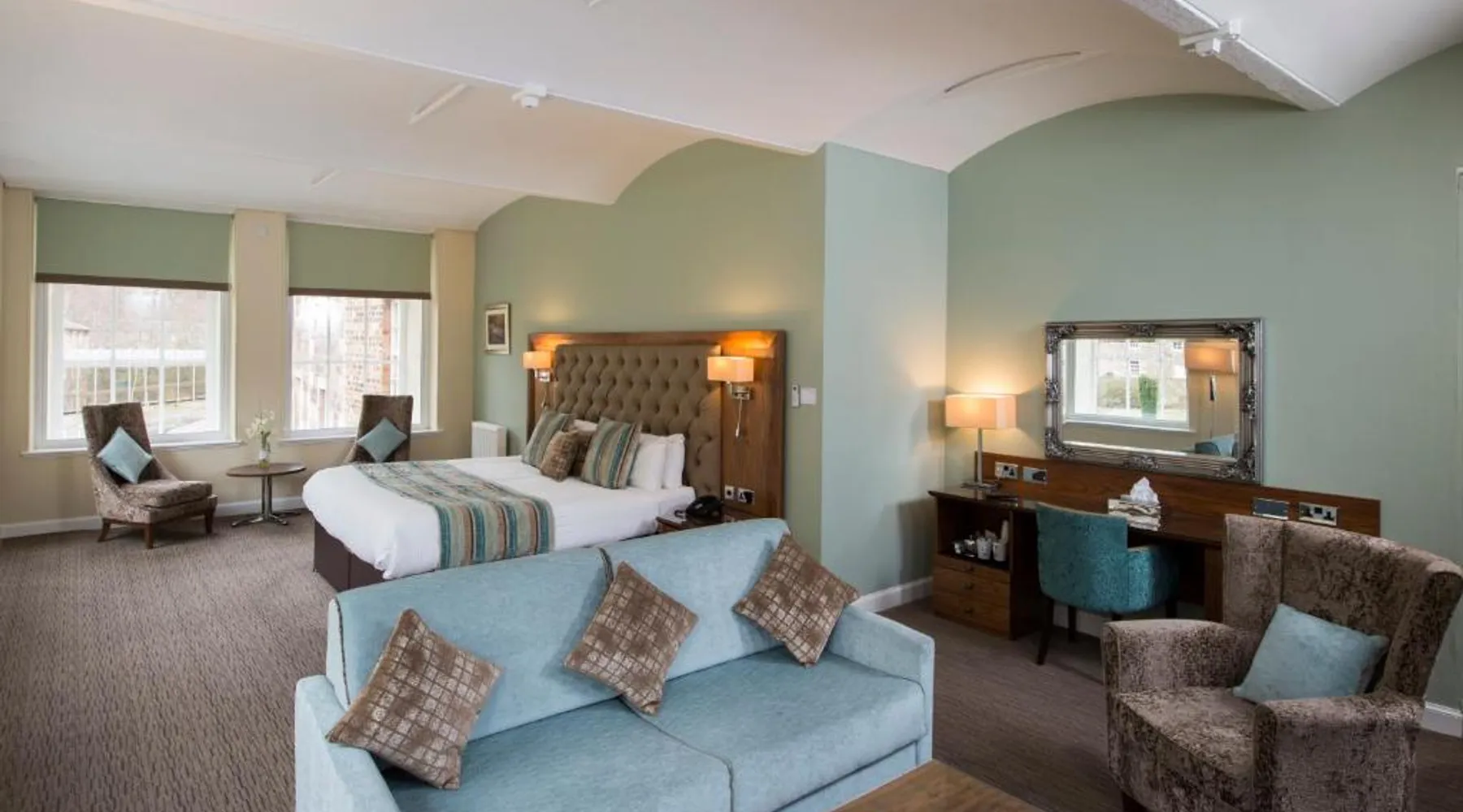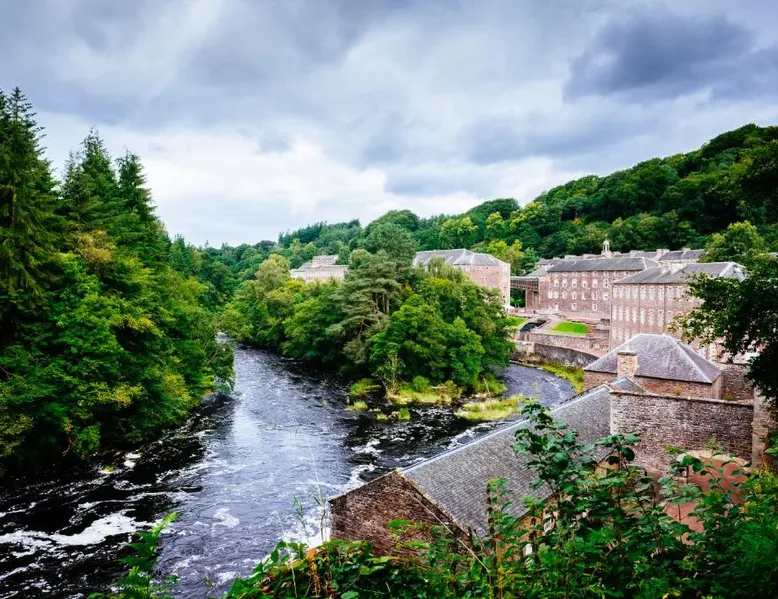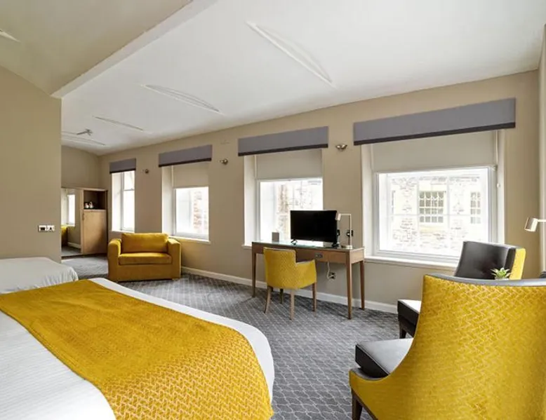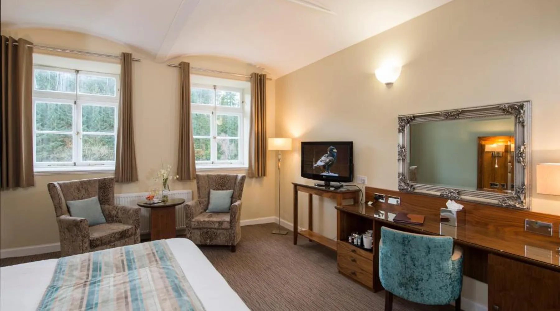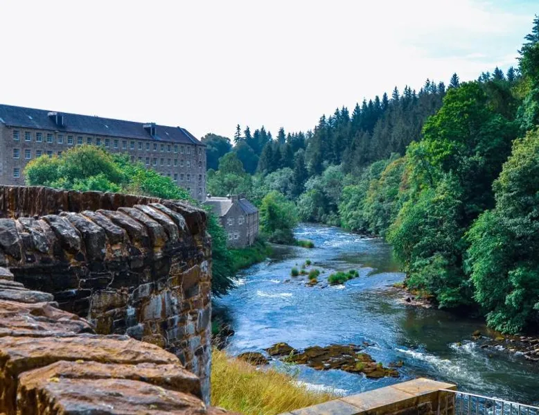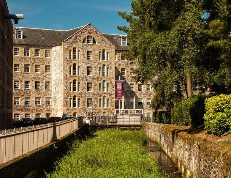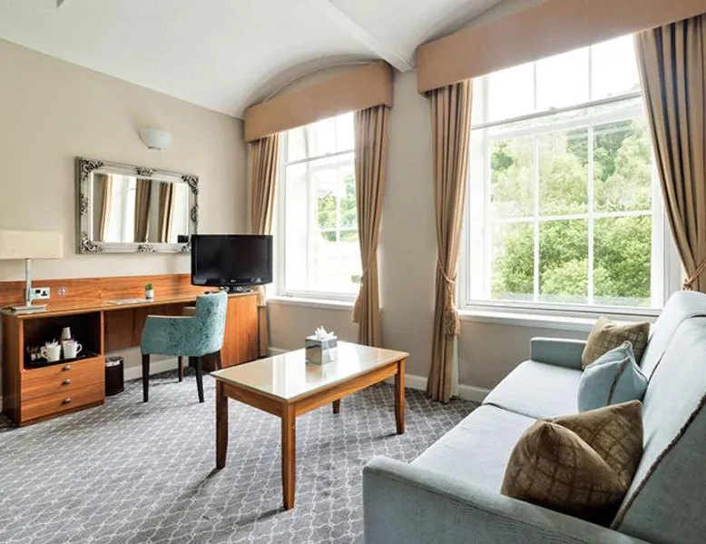 The New Lanark Mill Hotel is part of UNESCO World Heritage Site. The hotel has spacious rooms with attached bathroom, a restaurant, bar and swimming pool. New Lanark is a small 18th century village, designed as a model industrial center. Today, the mill buildings, school and workers’ homes have been converted into shops, museums and the New Lanark Mill Hotel. The rooms and the rooftop garden both offer stunning views of the river and the surrounding Conservation Area. The restaurant overlooks the River Clyde and offers traditional Scottish dishes from a cooked breakfast to afternoon tea. As well as the 52 foot swimming pool, there is a modern gym, sauna and steam room. The hotel has received awards for its environmental policies and disabled access. The village is an hour’s drive from Glasgow or Edinburgh and the Mill Hotel is just 1.4 miles from Lanark Railway Station. This bright room comes with an en suite, TV and desk.