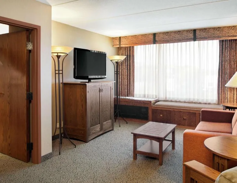 Comfortable Accommodations: DoubleTree by Hilton Libertyville-Mundelein in Mundelein offers family rooms with air-conditioning, free WiFi, and modern amenities. Each room includes a work desk, refrigerator, and TV. Exceptional Facilities: Guests can enjoy a fitness center, sun terrace, indoor swimming pool, and hot tub. Additional facilities include a restaurant, bar, and outdoor play area. Dining Experience: The family-friendly restaurant serves American cuisine with vegetarian, vegan, and gluten-free options. Breakfast is available in-room or via room service. Convenient Location: Located 22 mi from Chicago O'Hare International Airport, the hotel is near Six Flags Great America (12 mi) and Loyola University Chicago (28 mi). An ice-skating rink is in the surroundings. This quadruple room is air-conditioned and features a flat-screen TV, a tea and coffee maker and a safe deposit box. The unit offers 2 beds.