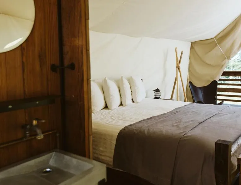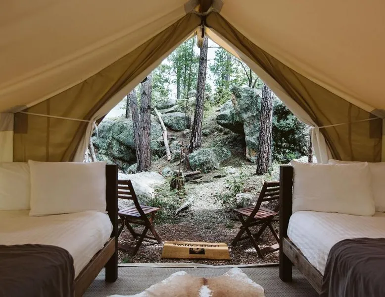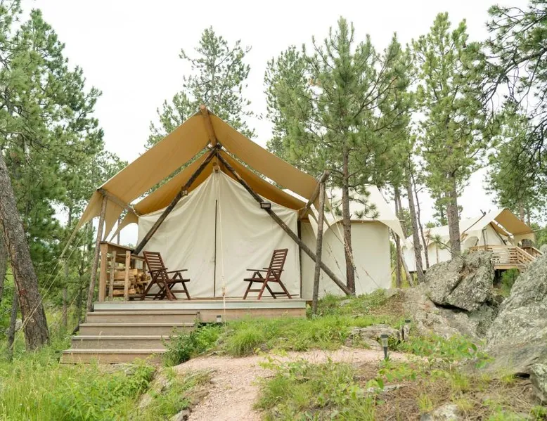 Comfortable Accommodations: Under Canvas Mount Rushmore in Keystone offers 3-star luxury tents with private bathrooms, balconies, and parquet floors. Each tent includes free toiletries, a fireplace, and outdoor furniture. Dining and Amenities: The family-friendly restaurant serves American cuisine for dinner. Guests can also enjoy an outdoor fireplace, coffee shop, and picnic area. Additional facilities include a 24-hour front desk, concierge service, and live music. Activities and Location: Located 3.1 mi from Mount Rushmore and 29 mi from Rapid City Regional Airport, the property offers yoga classes, walking tours, hiking, cycling, and bicycle parking. Guests appreciate the scenic views and excellent service. The unit has 1 bed.