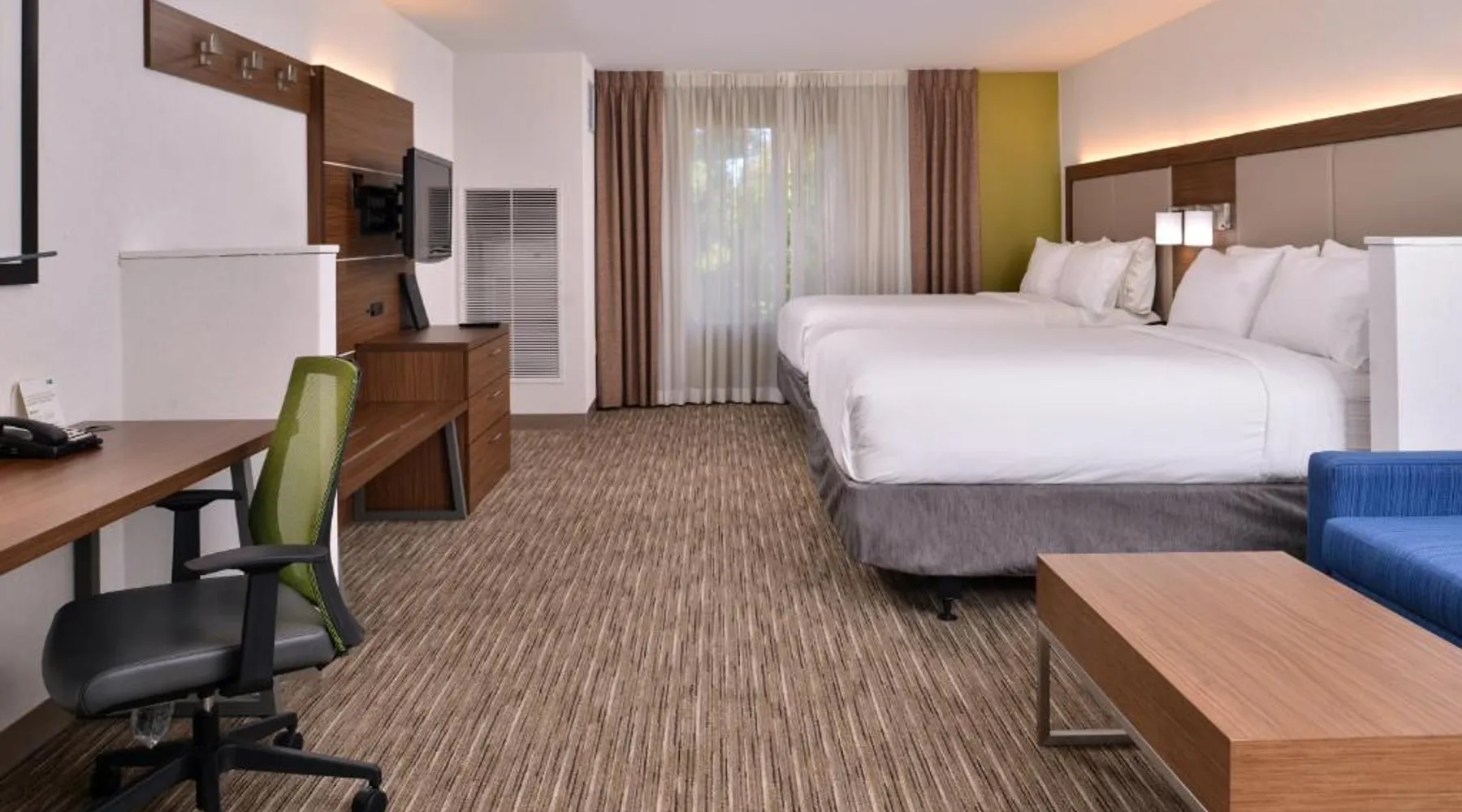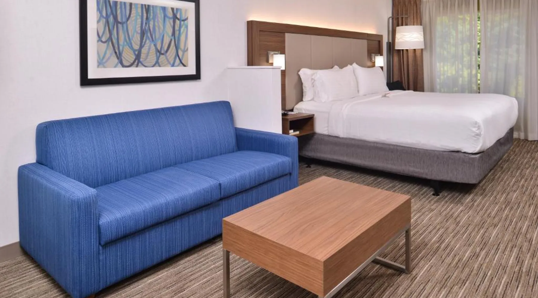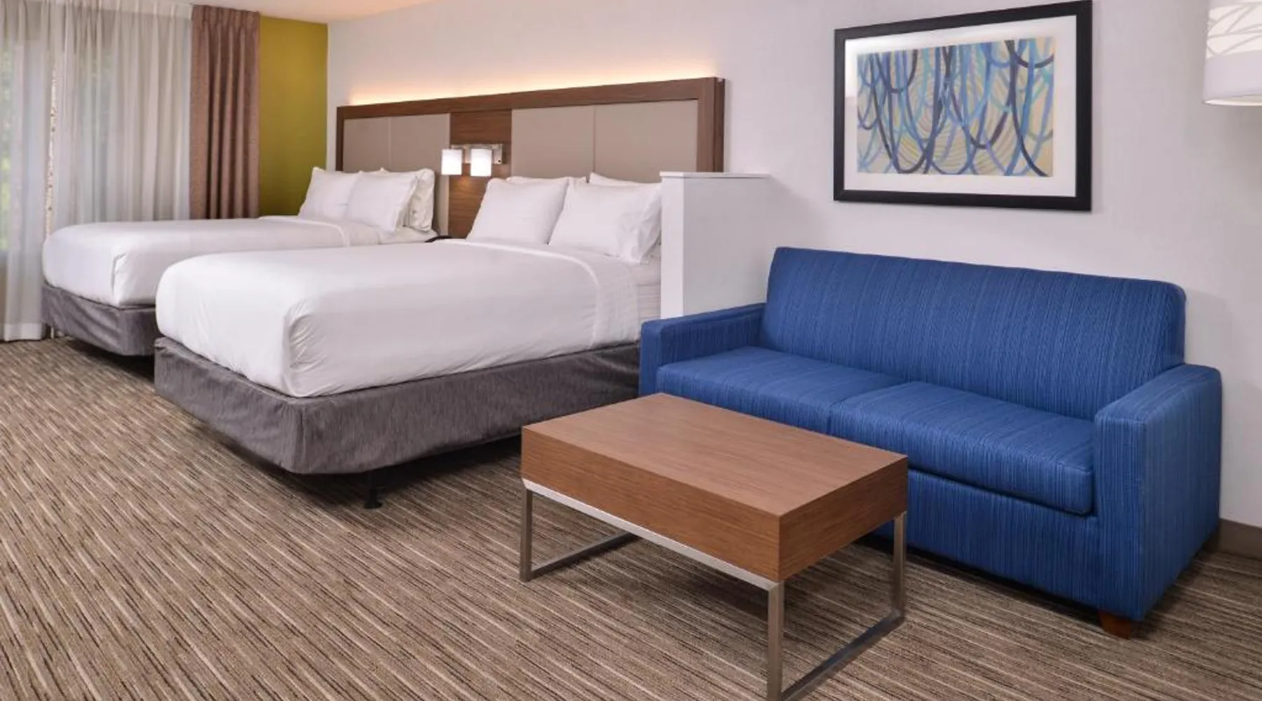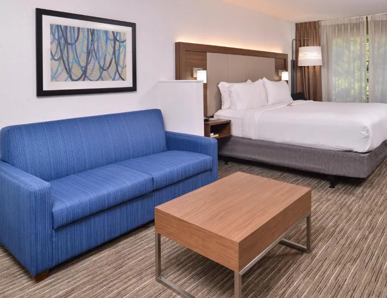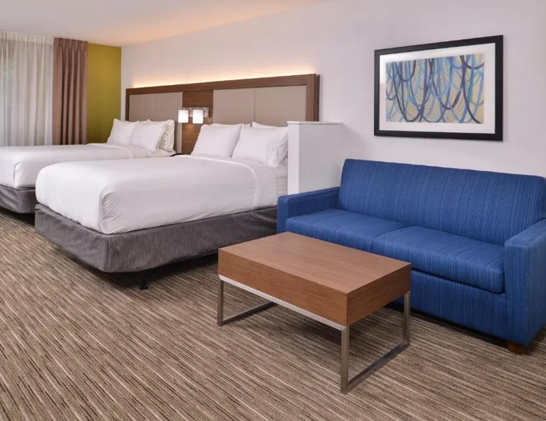 Comfortable Accommodations: Holiday Inn Express & Suites Lacey - Olympia by IHG in Lacey offers air-conditioned rooms with private bathrooms, free WiFi, and modern amenities. Each room includes a work desk, refrigerator, and TV. Leisure Facilities: Guests can enjoy a fitness center, indoor swimming pool, and a 24-hour front desk. Additional facilities include a business area and free on-site parking. Dining Options: A continental, American, and buffet breakfast is served daily, featuring warm dishes, fresh pastries, pancakes, fruits, and juice. Location and Attractions: Located 45 mi from Seattle–Tacoma International Airport, the hotel is near attractions such as the Hands on Children's Museum (5 mi) and the Museum of Glass (26 mi). Guests appreciate the attentive staff and excellent room cleanliness. Featuring a spacious living room, this suite is styled in cream and white linens. This contemporary air-conditioned room provides free Wi-Fi and cable TV.