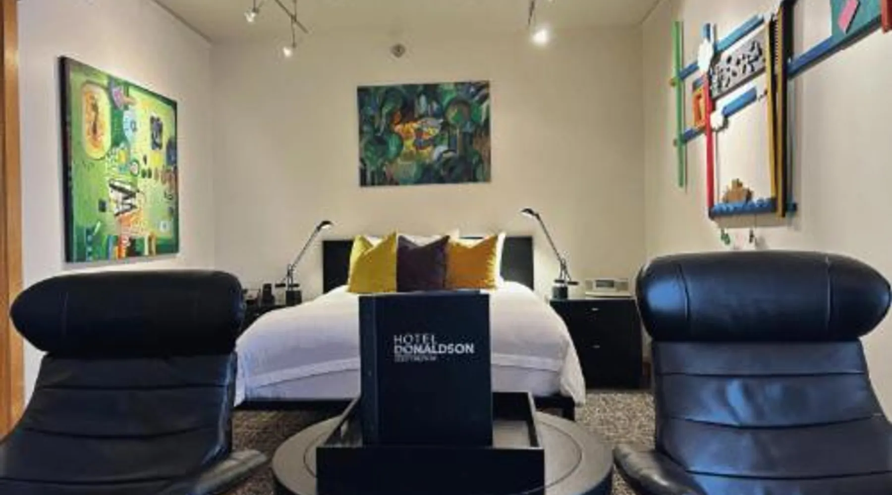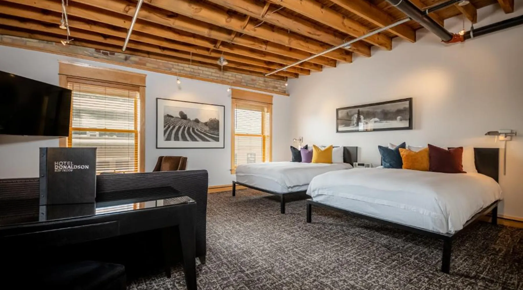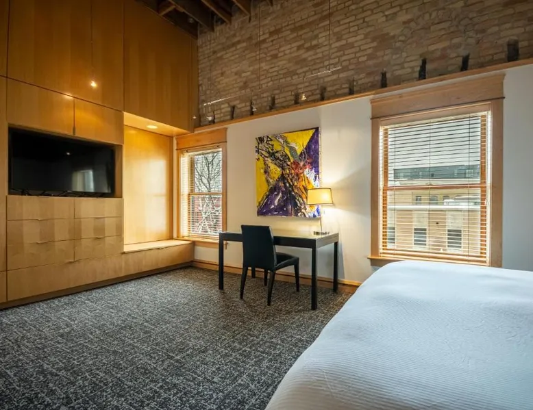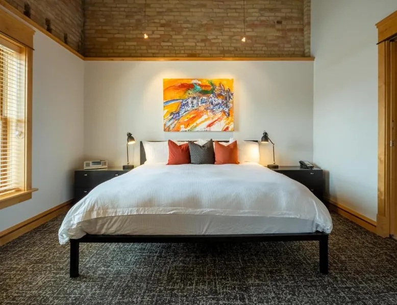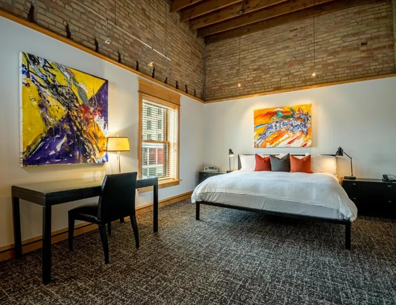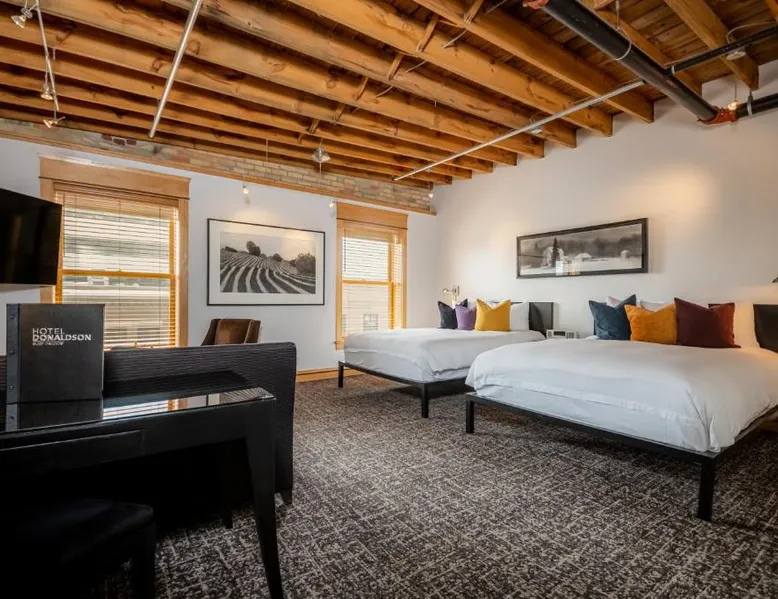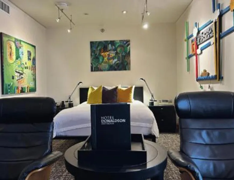 Historic Setting: Hotel Donaldson in Fargo is housed in a historic building, offering a unique and charming atmosphere. Comfortable Accommodations: Rooms feature air-conditioning, private bathrooms, city views, and modern amenities such as free WiFi and streaming services. Dining and Leisure: The modern, romantic restaurant serves American cuisine with vegetarian, vegan, and gluten-free options. Guests can also enjoy a fitness center, sun terrace, bar, and outdoor fireplace. Convenient Location: Located 2.5 mi from Hector International Airport and a 3-minute walk from Fargo Civic Center, the hotel is near attractions like FargoDome and Red River Zoo. An ice-skating rink is also in the vicinity. Offering free WiFi, this room features local artwork, a stereo system and a docking station for electronics. Please note that bedding configuration cannot be guaranteed and will be allocated upon check-in.