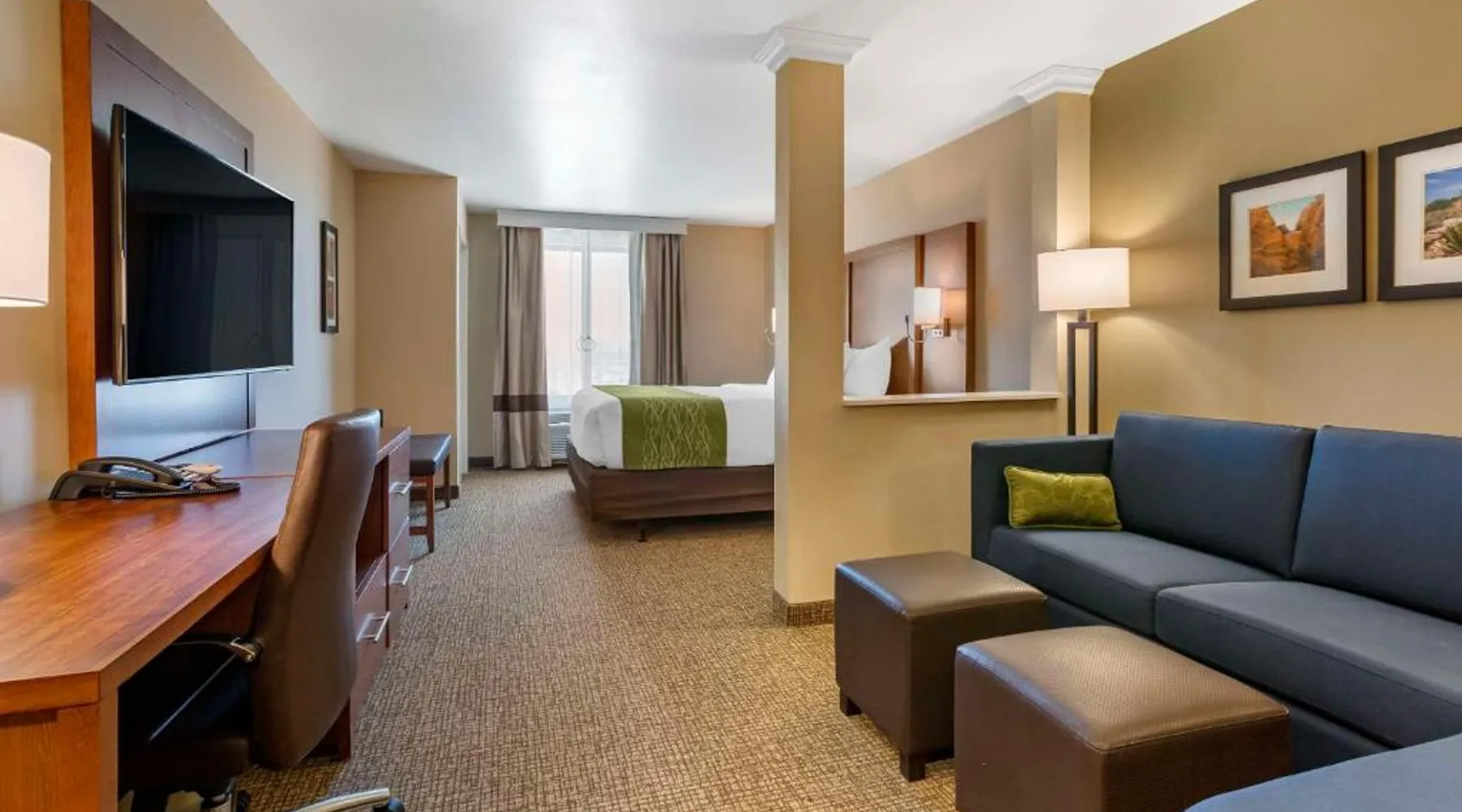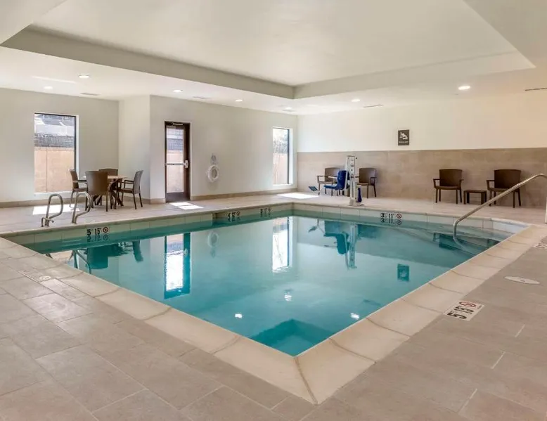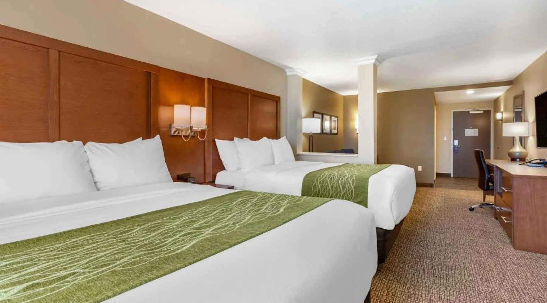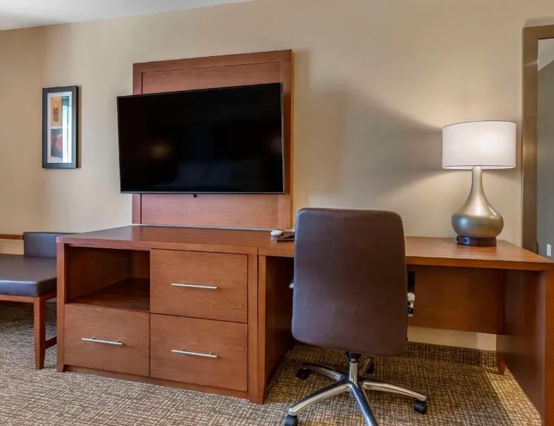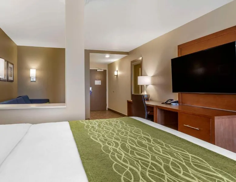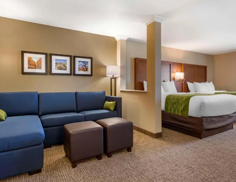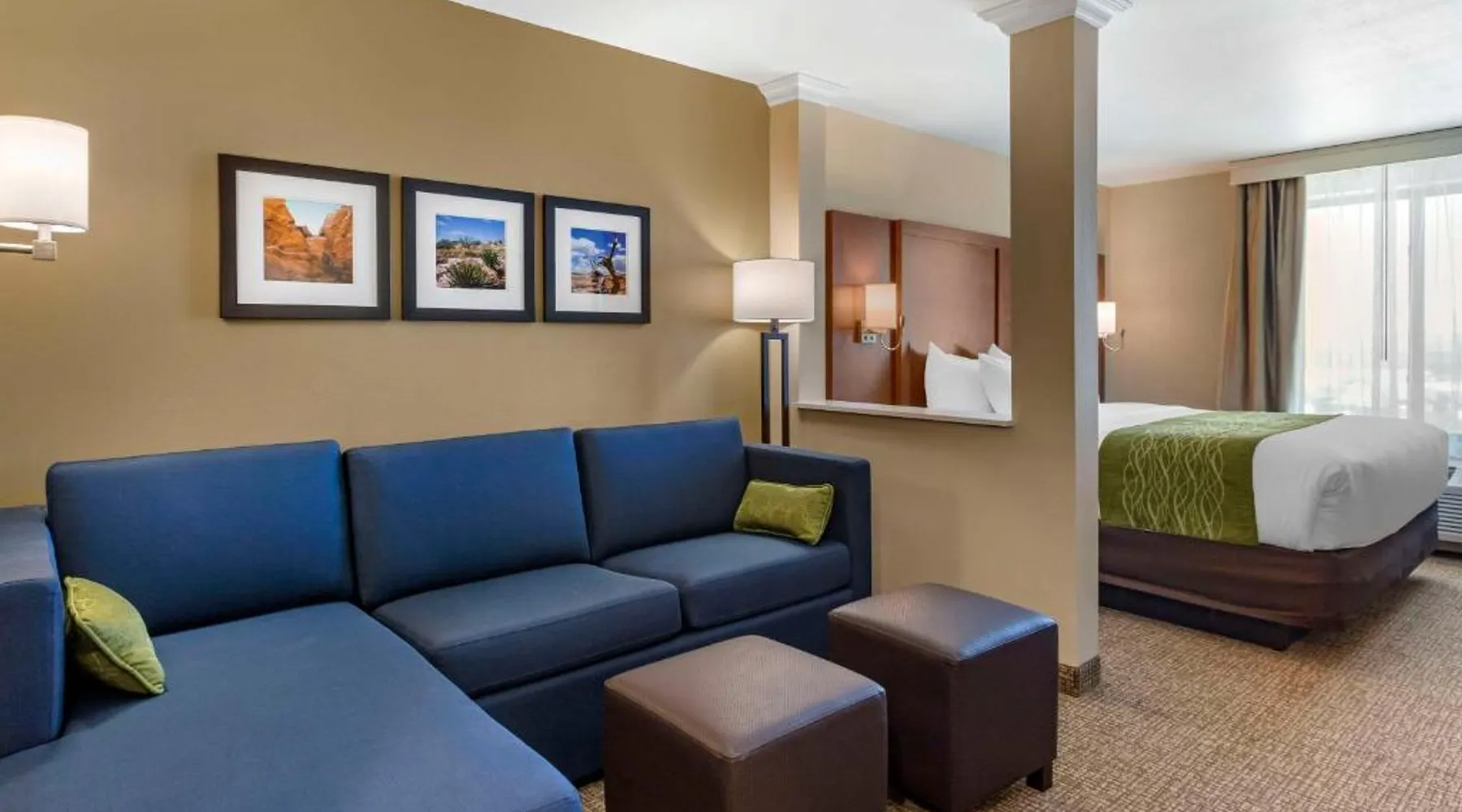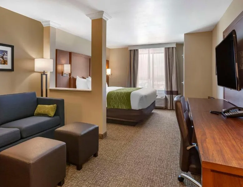 Comfortable Accommodations: Comfort Suites Albuquerque Airport in Albuquerque offers rooms with free WiFi, air-conditioning, and private bathrooms. Guests enjoy amenities such as a fitness center, hot tub, and 24-hour front desk. Convenient Facilities: The hotel features a kitchen, work desk, and seating area. Additional amenities include a tea and coffee maker, hairdryer, refrigerator, microwave, and TV. Prime Location: Located 0.6 mi from Albuquerque International Sunport, the property is near attractions like University Stadium (2.5 mi), National Hispanic Cultural Center (3.1 mi), and ABQ BioPark - Zoo (4.3 mi). Guest Satisfaction: Highly rated for its attentive staff, clean rooms, and comfortable accommodations. The family room offers a tea and coffee maker. The unit has 3 beds.