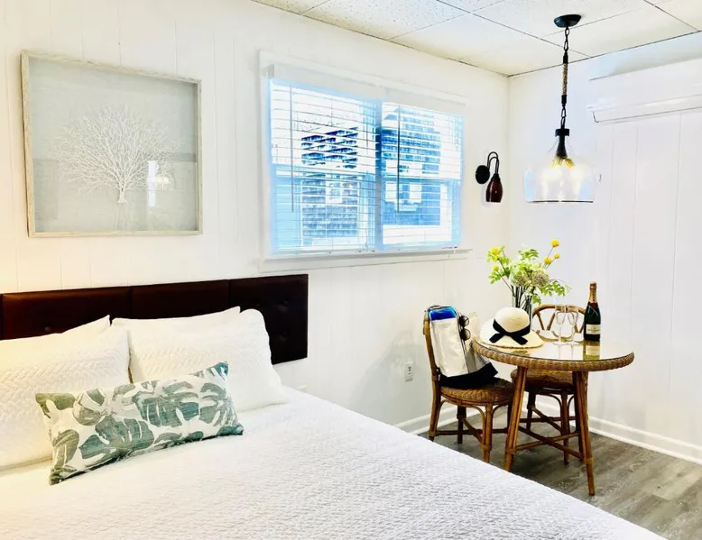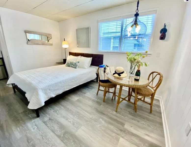 Historic Setting: Windward at the Beach in Beach Haven offers a 3-star inn experience within a historic building. The property features family rooms and a concierge service, ensuring a comfortable stay for all guests. Comfortable Accommodations: Rooms include air-conditioning, private bathrooms with free toiletries, hairdryers, refrigerators, seating areas, and TVs. Additional amenities include kitchenettes with ovens, stovetops, toasters, and dining areas. Convenient Location: Located 39 mi from Atlantic City International Airport, the inn is a 16-minute walk from Beach Haven Dog-Friendly Beach. Boating is available in the surrounding area. Highly rated for beach access, room cleanliness, and convenient location. Located on the 3rd floor, up a steep staircase, this room features a queen bed and a twin day bed with trundle. There are views of the park, a peek of the ocean and sunsets over the bay. There is a flat-screen TV, mini-fridge and a bathroom with a shower.