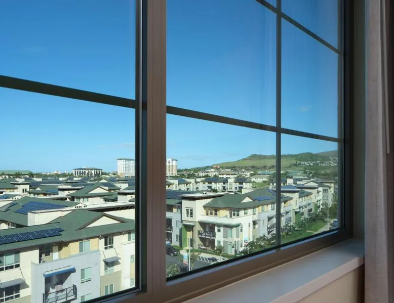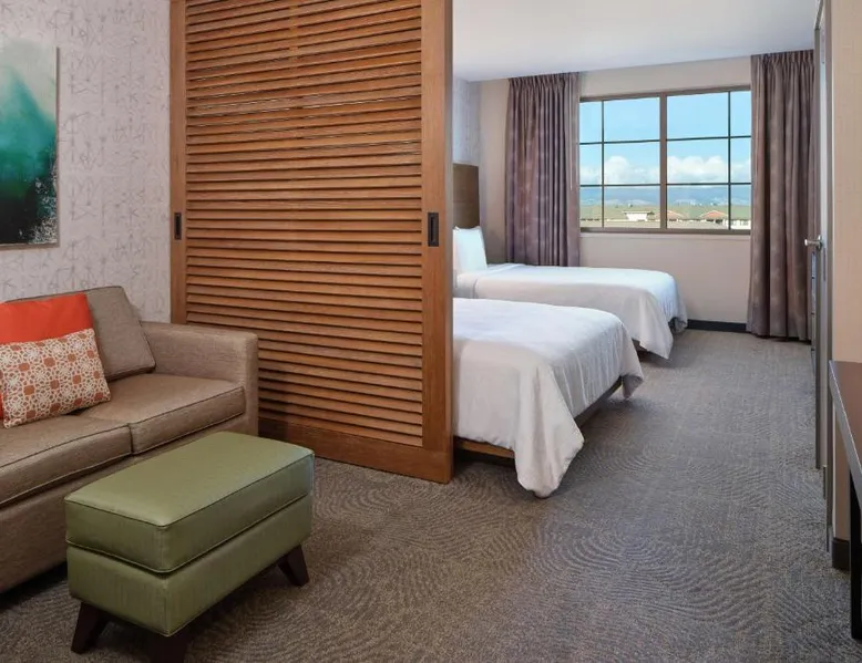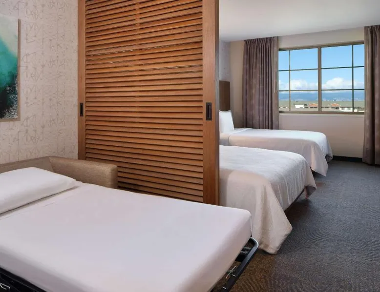 Comfortable Accommodations: Embassy Suites By Hilton Oahu Kapolei in Kapolei offers family rooms with balconies, private bathrooms, and modern amenities. Each room includes air-conditioning, a work desk, and free WiFi. Dining and Leisure: Guests can enjoy a swimming pool with a view, fitness center, restaurant, and bar. The family-friendly restaurant serves American, Japanese, and local cuisines, offering lunch, dinner, and cocktails. Breakfast includes local specialties, fresh pastries, and a hot tub. Convenient Location: Located 17 mi from Honolulu International Airport, the hotel is near Pearl Harbor (15 mi) and Wet Wild Hawaii (1.8 mi). Guests appreciate the attentive staff, excellent service, and room cleanliness. The suite offers air conditioning, a tea and coffee maker, a seating area, a safe deposit box and a flat-screen TV with cable channels. The unit has 3 beds.