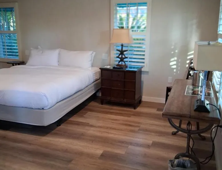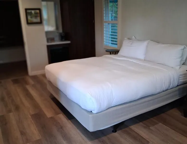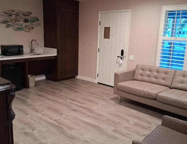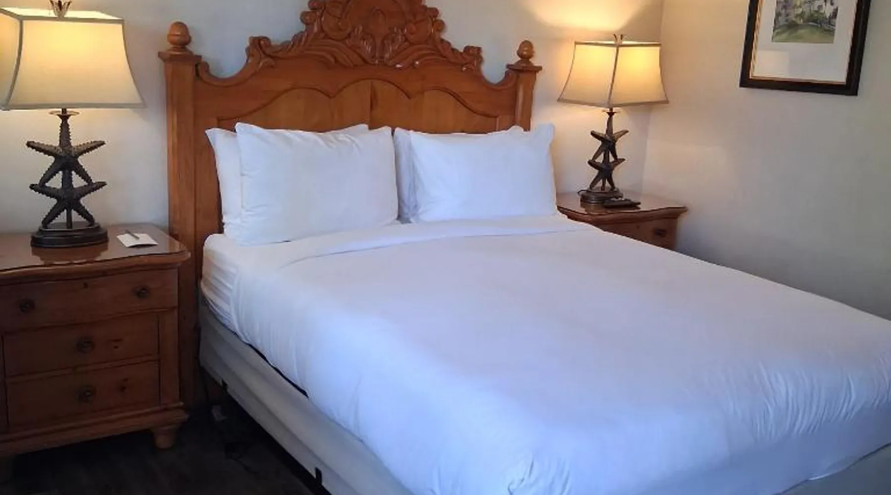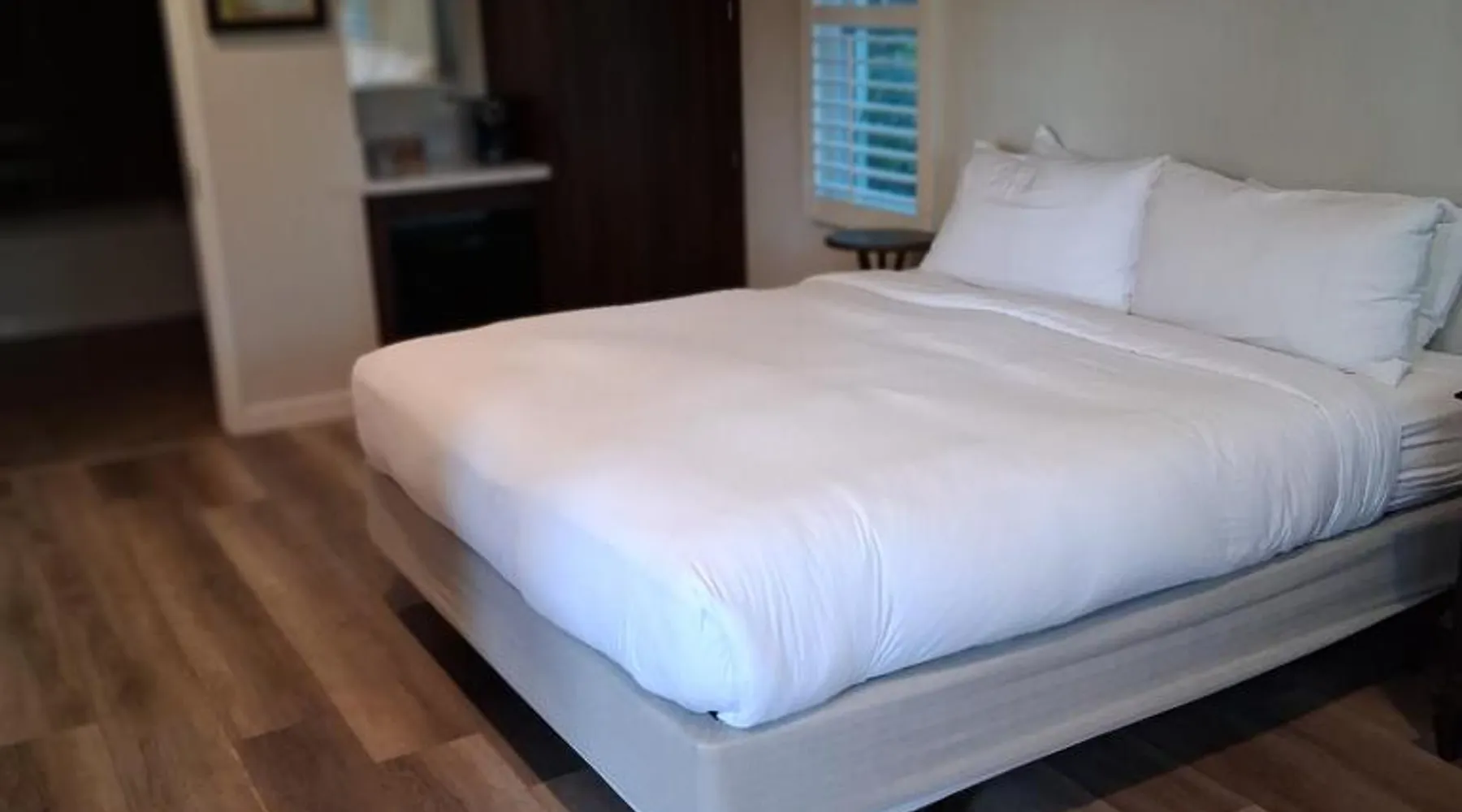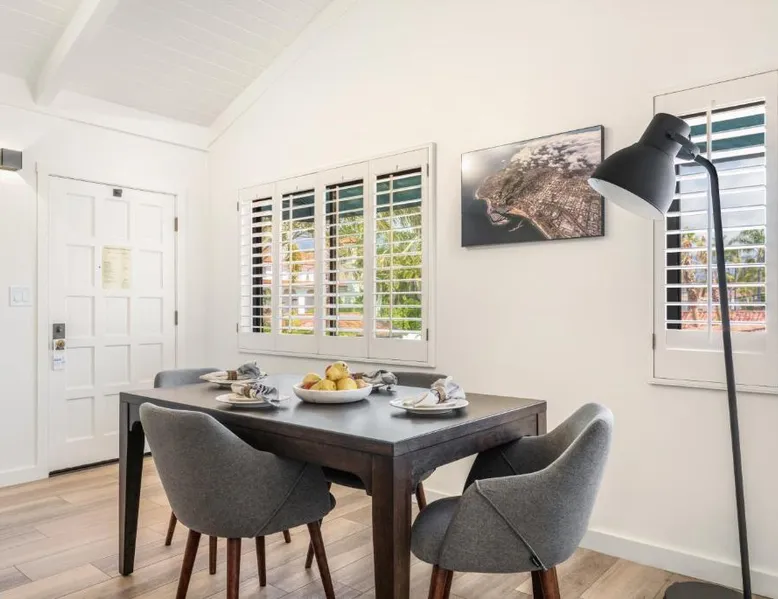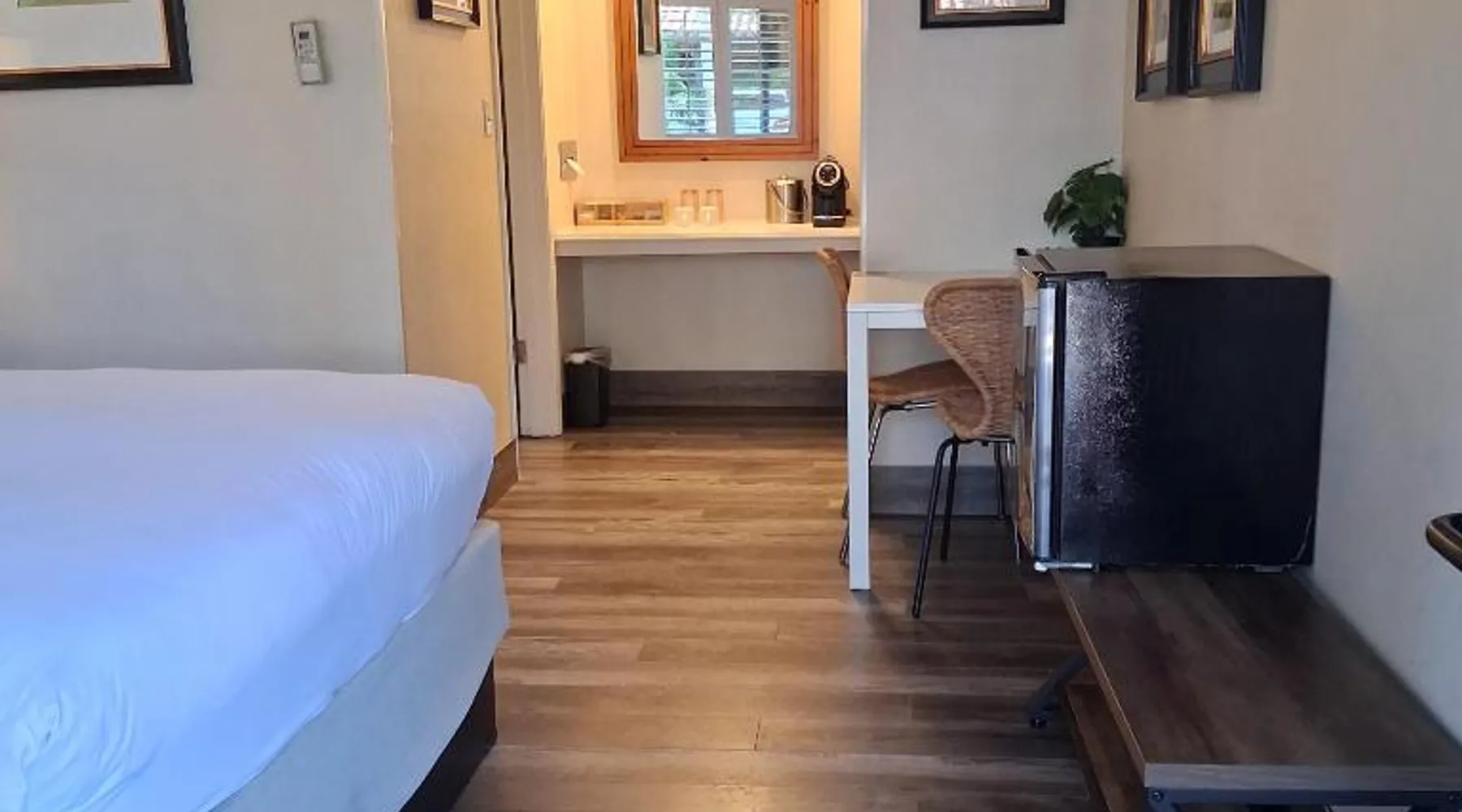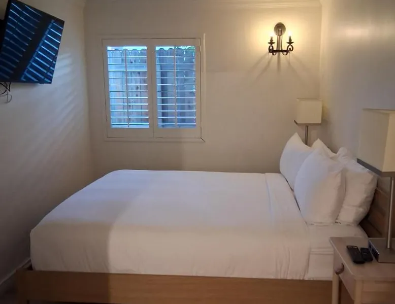 An outdoor pool with a hot tub is featured at Franciscan Inn Santa Barbara. Modern amenities like a flat-screen TV and free WiFi are provided in all rooms. Styled in subtle colored floral or off-white bedding, all rooms feature a contemporary feel and an iPod docking station at Franciscan Inn. Concierge and dry cleaning services are offered. A daily maid service is available to tend to each room daily. University of California, Santa Barbara is 12 minutes’ drive away. Los Angeles International Airport is 1.5 hours’ away Franciscan Inn. The property will be undergoing renovations on select guest rooms beginning November 3, 2022 until January 13, 2023. Located in the Edgewater wing, this popular room offers a 50" LED flat-screen TV. The relaxed yet sophisticated Santa Barbara style is reflected in the décor, which features beach-themed fabrics, serene colors and warm woods. Room includes a table for 2 guests and free WiFi.