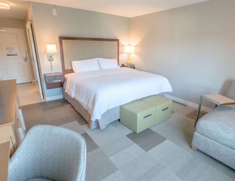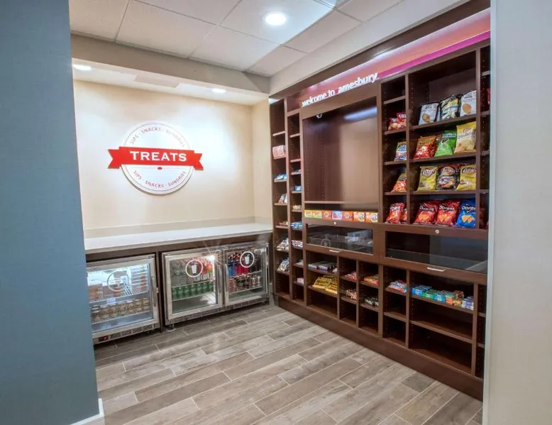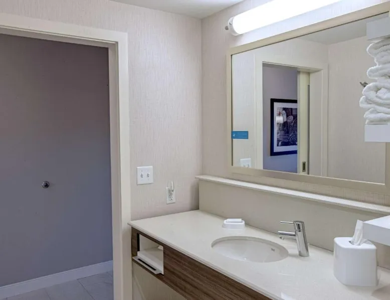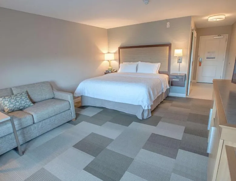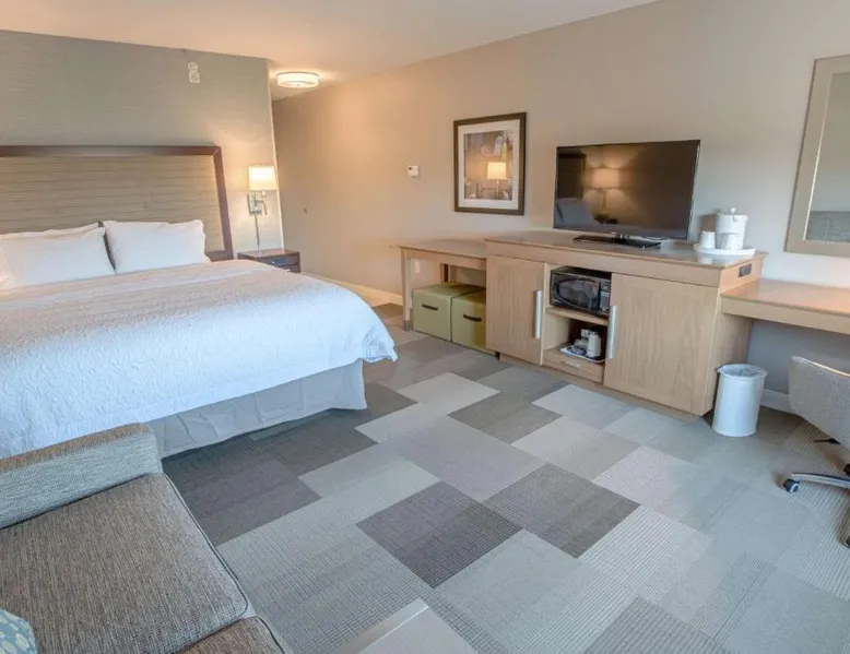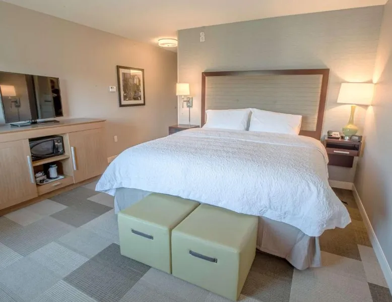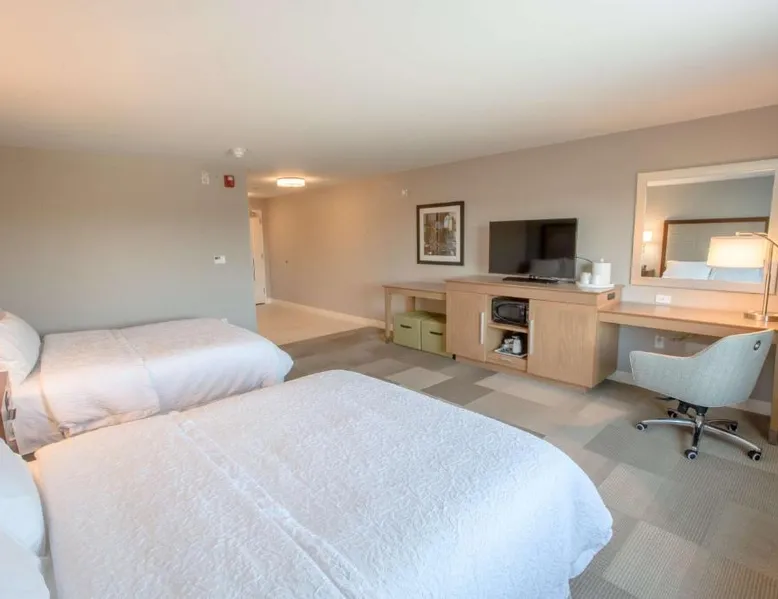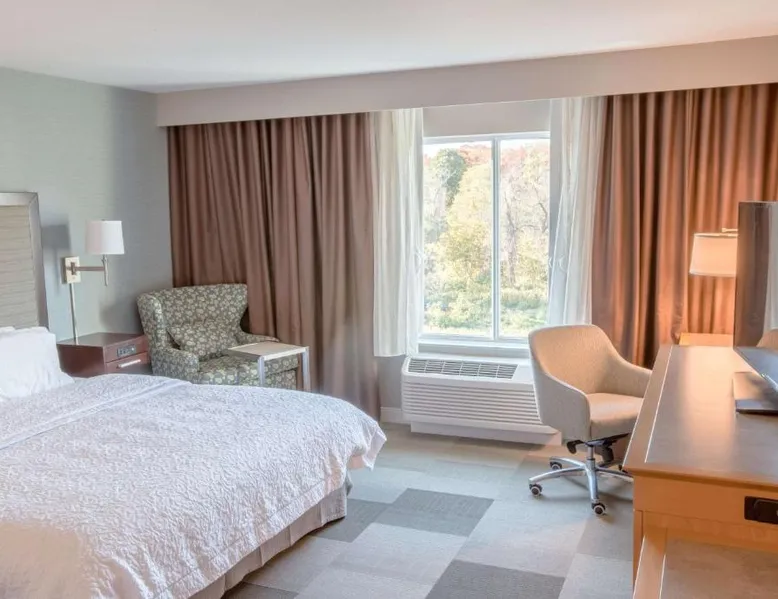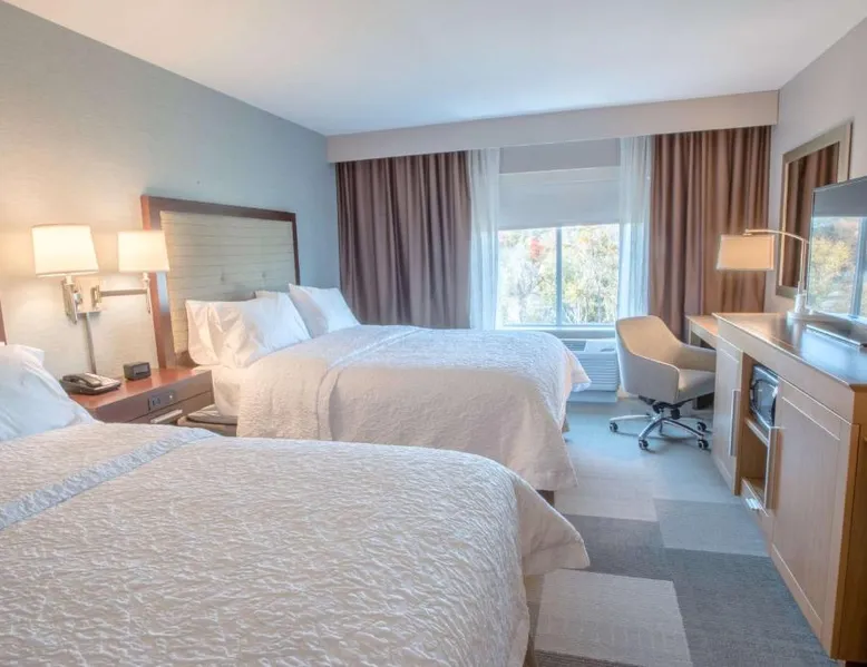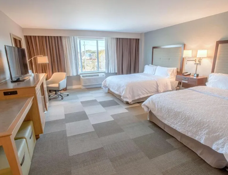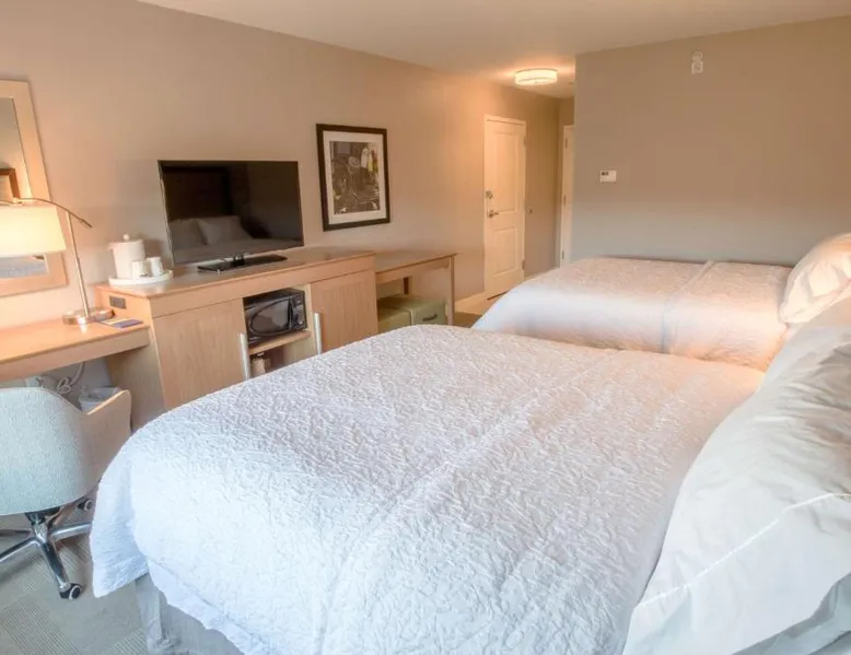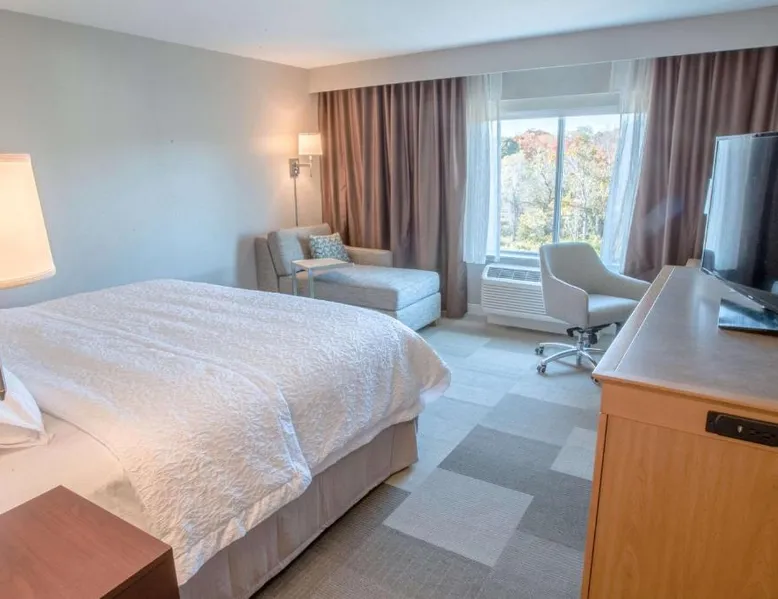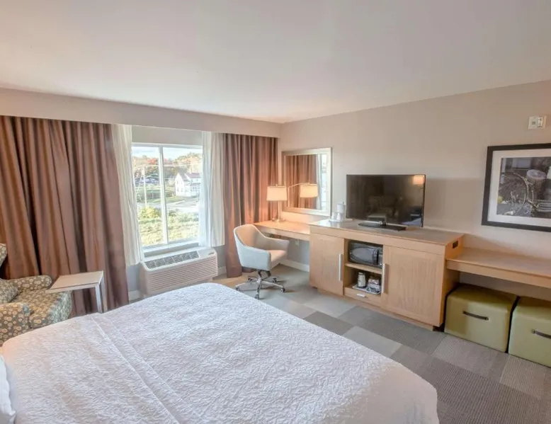 The Hampton Inn Amesbury is located in the coastal region of Massachusetts. The hotel offers complimentary Wi-Fi and hot breakfast to all guests. Each of the rooms feature a microwave, mini-fridge, study table and a flat-screen cable TV. With a heated indoor pool and fitness center, the hotel also has a 24-hour front desk, business center, suite shop and a meeting space for up to 45 guests. Portsmouth is 17 mi from Hampton Inn by Hilton Amesbury, MA, while Salem is 23 mi away. The nearest airport is Logan Airport, 34 mi from the Amesbury hotel. This double room provides a tea and coffee maker and a flat-screen TV. The unit offers 1 bed.