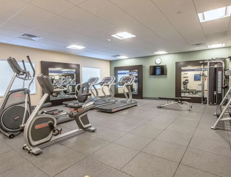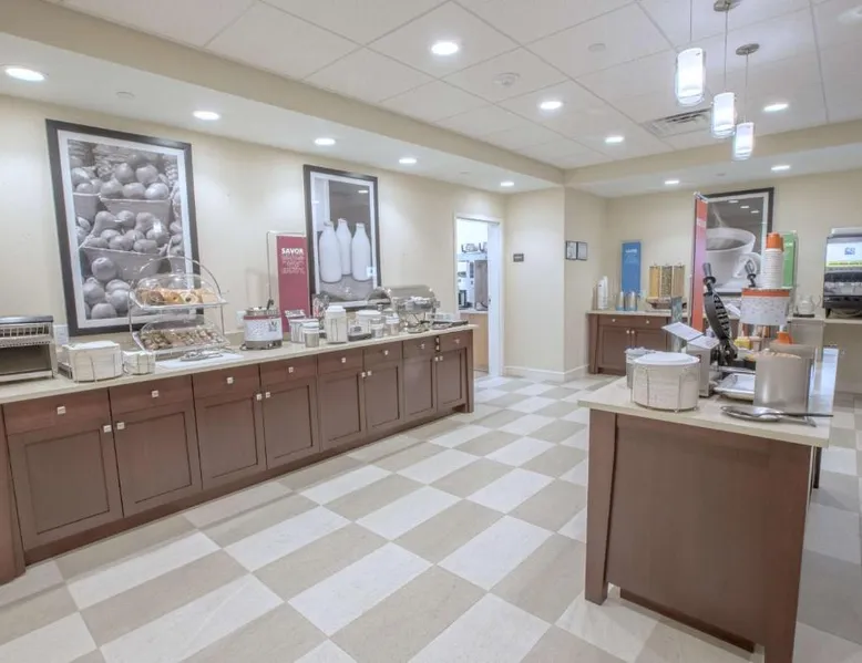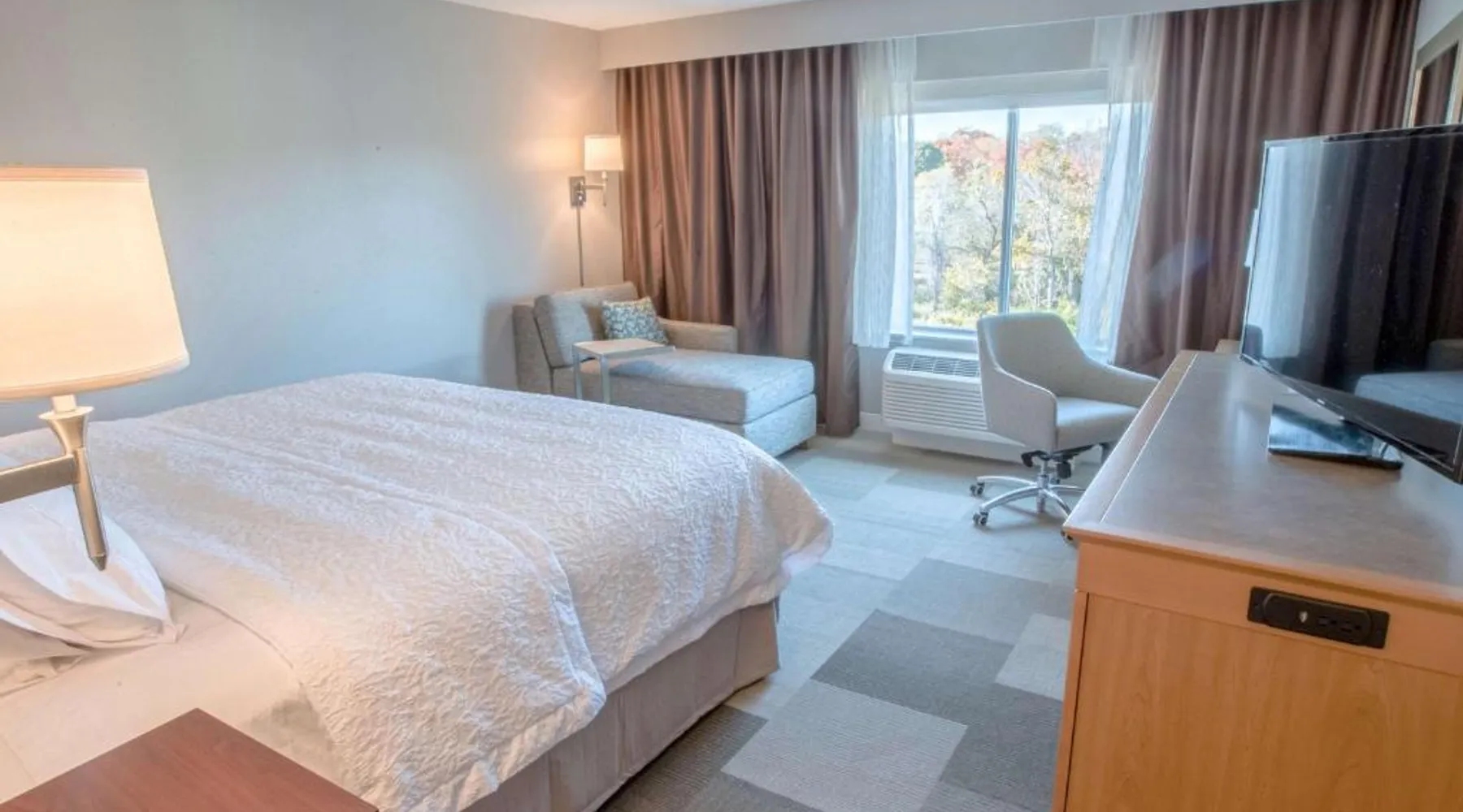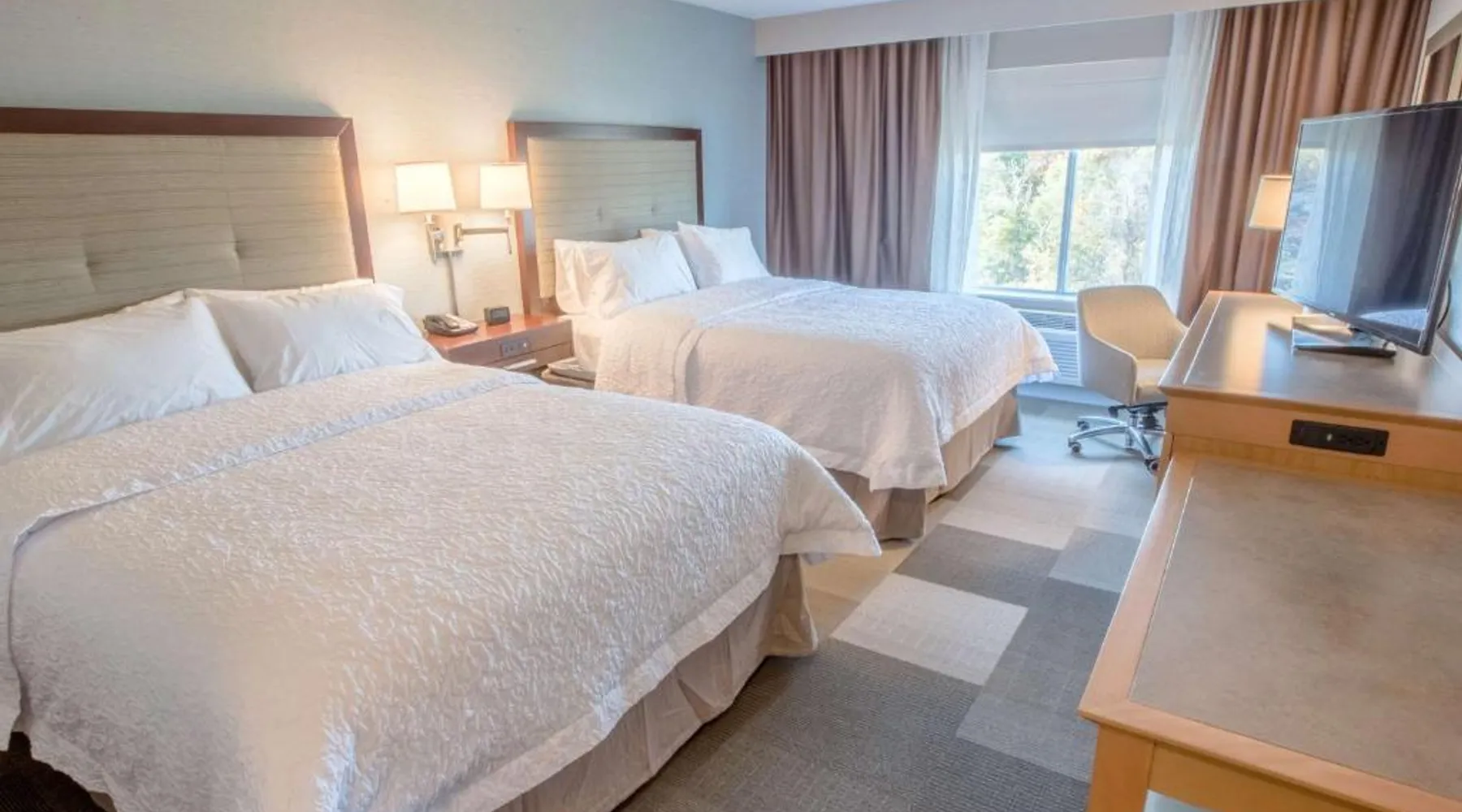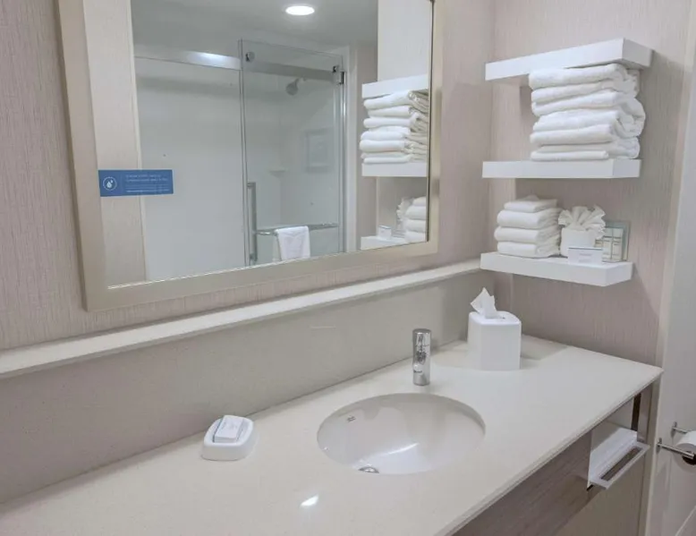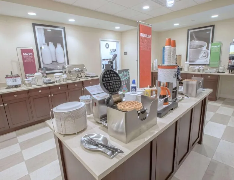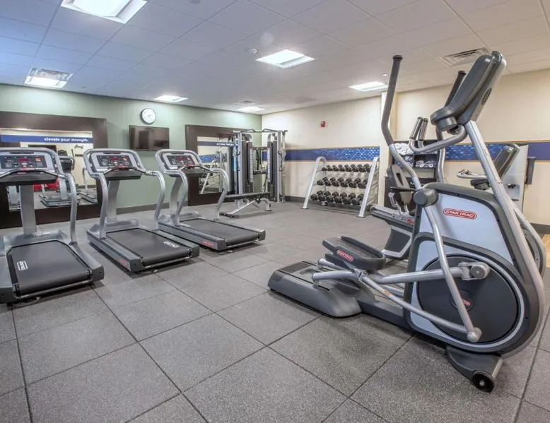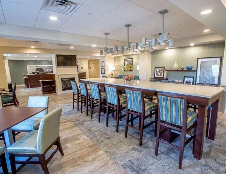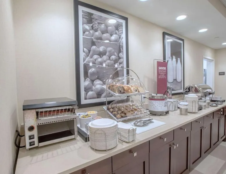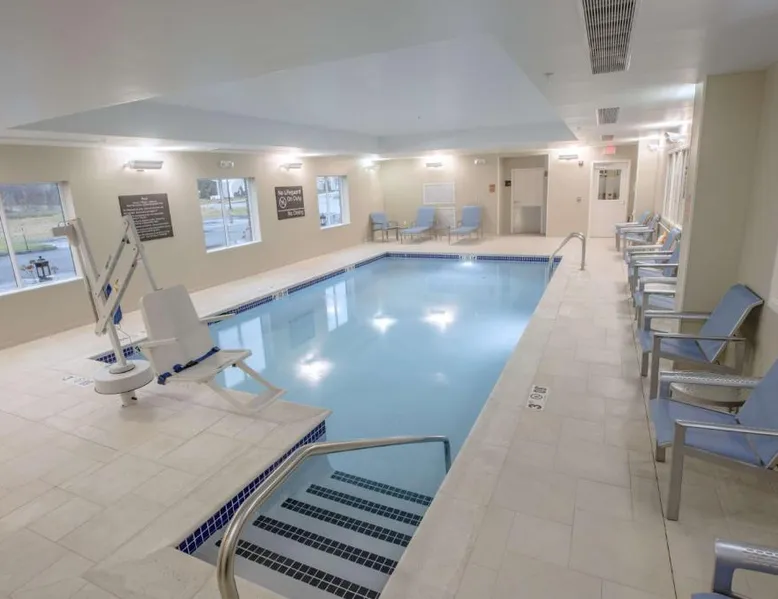The Hampton Inn Amesbury is located in the coastal region of Massachusetts. The hotel offers complimentary Wi-Fi and hot breakfast to all guests. Each of the rooms feature a microwave, mini-fridge, study table and a flat-screen cable TV. With a heated indoor pool and fitness center, the hotel also has a 24-hour front desk, business center, suite shop and a meeting space for up to 45 guests. Portsmouth is 17 mi from Hampton Inn by Hilton Amesbury, MA, while Salem is 23 mi away. The nearest airport is Logan Airport, 34 mi from the Amesbury hotel. This double room provides a tea and coffee maker and a flat-screen TV. The unit offers 1 bed.