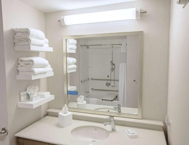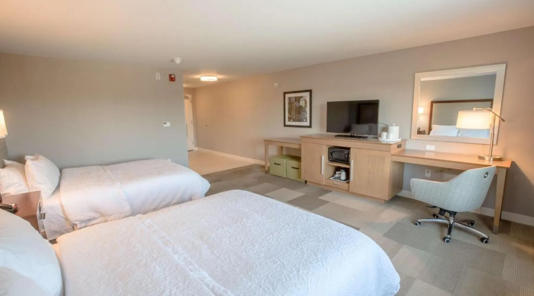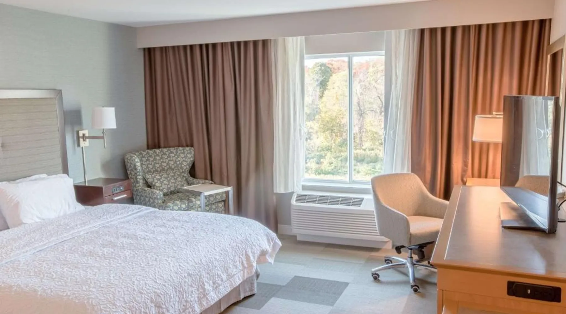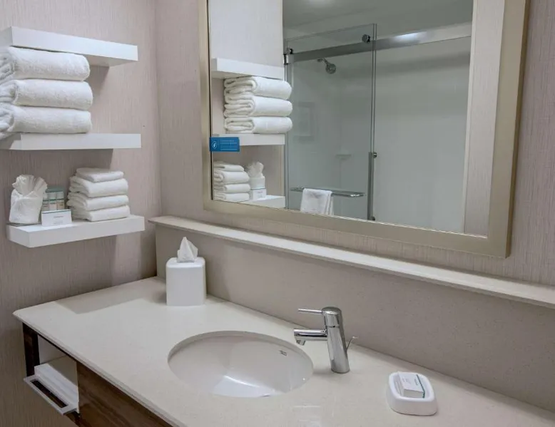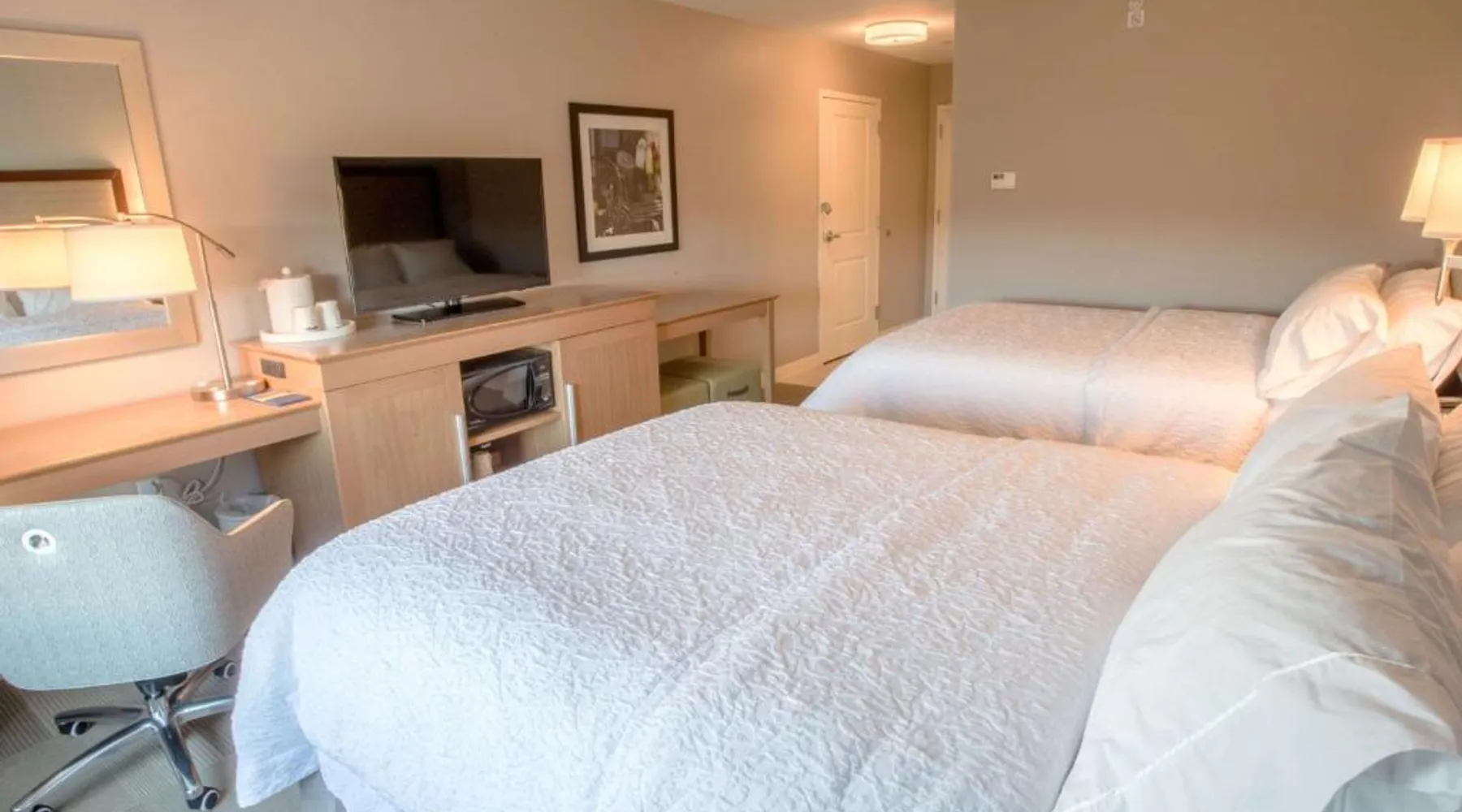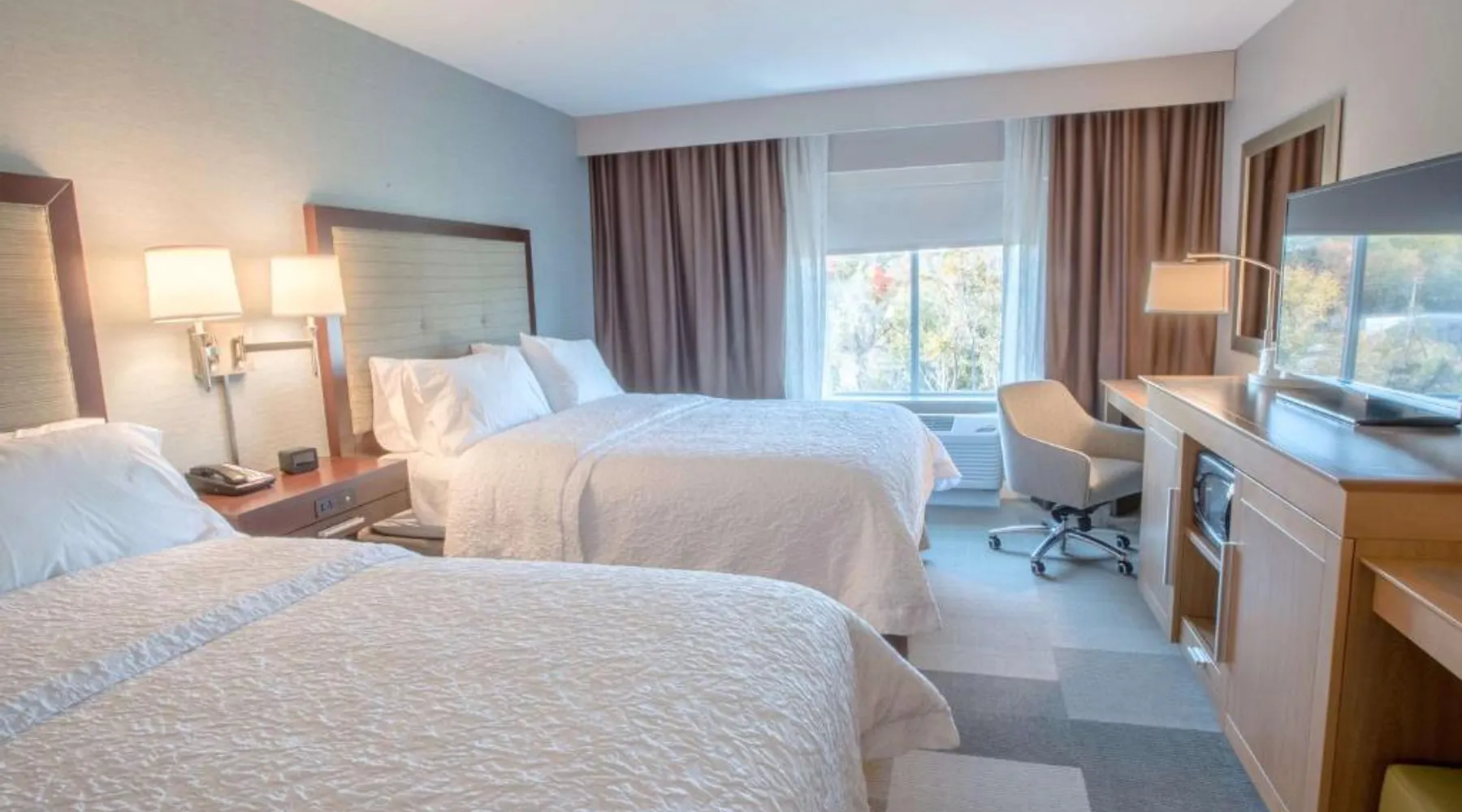 The Hampton Inn Amesbury is located in the coastal region of Massachusetts. The hotel offers complimentary Wi-Fi and hot breakfast to all guests. Each of the rooms feature a microwave, mini-fridge, study table and a flat-screen cable TV. With a heated indoor pool and fitness center, the hotel also has a 24-hour front desk, business center, suite shop and a meeting space for up to 45 guests. Portsmouth is 17 mi from Hampton Inn by Hilton Amesbury, MA, while Salem is 23 mi away. The nearest airport is Logan Airport, 34 mi from the Amesbury hotel. This double room provides a tea and coffee maker and a flat-screen TV. The unit offers 1 bed.