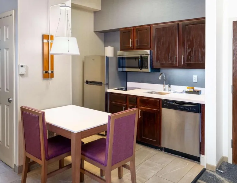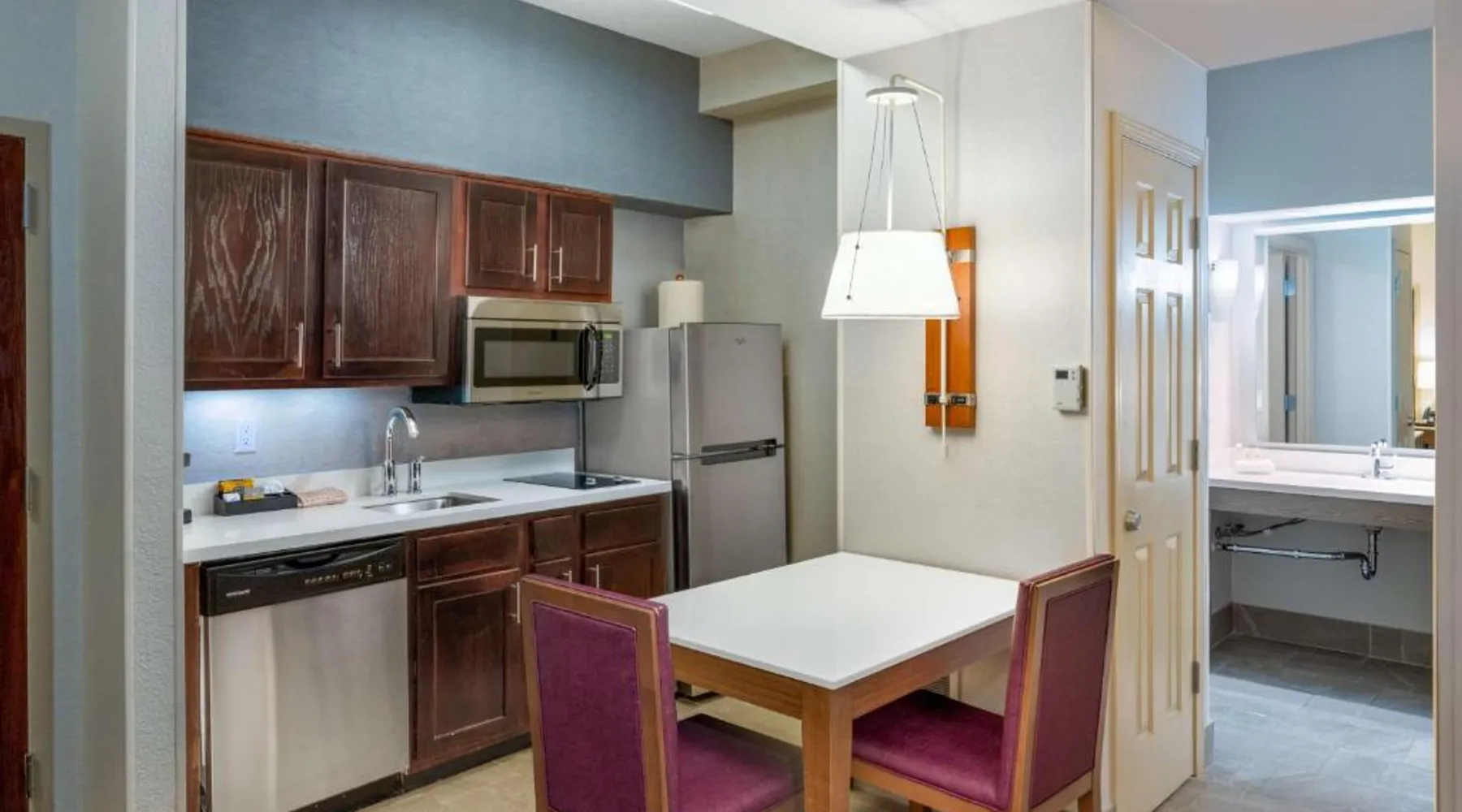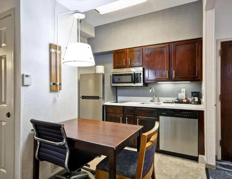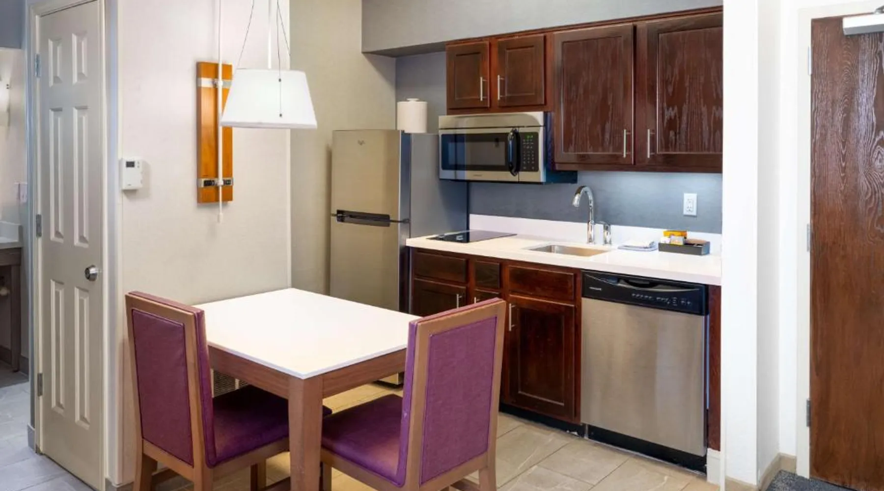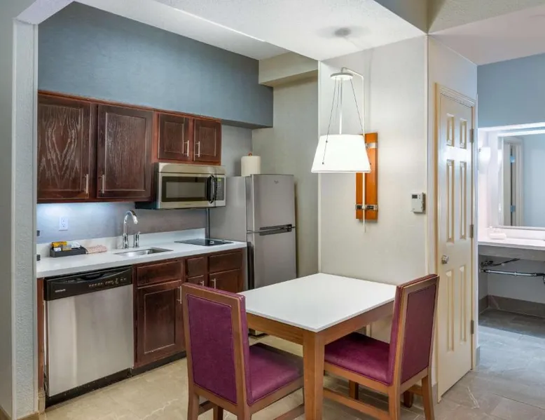 Comfortable Accommodations: Homewood Suites Memphis Germantown in Memphis offers family rooms with air-conditioning, refrigerators, microwaves, and free WiFi. Each room includes a kitchen with a stovetop, toaster, dishwasher, and kitchenware. Exceptional Facilities: Guests can enjoy an outdoor swimming pool, fitness room, and free on-site parking. Additional amenities include a 24-hour front desk, elevator, and free toiletries. Delicious Breakfast: A complimentary American buffet breakfast is served with gluten-free options. Breakfast includes fresh pastries, fruits, juice, and a work desk. Prime Location: Located 12 mi from Memphis International Airport, the hotel is near attractions such as Stax Museum of American Soul Music (15 mi) and Graceland (17 mi). Guests appreciate the attentive staff and room cleanliness. This suite features a microwave and refrigerator as well as an additional sink and counter space.