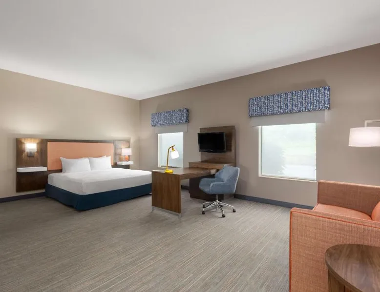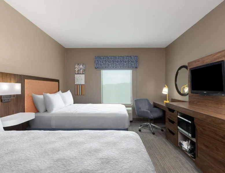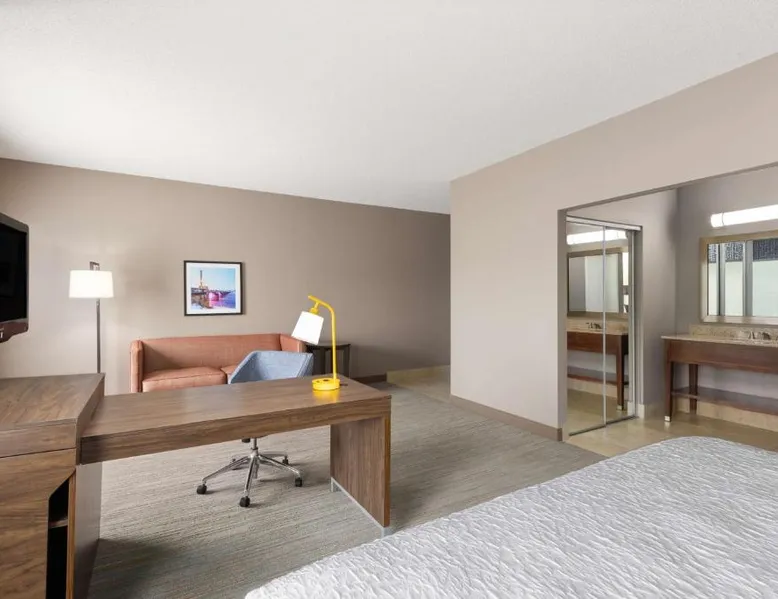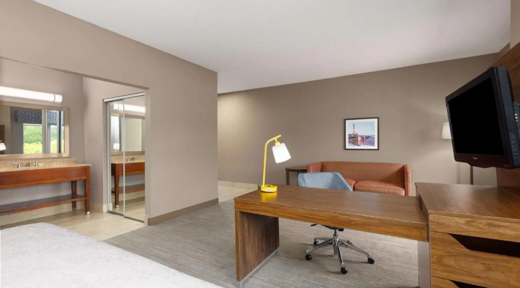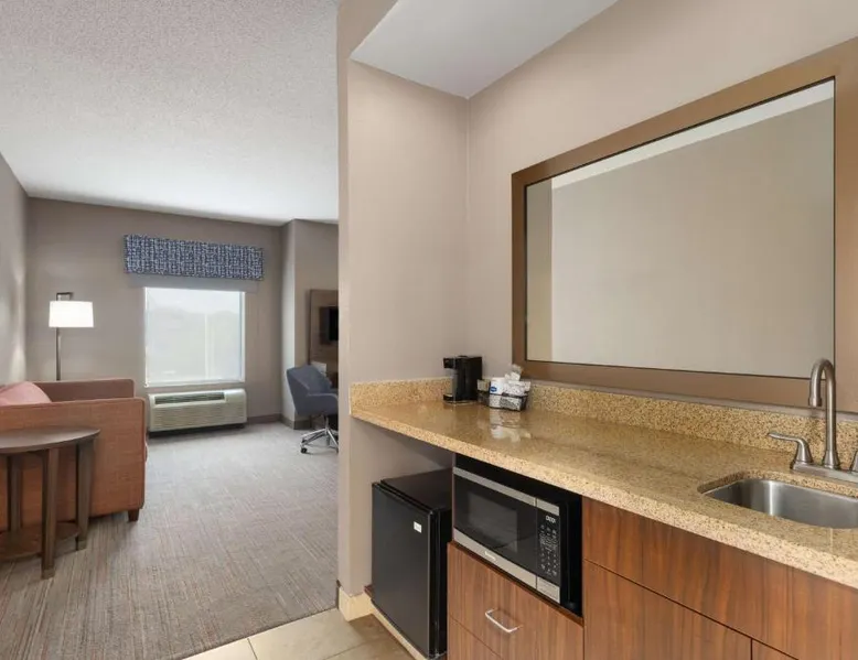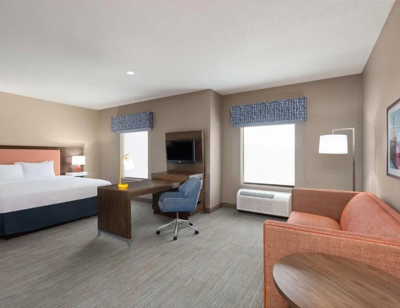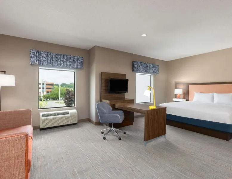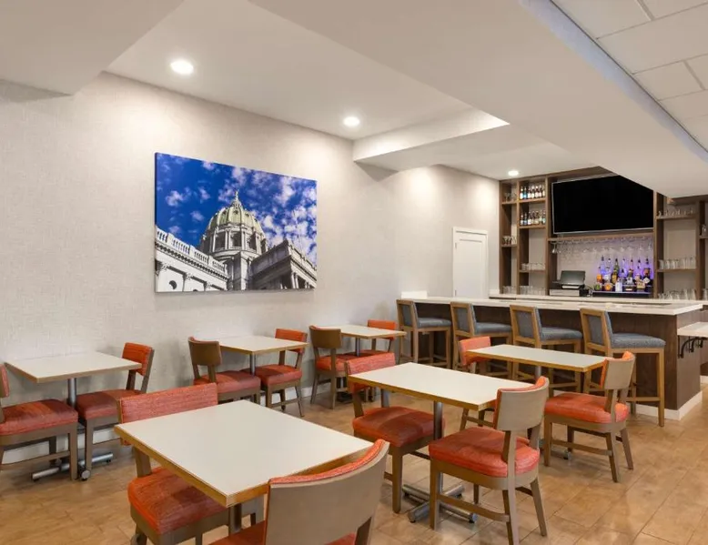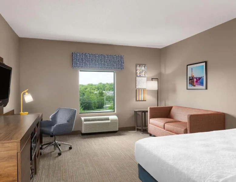 Comfortable Accommodations: Hampton Inn & Suites Harrisburg in Harrisburg offers family rooms with air-conditioning, free WiFi, and amenities such as a tea and coffee maker, hairdryer, sofa bed, and refrigerator. Each room includes a seating area, free toiletries, microwave, and TV. Leisure Facilities: Guests can enjoy a fitness center, sun terrace, indoor swimming pool, and outdoor seating area. Additional facilities include a lounge, fitness room, elevator, 24-hour front desk, minimarket, daily housekeeping service, child-friendly buffet, business area, coffee shop, and luggage storage. Prime Location: Located 4.3 mi from the National Civil War Museum and 5 mi from the Pennsylvania State Capitol, the hotel is also near attractions like Hersheypark (15 mi) and Zoo America (15 mi). Paid on-site parking is available. Guest Satisfaction: Highly rated by guests for its breakfast provided by the property, room comfort, and attentive staff. Featuring a flat-screen cable TV and a coffee maker.