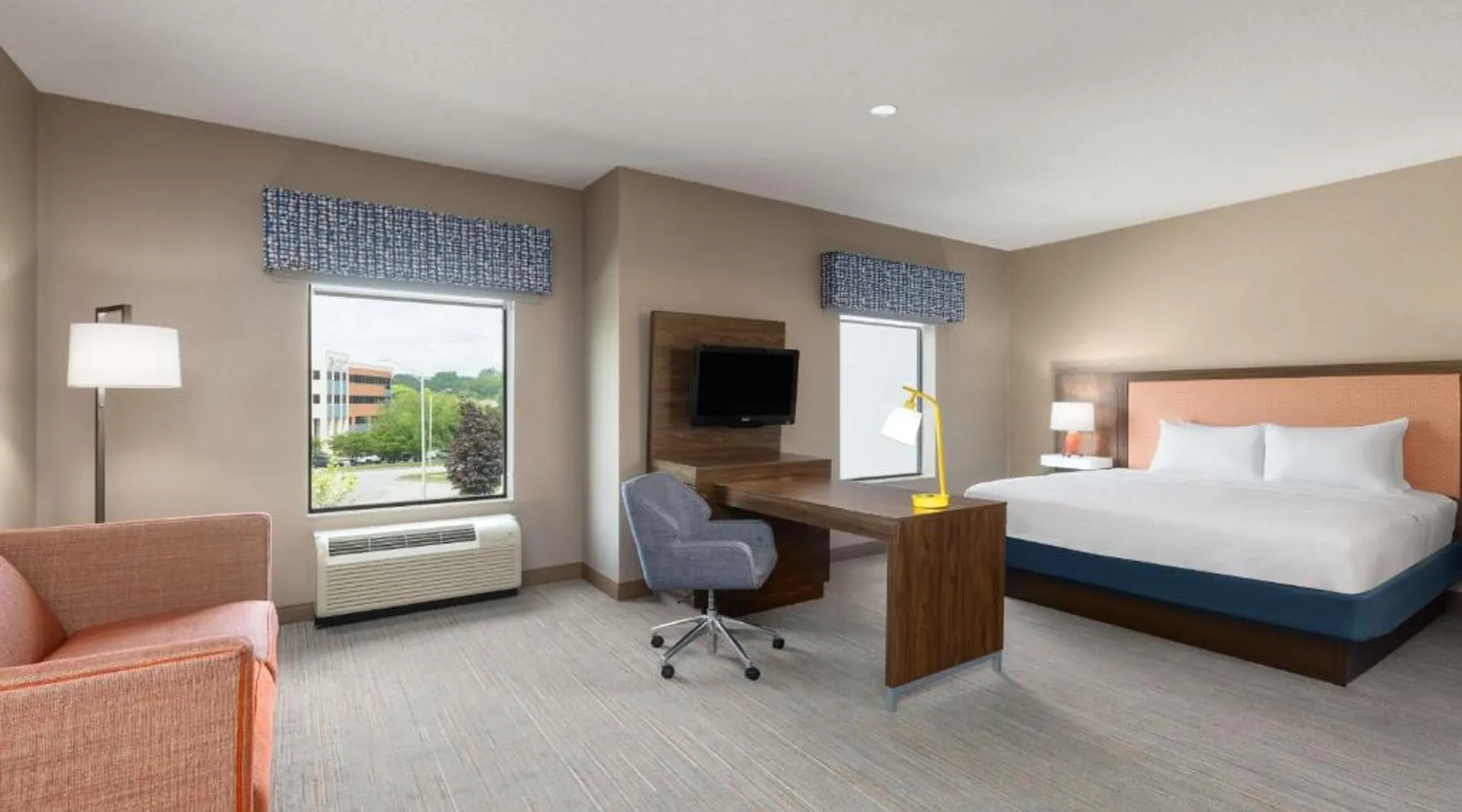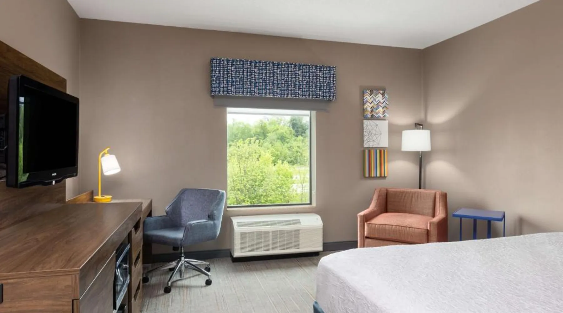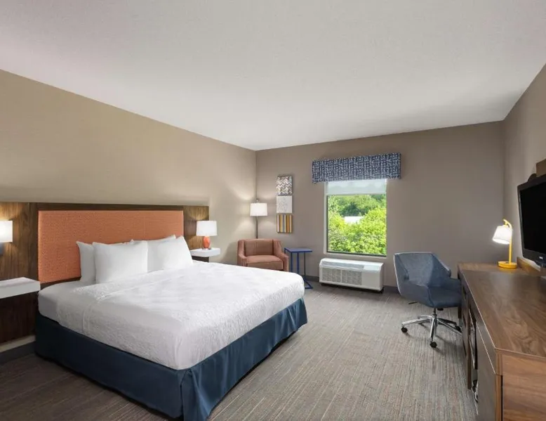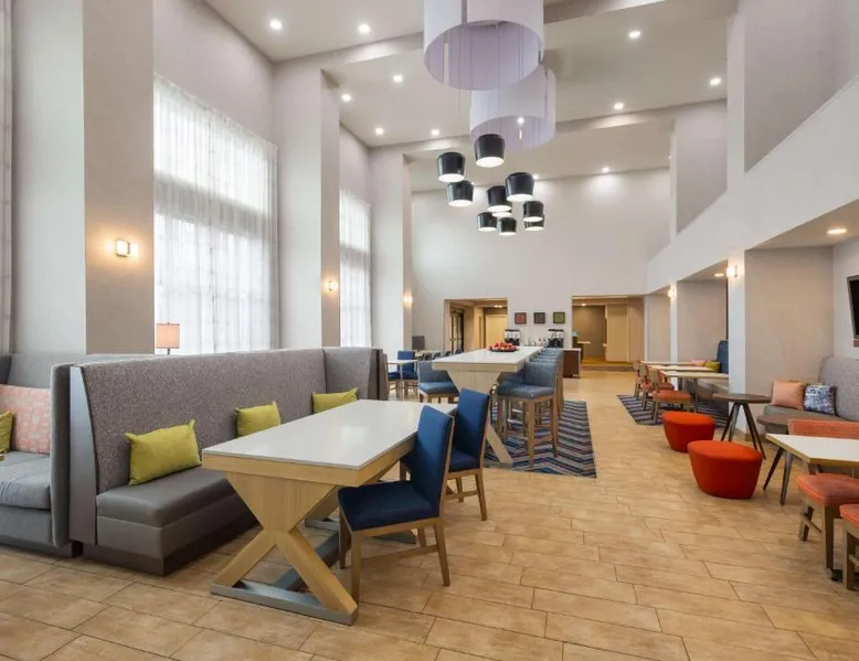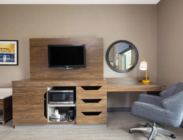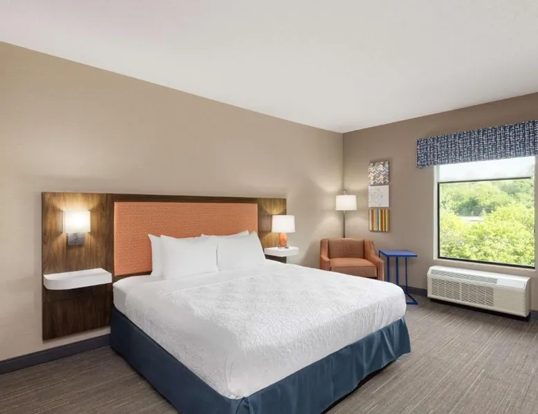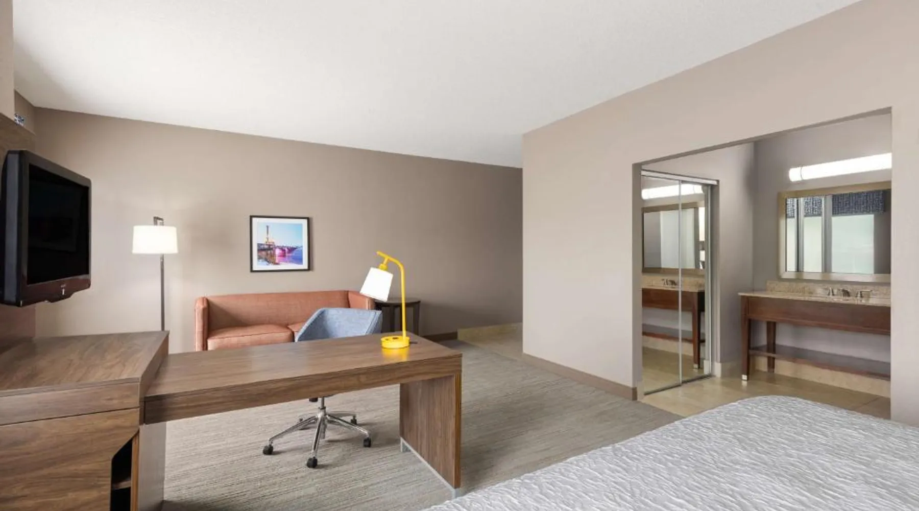 Comfortable Accommodations: Hampton Inn & Suites Harrisburg in Harrisburg offers family rooms with air-conditioning, free WiFi, and amenities such as a tea and coffee maker, hairdryer, sofa bed, and refrigerator. Each room includes a seating area, free toiletries, microwave, and TV. Leisure Facilities: Guests can enjoy a fitness center, sun terrace, indoor swimming pool, and outdoor seating area. Additional facilities include a lounge, fitness room, elevator, 24-hour front desk, minimarket, daily housekeeping service, child-friendly buffet, business area, coffee shop, and luggage storage. Prime Location: Located 4.3 mi from the National Civil War Museum and 5 mi from the Pennsylvania State Capitol, the hotel is also near attractions like Hersheypark (15 mi) and Zoo America (15 mi). Paid on-site parking is available. Guest Satisfaction: Highly rated by guests for its breakfast provided by the property, room comfort, and attentive staff. Featuring a flat-screen cable TV and a coffee maker.