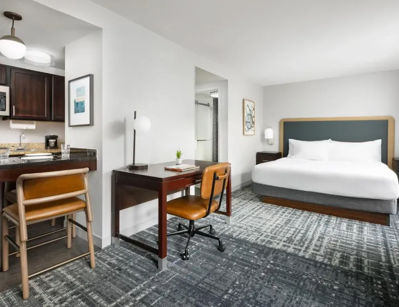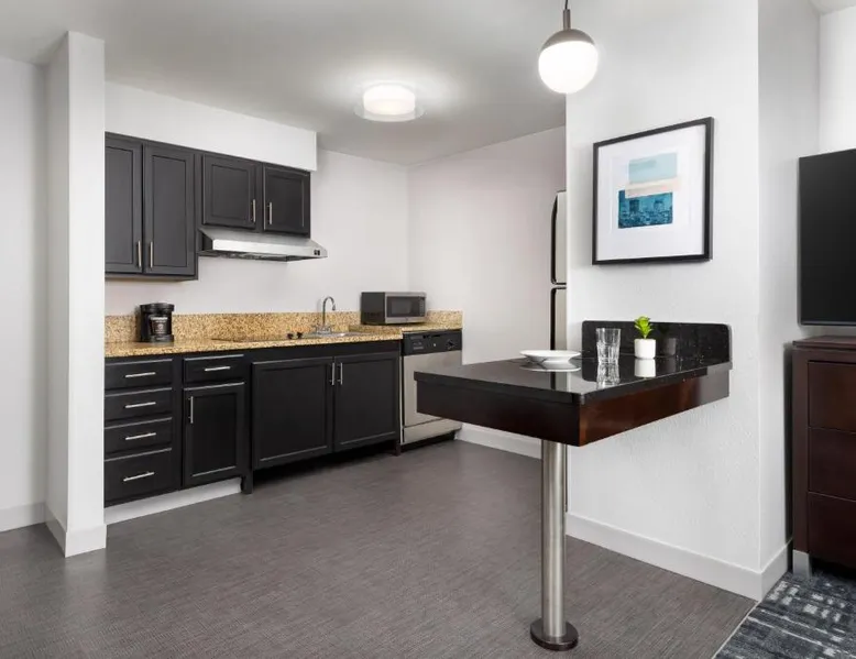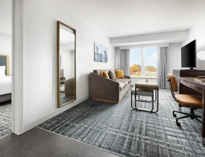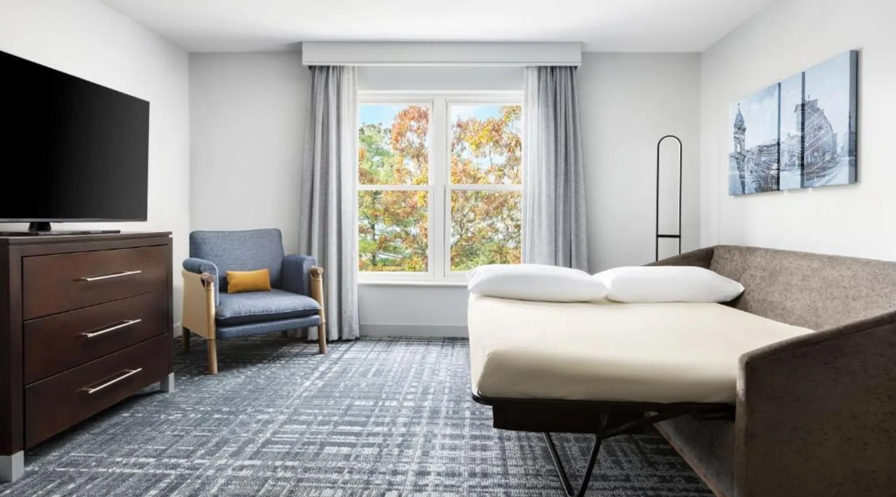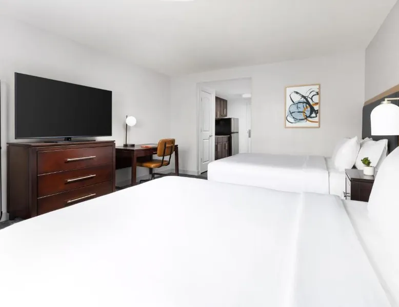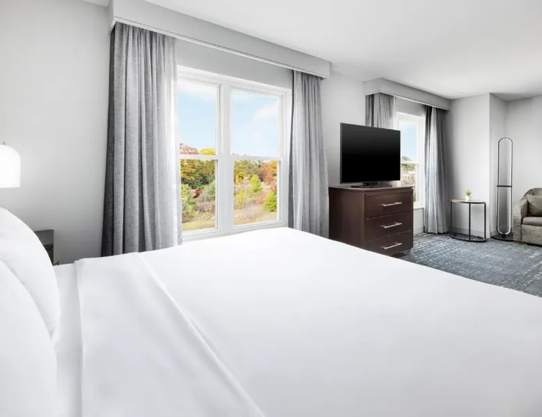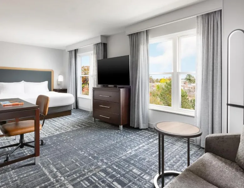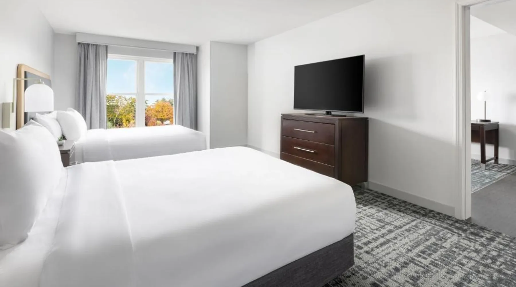 Comfortable Accommodations: Homewood Suites by Hilton Manchester/Airport in Manchester offers family rooms with air-conditioning, kitchen facilities, and free WiFi. Each room includes a work desk, TV, and free toiletries. Exceptional Facilities: Guests can enjoy a fitness center, indoor swimming pool, and free airport shuttle service. Additional amenities include a lounge, minimarket, and outdoor play area. Delicious Breakfast: A complimentary American buffet breakfast is served daily, catering to diverse preferences. Convenient Location: Located 0.6 mi from Manchester Boston Regional Airport, the hotel is near attractions such as Mall Of New Hampshire (2.1 mi) and State Park (6.2 mi). The fully equipped kitchen features a stovetop, a refrigerator, kitchenware and an oven. The suite provides air conditioning, a tea and coffee maker, a seating area, heating, as well as a flat-screen TV. The unit offers 2 beds.