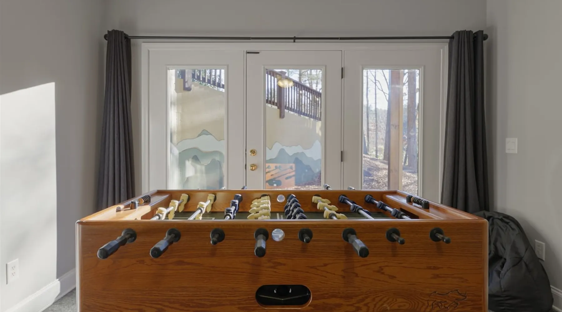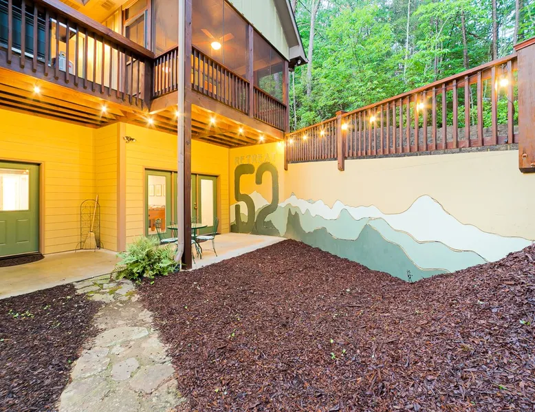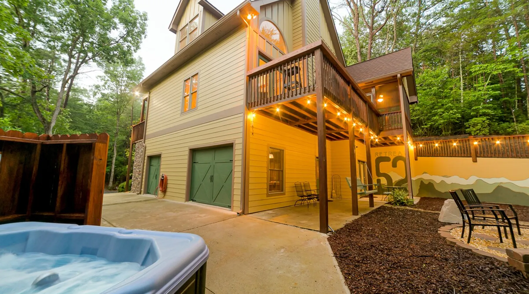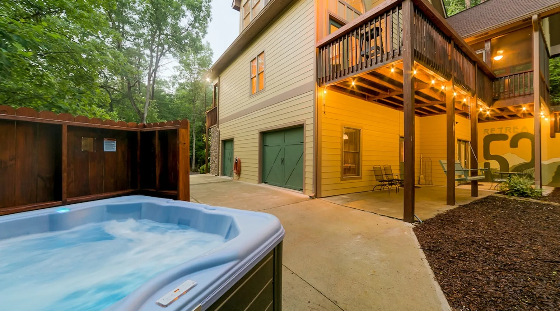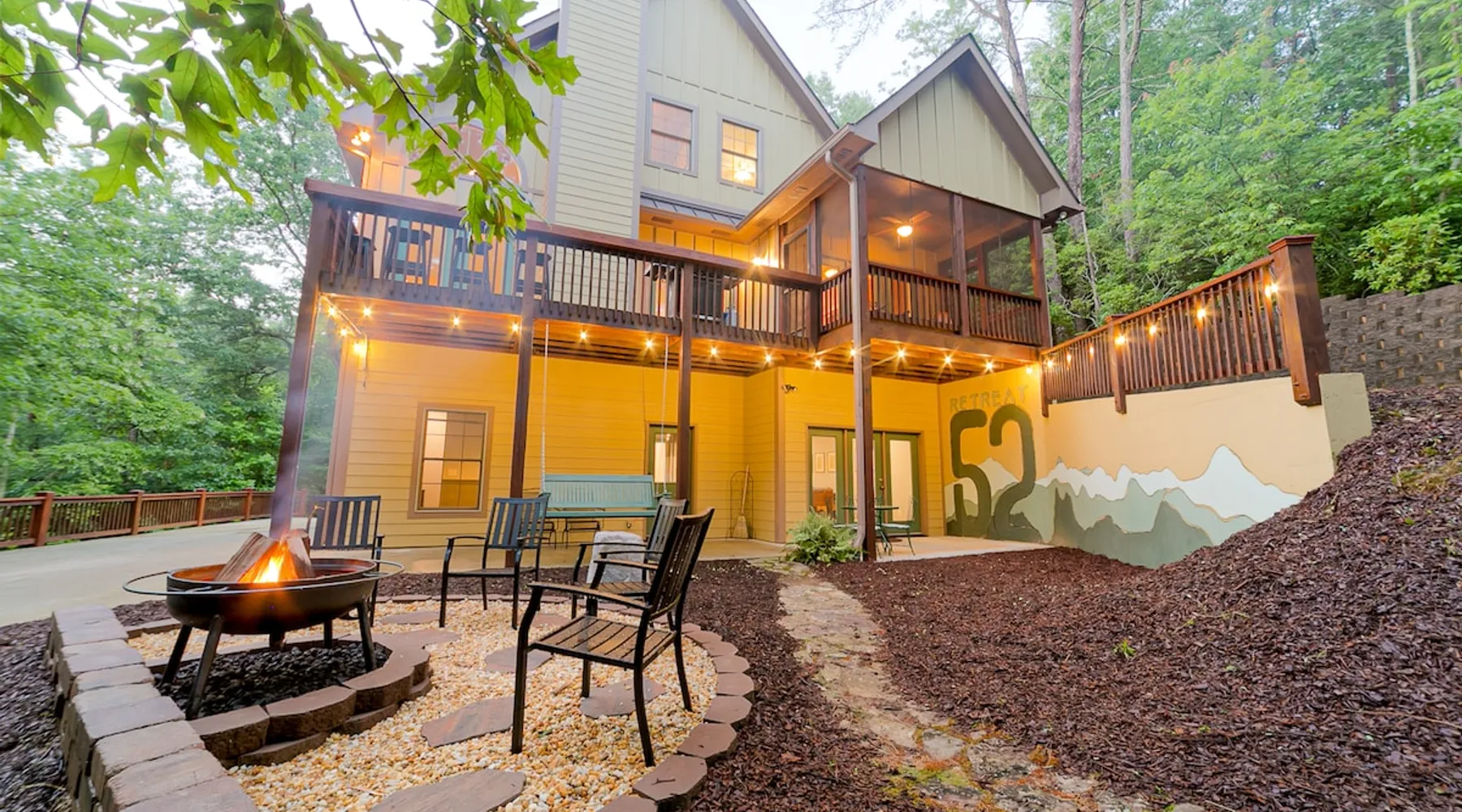Retreat 52 presents a meticulously upgraded three-level home within Innsbruck Golf Resort. Tucked away at the rear of the community, it boasts direct access to the lush greenery of the golf course, offering unparalleled privacy mere minutes from downtown Helen. The space Retreat 52 is a fully-loaded & newly renovated 3 level home in Innsbruck Golf Resort. The property is nestled in the back of the community right on the green. Enjoy privacy only minutes away from downtown Helen. The inside boasts a spacious main level great room with a modern rustic design, gas fireplace, and large windows that provide great natural light. The kitchen is fully equipped with stainless steel appliances, and a large dining table with a beautiful Edison bulb light fixture. Every bedroom is furnished with ultra-comfortable luxury linens, and Smart TVs for down time. The large deck features a screened-in portion, along with an outside bar on the railing, and commercial grade grill for BBQs. The terrace level is dedicated to entertainment and features a pool table, foosball table, additional family room with Smart TV, patio, fire pit area, and large hot tub. Retreat 52 sleeps 10 comfortably, and is ideal for families with 2-6 kids (bunk bed room). Enjoy all of the additional amenities of Innsbruck including:, golf, spa, & more! Other things to note 25+ age requirement for lead guest. No exceptions. This property is not pet or dog-friendly. No exceptions. Digital rental agreement will be required to sign and complete after property is booked. Firewood not provided for fire pit. Located in a private gated community. Trailers are not allowed. You can bring your own golf cart to travel within Innsbruck and downtown Helen, but it will have to be unloaded prior to entering community. Personal golf carts not allowed on golf course.