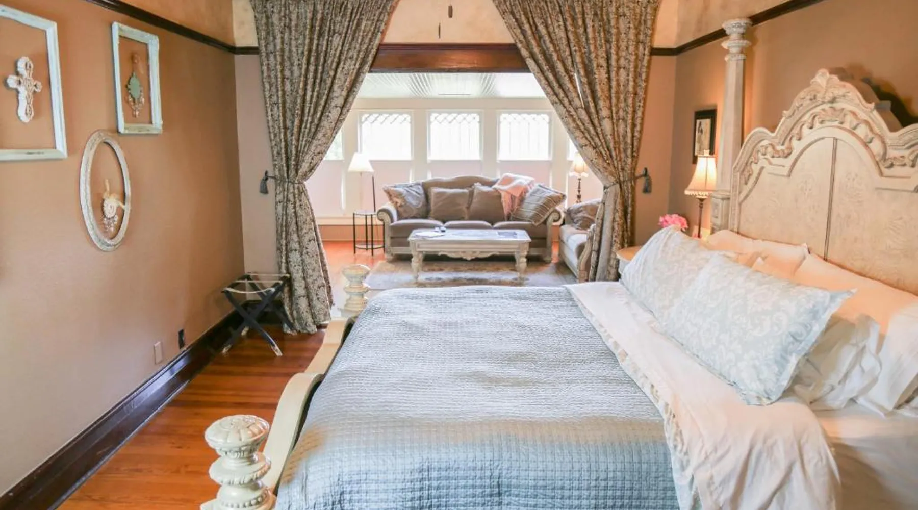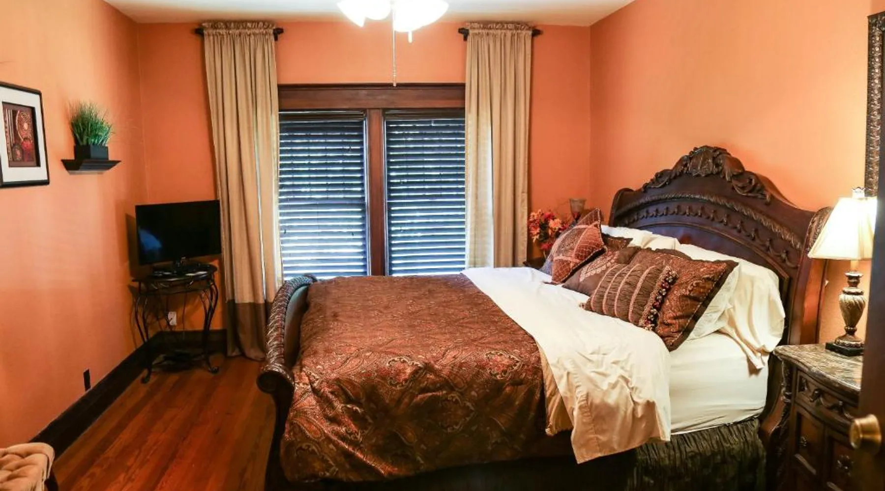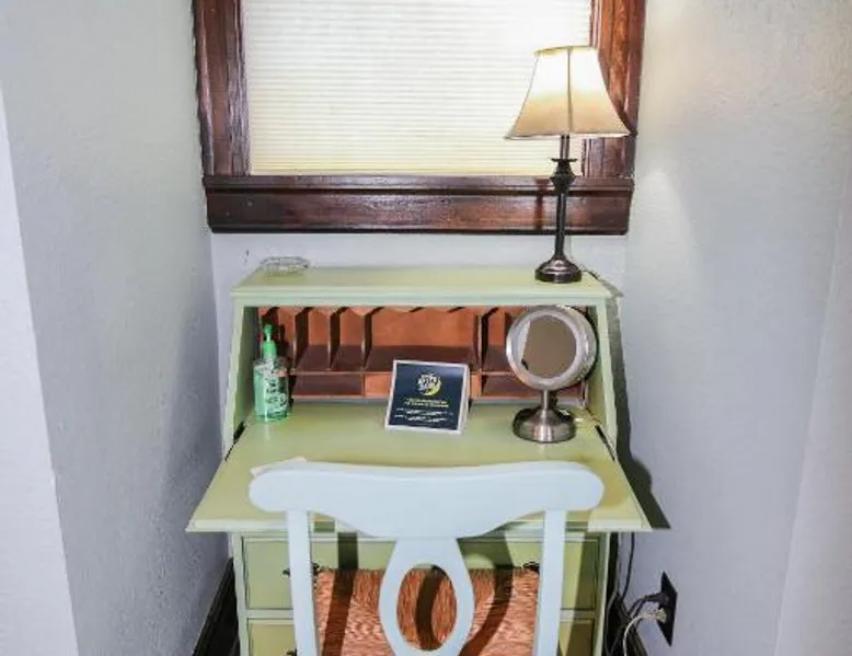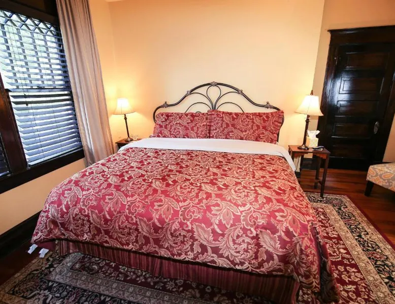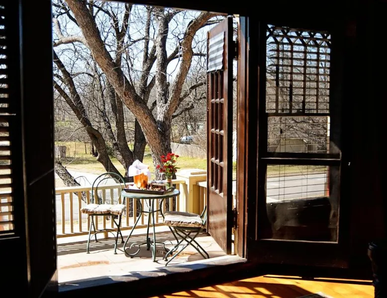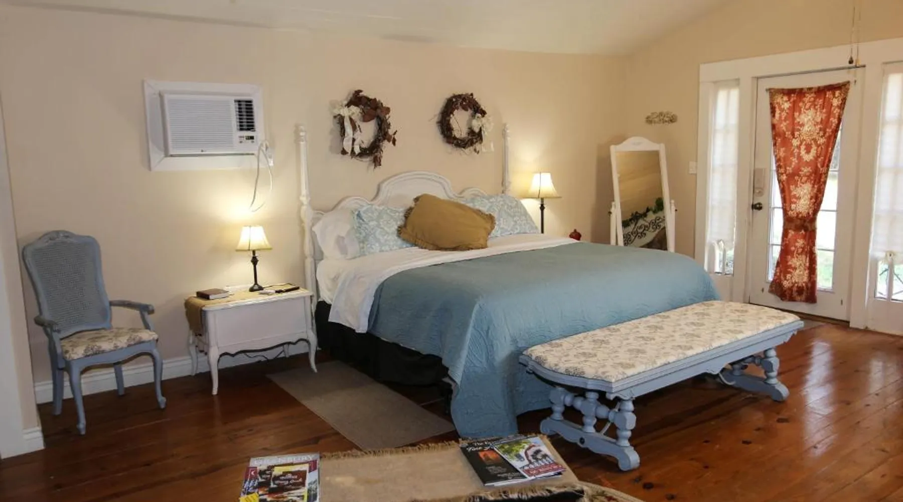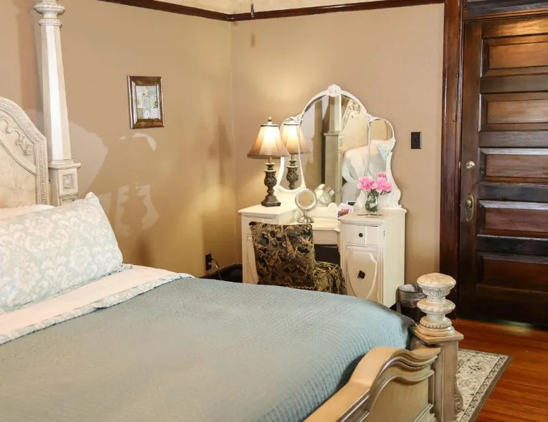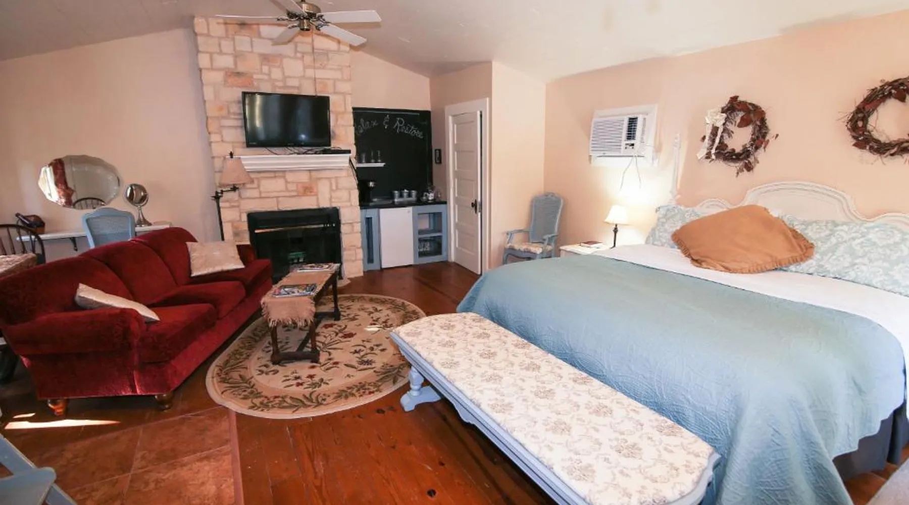 Elegant Accommodations: Iron Horse Inn in Granbury offers adults-only 5-star bed and breakfast experiences. Each room features air-conditioning, private bathrooms, and modern amenities. Exceptional Facilities: Guests enjoy free WiFi, private check-in and check-out, a lounge, and outdoor seating areas. Additional services include a shuttle, laundry, and barbecue facilities. Delightful Dining: Breakfast is served in-room, with menus catering to special diets. The property also offers a bar and outdoor dining areas. Prime Location: Located 21 mi from Dinosaur Valley State Park, the inn is highly rated for its breakfast, host, and history. This air conditioned bungalow features a cable TV, original hardwood floors and a fireplace.