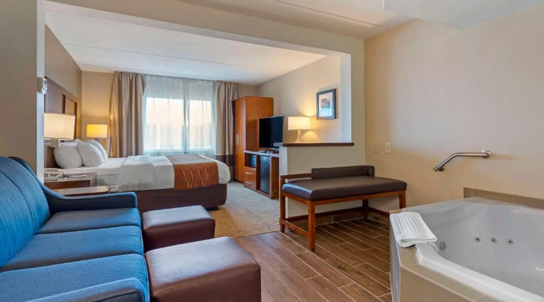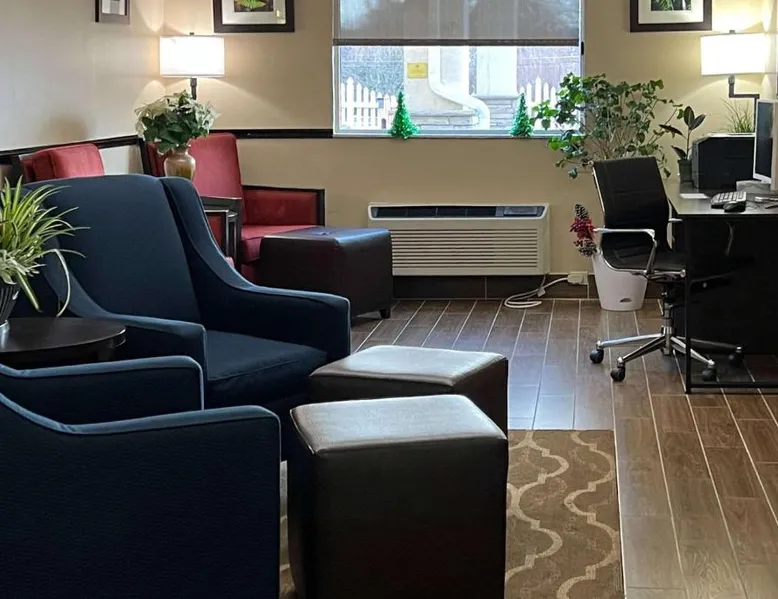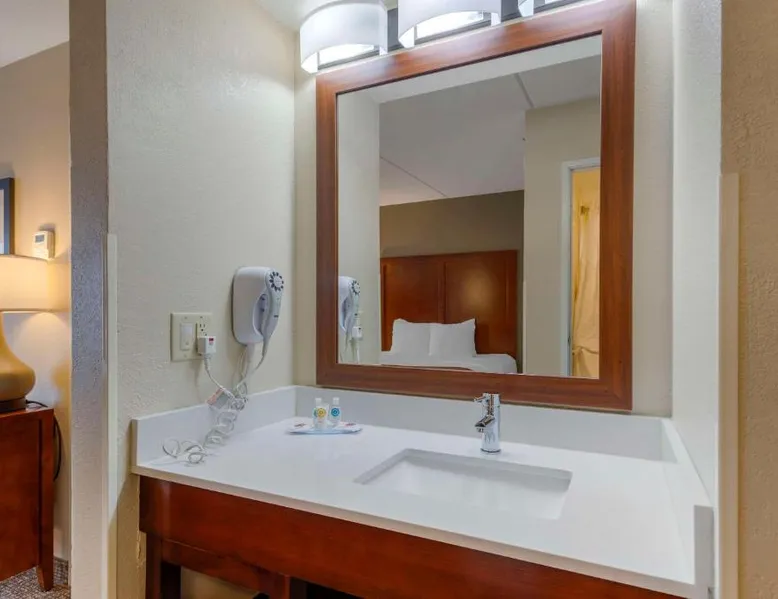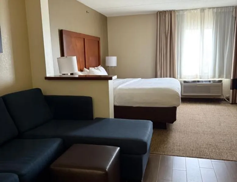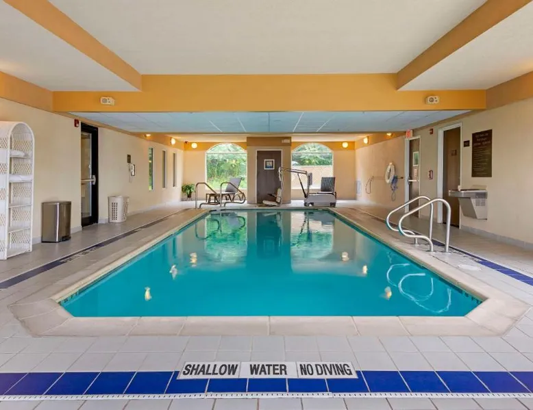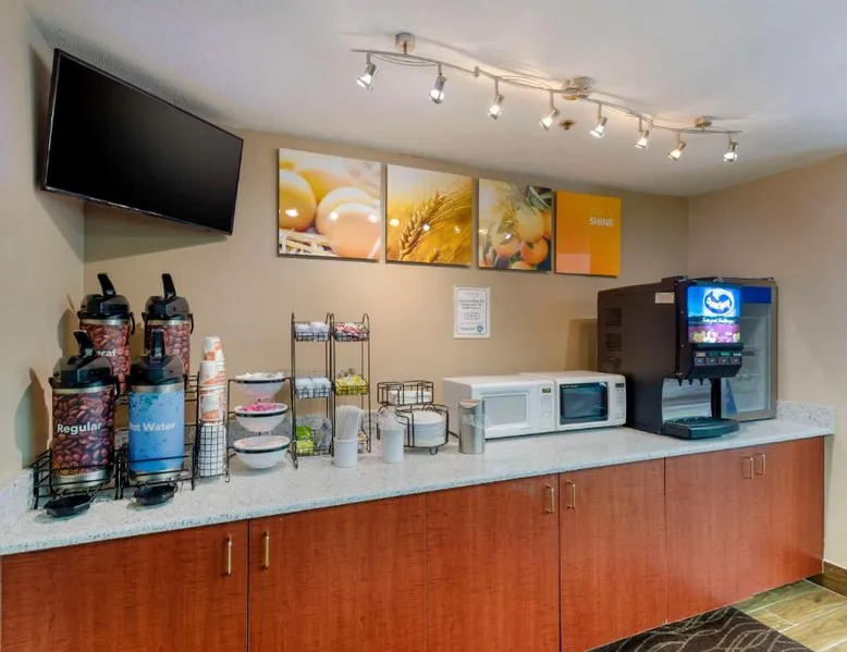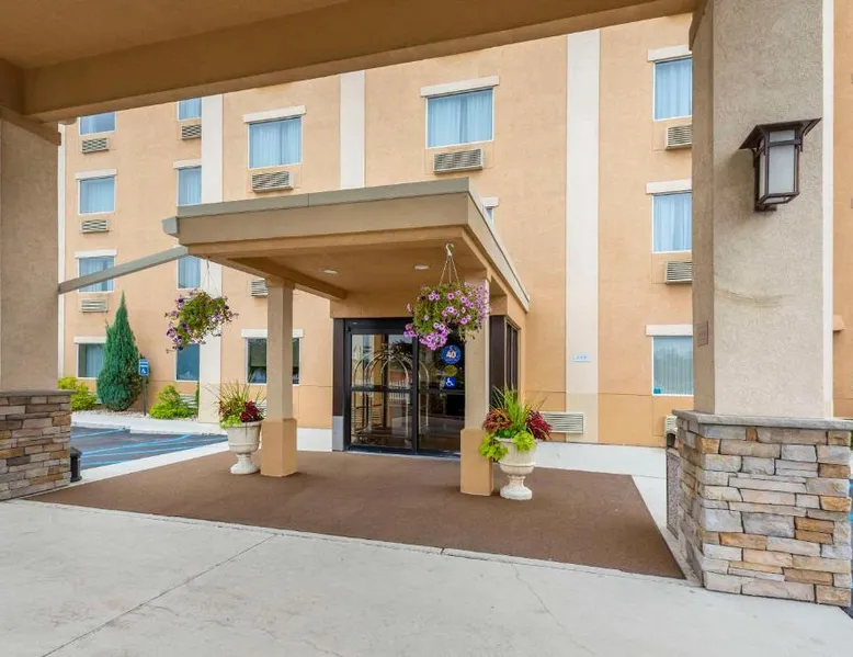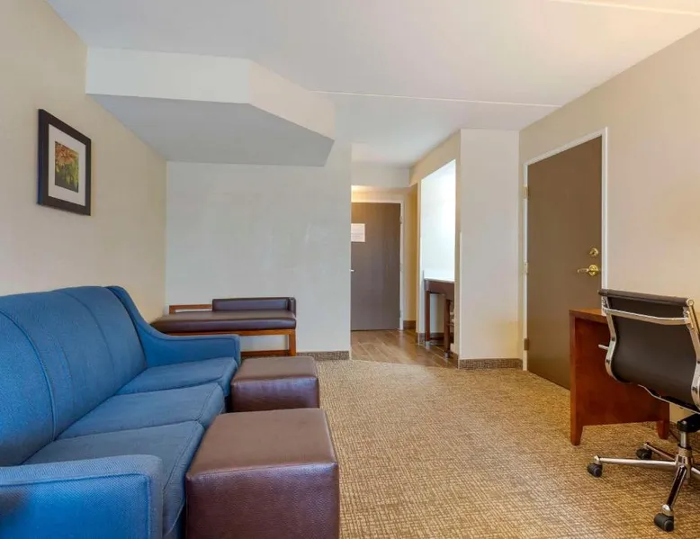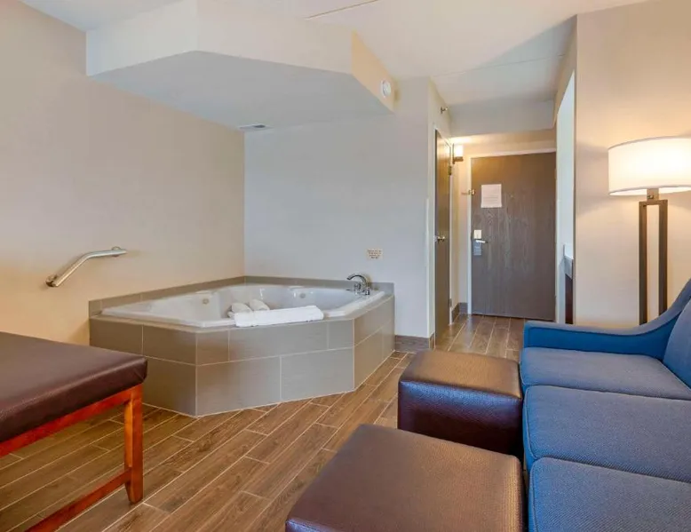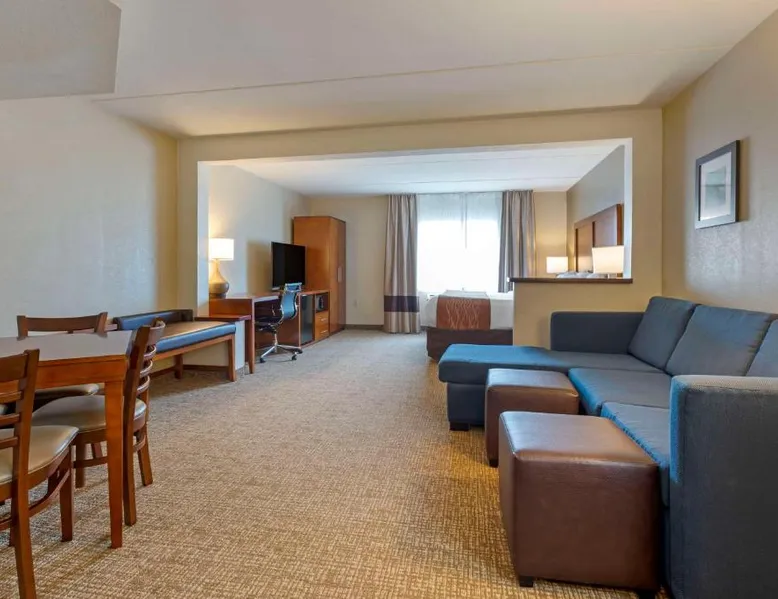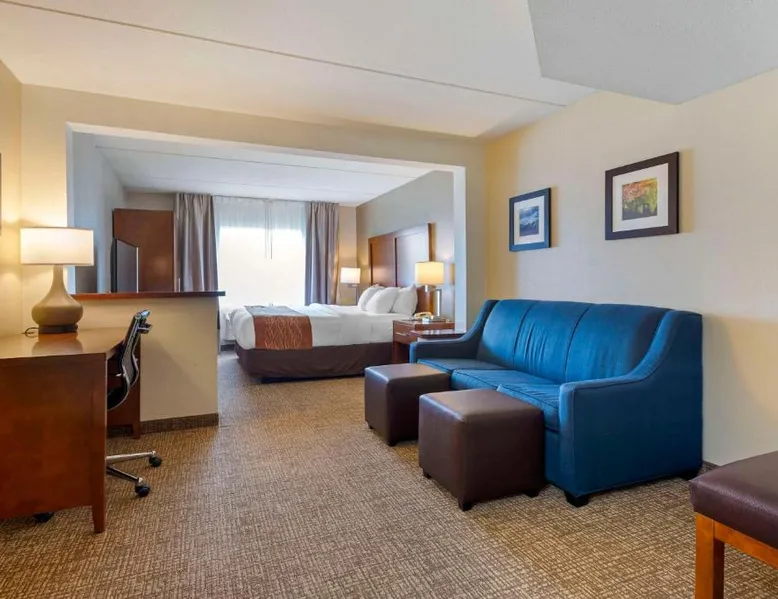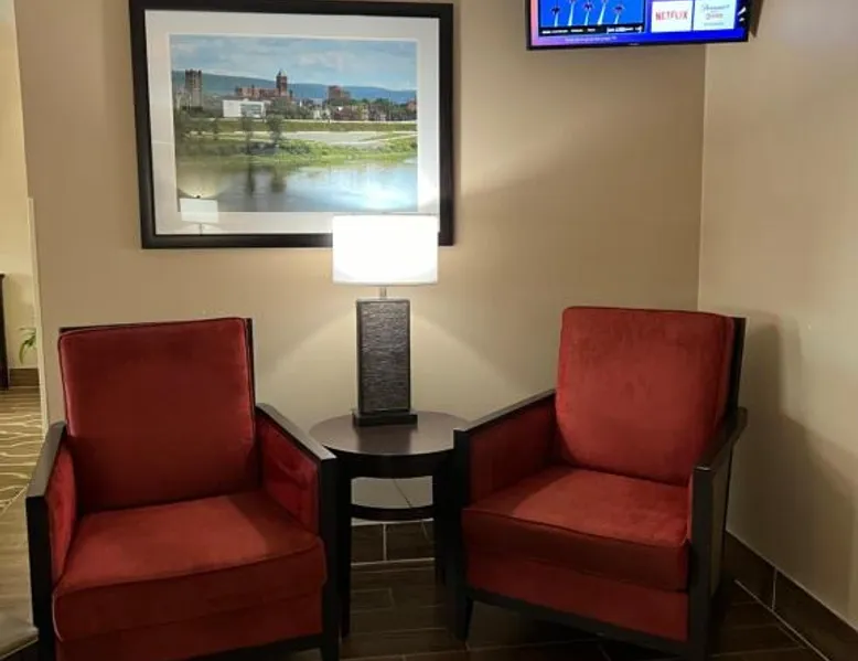Comfort Inn & Suites Wilkes Barre - Arena hotel is located on Interstate 81, convenient to a number of area businesses, attractions and points of interest like the Mohegan Sun at Pocono Downs casino and racetrack, Mohegan Sun Arena, F.M. Kirby Center for the Performing Arts, Wilkes University and King's College. The Pocono Mountains are just minutes away. Visitors can enjoy browsing the shops at one of the many nearby malls. The Wilkes-Barre / Scranton International Airport is only 14 miles away; contact the hotel for shuttle information. A variety of restaurants can be found in the surrounding area. Taco Bell and a Perkins Restaurant are also located adjacent to this Pennsylvania hotel. Hotel amenities and features include free hot breakfast, free high-speed Internet access in all rooms, free local calls, and free coffee and other hot beverages available 24 hours. There is also the option to use the exercise room or relax in the indoor heated pool. This hotel provides business travelers with a guest computer and access to copy and fax services. All guest rooms feature refrigerators, microwaves, coffee makers, hair dryers, irons and ironing boards. A lit parking lot is on the property. Equipped with a microwave and small refrigerator, this spacious room offers cable TV, ironing facilities and a work area.