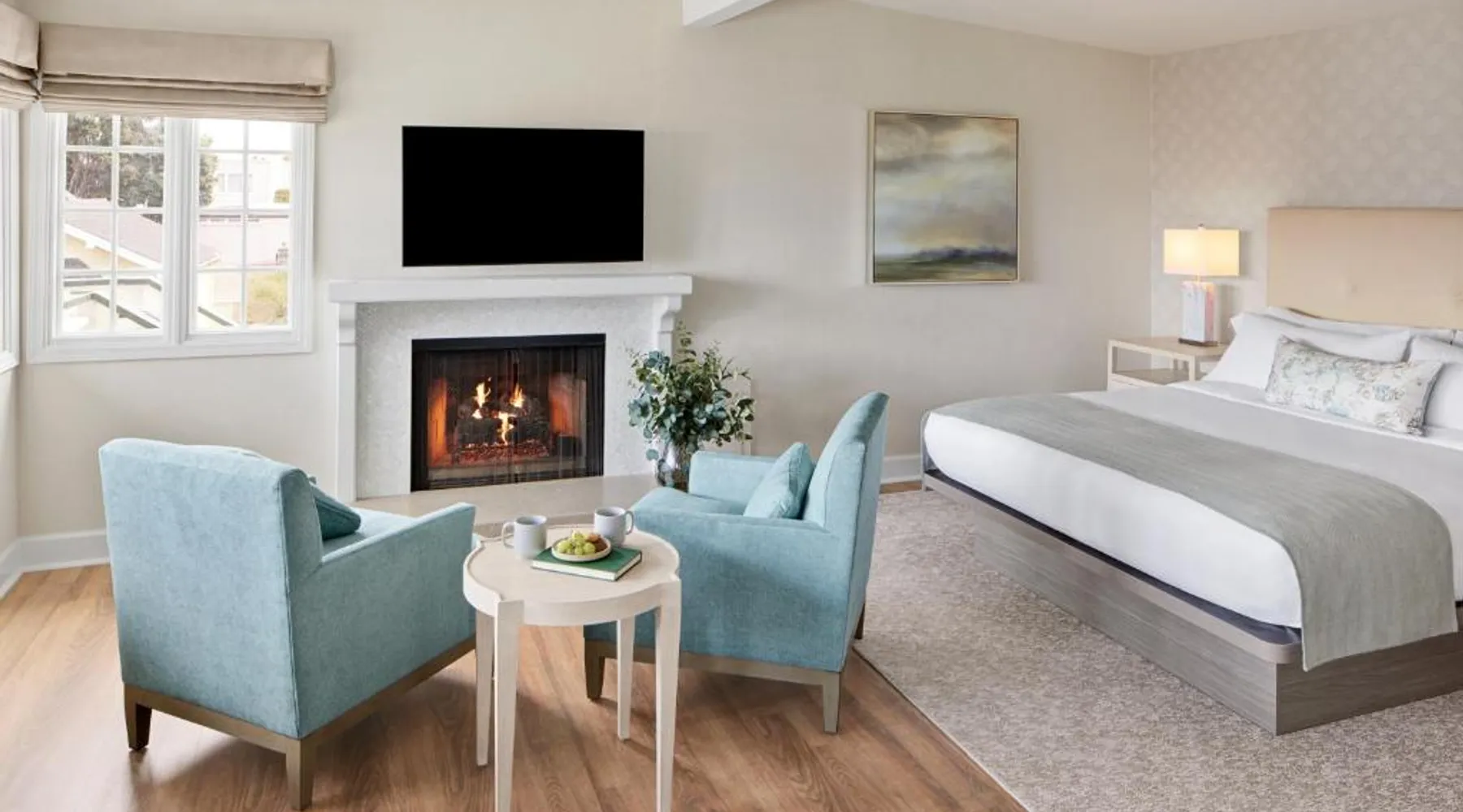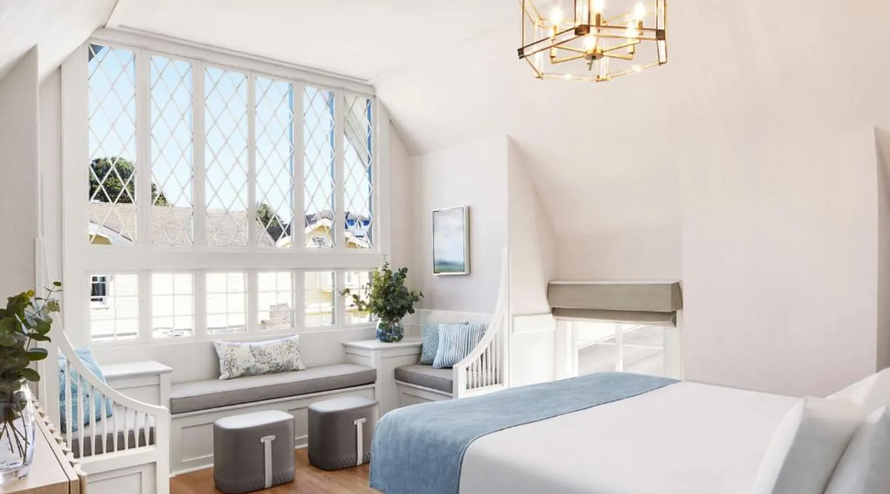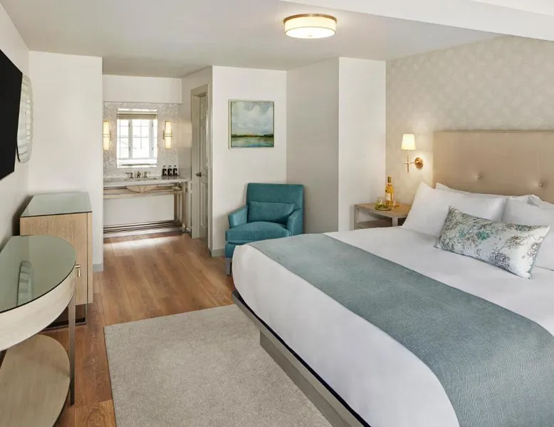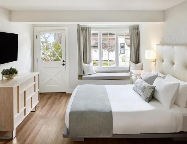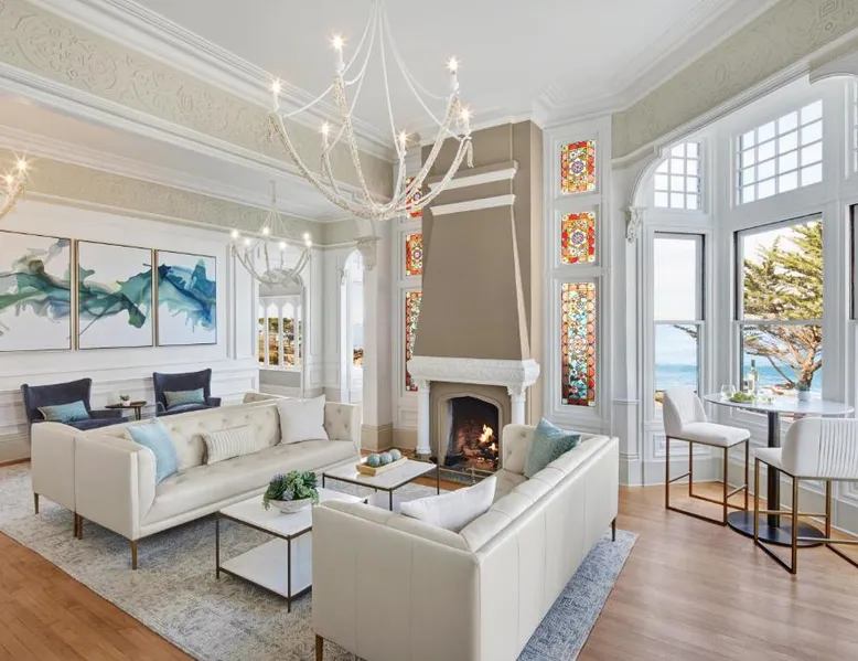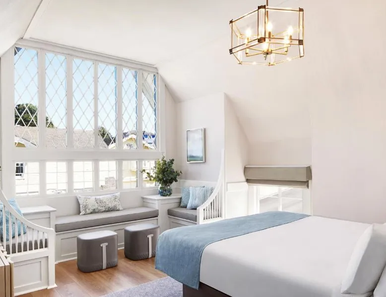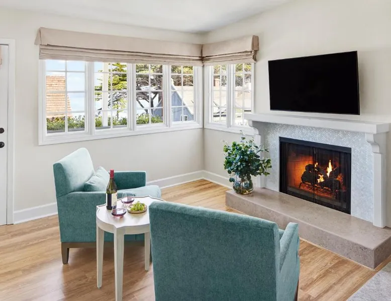 Comfortable Accommodations: Green Gables Inn, A Four Sisters Inn in Pacific Grove offers private bathrooms with sea views, balconies, and modern amenities. Each room includes a fireplace, tea and coffee maker, and free WiFi. Exceptional Facilities: Guests can relax in the garden or outdoor seating area. The inn provides a concierge service, tour desk, and luggage storage. Additional amenities include a spa bath, work desk, and free parking. Prime Location: Located 5 mi from Monterey Regional Airport, the inn is near Lovers Point Beach (13-minute walk), Monterey Bay Aquarium (less than 0.6 mi), and Cannery Row (16-minute walk). Hiking, cycling, and boating are available in the surroundings. Guest Favorites: Guests highly rate the breakfast provided by the property, convenient location, and scenic views. Also known as the "Deluxe Queen Guestroom" this room features a small private bathroom and view of the Monterey Bay from a window seat in a gable loft.