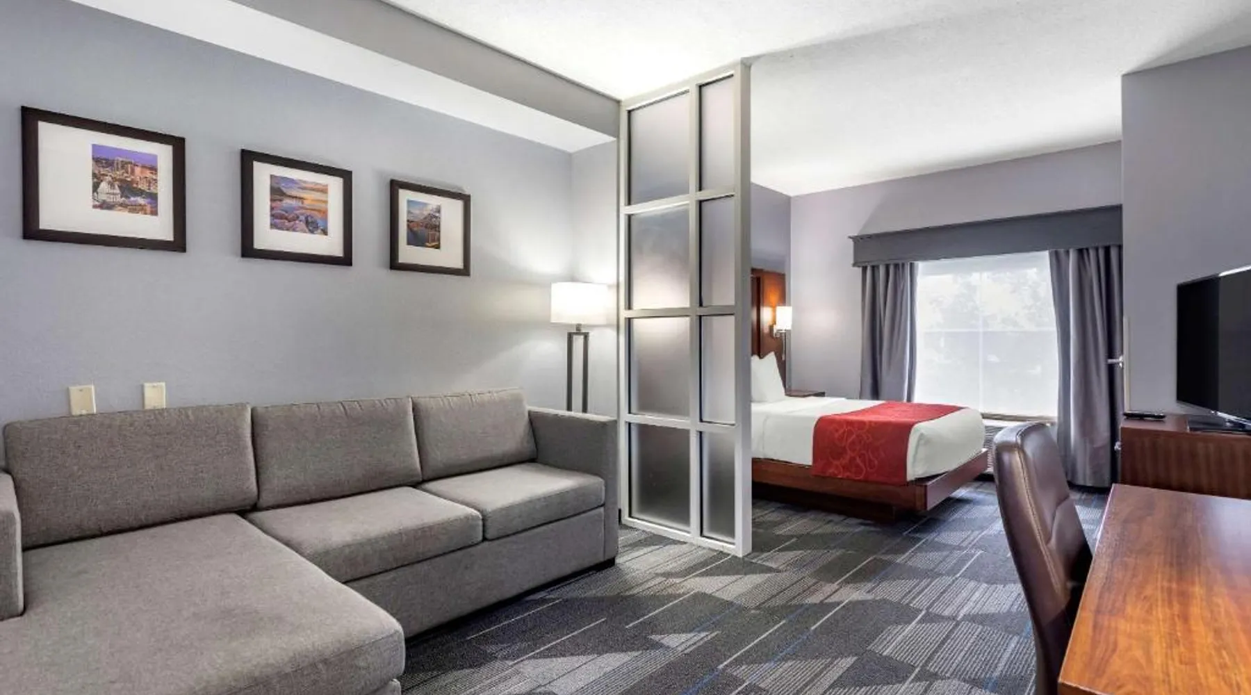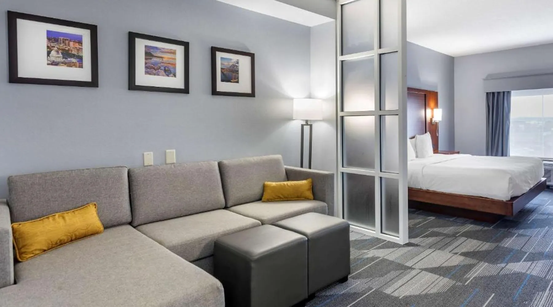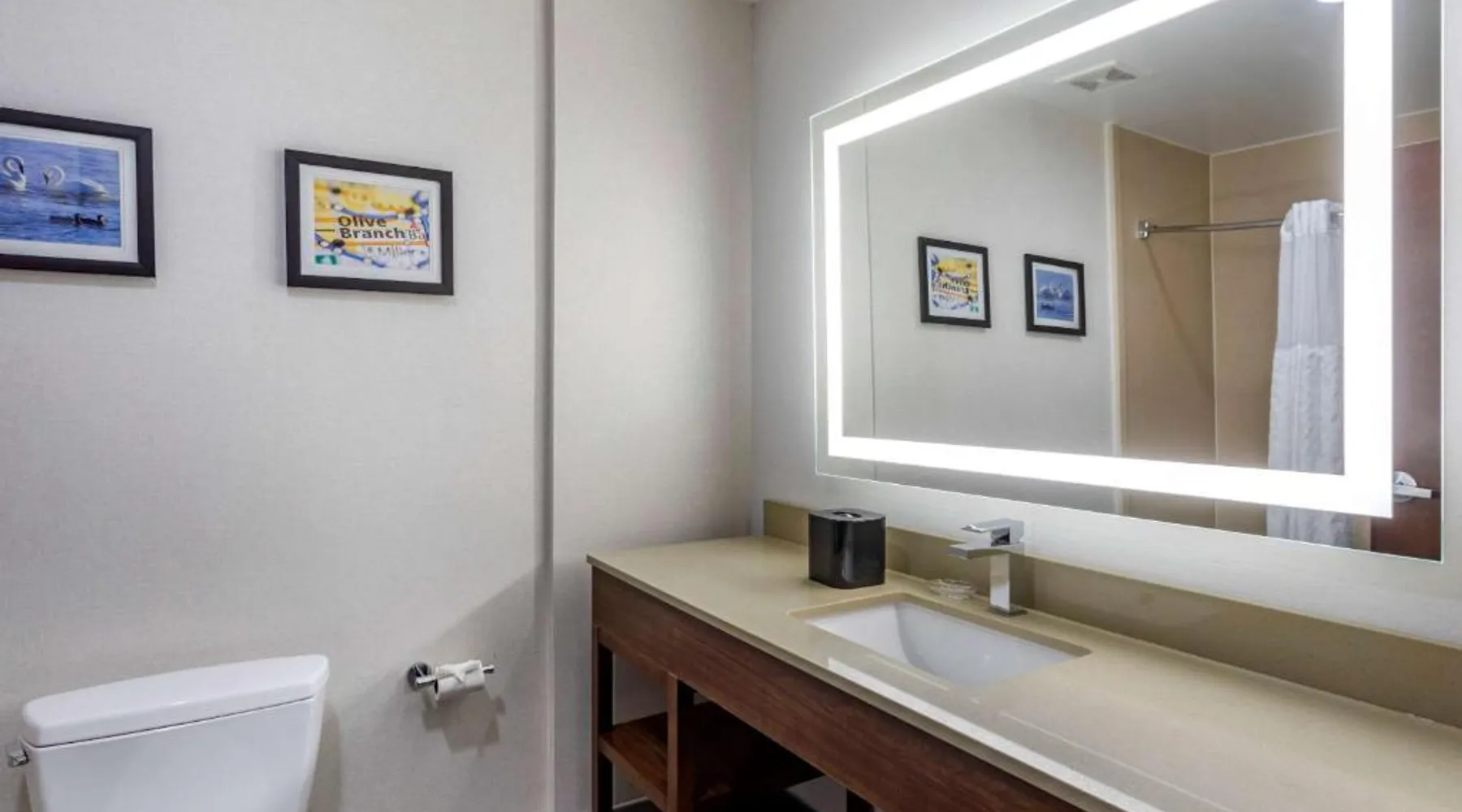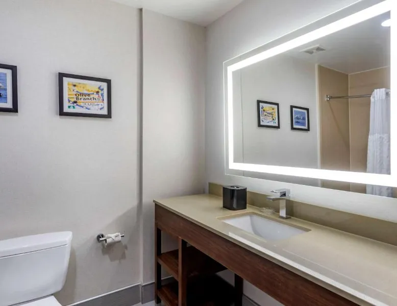 The Comfort Suites hotel is conveniently located on U.S. Highway 78 in the commercial area of town. This Olive Branch, MS hotel is minutes from the DeSoto Civic Center. Downtown Memphis, the famous Graceland estate and former home of Elvis Presley, the Memphis Zoo, FedEx Forum arena, Mike Rose Soccer Complex, the Olive Branch Airport and popular Beale Street are less than 20 miles away. All guest rooms come equipped with microwaves, refrigerators, flat-screen televisions, mini bars, voice mail, irons, ironing boards, hair dryers, coffee makers, desks, safes and cable television. Keep your electronic devices charged with the recharge device including AC and USB outlets provided in all guest rooms. Rooms with whirlpool bathtubs are offered for that special occasion. Laundry facilities are located on the property for your added convenience. As a guest of this Olive Branch, MS hotel, you'll enjoy amenities and features like: Free wireless high-speed Internet access; Free local calls; Free coffee; Manager's reception Monday through Thursday 5:30 p.m. - 7 p.m. Enjoy our free hot breakfast featuring eggs, meat, yogurt, fresh fruit, cereal and more, including your choice of hot waffle flavors! If you're leaving early, a Your Suite Success Grab & Go bag is available for the two hours prior to breakfast. After a busy day, relax in the seasonal outdoor pool. Be sure to take advantage of the on-site exercise room.Corporate travelers will appreciate access to copy and fax services. The meeting room accommodates up to 100 people. The city of Olive Branch has many community parks, offering lakes, tennis courts, a playground, baseball fields, walking and nature trails, a scenic overlook, an amphitheater and a picnic pavilion. Three upscale golf courses are close to our hotel. Several shopping opportunities are located just minutes away. We are walking distance from a variety of restaurants and movie theaters. This suite has a mini-bar, a sofa bed and a 50-inch flat-screen TV.