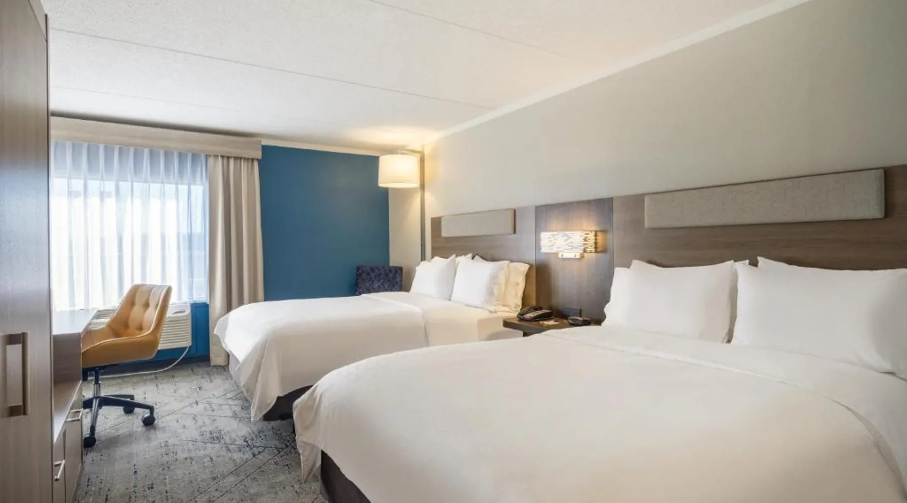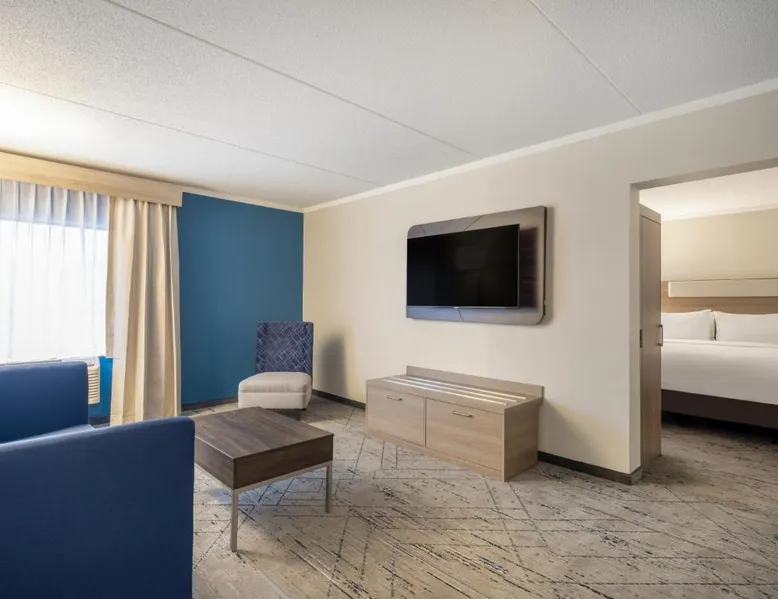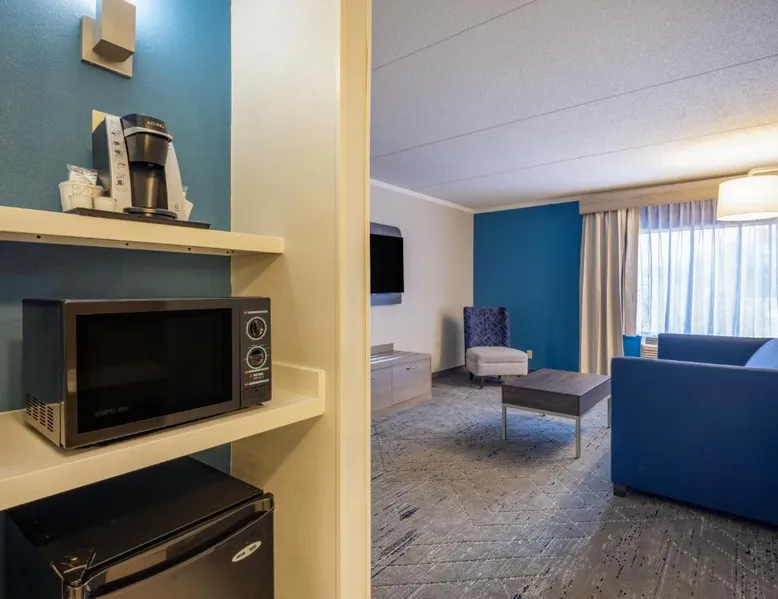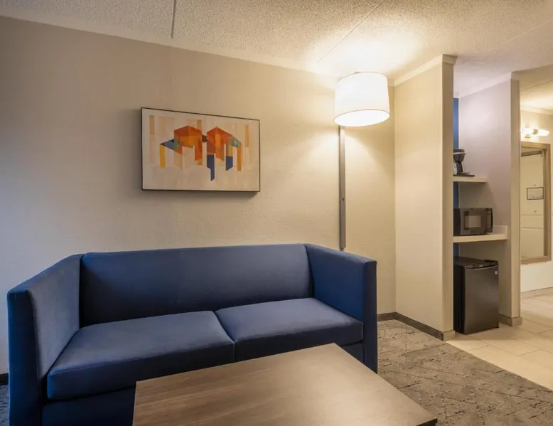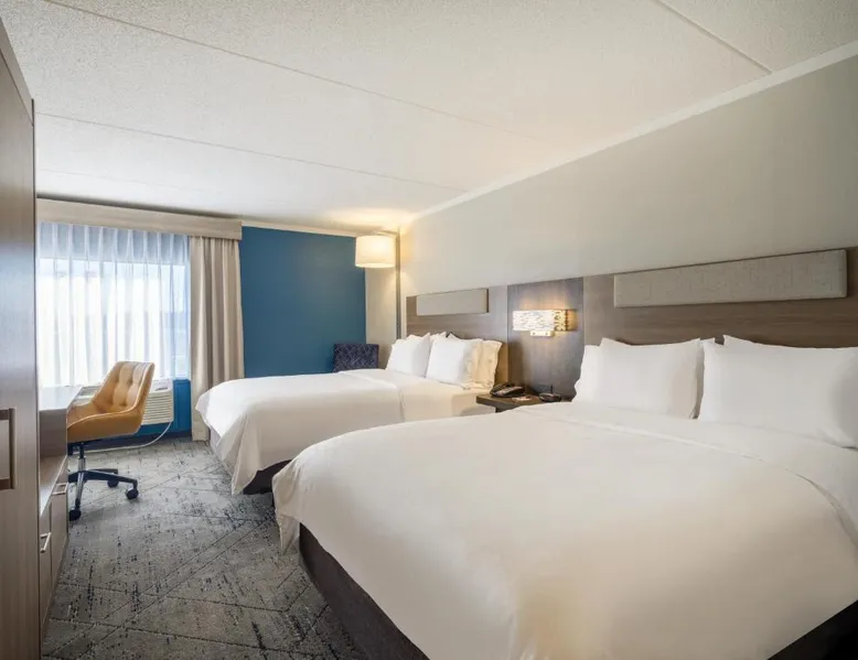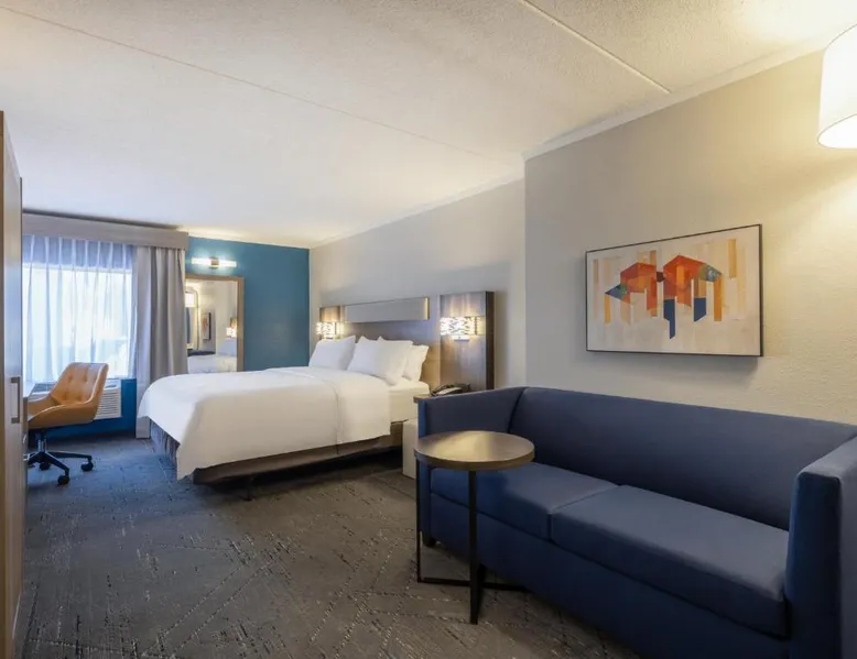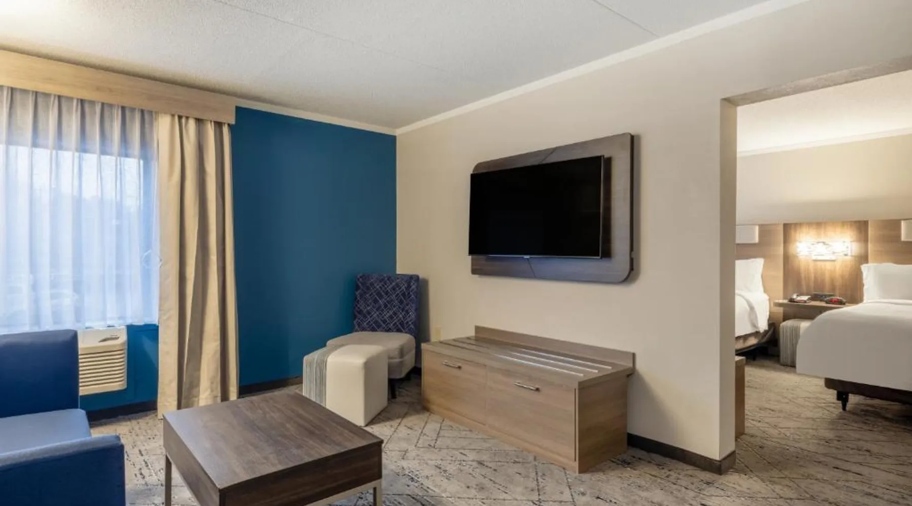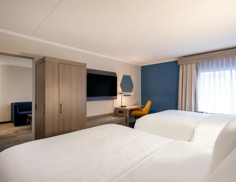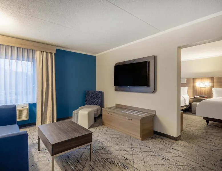 Comfortable Accommodations: Holiday Inn Express & Suites Greensboro - I-40 at Wendover by IHG in Greensboro offers air-conditioned rooms with private bathrooms, tea and coffee makers, and free WiFi. Each room includes a work desk, refrigerator, and TV. Exceptional Facilities: Guests can enjoy a seasonal outdoor swimming pool, lounge, and fitness center. Additional amenities include a minimarket, business area, and free on-site private parking. Convenient Location: Located 4.3 mi from Piedmont Triad Airport, the hotel is near attractions such as Greensboro Science Center (11 mi) and Joseph S. Koury Convention Center (3.7 mi). Free WiFi is available throughout the property. Guest Satisfaction: Highly rated for its breakfast, convenient location, and room cleanliness, the hotel ensures a pleasant stay for all visitors. The suite offers a safe deposit box, heating, as well as a private bathroom boasting a walk-in shower and a hairdryer. The suite has carpeted floors, a seating area with a flat-screen TV with streaming services, air conditioning, a tea and coffee maker, as well as a wardrobe. The unit has 2 beds.