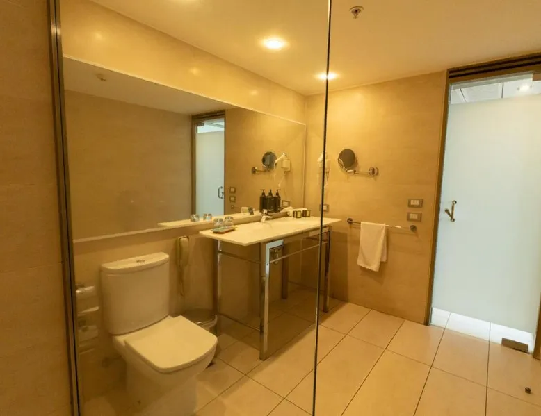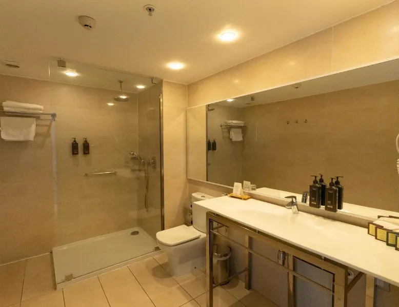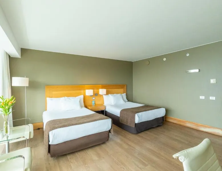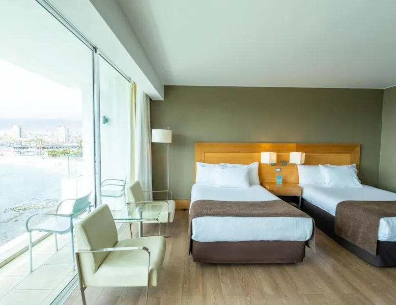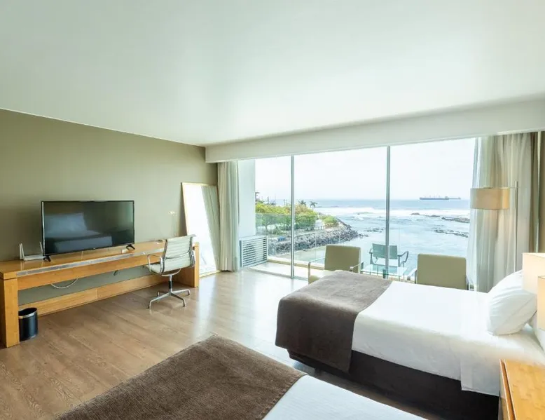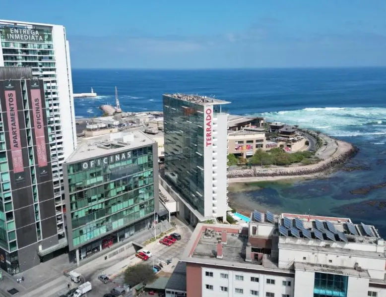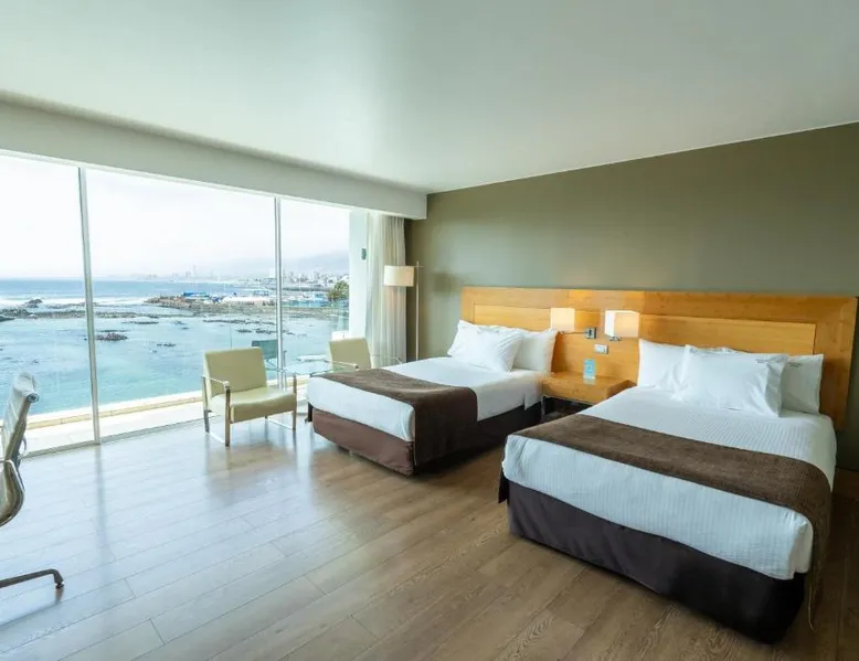 Terrado Suites Antofagasta offers a luxurious seaside experience, featuring a pool, spa area, sauna, and wellness treatments. Located just 328 feet from Mall Plaza, it provides comfort and a prime location in the city. The hotel's rooms include air conditioning, free WiFi, and a private terrace with stunning ocean views. They are also equipped with a mini-bar, cable TV, and a private bathroom with complimentary toiletries. Guests can enjoy delicious local and international dishes at the hotel's “Casa Blanca” restaurant, which offers panoramic sea views. For added convenience, one child under 2 years old can stay free of charge using existing beds. The hotel is 0.6 mi from the local market and 4.3 mi from the Cardenal Carlos Oviedo bus terminal. Additional Information: - At check-in, a deposit may be required, which could equal the value of the first night, to cover possible additional expenses. This suite's standout feature is the pool with a view. The air-conditioned suite features 1 bedroom and 1 bathroom with a shower and a hairdryer. Featuring a terrace with sea views, this suite also offers a mini-bar and a flat-screen TV with cable channels. The unit offers 2 beds.