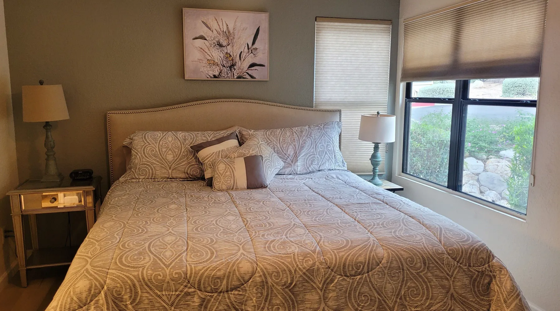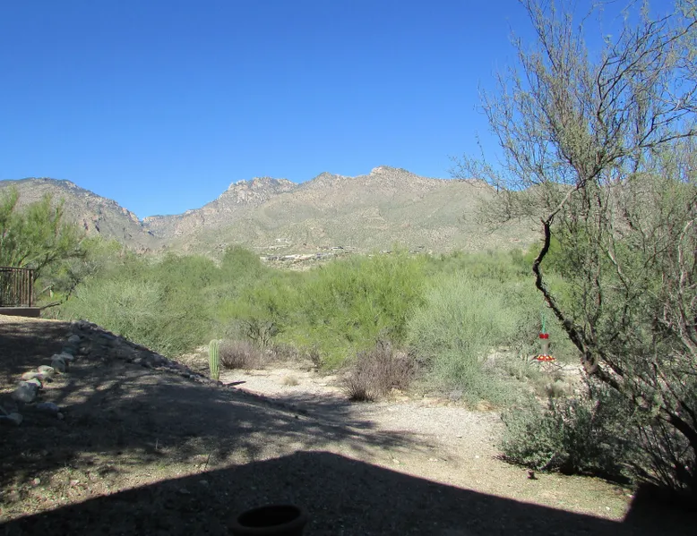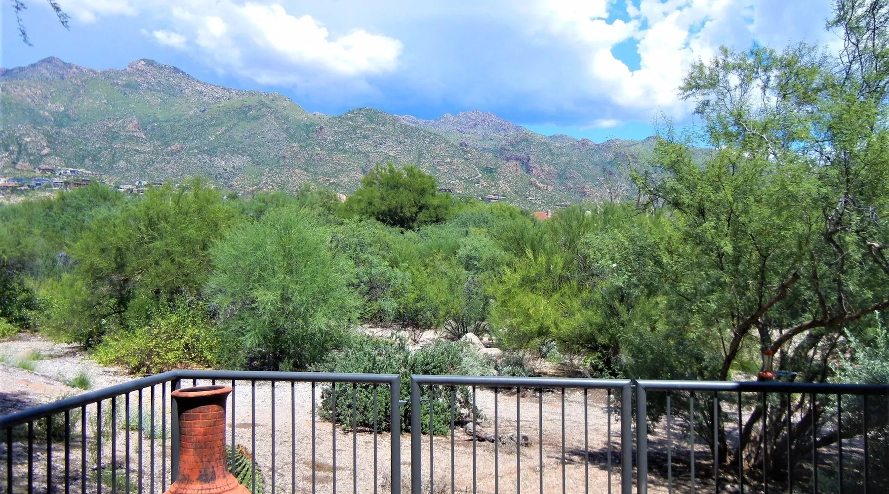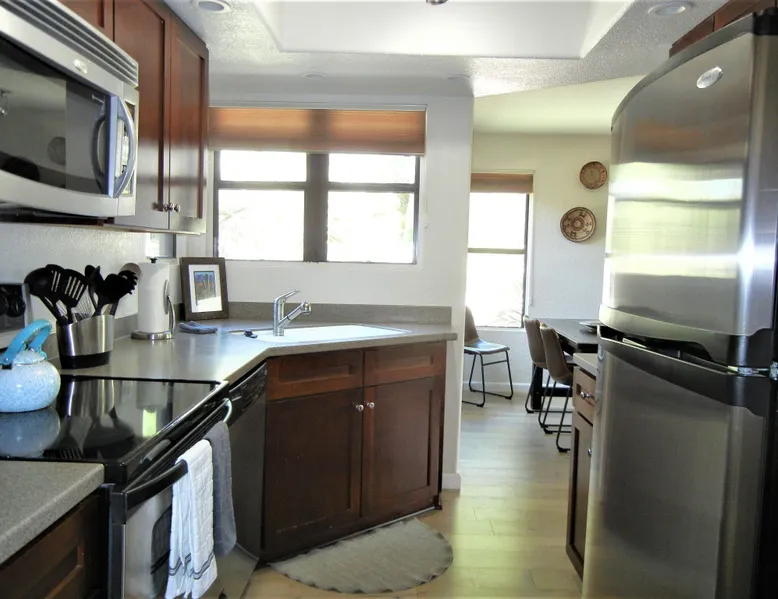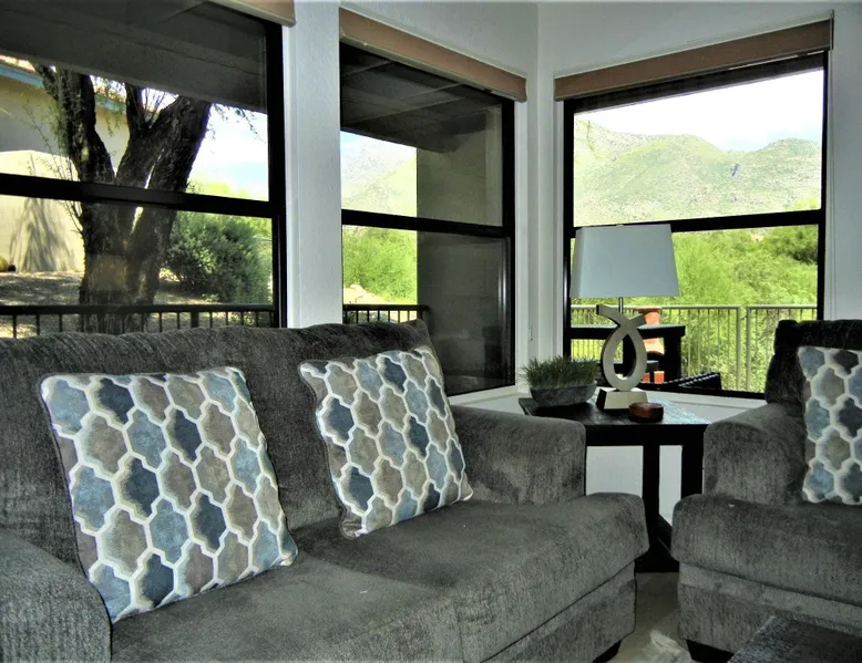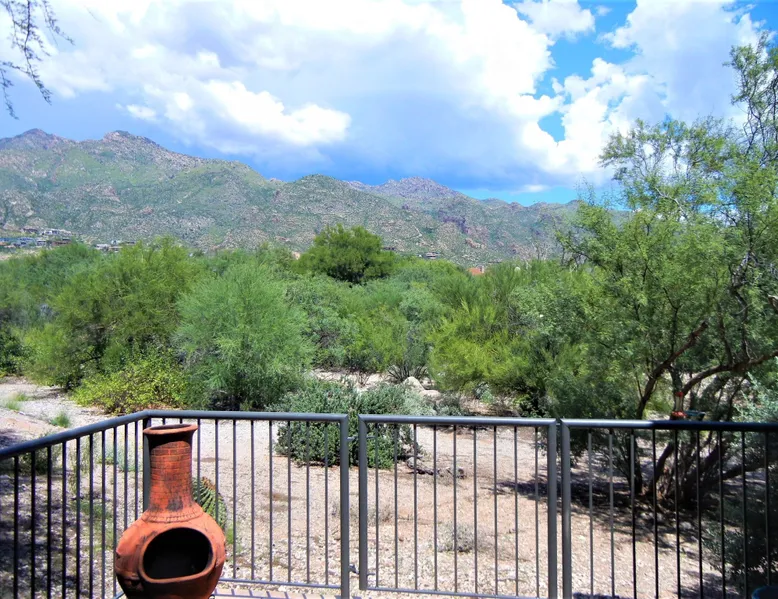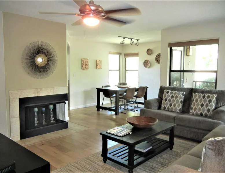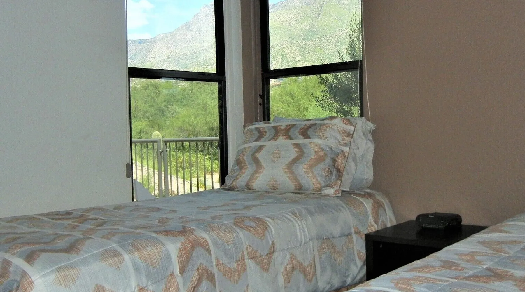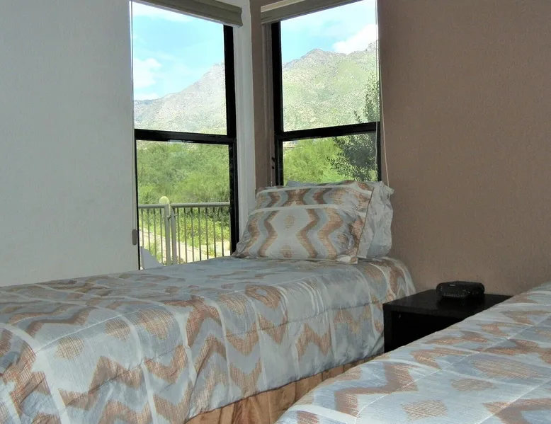 3 Bedroom Gem - First floor, Corner with Mountain Views and extended Patio. All new wood flooring just added and new paint! Condo is equipped to sleep and accommodate up to 6 people including dining table. Split floor plan highlights king bed in the master with walk in shower and closet and the second and third bedroom sharing a bathroom with shower tub. Second bedroom has 2 single beds with kit to convert to a king and mountain views from the windows. Third bedrooms has a queen bed and desk Kitchen is fully equipped with stainless steel appliances. Front patio offers a relaxing sitting area with the back patio highlighting a table with chairs for dining, and relaxing couch and chairs to enjoy the majestic mountain views!!! This is Tucson at it's best!