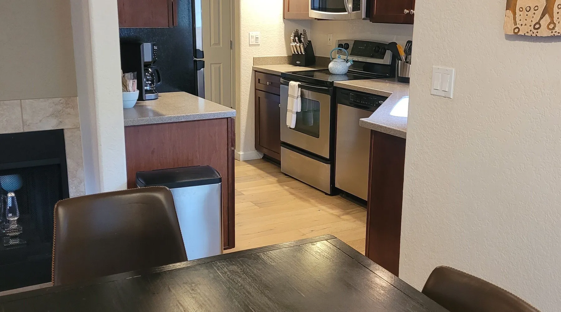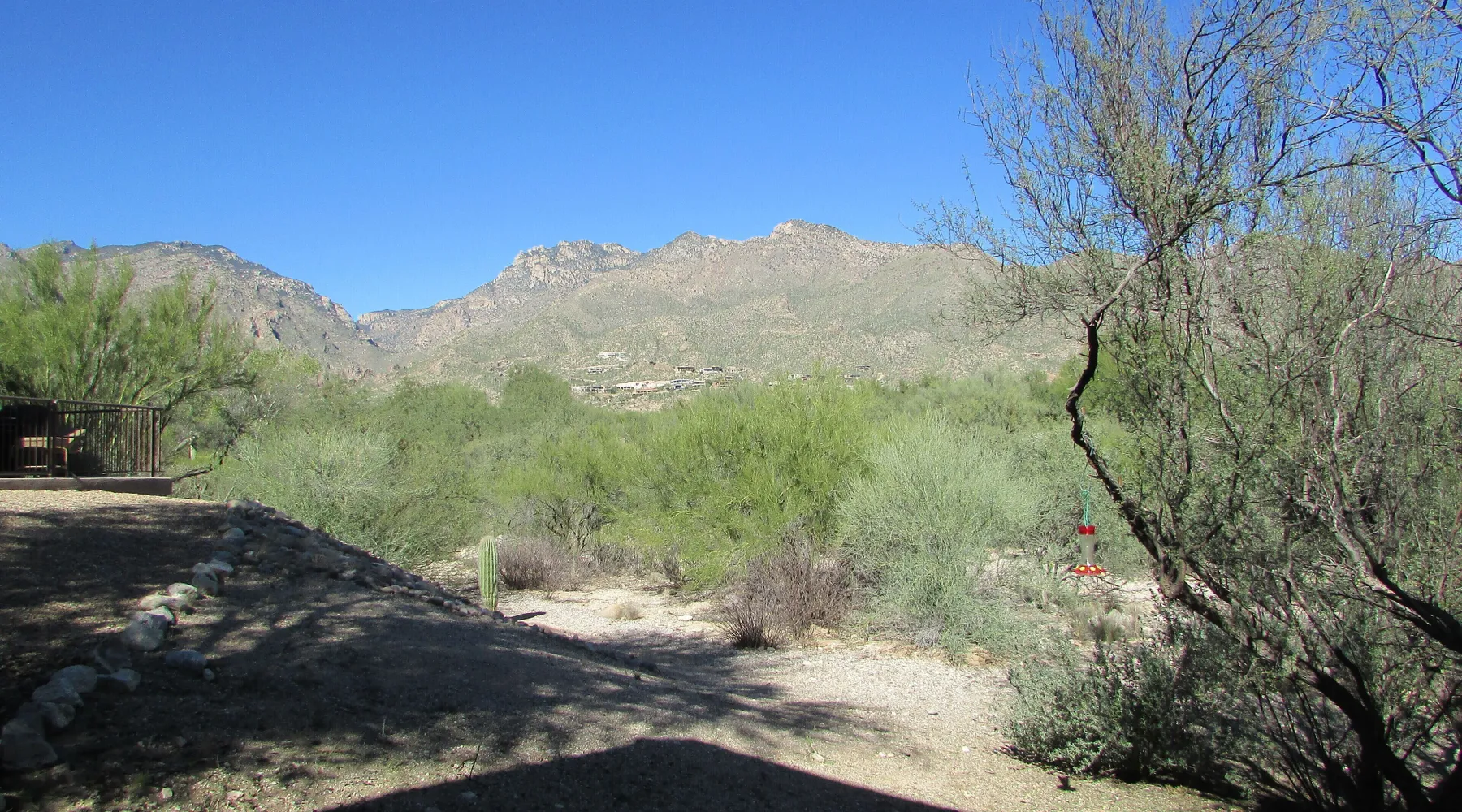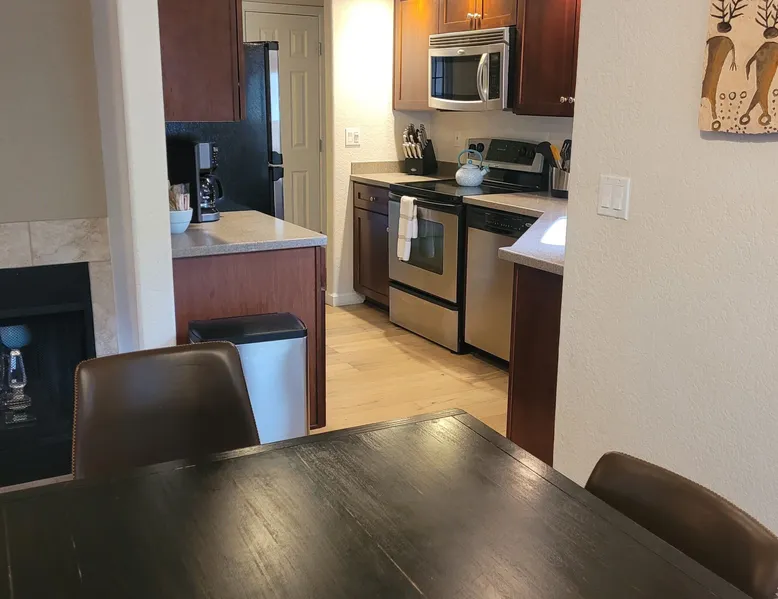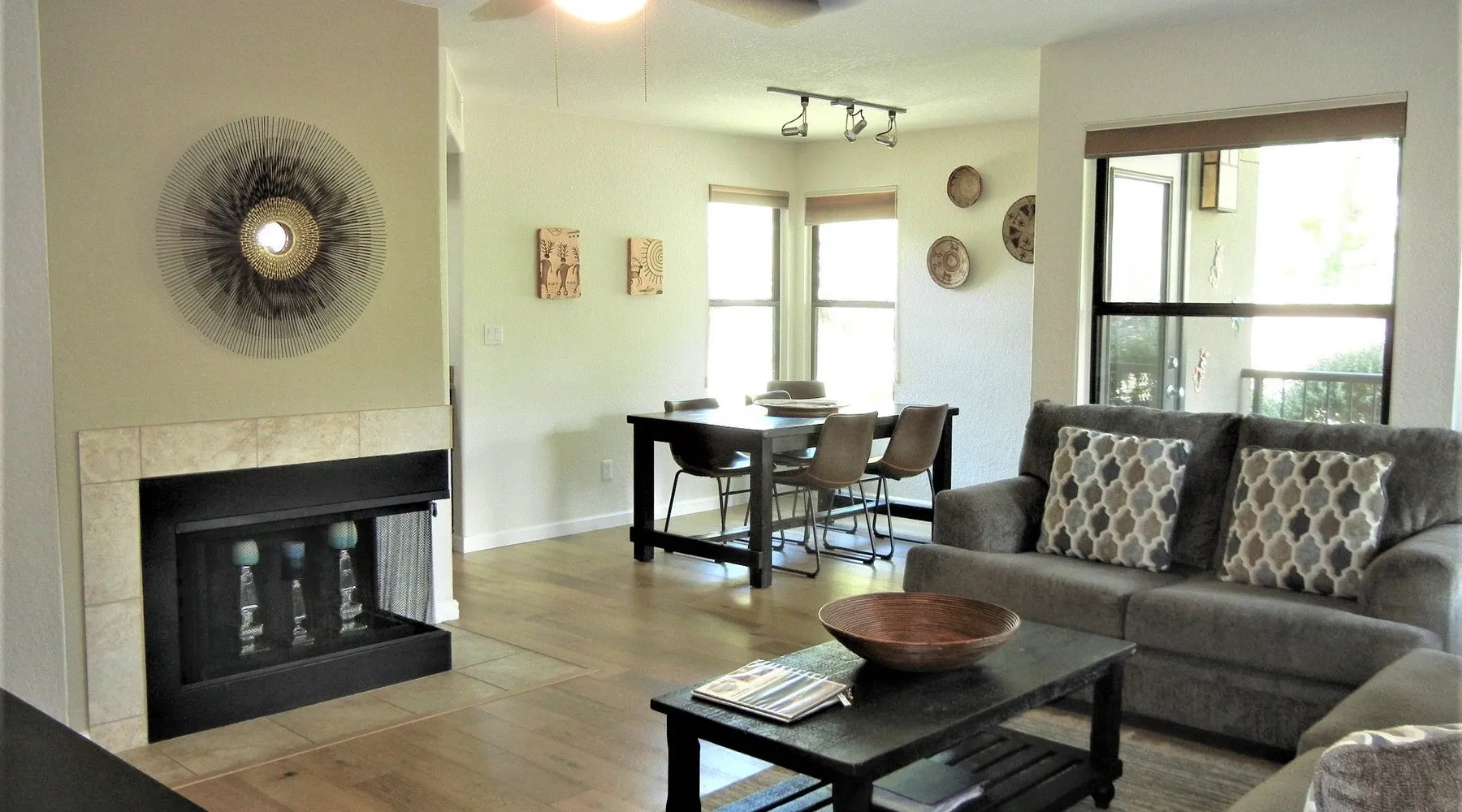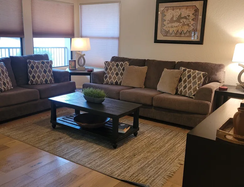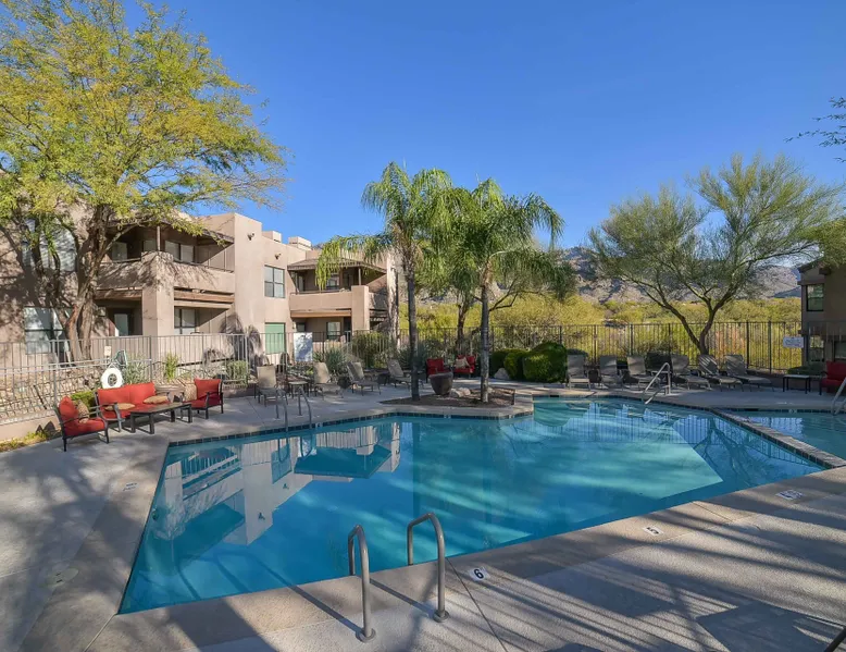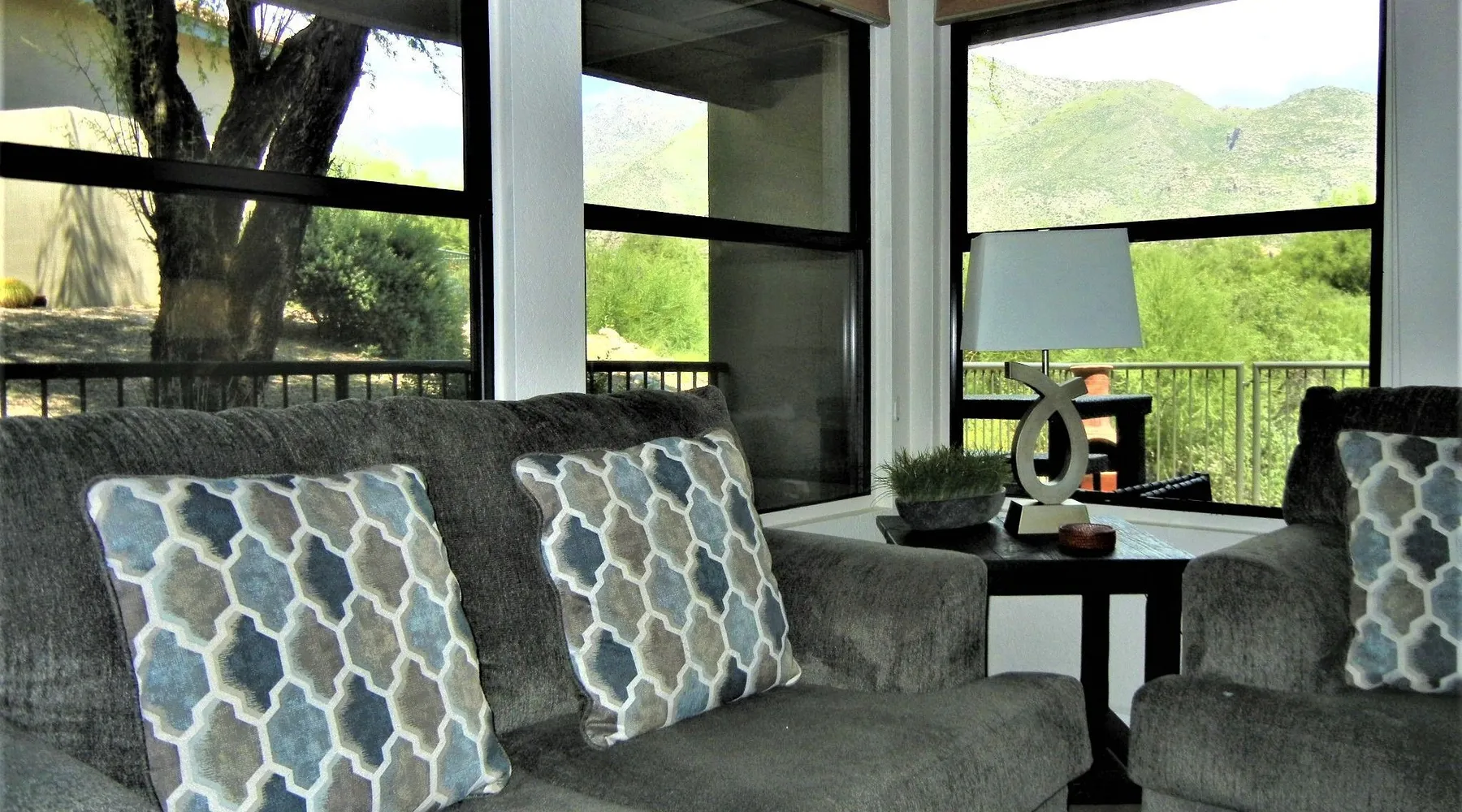 3 Bedroom Gem - First floor, Corner with Mountain Views and extended Patio. All new wood flooring just added and new paint! Condo is equipped to sleep and accommodate up to 6 people including dining table. Split floor plan highlights king bed in the master with walk in shower and closet and the second and third bedroom sharing a bathroom with shower tub. Second bedroom has 2 single beds with kit to convert to a king and mountain views from the windows. Third bedrooms has a queen bed and desk Kitchen is fully equipped with stainless steel appliances. Front patio offers a relaxing sitting area with the back patio highlighting a table with chairs for dining, and relaxing couch and chairs to enjoy the majestic mountain views!!! This is Tucson at it's best!