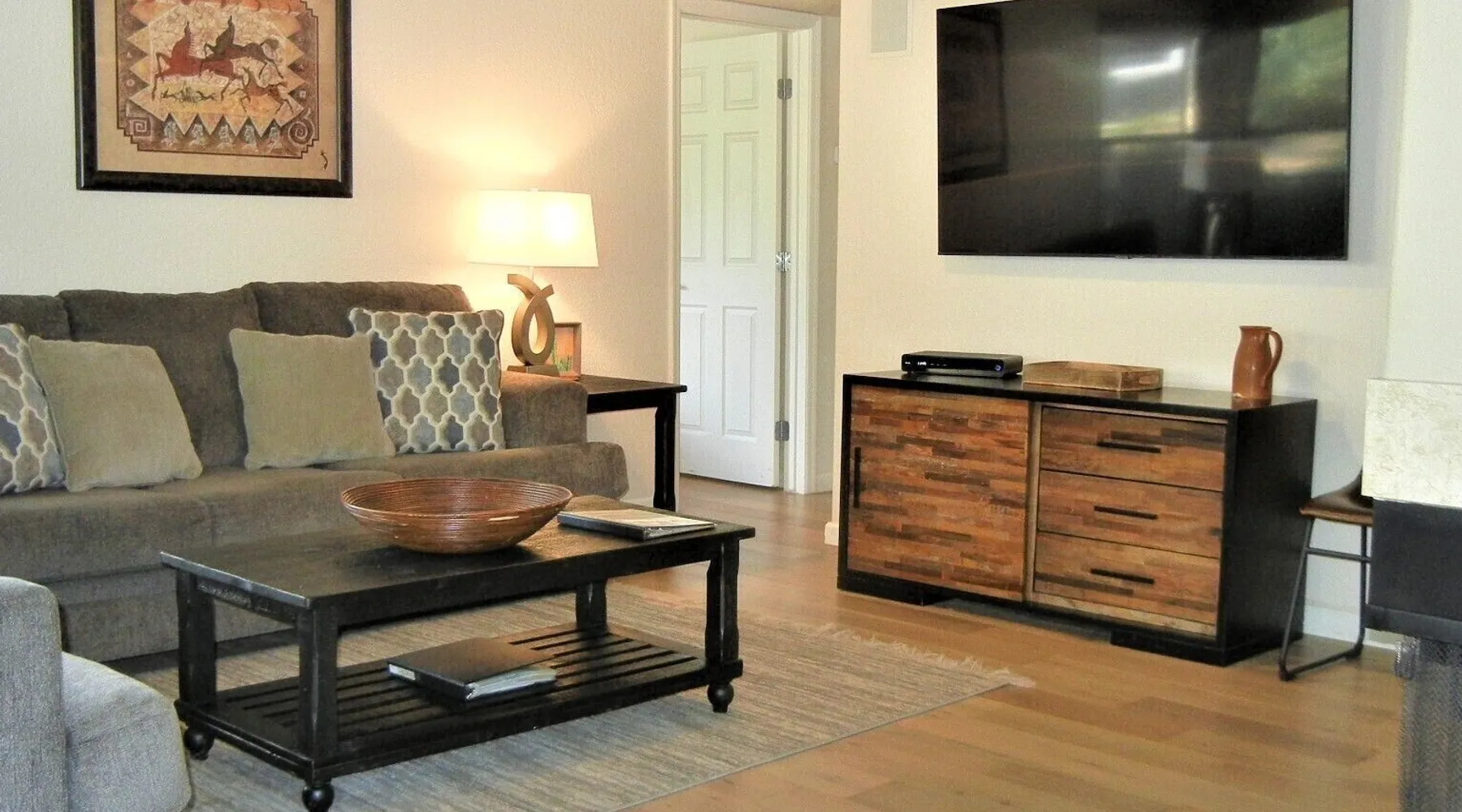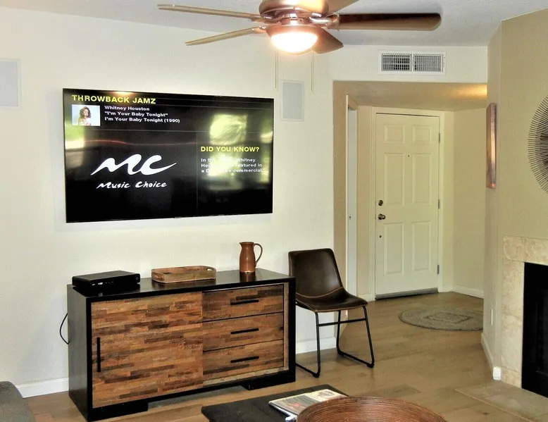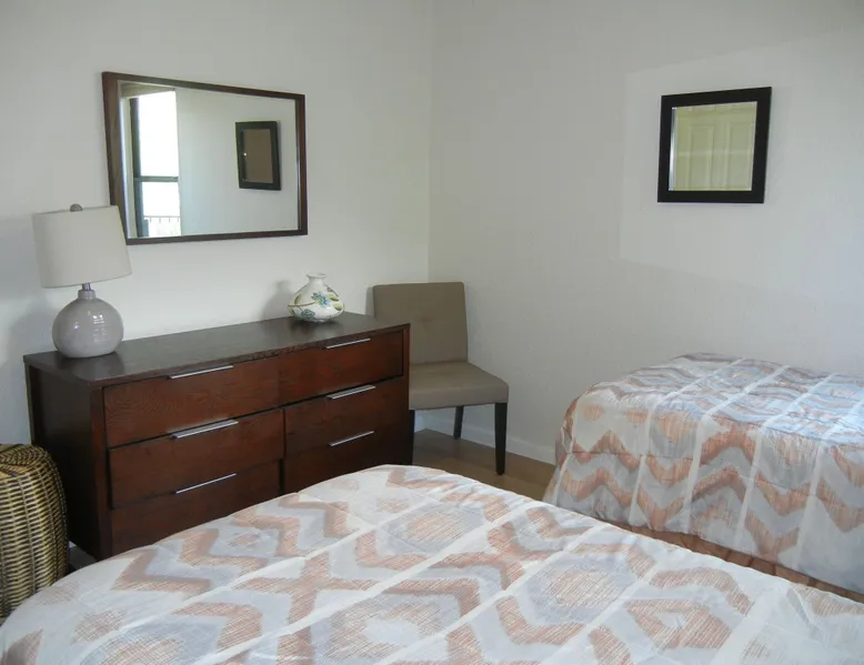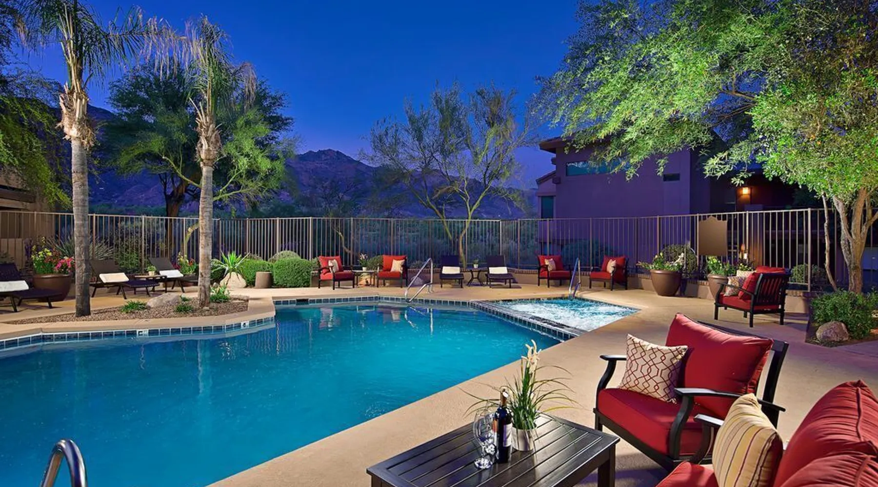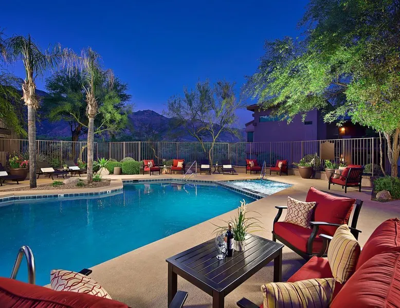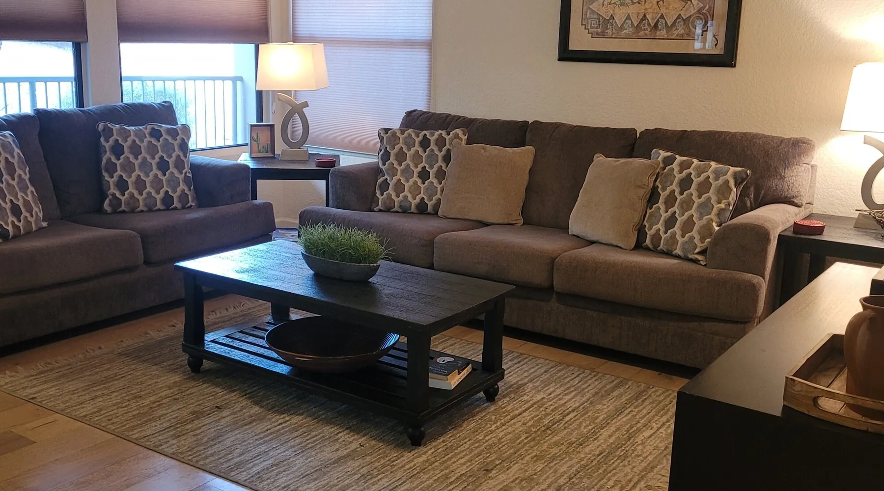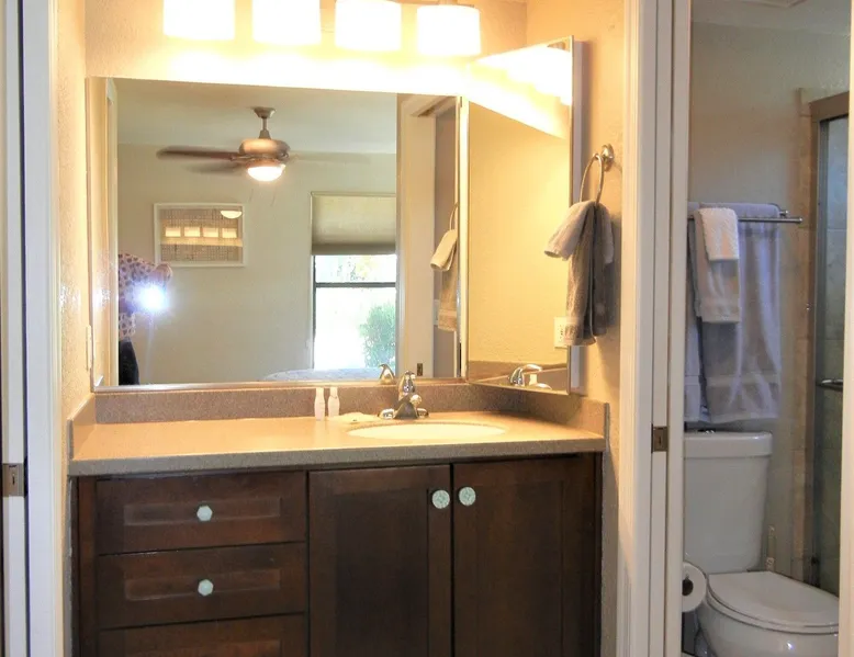 3 Bedroom Gem - First floor, Corner with Mountain Views and extended Patio. All new wood flooring just added and new paint! Condo is equipped to sleep and accommodate up to 6 people including dining table. Split floor plan highlights king bed in the master with walk in shower and closet and the second and third bedroom sharing a bathroom with shower tub. Second bedroom has 2 single beds with kit to convert to a king and mountain views from the windows. Third bedrooms has a queen bed and desk Kitchen is fully equipped with stainless steel appliances. Front patio offers a relaxing sitting area with the back patio highlighting a table with chairs for dining, and relaxing couch and chairs to enjoy the majestic mountain views!!! This is Tucson at it's best!