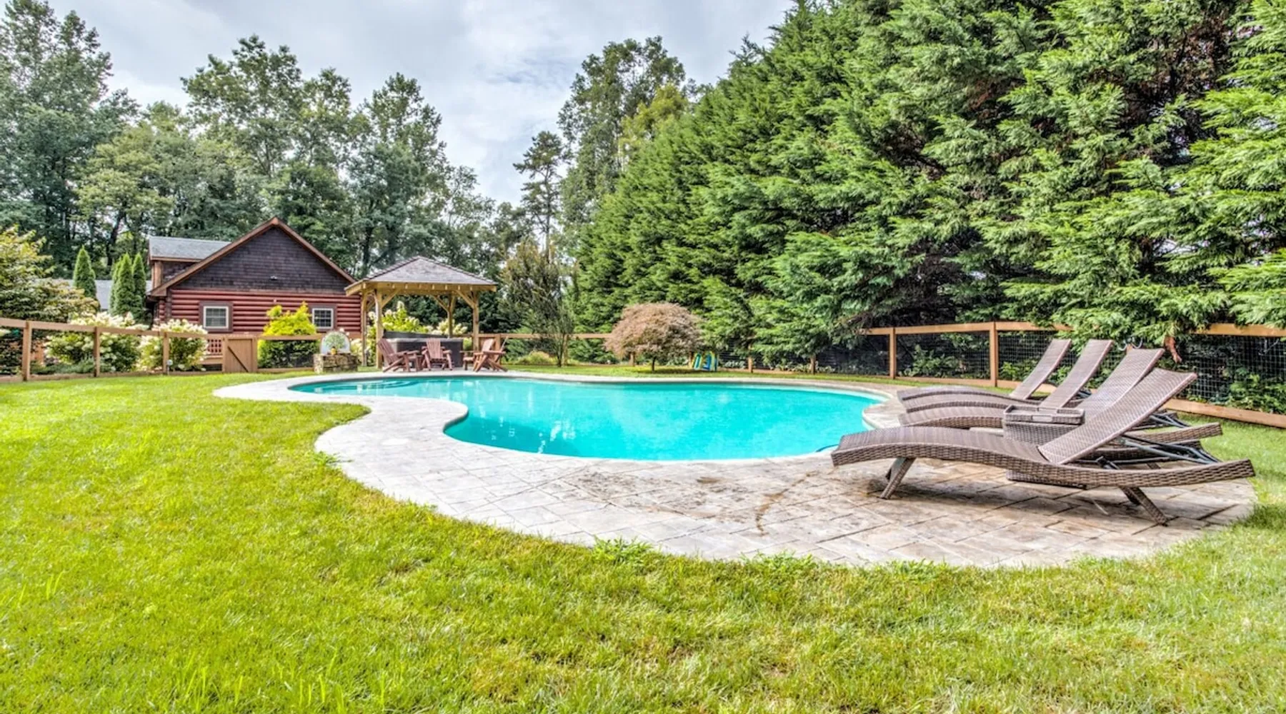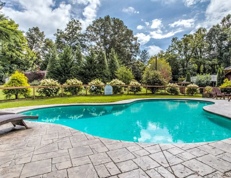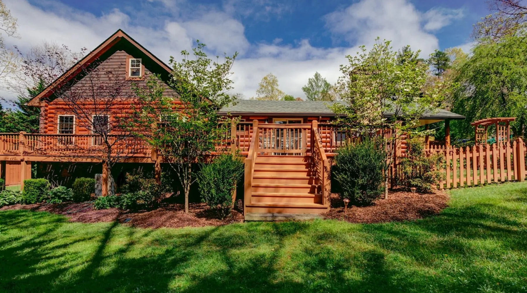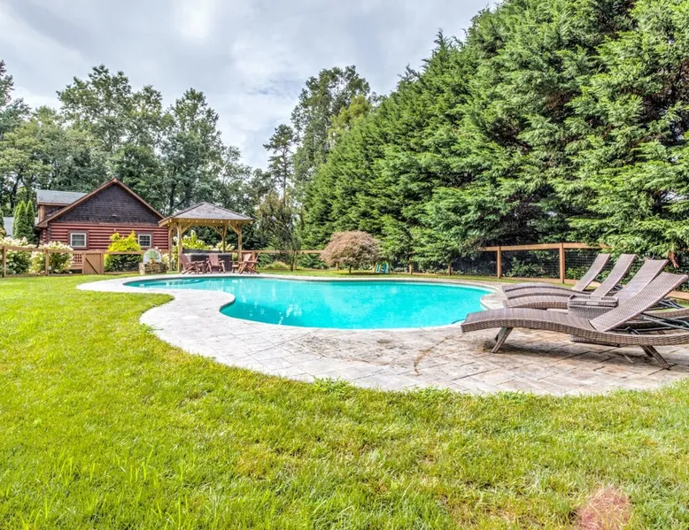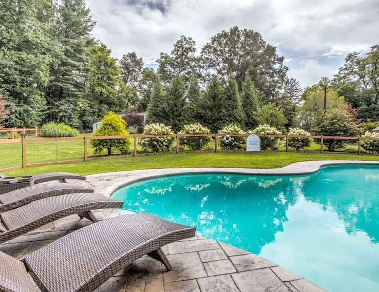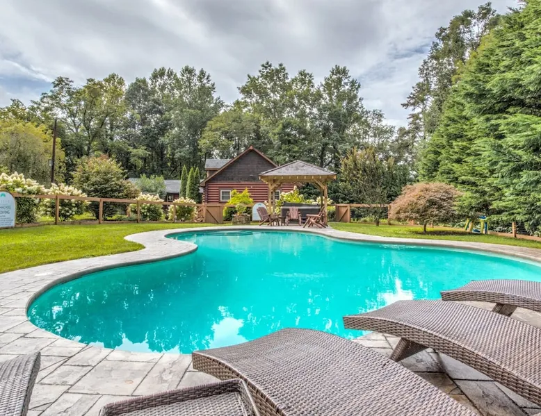 The ultimate Asheville vacation destination, located in the cradle of the Blue Ridge Mountains. Welcome to Mountain Laurel Oasis! The space A mindfully curated log home retreat, majestically nestled in the mountains of WNC outside Asheville, Brevard and Hendersonville. This one-of-a-kind secluded log home boasts a private swimming pool, garage game room and firepit for year-round enjoyment for all ages, and plenty of indoor and outdoor space to accommodate groups. The entire property has been meticulously landscaped and maintained and setup for your pleasure and enjoyment. Come create relaxing, blissful and amazing memories at Mountain Laurel Oasis. Location: Private estate home located south of Asheville near Biltmore Park, 20 minutes south of downtown Asheville, 5 minutes to Asheville Regional airport, 5 minutes to Biltmore Park, 18 minutes to the gates of Biltmore Estate. And 20 minutes to downtown Brevard or Hendersonville. It is easy to access the home, via only paved roads, with no windy mountain roads. The home affords year round access to any and all vehicles, with plenty of onsite parking for the entire group. Accommodations: 3 Bedrooms, Bunkroom, 4 Full Baths Occupancy Summary / Sleeps in beds: 13 - Max. Occupancy: 15 (PLEASE NOTE: We provide linens for all beds; other occupancy will require guests providing their own linens.) What You Can Expect: Come enjoy the Mountain Laurel Oasis experience. Swimming pool, firepit, garage game room, and more...Wow! When you pull into the driveway, you will enter a secluded, tree-lined oasis. A short walk down the plant-lined stone walkway to the front porch boasting pine log columns, you will enter the front door into the main room of this 2,700+ sq ft modern log farmhouse. There you will be greeted by vaulted wood and beam ceilings, hardwood plank floors, comfortable living and dining spaces, a spacious, fully-equipped kitchen, and a spectacular wood-burning stove seated on a large stone hearth. The main room was originally a small cabin built in the 1930s, and its timeless charm shines through to today. From the main room, you can step out onto the large wrap-around deck and enjoy outdoor dining or cocktails or a tranquil morning coffee. From this part of the deck, you can also enjoy a mountain top view, especially in the winter months. Continue on through the main room into the modern-day portion of the home, where you will find a large hallway bathroom featuring a granite double vanity and a large tile and glass shower. Located near the hallway bathroom is a bedroom with a luxurious king bed and lots of windows to enjoy natural light and views of the outside. This bedroom has a walk-in closet and a 43-inch smart TV in case you find yourself wanting to lounge in privacy or drift off to the sounds of your favorite show. At the far end of the hallway, you will find the cavernous master suite with its heavily beamed ceiling and 2 queen beds. This room includes comfortable seating areas, a 55-inch smart TV and a large walk-in closet. This bedroom also features 2 full ensuite private bathrooms – one on each side of the master closet. The first full bathroom has a vanity, toilet and soaking tub, and the other full bathroom has a vanity, toilet and large tile and glass shower. This bedroom is ideal for families and is large enough to also accommodate air mattresses or sleeping bags for little guests or a pack and play. From the master suite you can access the wrap-around deck and make your way out to the firepit or the pool. Situated between the two downstairs bedrooms is a private office with a built-in desk, shelves and drawers with a wireless printer. If by some misfortune you require a place to work in peace and quiet during your getaway (hopefully for only a brief time), this is your workplace retreat. Before heading upstairs, you will pass through the nook located at the stairway landing. The nook has a charming wooden built-in single bed adorned with bookshelves. This bed is perfect for the little adventurer in your family or the solo teenager or adult. Here in the nook the kids can also relax apart from the grown-ups and read or play board games or the Xbox on the 43-inch smart TV. From the nook you can access the wrap-around deck outside. Venturing upstairs you will find another spacious bedroom with an ensuite full bathroom and king bed. This large bedroom has a comfortable seating area where you can relax with a book or your tablet, and another 43-inch smart TV for your private viewing pleasure. Across the upstairs landing is the bunk room with 2 single beds, each with a pullout trundle bed. The bunkroom is perfect for the younger members of the family to hang out and “bunk up” for memorable times together. When you’re ready to venture outside the home and explore the property, fun and adventure awaits! Enjoy splashing or soaking in the heated in-ground swimming pool or just lounge around and enjoy the sun and the calm mountain breezes. Hangout by the firepit and enjoy the crackling fire and make s’mores with the family. Head over to the garage game room and enjoy hours of fun playing ping pong, foosball, pop-a-shot basketball or electronic darts. Visit the enclosed raised-bed garden and snip some fresh herbs to enjoy with your dinner. Or amble on over to the hammock and relax with a book or simply nod off to the sounds of the outdoors. This stunning property essentially has it all. Aptly named as a true oasis of relaxation, Mountain Laurel Oasis is a true luxury getaway designed to provide memorable vacations for all ages and groups. Mountain Laurel Oasis was built as a second/vacation home, and has been entertaining travelers for years and has very quickly become one of the most popular homes in our luxury portfolio. It is not surprising when you put a terrific estate property and log home together with a simply spectacular property, outdoor spaces, swimming pool and other amenities. While the log home is only a 3-bedroom