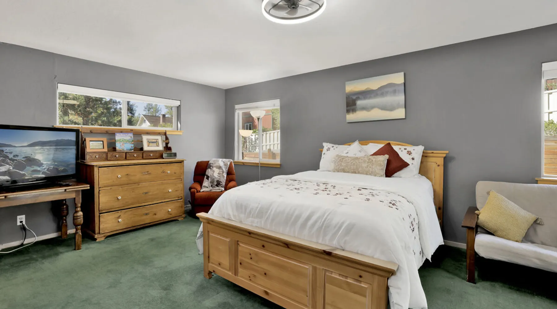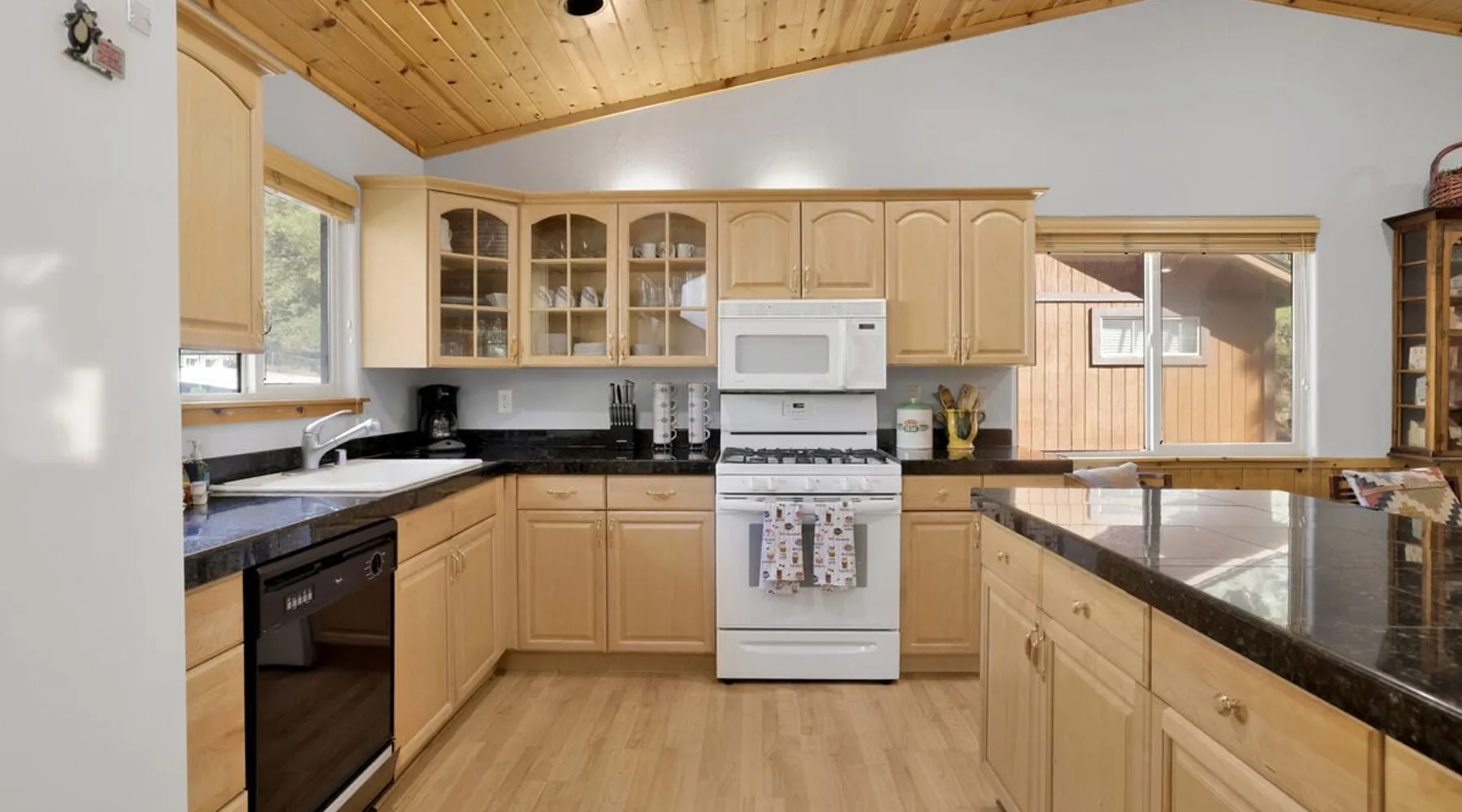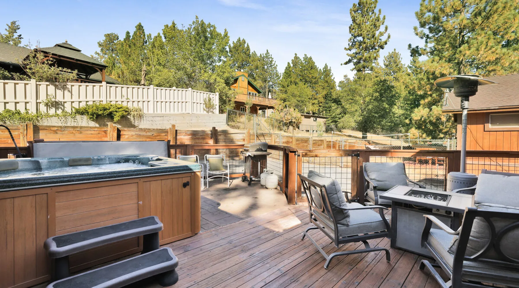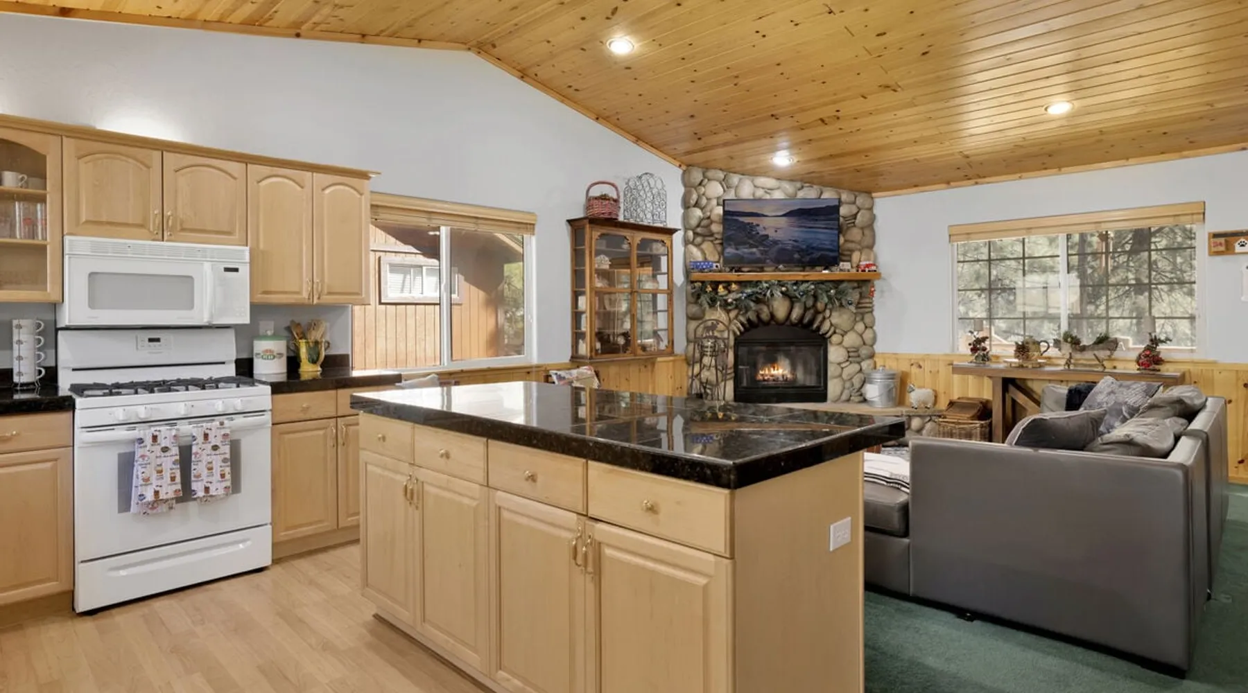 Come experience River Rock Lodge! This gorgeous log style single level chalet has everything you need for a memorable Big Bear vacation, located less than a mile to the downtown Village for shopping, dining, or lake activities you will love this prime central location no matter the season! Take a short stroll to the lake or Village shops or you can hop in the car and you are under ten minutes to the ski resorts or grocery stores- you truly can't beat this amazing location! The space River Rock Log Cabin Retreat w/ Hot Tub | Village Come experience River Rock Lodge! This gorgeous log style single level chalet has everything you need for a memorable Big Bear vacation, located less than a mile to the downtown Village for shopping, dining, or lake activities you will love this prime central location no matter the season! Take a short stroll to the lake or Village shops or you can hop in the car and you are under ten minutes to the ski resorts or grocery stores- you truly can't beat this amazing location! Entering the cabin you are greeted with knotty pine ceilings and an open floor plan, with comfy couch furnishings, a toasty wood burning fireplace, and complimentary hi speed WIFI and Cable are available on the mounted flat screen TV so you can snuggle up and watch the snow falling as you enjoy a movie together as you warm your toes in front of the fire. The spacious kitchen offers wood floors, marble counters, and plenty of cookware and utensils including general appliances and a dishwasher for preparing your home cooked meals. Being a single level you will have convenient access to your three spacious bedrooms and both bathrooms, all are made up with warm linens, blankets, pillows, and fresh shower towels for your group, plus there is a washer and dryer on hand for those wet snow clothes or long term stays. Boasting double front and back sun decks, with access from the primary suite right to the in deck private spa- you will love relaxing here in the evenings. Outdoor patio furnishings and a propane BBQ are an added convenience so you can grill up that freshly caught fish from the lake out back. Your group will love River Rock Lodge, pairing the necessities from home with a prime central Village location, don't wait, book today! Sleeping Arrangements: Bedroom 1- Queen Bed, TV/Cable, Walk-In Closet, Private Bath, Deck Access Bedroom 2: Two Twin Beds Bedroom 3: Queen Bed Living Room: Full Sleeper Sofa Bathroom Arrangements: Private Full Bath- Bedroom 1 Hallway Full Bath -Sleeps 8 -3 Cars Driveway Parking -2 Pets Welcome w/ Additional Fee -1,506 Total Square Feet City Permit #: VRR-2024-1521 Registration Details 2024-1521