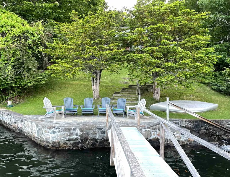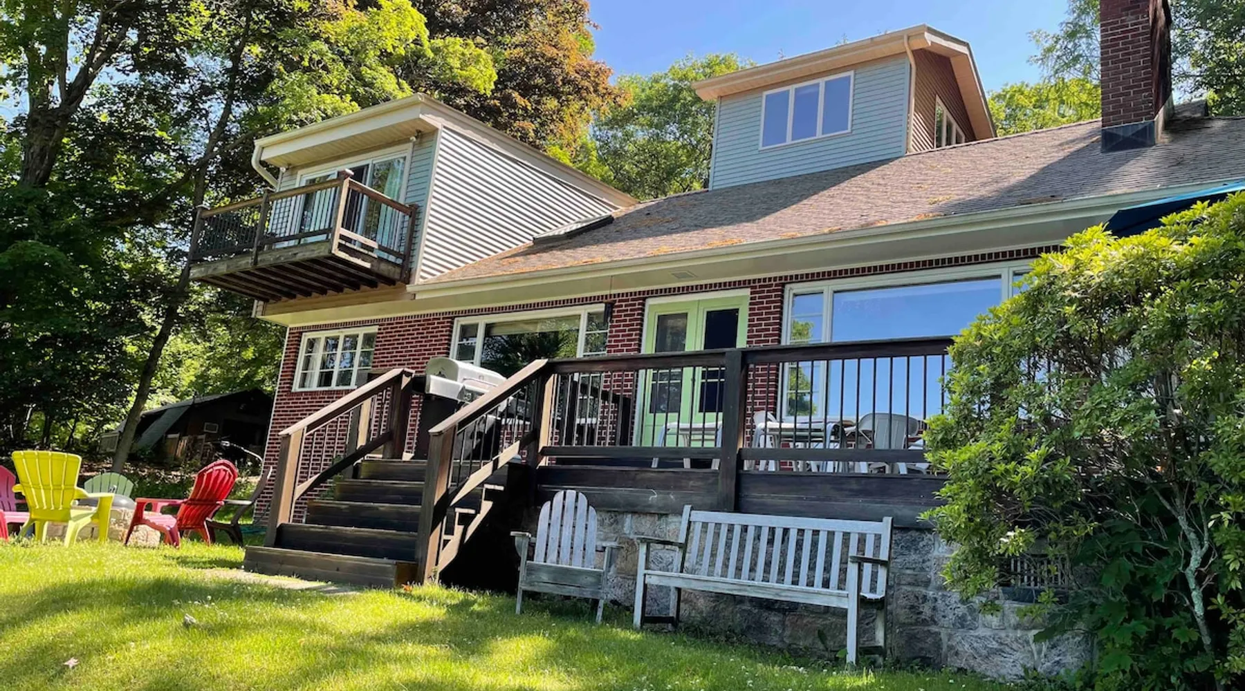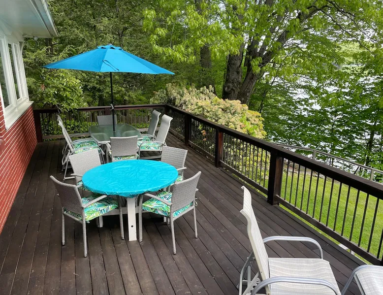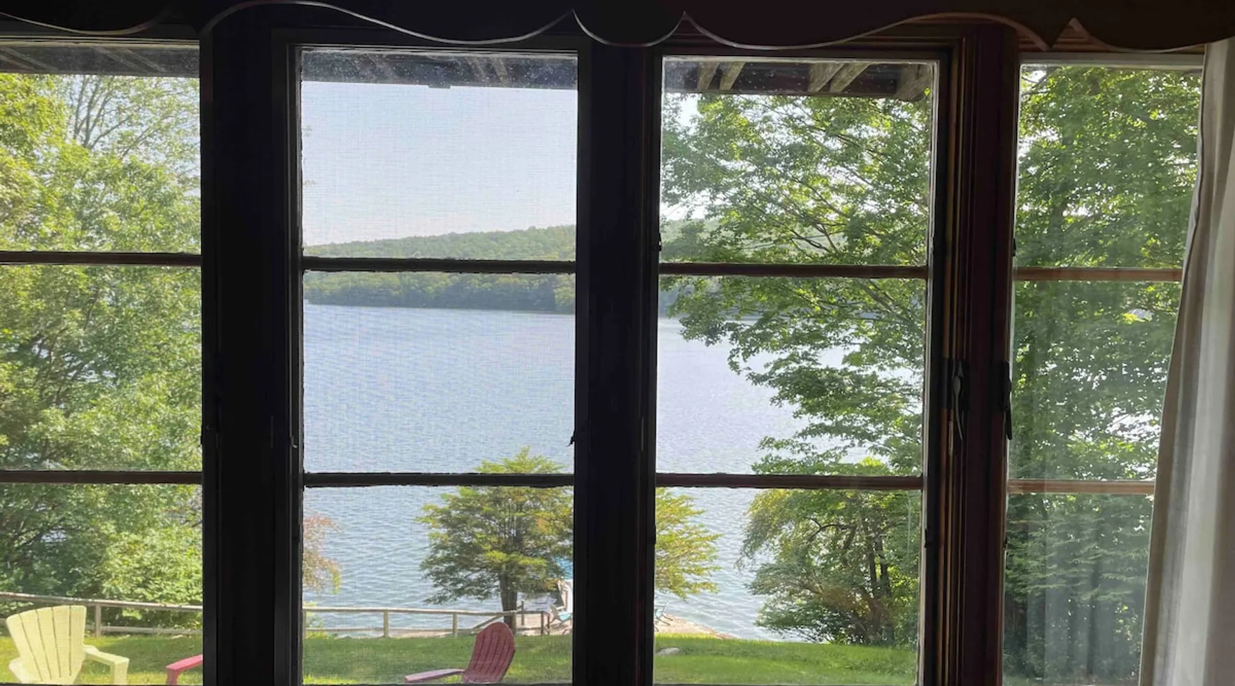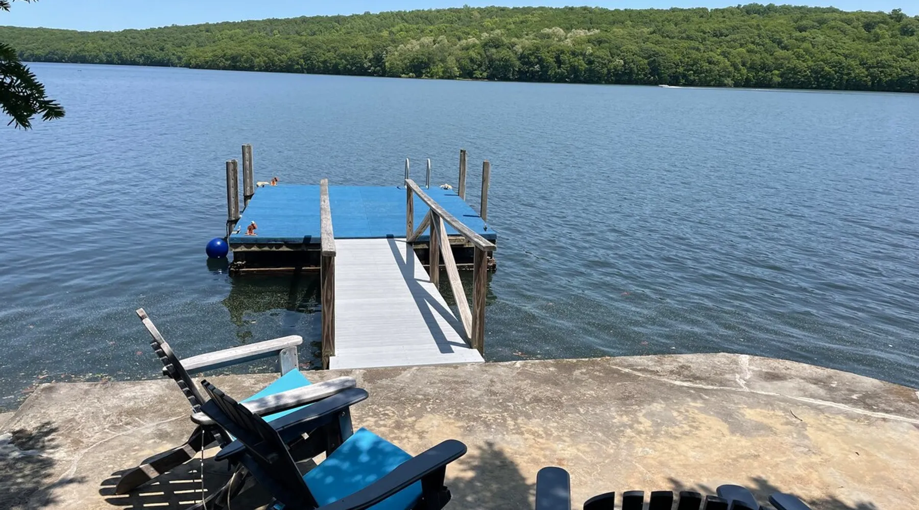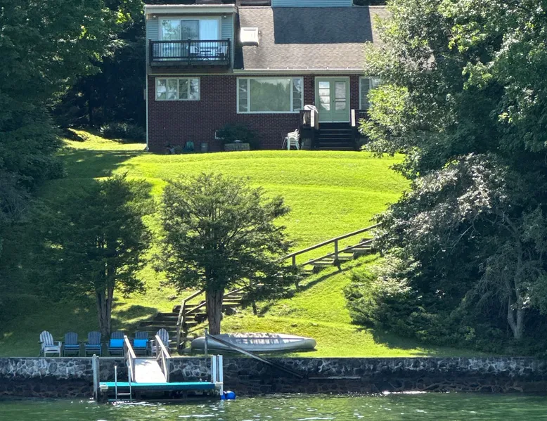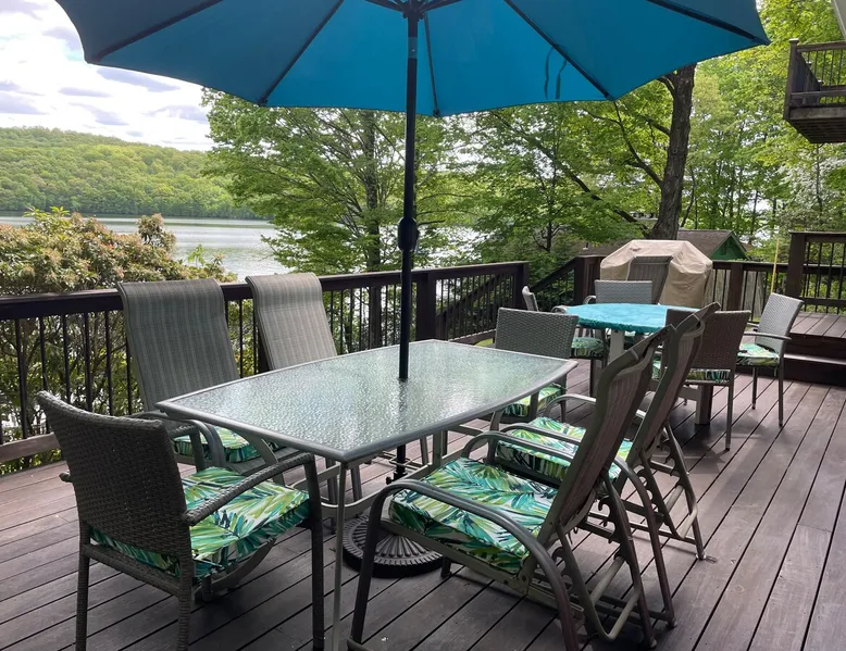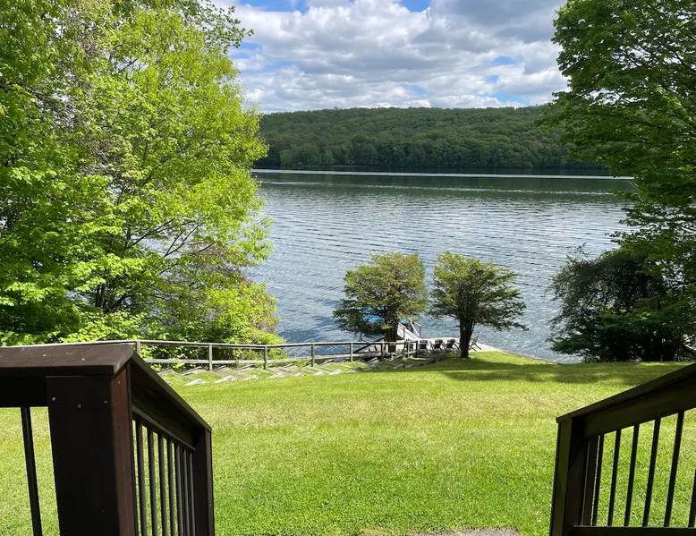 2025 Sept-Dec dates avail. 2026 July-August 7 nite min. Sat to Sat. Other times 4 nite min. . Unique 3100 sq ft. 5 bedroom 4 bath Midcentury Lakehouse w/ stunning secluded property of woods on the back side and wide open lake views on front. 17 five star reviews on other site.Private dock May to Oct. & stone firepit.Crystal water w/stone steps and large stone patio lakeside. 3 decks. Main deck w/ gas grill. Gradual steps into water.Terraced front lawn. Large driveway. 10 mins. to town & The space There are 3 bedrooms on the main level, 2 bedrooms upstairs and a third level lookout room. The main floor has a dramatic cathedral ceiling with large wood beams and track lighting. The second floor features a massive master bedroom suite with private balcony. This home is truly a unique and special place. The house is located 10 minutes from New Fairfield Center or Sherman on a private one acre plus lot. Ours is one of the only roads on the lake where there are no houses on the opposite shore making it very quiet at night. The water at our location is crystal clear. The large stone patio area at the water's edge with a private dock and stone staircase makes getting into the water easy. The water is very deep so good for diving off the dock. The carpeted dock is large. The main floor deck is huge with a large gas grill with two tables and seating for 10 or more. The second floor balcony off the master living room has a table and two chairs. The third deck is on the upper level with a chair. Main Level - The entry level has floor to ceiling picture windows with incredible views of the lake. The living room is wood paneled and beamed with a cathedral ceiling creating an open and spacious feel. There are two huge windows overlooking the main very large deck and the lake beyond. There is a Smart TV with Spectrum internet TV service and a Roku with many streaming apps. There is a stereo system with radio, CD and Aux cord. The kitchen dining area has two walls of windows with the same amazing view. Our eat in kitchen is fully equipped with everything you will need to create your favorite meals. The formal dining room has seating for at least 10 people. There is a window AC unit in the kitchen and a new large mini split AC in living room area. The main level has three bedrooms. The front queen bedroom has a view of the lake from two large sets of windows. This room also has a small private half bath and a wall AC unit. The back queen bedroom has two sets of large windows with a wooded view of mature spruce trees and flowering dogwoods and also a side view of the lake. This room has a Smart TV for streaming and window AC unit. The back middle bedroom has a double bed and a desk. Ceiling fan and portable fan. The main level large vintage bathroom features a unique enclosed shower/tub area with custom etched herons on the glass surround. This bathroom is shared by two bedrooms. Second Level -Upstairs is the huge master king bedroom suite with its own full sized living room with TV for streaming and sitting area. Sliding glass doors leading to a private balcony with a table and chairs overlooking the lake. This room is the full width of the house. There is a window AC unit and also central AC in the master bedroom. There is a huge walk-in closet with dressing mirror and plenty of storage. A private entrance from the master leads to the large second level bathroom with double sinks and marble vanity. This bath also has custom etched glass doors in the tub/shower. The back second level bedroom has two twin beds. There is a full wall of windows with a view of the woods behind the house and the driveway area. This room has its own AC window unit. The third level consists of a small Lookout Room accessed via a spiral staircase. This room has large windows on every side and a small sink. A large desk and chair would make a great office area in cool weather. There is also one twin futon mattress and double mattress for a kids camp out. Glass sliding doors lead to a small deck with chairs. This area is not air conditioned. There is a portable fan. Basement level-The huge basement has a full height 8 foot ceiling. There is a Ping Pong /Dart room and laundry room plus another full bath with shower. Stored in a cupboard are some life jackets and flotation noodles for your use but you should bring your own for children. You may also use the knee board and water skis if you rent a boat. Guest access entire house Other things to note No boats longer than 22 feet may be moored at the dock installed from end May to mid October only. No fires anywhere other than in the firepit. No parties or events other than family gatherings