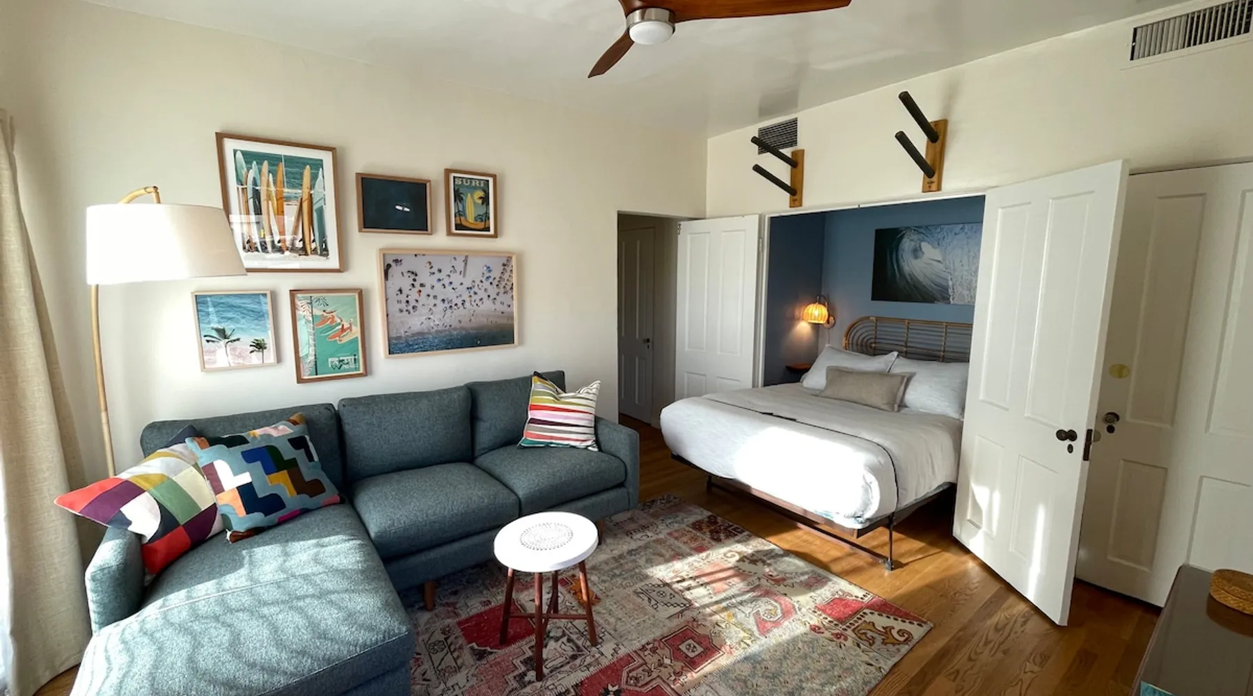 The El Porto studio is located on Highland Ave just two short blocks up from El Porto beach in north Manhattan, one of the best surfing beaches in the South Bay. From the studio, you can walk to the ocean, restaurants, bars, local entertainment and the Strand. It is perfect for couples, solo adventurers, and business travelers. You will love staying here because of the vibrant neighborhood, proximity to the beach and easy access to LAX. Business License #27103826 The space This quaint studio will be your new home away from home. It features a pull down Murphy bed, comfortable sofa, 50" smart TV and original design elements from the 1930s. Two bicycles and two beach chairs are available for use in the garage. Free parking is available 24/7 in the brick alcove directly in front of the studio. The location is very convenient for overnight guests who want to stay at the beach yet need quick access to LAX. Please note that it is located on a busy street, so there is some ambient traffic noise. Also, the bathroom is a tight fit for larger frames, feel free to inquire. A 14% transient occupancy tax is payable to the City and is listed as a separate line item. Guest access You'll have access to the entire studio, no restrictions within the living space. Other things to note Everyone is very friendly and laid-back in North Manhattan Beach. Restaurants and bars are within walking distance. Surf lessons can be arranged with advance notice.