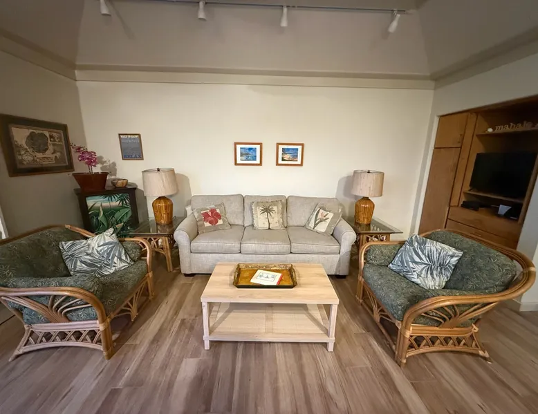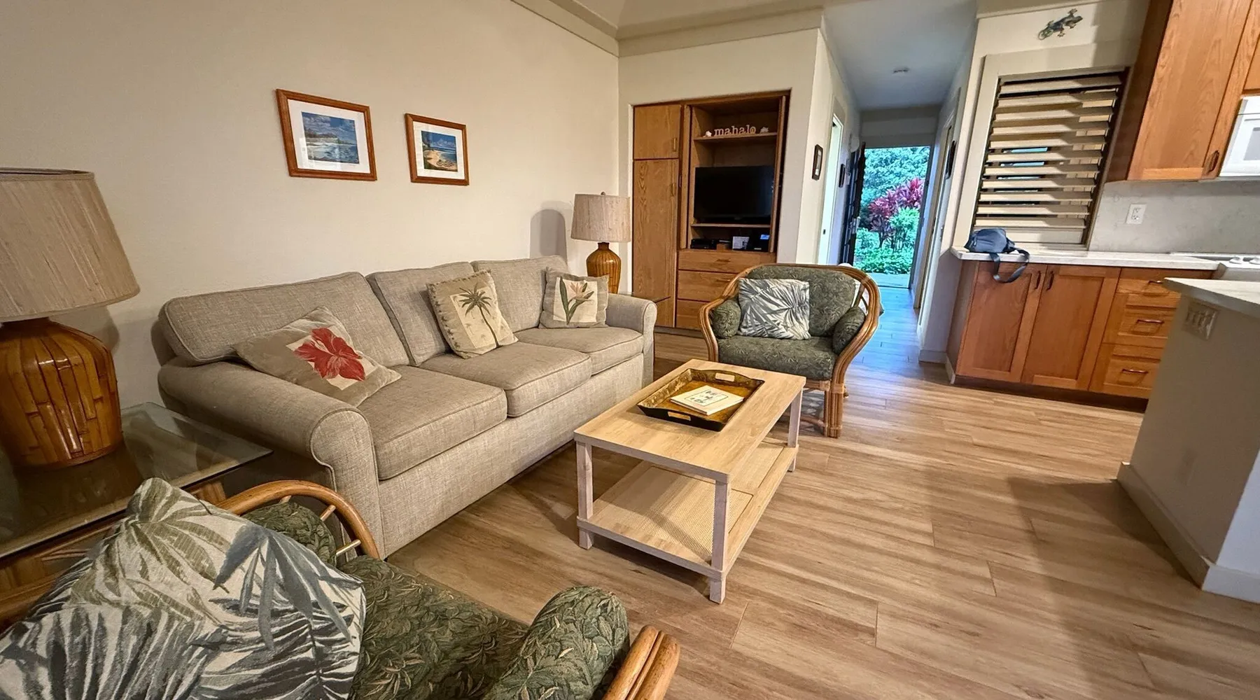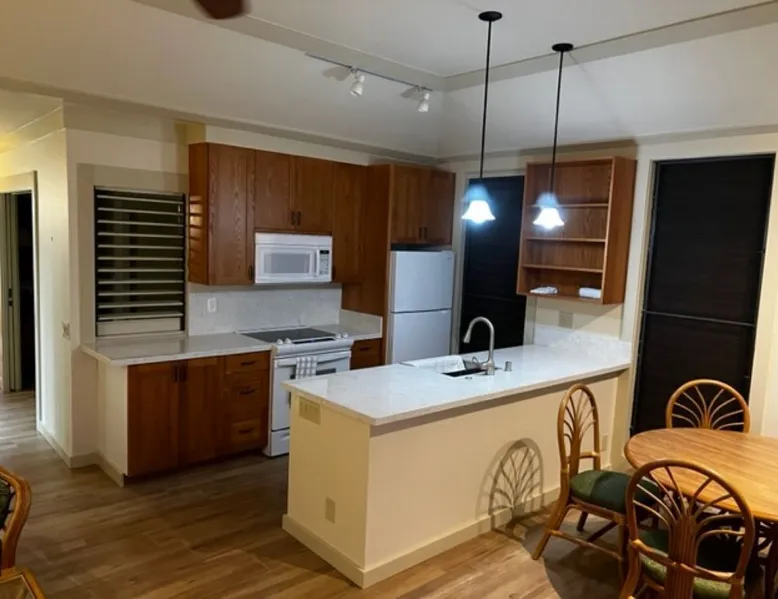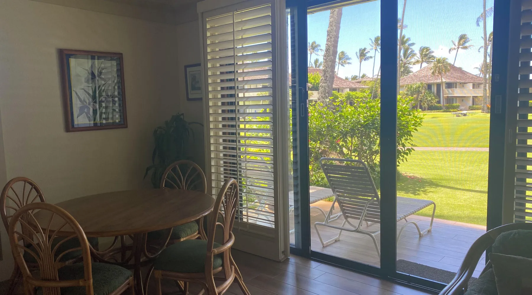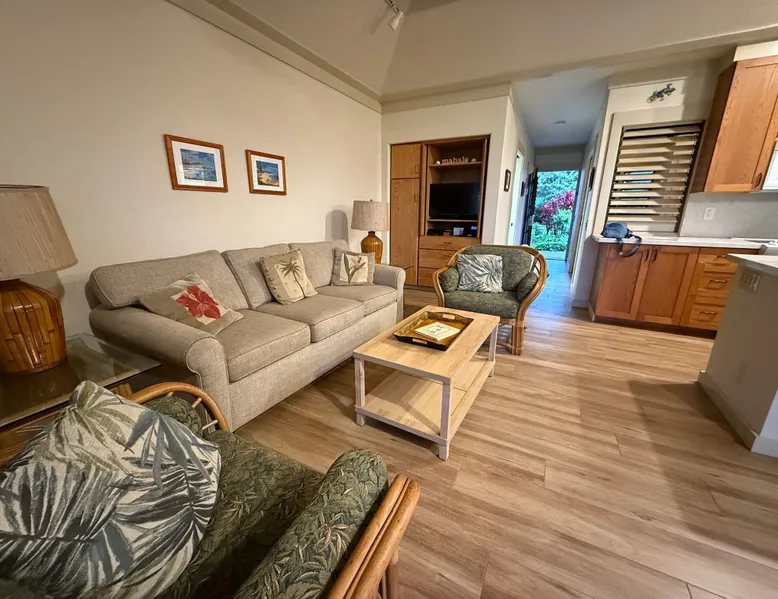 STOP! You can go to our owners' website by clicking below on 'CLICK HERE' under links to more information. Why does our unit create such a high rental following? The reasons we keep hearing from past renters... 1) Just steps from Poipu's best beach (60+/-, but who's counting?). 2) Watch the Hawaiian waves from the kitchen, living room and lanai. 3) A remodeled kitchen (2022) and bathroom/vanity - very comfortably furnished interior. 4) Perfect exposure to the tradewinds which, if desired, can flow through the entire unit. 5) Kid-friendly - on the main green New tile flooring throughout the unit. Kiahuna Plantation features arguably the best beach in Poipu, and our unit is one of only a few in the development to be so close to the sand. Many will have their 'morning sunrise' coffee on the sand and others will enjoy it from the ground level lanai while enjoying the fabulous and relaxing Hawaiian weather. Included in your rental is membership in the Poipu Beach Athletic Club (swimming pool, workout center, tennis, pickleball and shuffle board). Keywords: Condominium