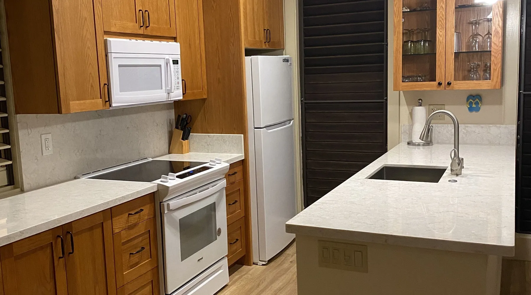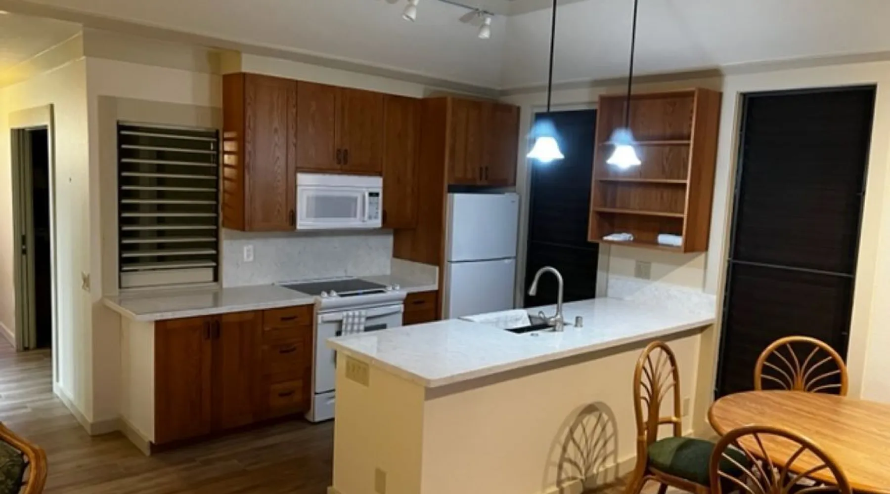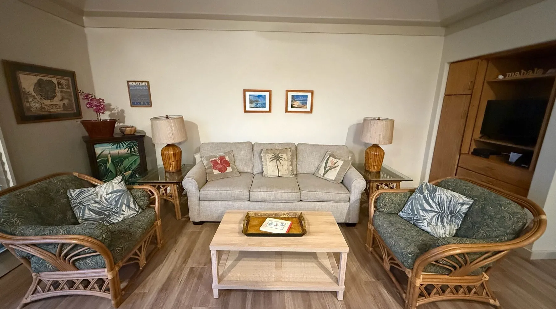 STOP! You can go to our owners' website by clicking below on 'CLICK HERE' under links to more information. Why does our unit create such a high rental following? The reasons we keep hearing from past renters... 1) Just steps from Poipu's best beach (60+/-, but who's counting?). 2) Watch the Hawaiian waves from the kitchen, living room and lanai. 3) A remodeled kitchen (2022) and bathroom/vanity - very comfortably furnished interior. 4) Perfect exposure to the tradewinds which, if desired, can flow through the entire unit. 5) Kid-friendly - on the main green New tile flooring throughout the unit. Kiahuna Plantation features arguably the best beach in Poipu, and our unit is one of only a few in the development to be so close to the sand. Many will have their 'morning sunrise' coffee on the sand and others will enjoy it from the ground level lanai while enjoying the fabulous and relaxing Hawaiian weather. Included in your rental is membership in the Poipu Beach Athletic Club (swimming pool, workout center, tennis, pickleball and shuffle board). Keywords: Condominium