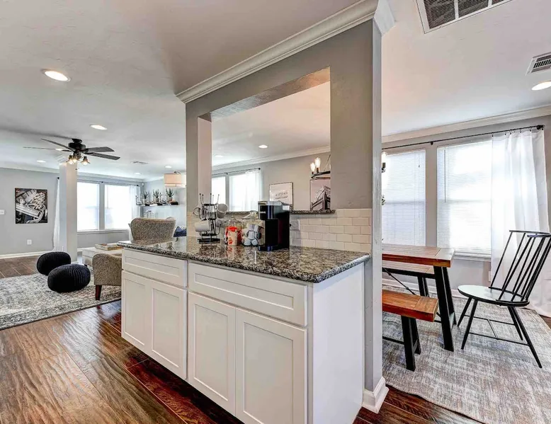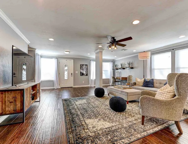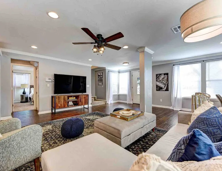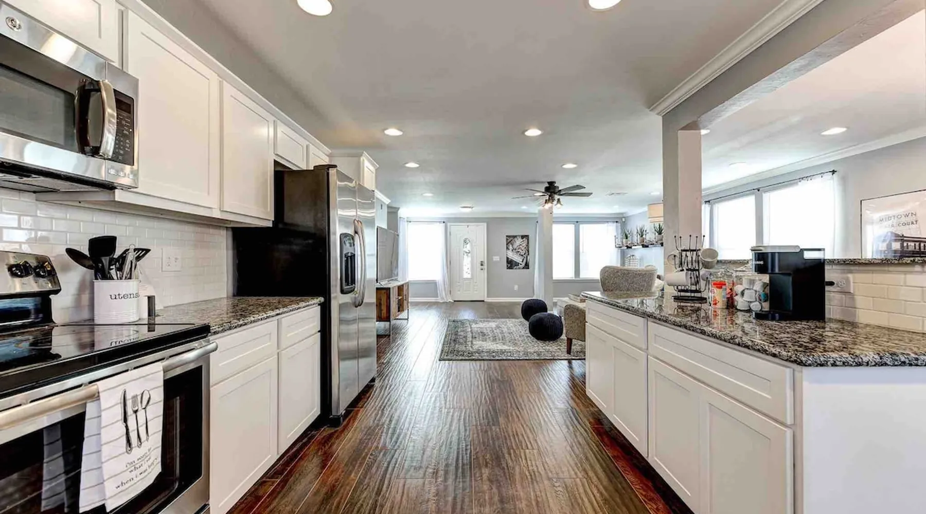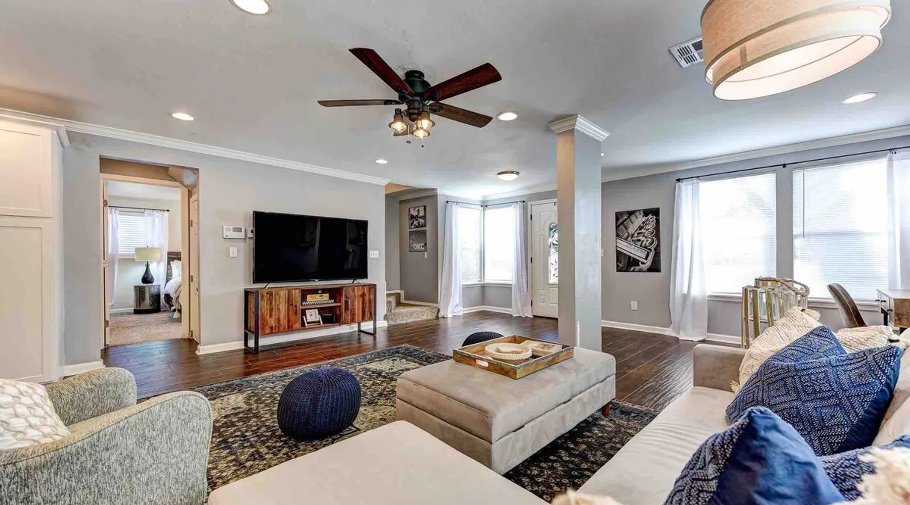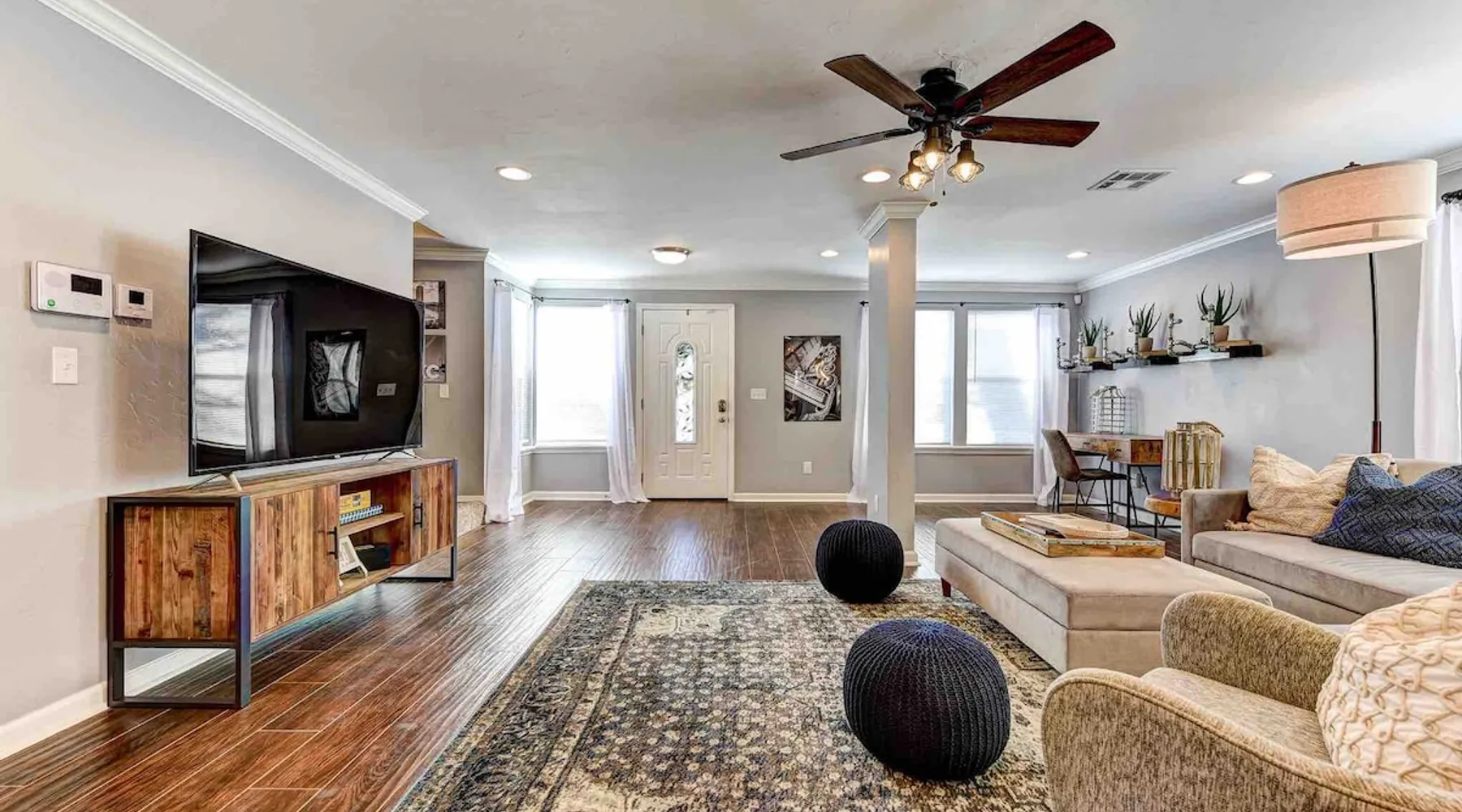 This 1858 sq ft home was built in 1930 & Fully Renovated in 2015 in the Military Park Addition off Classen & 34th Street. It is only a few blocks from both Oklahoma City University & the Paseo District. This designer home features farmhouse styling by Layton Designs, one of Oklahoma's premier Interior Decorators. The home additionally serves as an art gallery for OKC Photographer Court Duncan focused on local Landmarks & Wildlife. The art is available for purchase if desired. Welcome home! The space This 1.5 story home features a large, open concept living room & kitchen. The master bedroom downstairs features a large Master Bathroom with dual shower heads, King Size Bed & Queen Size Murphy Bed. Upstairs there are two large bedrooms with comfy queen sized beds. In the living room we have a Queen size Murphy Bed & Sofa Bed. Outside there is a large patio area with a firepit & seating, as well as a hammock for relaxation. Guest access The entire house is accessible. There is a small basement that is closed to the public, which serves as storage for cleaning supplies. Other things to note The house features High Speed AT&T Fiber Internet & a 65” Smart LED TV for watching Netflix or your favorite streaming media!