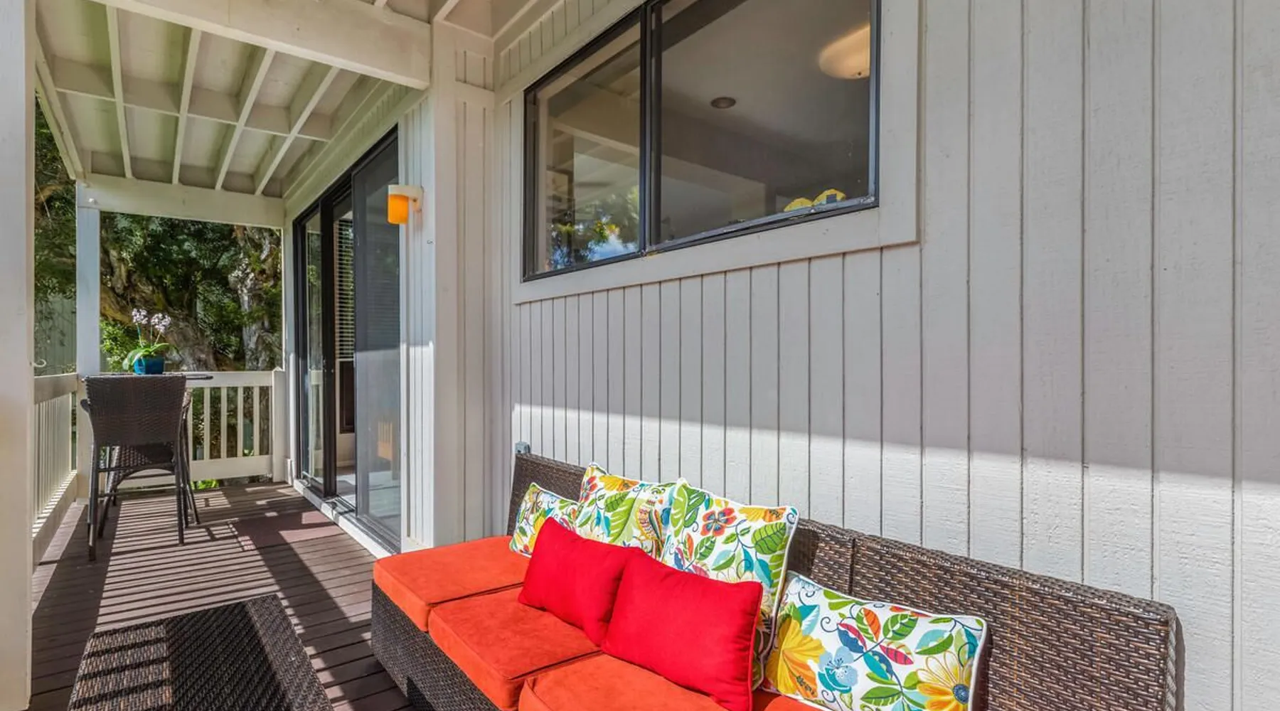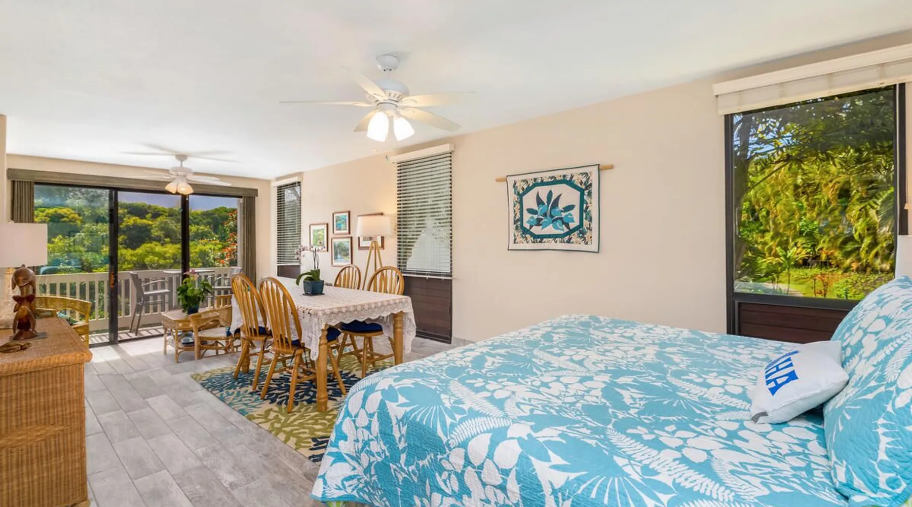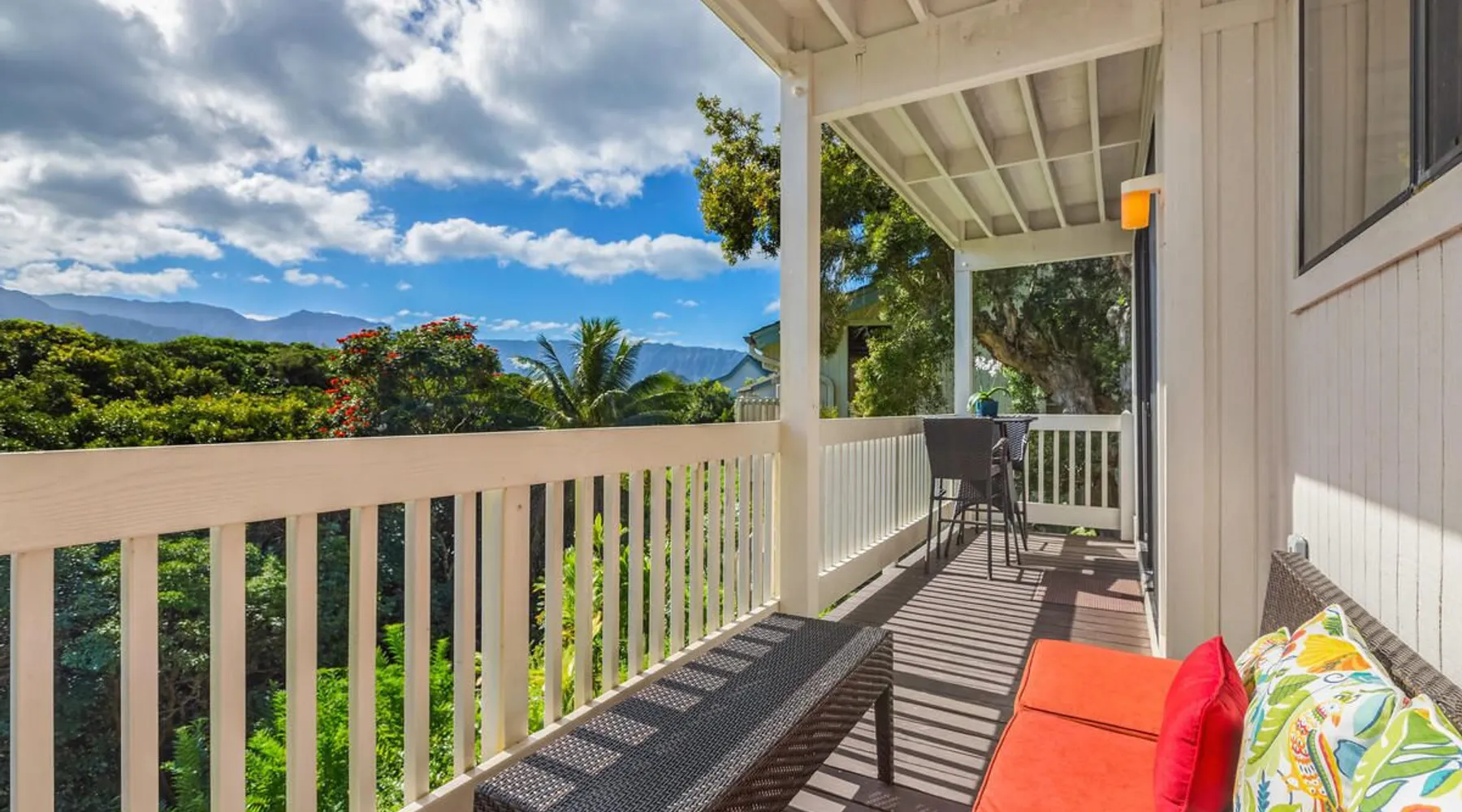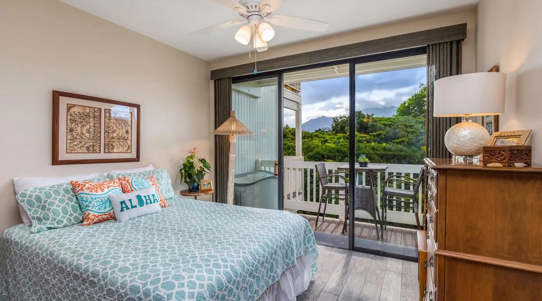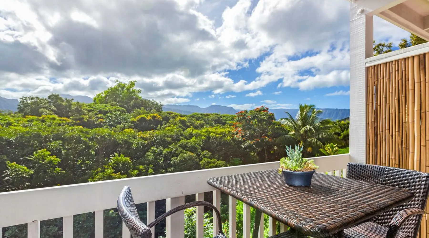 New Listing! Hale Moi 112 units A & B are affectionately called the Treetop Suites for the treetop feel you get from within the unit or on the expansive lanai. This unit is considered a 2 bed, 2 bath unit by County of Kauai but there are no actual dedicated bedrooms (with walls). It is a studio style rental with sleeping area open to living room/dining room areas. Renting Side A and Side B together gives you the ability to lock the doors in between each unit and your side will function like a locked off bedroom. It was recently renovated with new floors, new appliances, new beds and AC. Enjoy everything Princeville has to offer with stunning mountain views, sunsets, a 5 minute drive to Hanalei Bay, or walking distance to St. Regis and its stunning ocean views. Hale Moi is walking distance to several restaurants and bars. Foodland grocery store, and Makai Golf Course are both within 2 miles of this unit. Princeville town is only 2 miles long from entrance to end (St. Regis Hotel) and is uniquely connected by a wonderful walking/jogging path all the way through. Please note: Hale Moi 112 is a lock-out style unit, with units A & B each having its own lockable space yet connected by a common hallway for ease of use between both sides when all doors are open. Considered a 2 bed, 2 bath, each side is set up as a hotel room style with bed, dining room and living room all open in one space. Side A: * King sized bed * Full kitchen, stocked * Washer/Dryer * AC * Free wifi * Dedicated parking stall, free parking * Private lanai with those scene-stealing mountains views, perfect for relaxing with morning coffee or an afternoon cocktail. * Pull out sofa bed for extra guests or those who snore. Unit B: * Efficiency-style * Queen sized bed * Kitchenette separating the living and bedroom areas * TV, Internet provided * Mini Private Lanai * Mid-size stainless steel refrigerator, sink, microwave for simple meal prep and coffee maker, and blender * plates, cups, utensils, the basics *stays longer than 21 days will require a mid stay cleaning(s). Hawaii Life Rentals is a locally owned, licensed real estate company with rentals on Kauai, Maui, Oahu, and Hawaii. We offer on-island personal assistance and Concierge services. Rates do not include taxes, cleaning and applicable fees. Hawaii Life/VRBO bookings: Guests must sign a rental contract within 48 hours of booking to confirm the reservation. TA-105-653-8624-01 TMK
