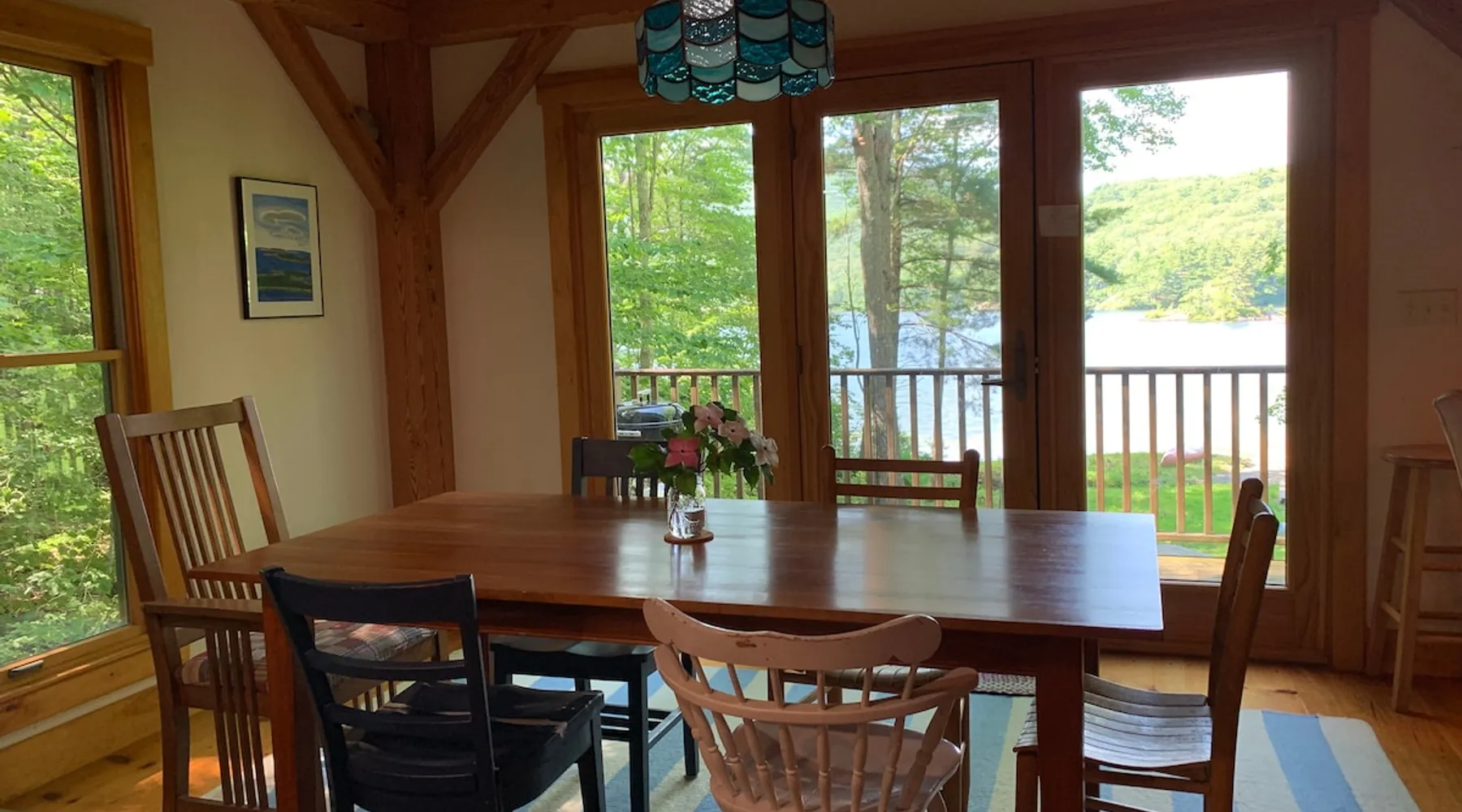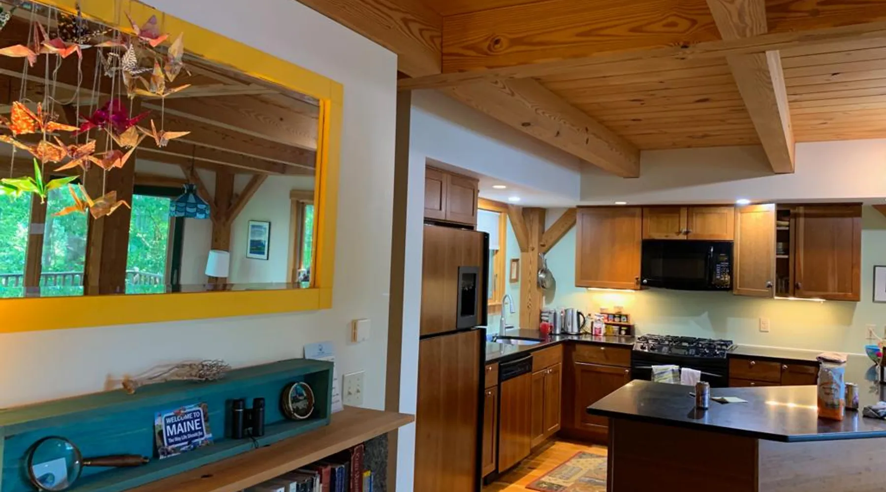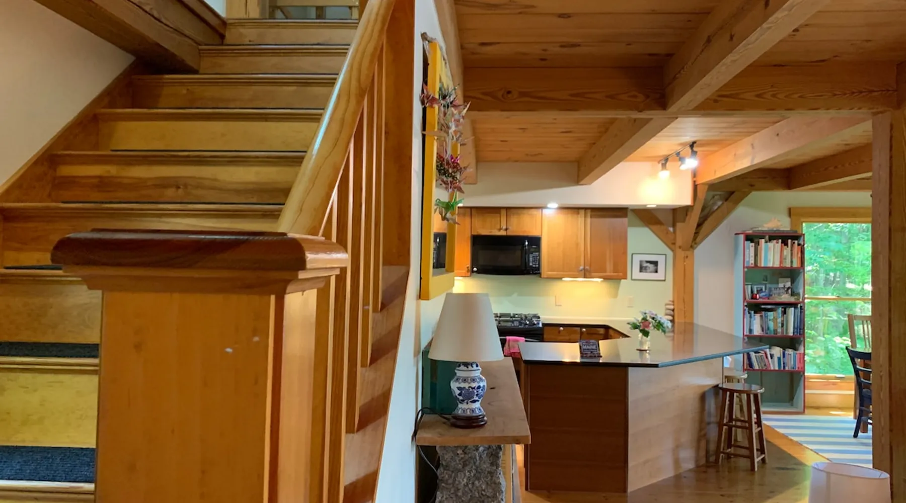A beautiful and simple open-layout with gorgeous views of the water from large windows on main floor and bedrooms. Great kitchen space for cooking and socializing. All essentials and amenities included. Our guests love our home! The space This wonderful post and beam home was built in 2005. It has great open spaces with cathedral ceilings upstairs. The house isn’t too big (1500 sq ft), so it’s not overwhelming or overpriced! It’s just simple vacation living. The house is cool in the summer and warm in the winter. There are two bedrooms upstairs (approximately 13 x 15 ft each) with tall ceilings and large windows for beautiful views of the lake. There is an open area that is suitable as a bedroom with a bed on the upstairs landing. Amenities include wifi, a kitchen fully stocked with plates, utensils, pots, pans, etc. washer/dryer, off-street parking (uncovered driveway). The downstairs area is an open space containing the kitchen, dining room, and living room. There is a great kitchen with a huge peninsula granite countertop separating the kitchen from the dining room, an area perfect for socializing while cooking. Nearby activities include hiking, swimming, canoeing, and rowing right out the back door (row boat, canoe, and adult life jackets included). The house is a 5 minute drive or taxicab ride from downtown Camden’s many shops and restaurants, or a 15 minute drive to downtown Rockland or Lincolnville. Just a half mile from the Mighty Camden Snow Bowl/skiing and National Toboggan Championships in the winter. In the summer, this is a peaceful home away from the hustle and bustle of Camden, yet it’s only a 5 minute drive away. Easy-going and helpful host. Coffee and tea are included. Extra mattresses are available. I do own a small dog, but I am allergic to some breeds, so please check with me before bringing pets. Guest access Lake access with a canoe. On site laundry. Full kitchen. No shared areas - the renter has access to entire house and property. Other things to note Camden is an amazing destination for all ages. It's also a great location from which to explore the area, with easy drives to Acadia National Park and Popham Beach, or easy drive and ferry to Monhegan/North Haven/Vinalhaven Islands.