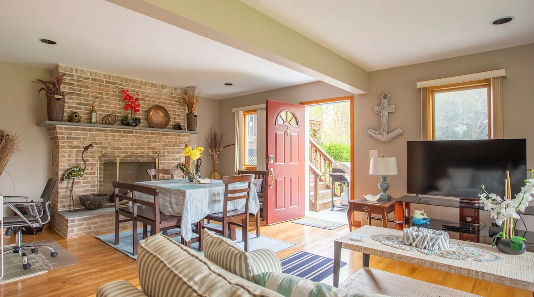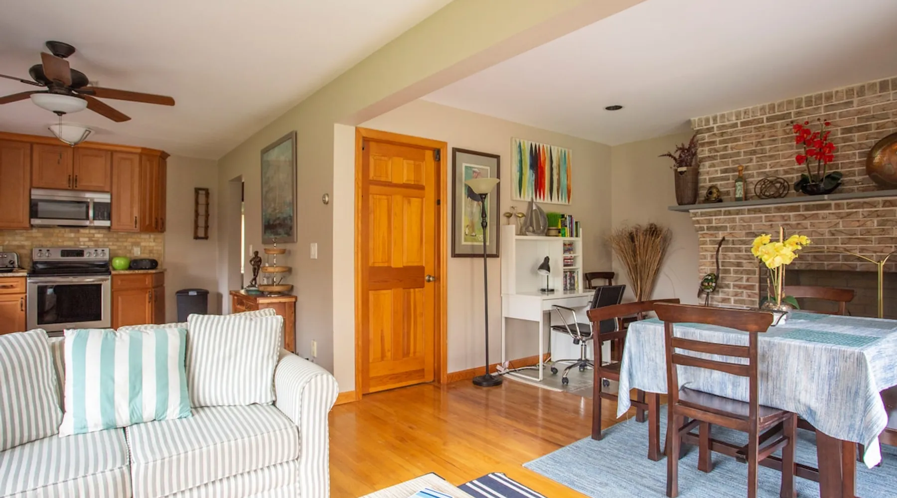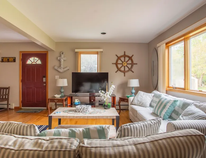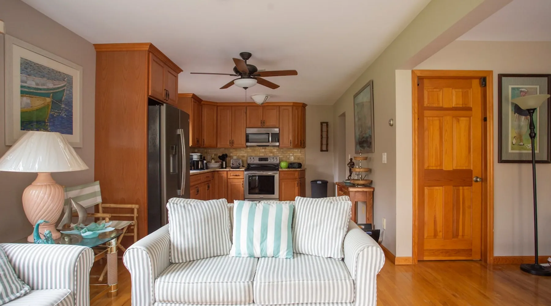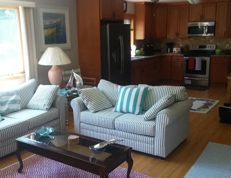 4-6 GUEST MAXIMUM PLEASE. Cozy 2 BR and 1 BTHRM apartment in private home in Greenport NY. Total privacy and separation of unit!! Perfectly situated on 1.75 acres. 3 minute drive, or easy walk, to the center of Greenport village, 2 minute ferry ride to quaint Shelter Island, and a 6 minute drive to tip of Orient. So right in the middle of the action with the peace and serenity of living outside the village. Private beach a short walk/ride down the street. The space Beautiful, newly renovated, super clean 2 bedroom, 1 bath apartment for rent in home in Greenport on quiet, private road. Complete privacy and separation. Sleeps 4 very comfortably with one King and one Queen bed (plus queen size sleeper sofa and new air mattress for 6 total guests). Cable and hi speed internet, DVD in every room. New modern kitchen and appliances, including coffee percolator, and new Keurig coffee machine (fresh tea bags and various K cups, decaf too, with milk and cream waiting upon arrival, but bring your favorite blend along). Central AC w/ ceiling fans in every room. Almost 2 acres of manicured property. Plenty of bath towels and bed linens and pillows for your stay. Lots of other amenities but please don't hesitate to make a request or inquire about availability of something important. Just minutes from over 70 North Fork vineyards, farms, antique stores, art galleries, yard sales, lavender farms, festivals and only a mile from center of historic Greenport village with its great stores, shops and Zagats rated restaurants!! There is also an amazing horse carousel in the center of town right by the marina and boardwalk with stunning views that kids absolutely love to ride!! So enjoy the best of both worlds!! Be as close as possible to the center of the action, but also able to enjoy the peace and serenity of living outside of the village. Short walk to Islands End Golf Course for you golfers and just a 2 minute ferry ride to beautiful, quaint Shelter Island and the famous Sunset Beach (an Andre Balazs property). You can also take the ferry to Sag Harbor and spend the day in the Hamptons if you wish!! Amenities include new propane BBQ, outdoor table and umbrella, zero gravity beach chairs and beach towels, coolers on request, free guest parking pass to local beaches minutes away as well as access to private deeded beach just down the road. Perfect for couples, friends or families looking to get away and relax and play, for bachelor/bachelorette parties, and for that fishing/golfing excursion. Also plenty of room for playpens and cribs and have hosted lots of kids of all ages!! If you're using public transportation, both the LIRR and the Hampton Jitney stop right in the heart of Greenport Village. There are also several cab companies serving the area, and UBER as well!! Pick up and drop off is possible so feel free to discuss. If you are interested in bike rentals, please let host know so that he can assist you with the best company and the best rates (including drop off and pick up service)!!! Guest access Guests have access to the entire apartment in total privacy with their own private entrance and exit outside to the backyard. They are free to use the entire outside property at their leisure. Private deeded beach at end of the road open to all guests. No stairs..easy access. Other things to note Your unit is completely separated from the rest of the house by its own locking doors and own exit/entrance. You will have complete quiet and uninterrupted privacy during your stay!! Check in and check out times may be flexible upon request depending on rental schedule which may also change. Please always touch base with me to be certain. FOUR TO SIX GUEST MAXIMUM PREFERRED. APARTMENT IS AVAILABLE ON A MONTHLY BASIS FROM OCTOBER TO APRIL AT EXCELLENT MONTHLY RATE. PLEASE CONTACT HOST IF NEEDS MAY REQUIRE DIFFERENT ARRANGEMENT. THANK YOU !!